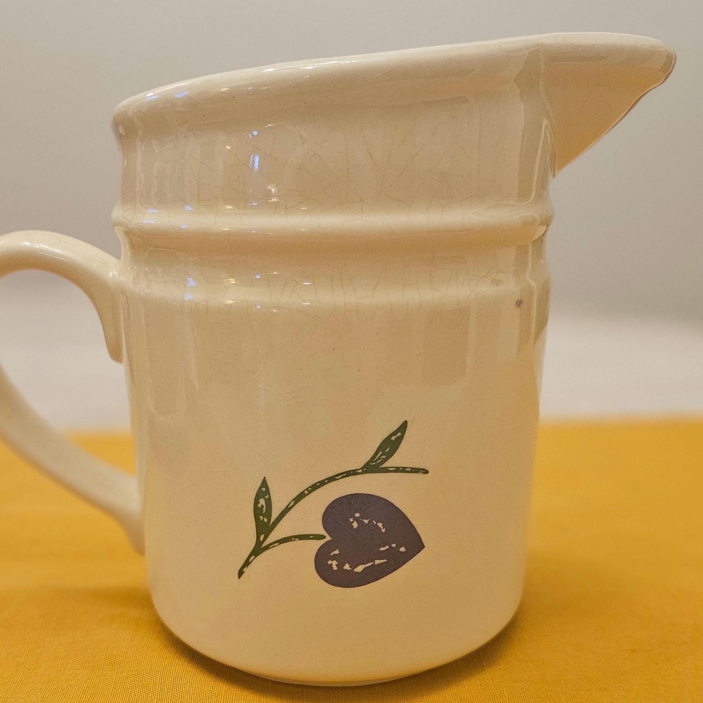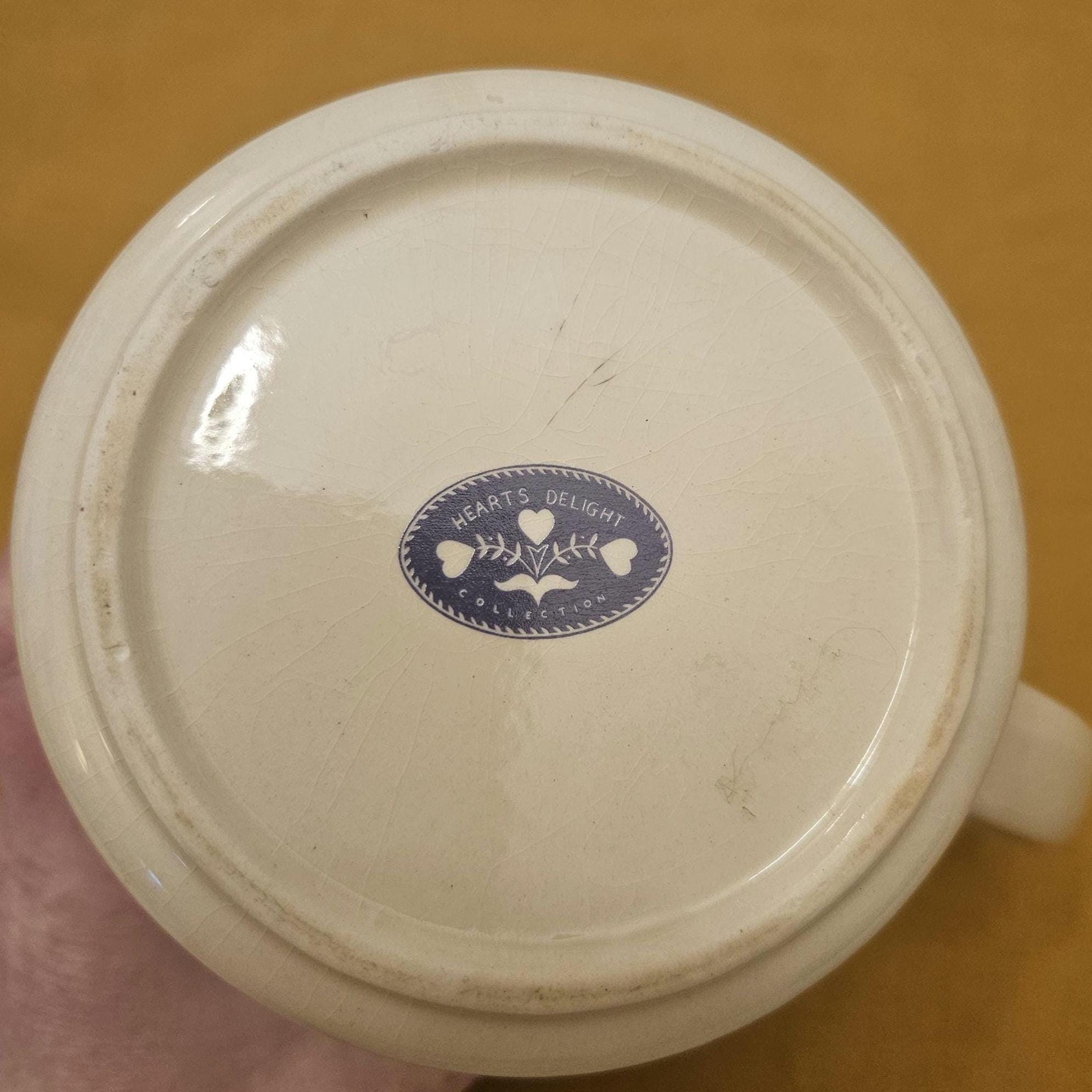 This is a charming needle-point style illustration of hearts, stitching on the front and a heart flower on the back. Beautiful green, rosy pink and periwinkle. Used condition with some charming crazing.