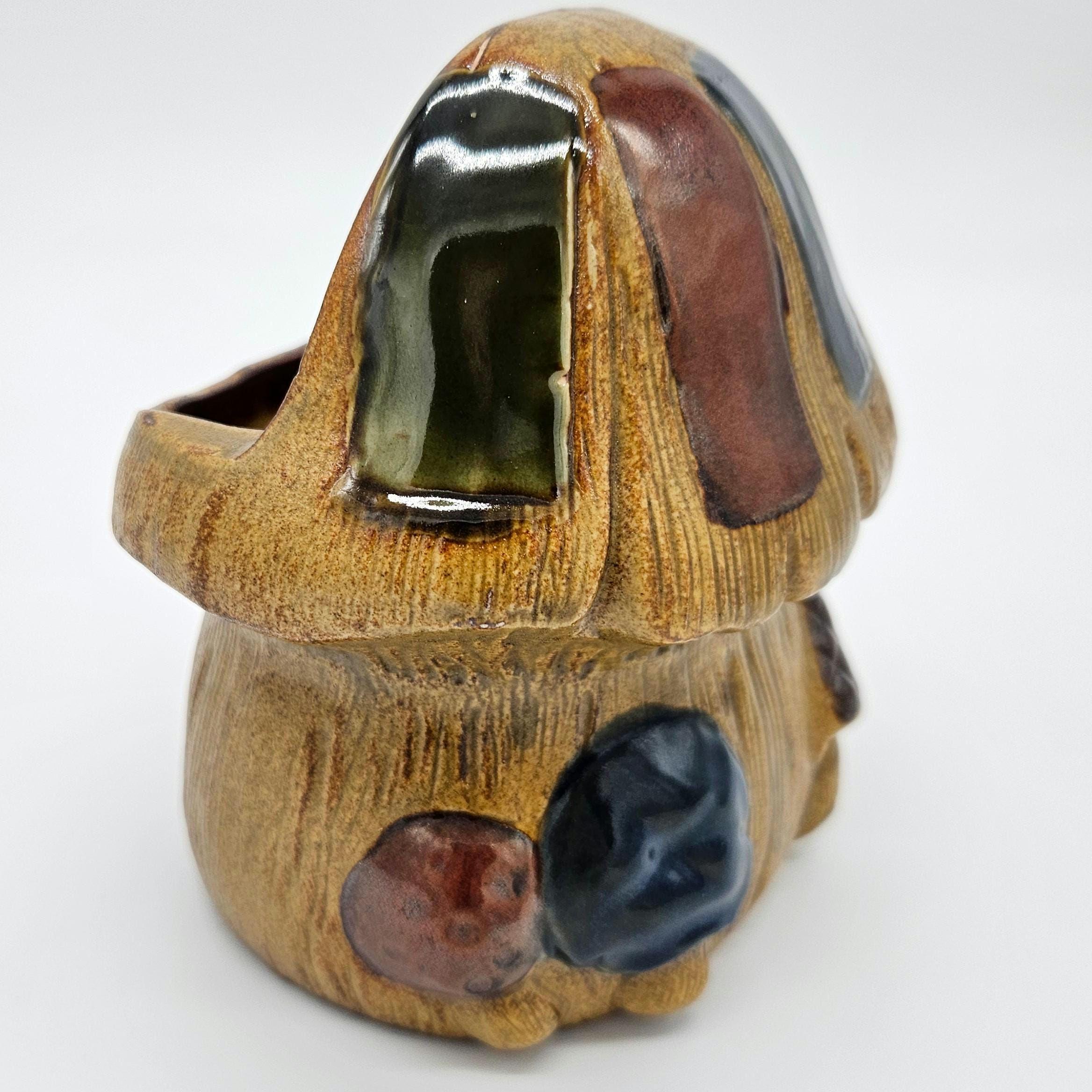 Vintage ceramic mushroom planter by Inarco Japan. With brown glaze and raised maroon and navy details, earthy tones, quirky pottery, and cozy hippie vibes. Made in Japan, likely in the 1970s, this hand-glazed piece is ideal for small plants, faux greenery, or just sitting pretty on a shelf. No drainage hole — great for catchall storage or decorative use.