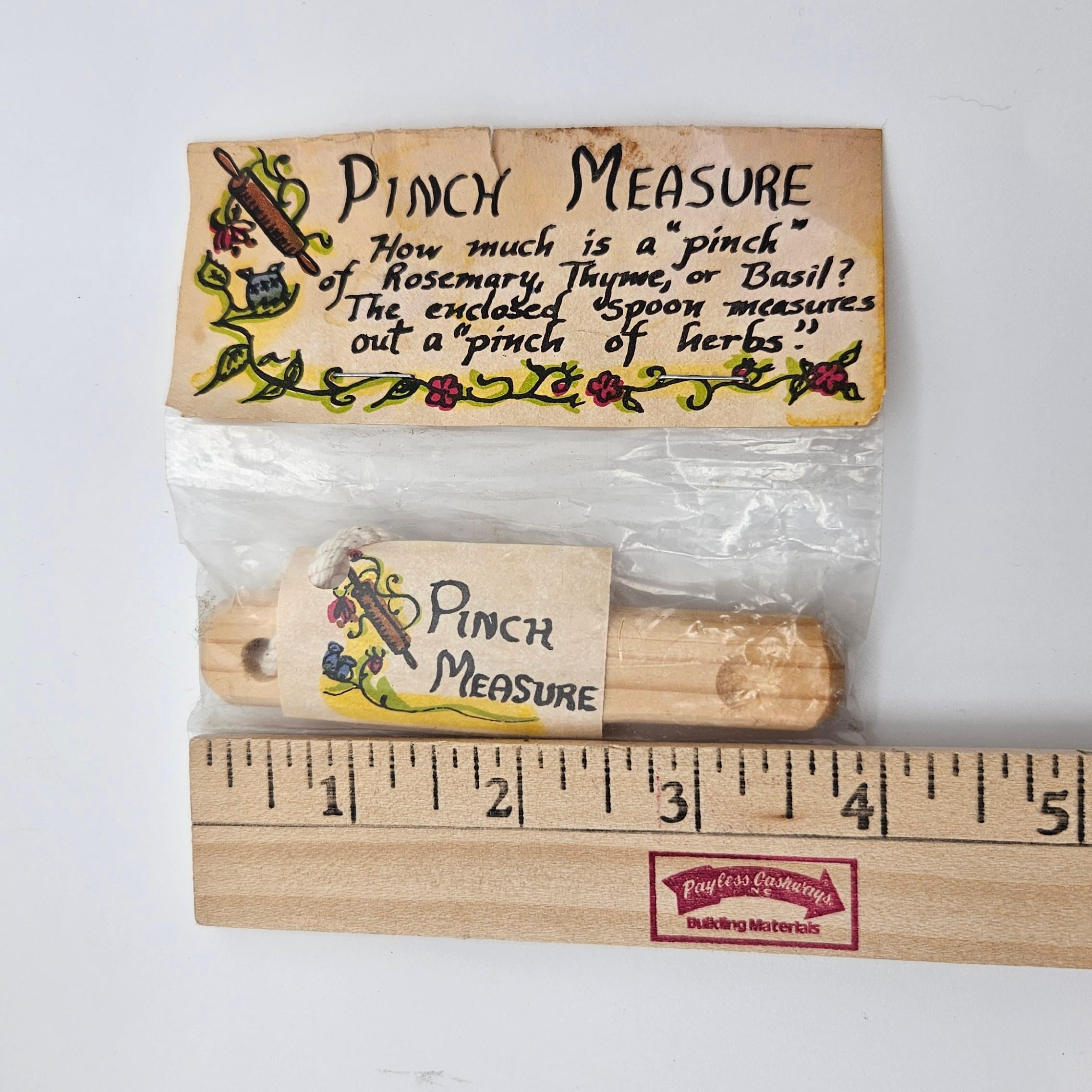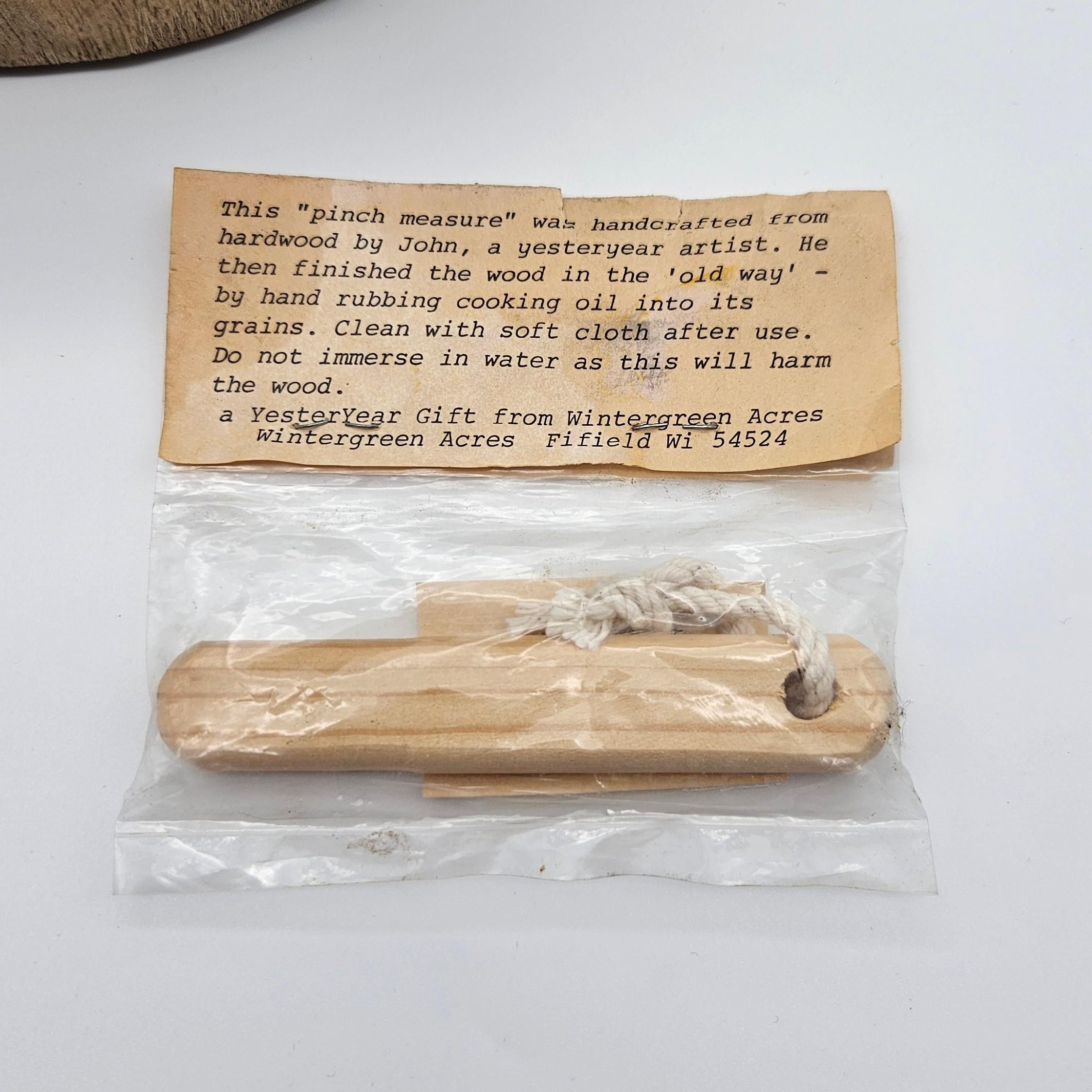 This unique kitchen tool was handcrafted by John, a “yesteryear artist,” at Wintergreen Acres in Fifield, Wisconsin (ZIP 54524). Designed to measure a perfect “pinch” of herbs such as rosemary, thyme, or basil, it blends function with artisan heritage.