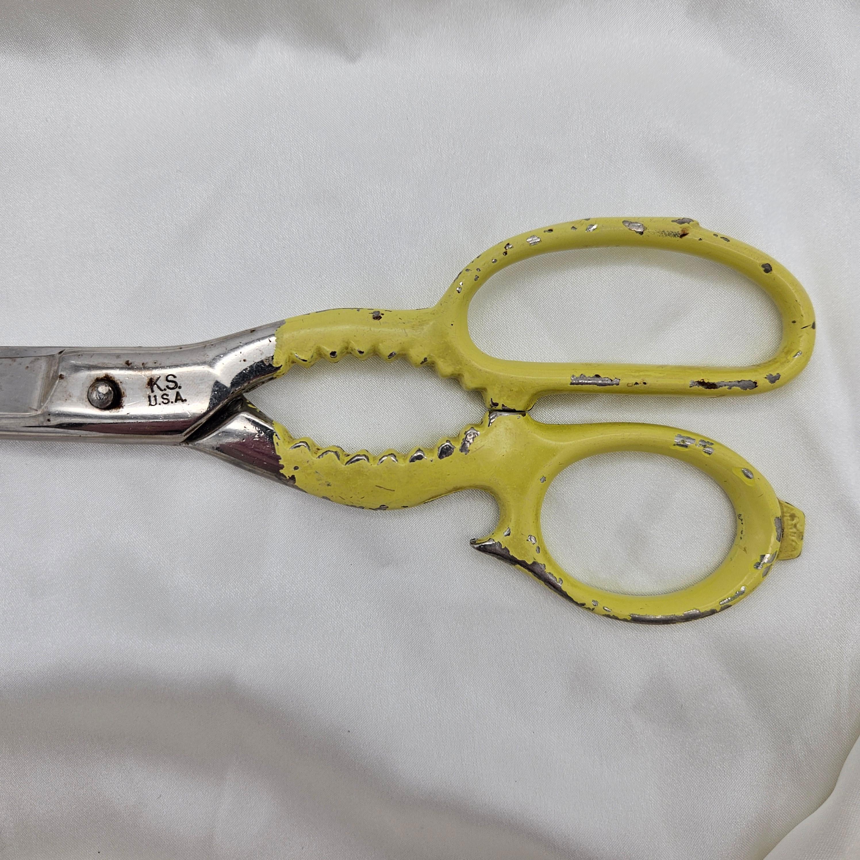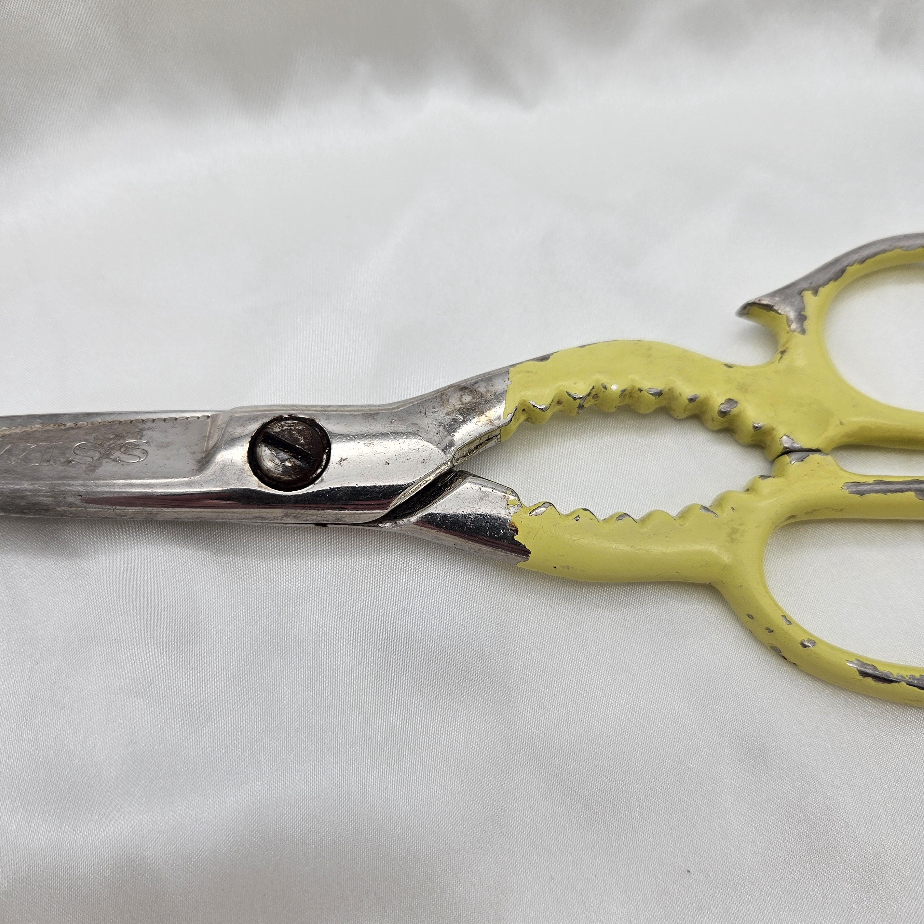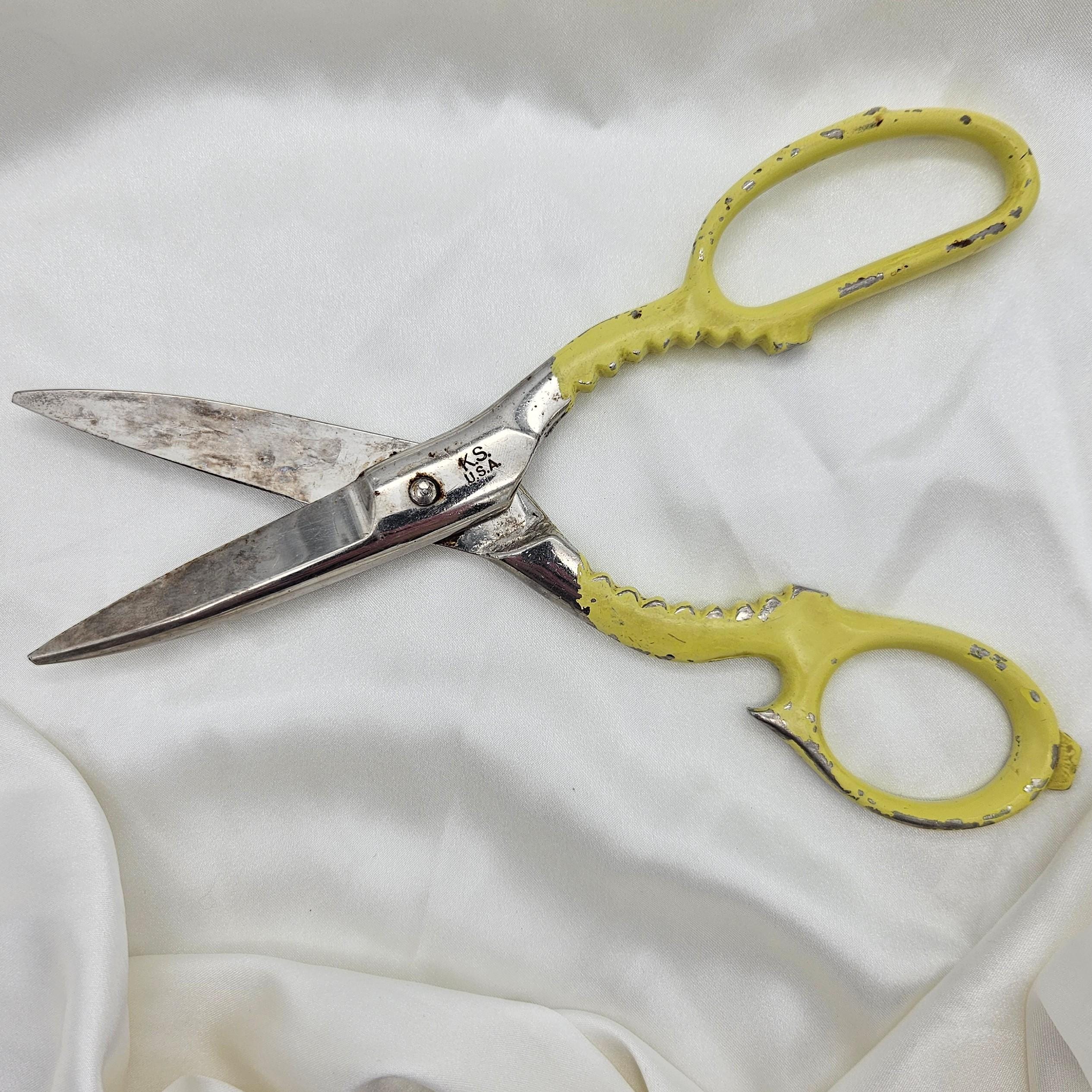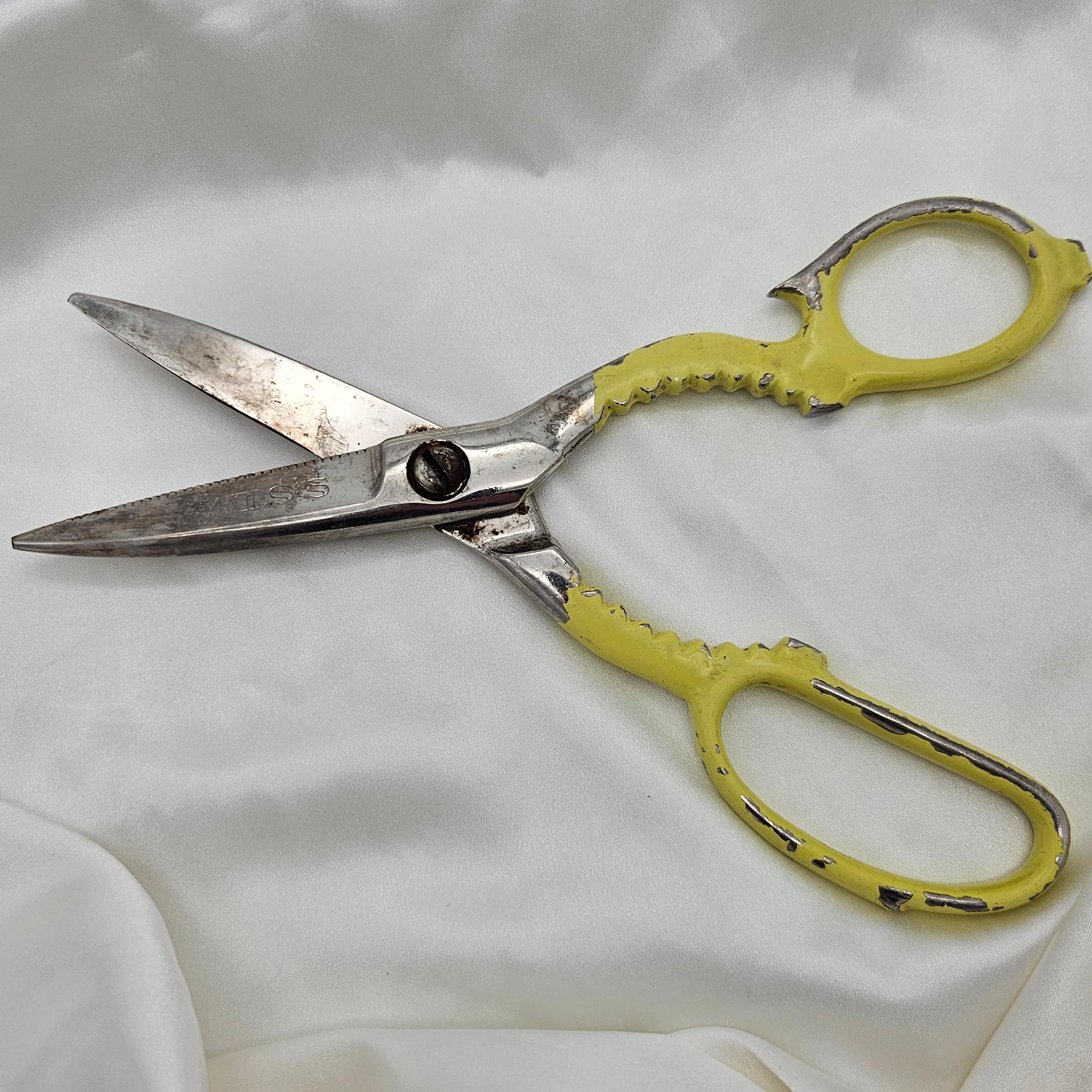These vintage Wiss kitchen scissors were made in the USA and feature their classic KS (Kitchen Shears) stamp. Measuring 8 inches long with 3-inch blades, these shears are designed for multipurpose kitchen and household use. The handles are painted yellow and include serrated grips - double as scissors and utility grips, perfect for farmhouse kitchen decor, rustic tool collections, or as a collectible example of American made kitchenware. Best for display.