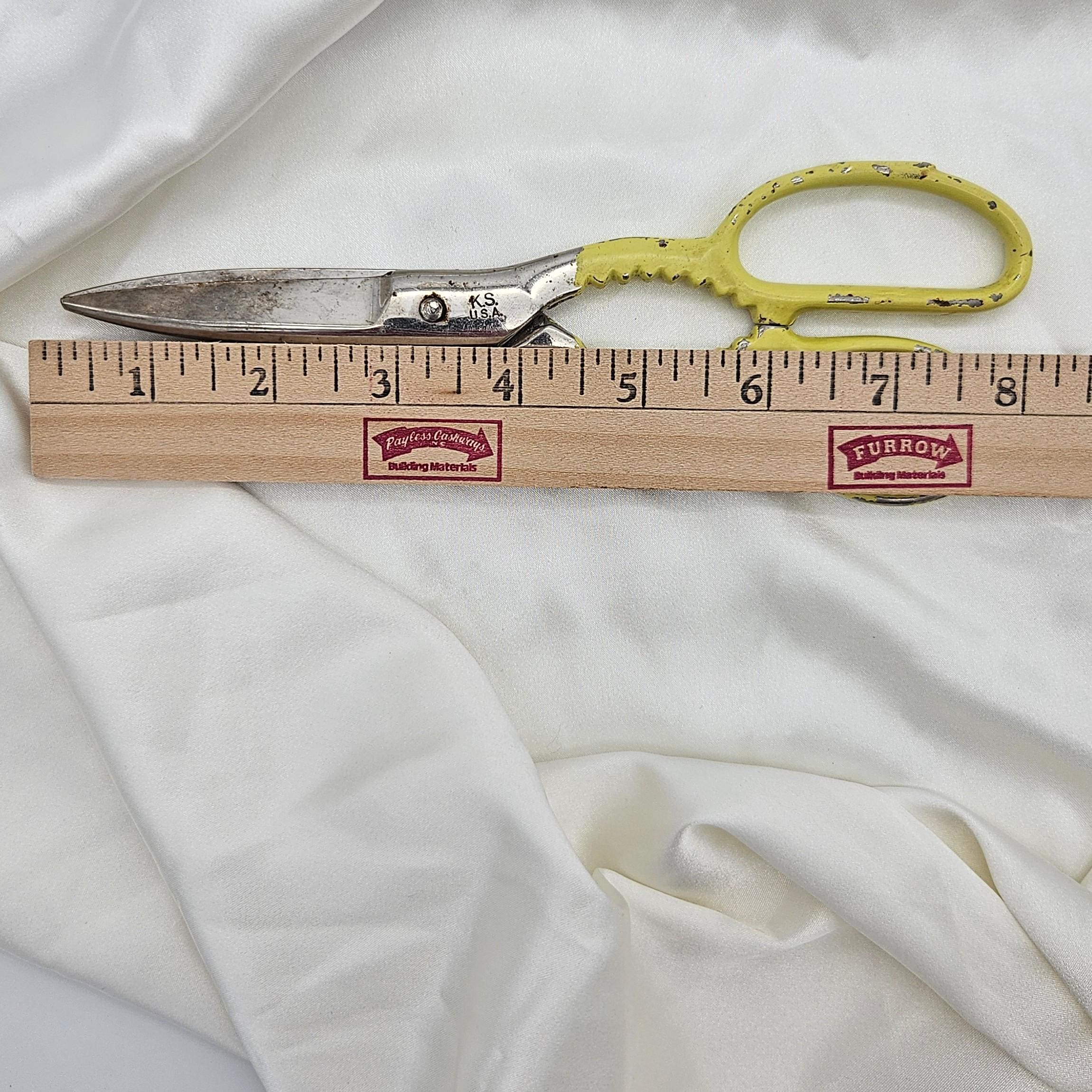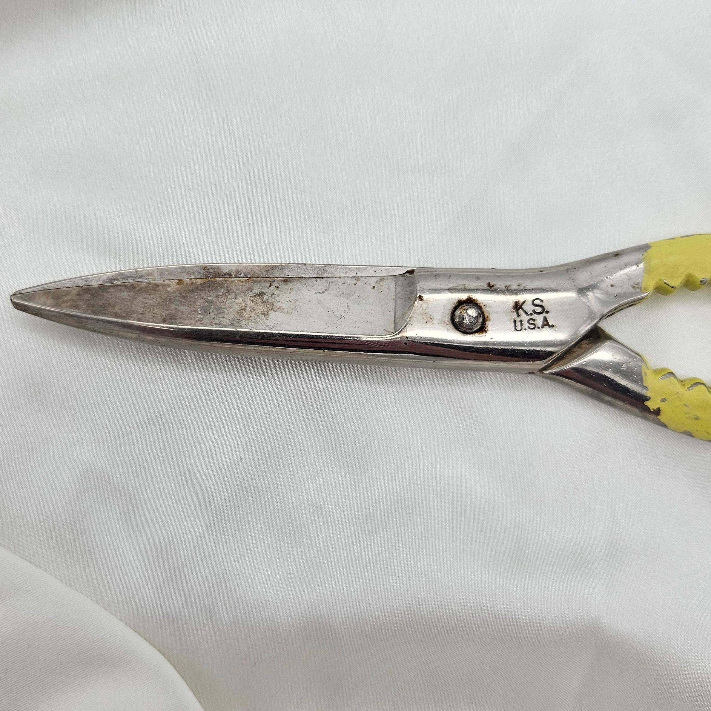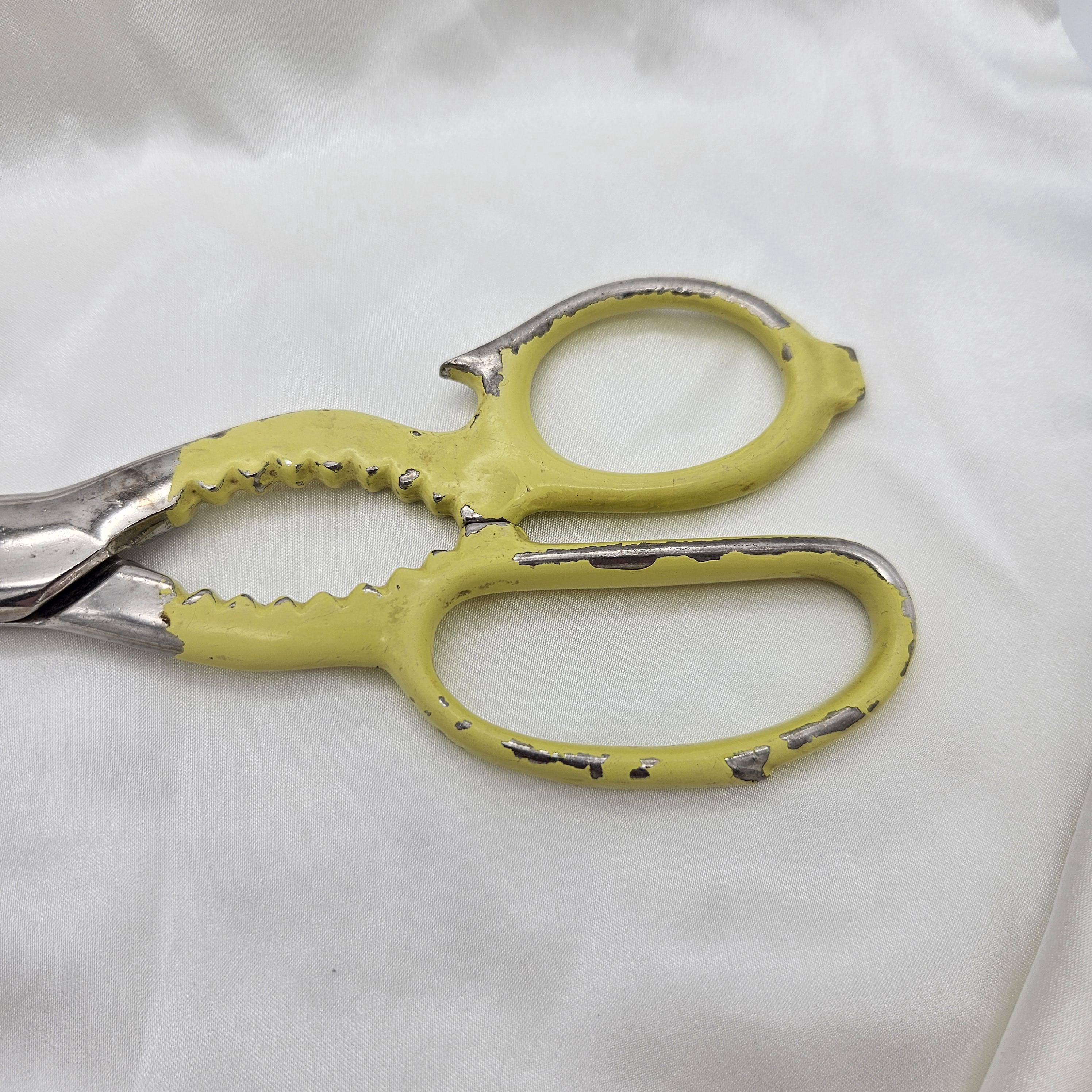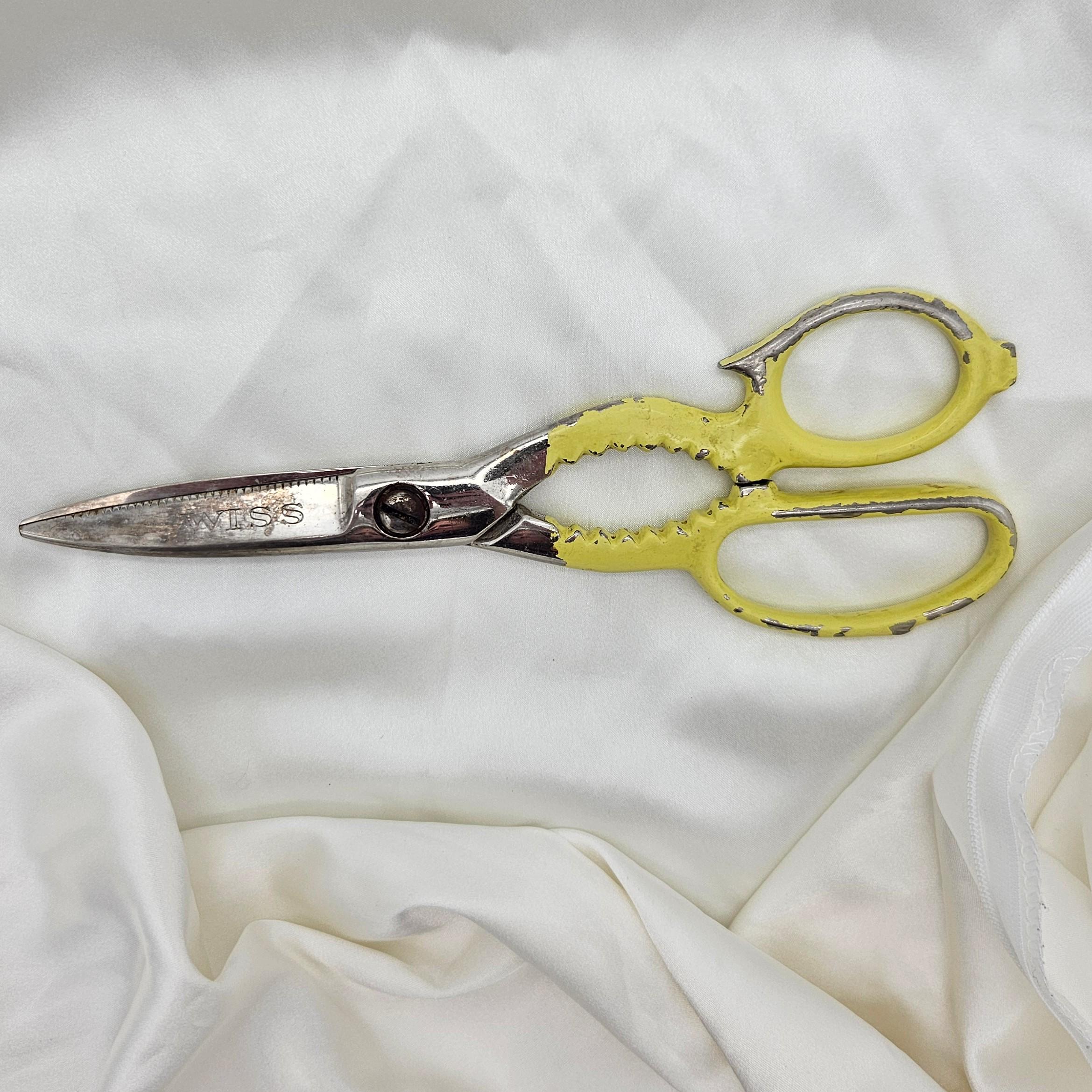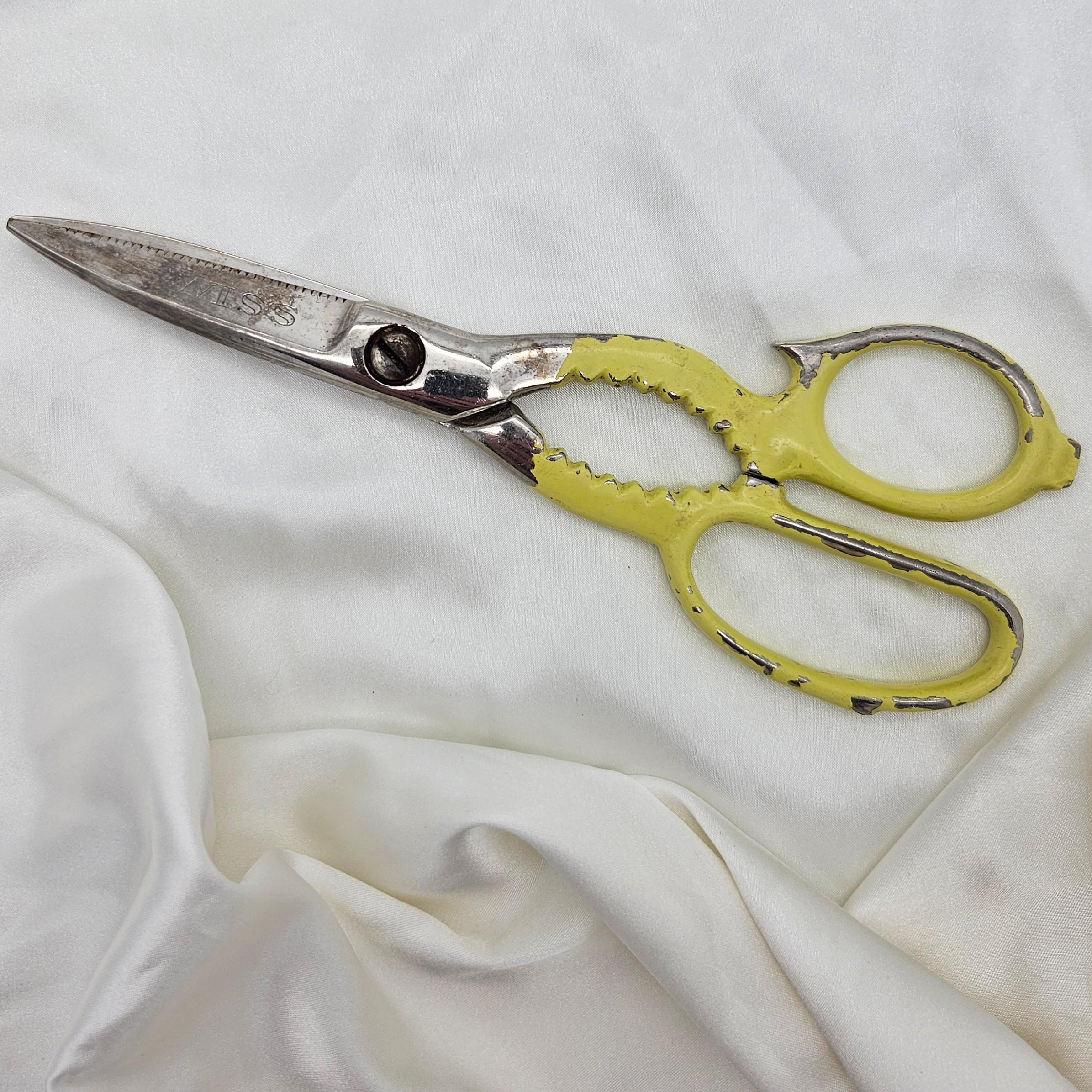 These vintage Wiss kitchen scissors were made in the USA and feature their classic KS (Kitchen Shears) stamp. Measuring 8 inches long with 3-inch blades, these shears are designed for multipurpose kitchen and household use. The handles are painted yellow and include serrated grips - double as scissors and utility grips, perfect for farmhouse kitchen decor, rustic tool collections, or as a collectible example of American made kitchenware. Best for display.
