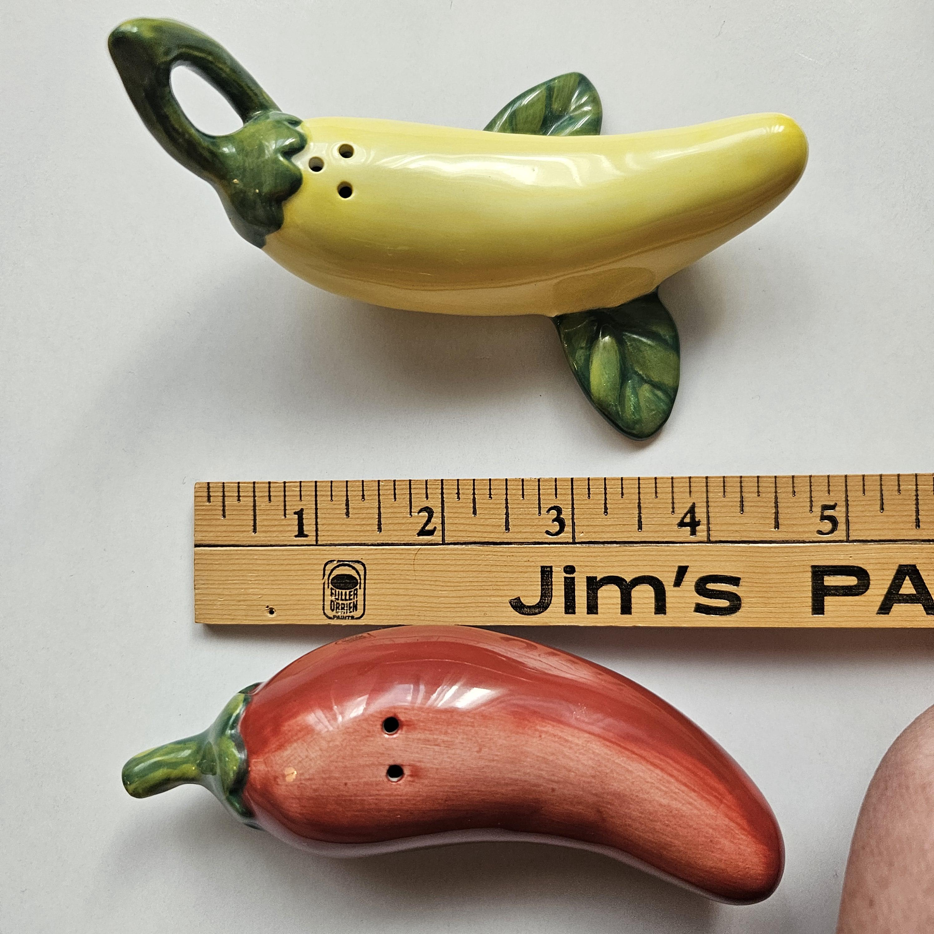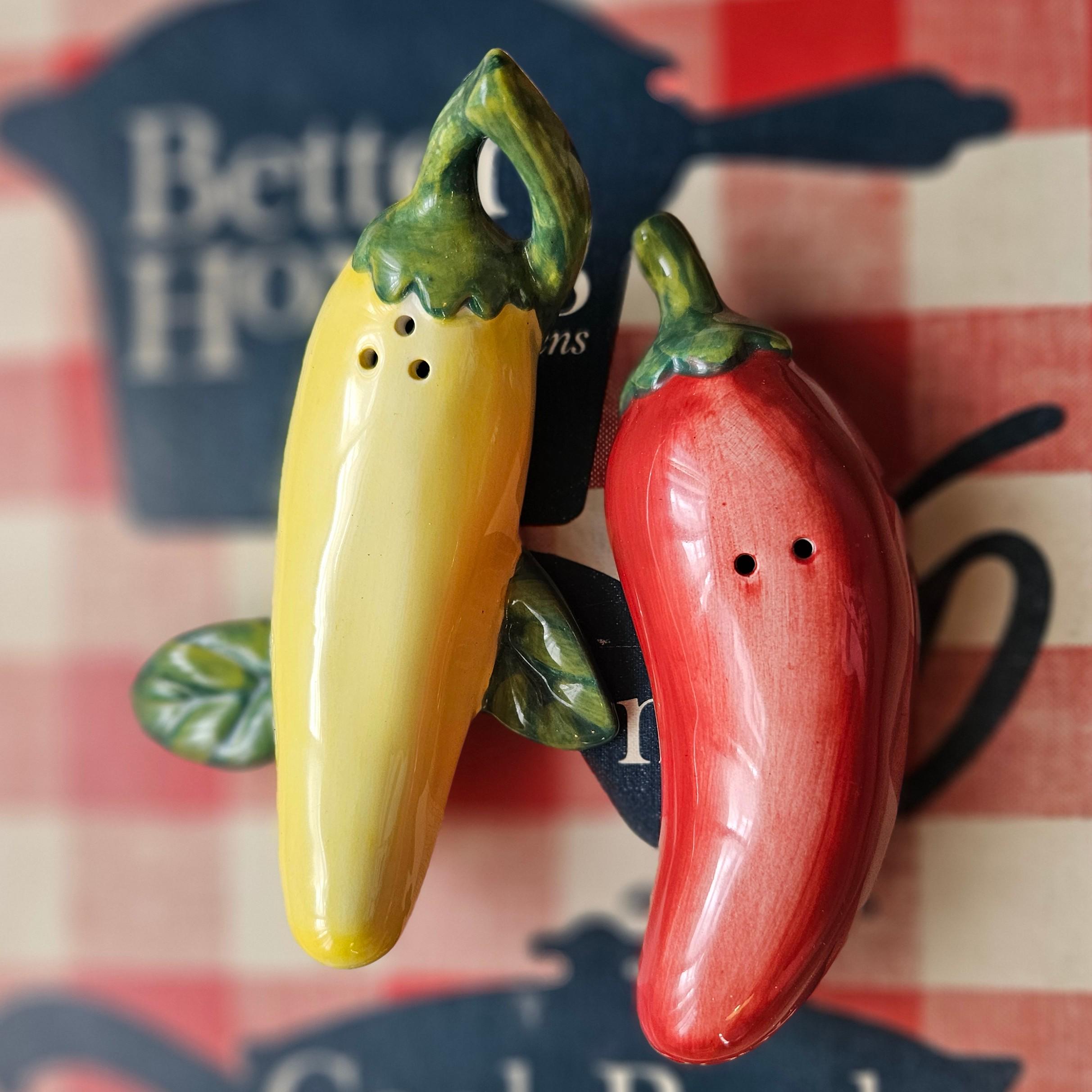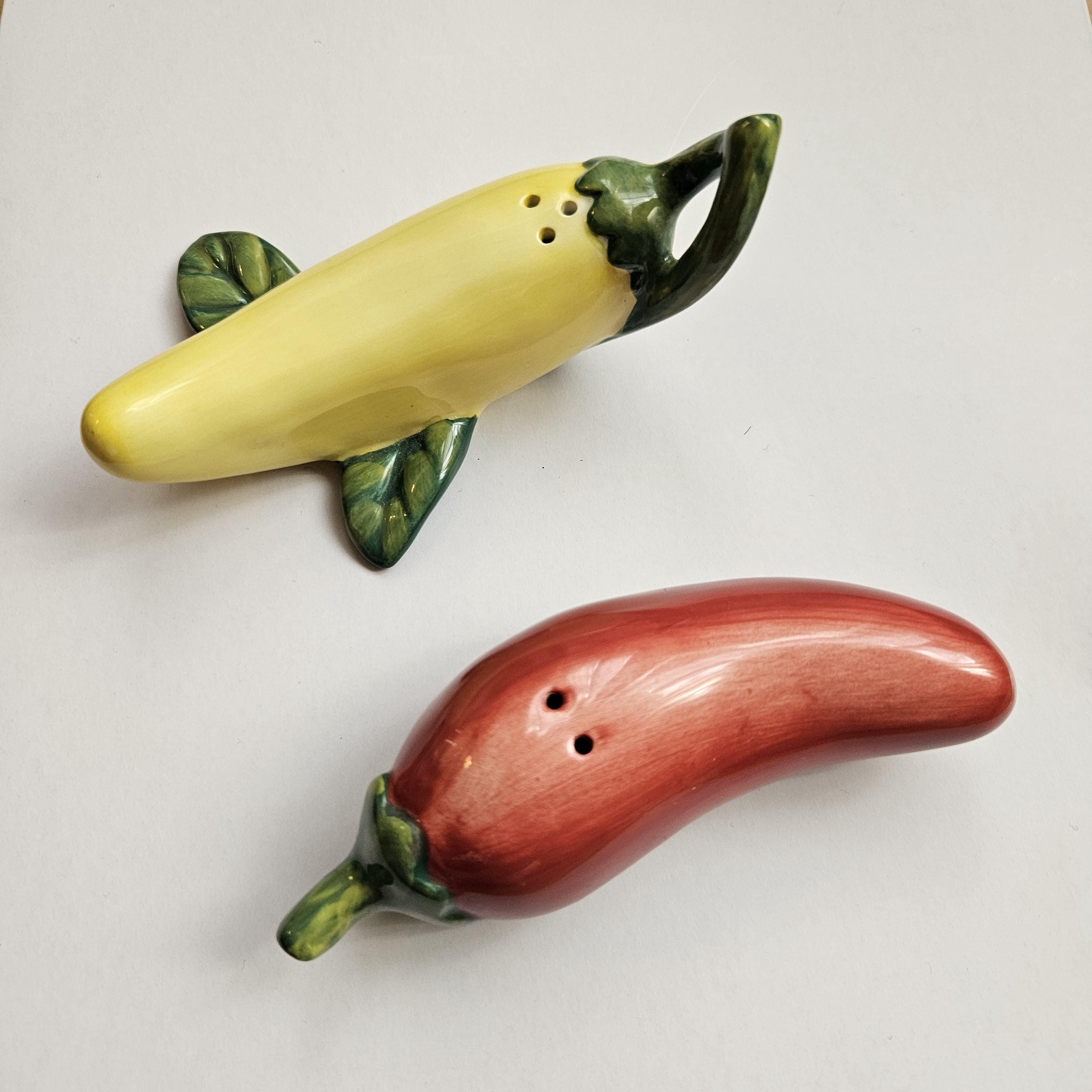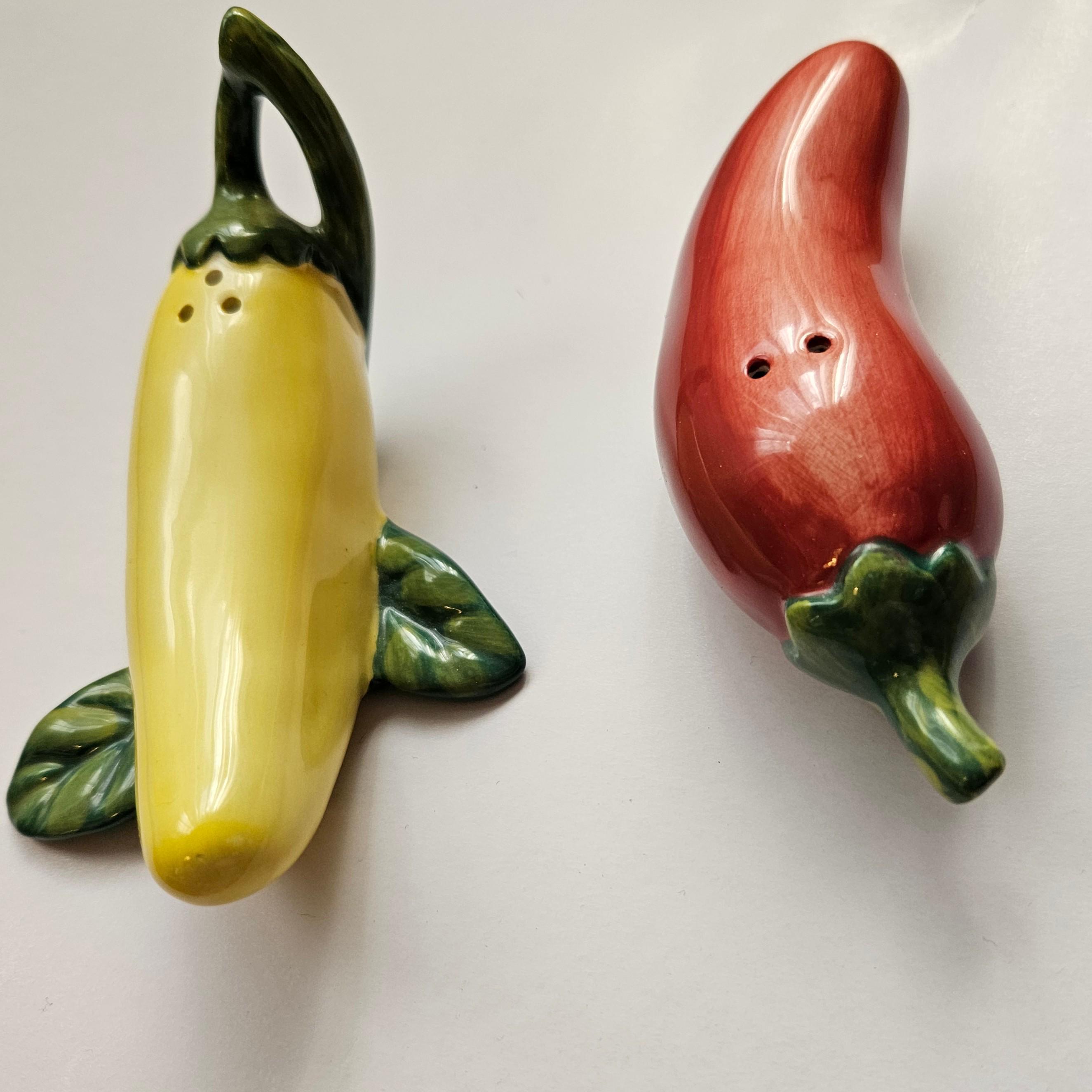 An adorable pair of ceramic salt and pepper shakers shaped like a red chili pepper and a yellow banana pepper. Both complete with glossy glaze and the yellow has cute little green leaf accents. Such a fun kitchen detail for open shelving, Taco Tuesday, your spice corner, or a colorful table setting. Perfect if you like things a little spicy. 🌶️💛