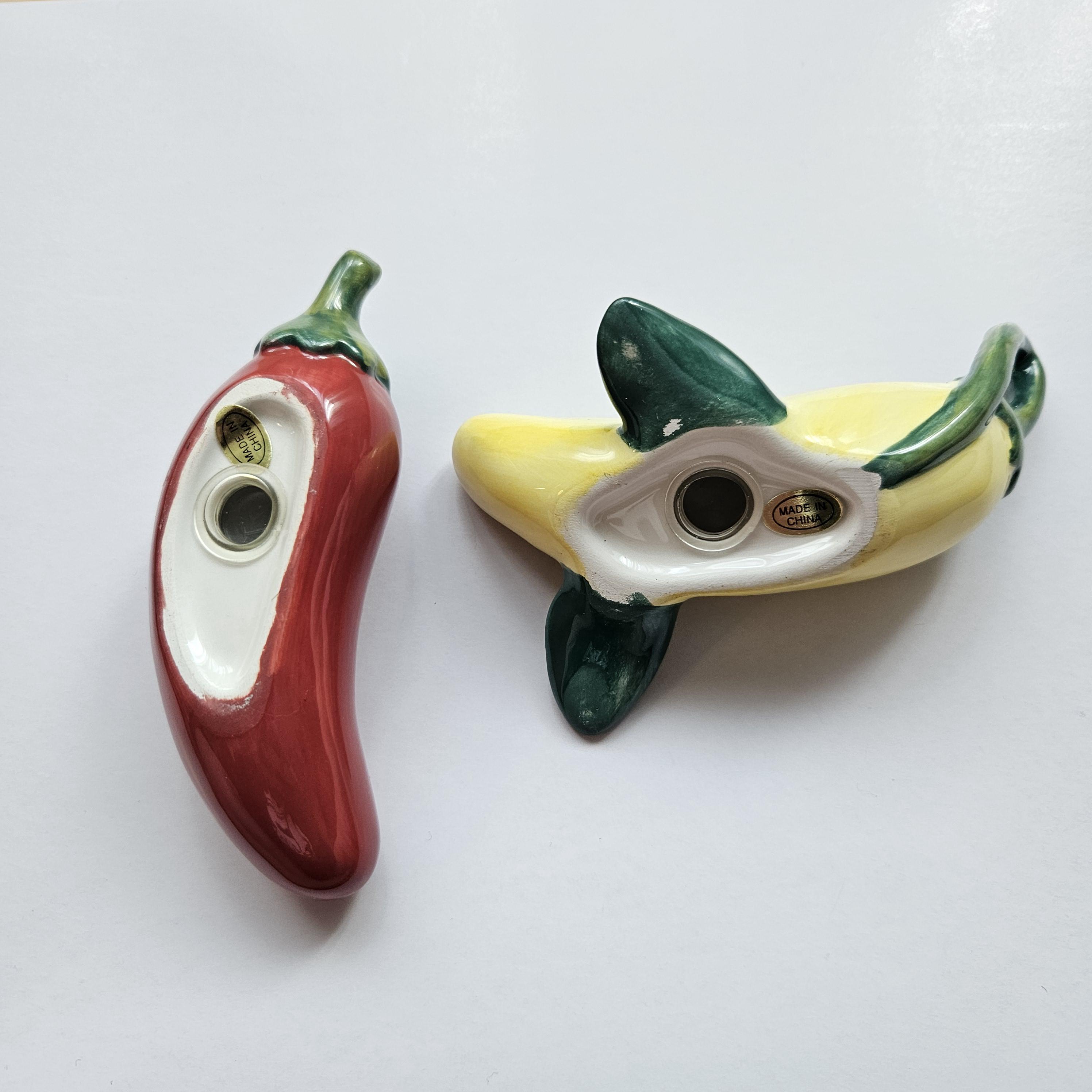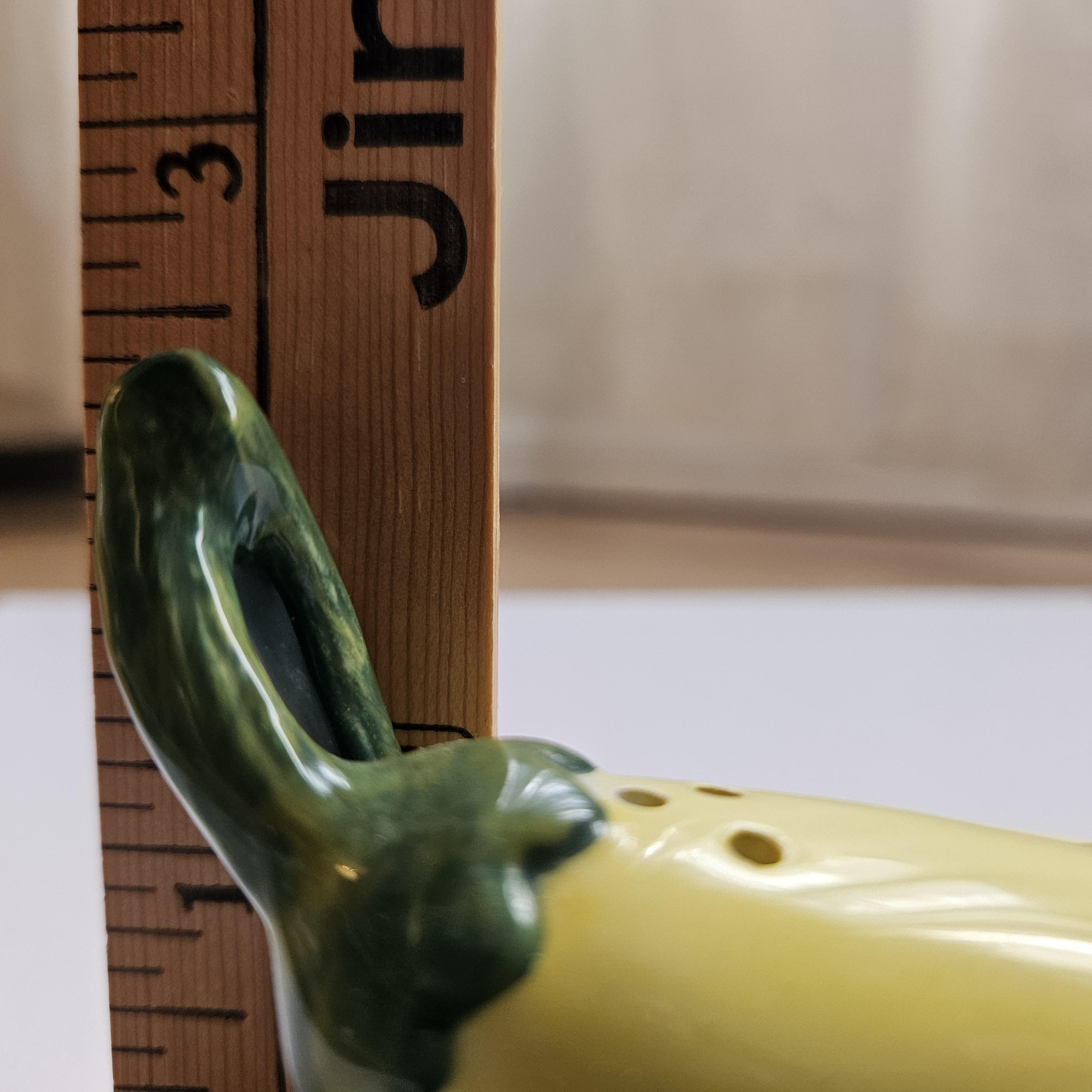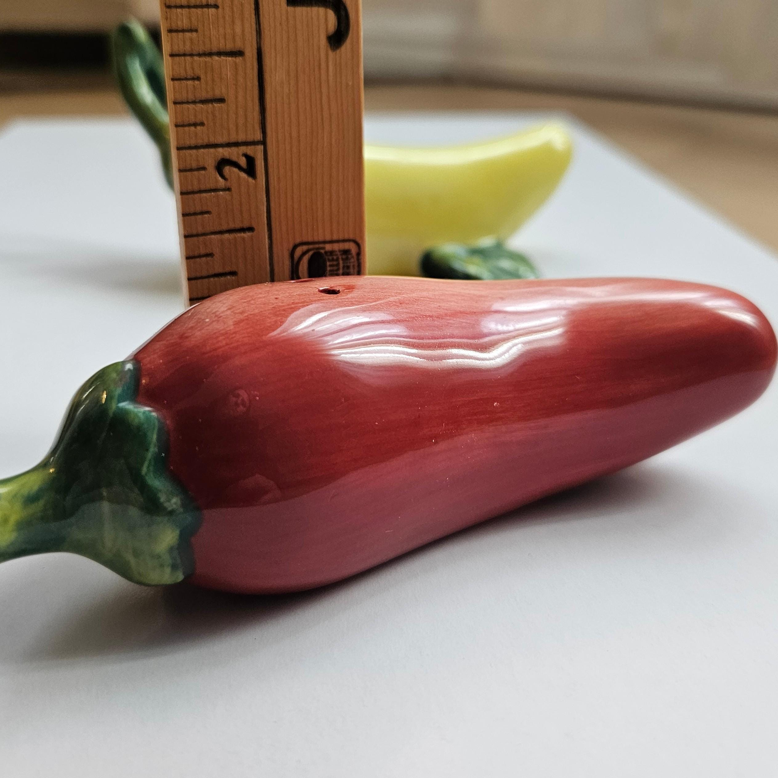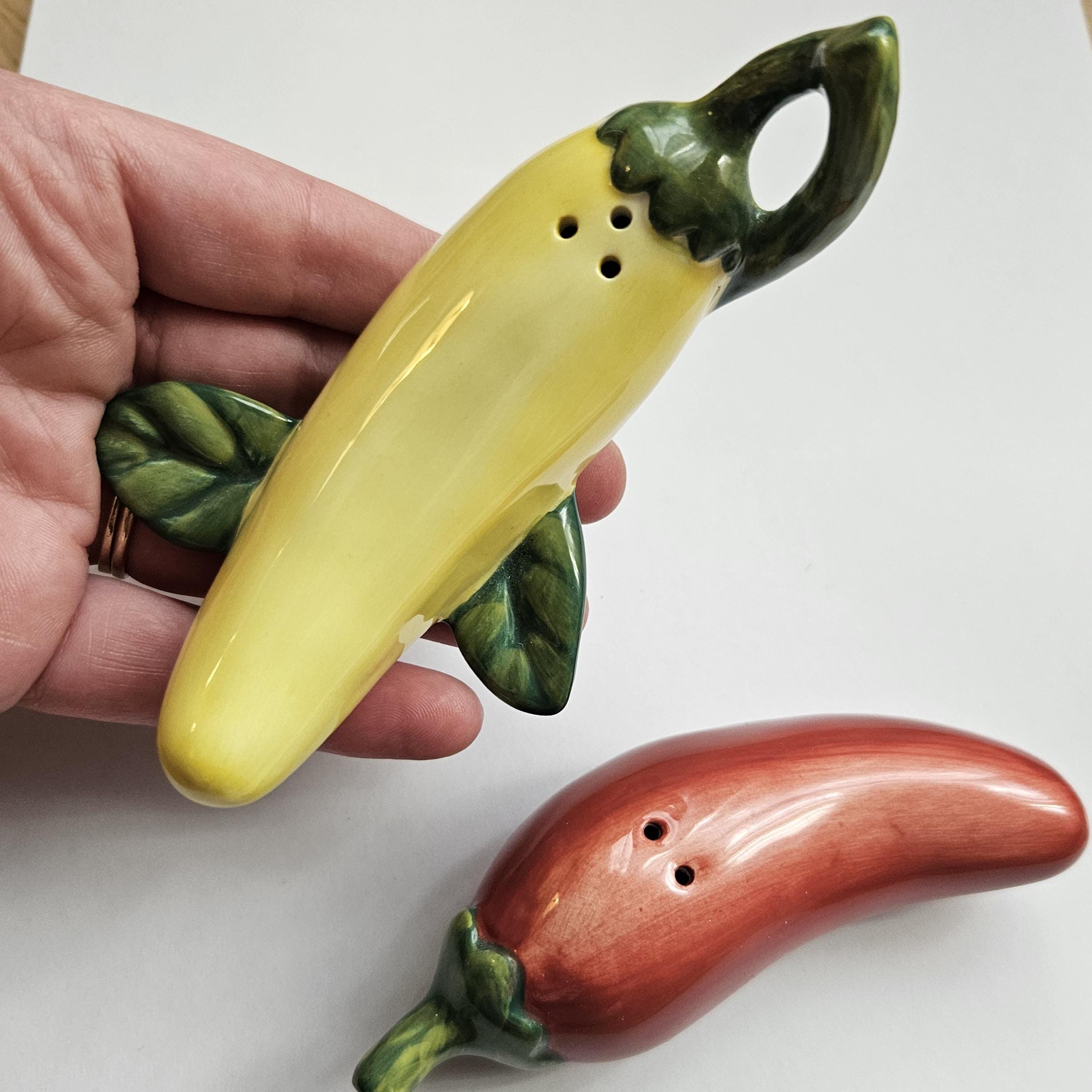An adorable pair of ceramic salt and pepper shakers shaped like a red chili pepper and a yellow banana pepper. Both complete with glossy glaze and the yellow has cute little green leaf accents. Such a fun kitchen detail for open shelving, Taco Tuesday, your spice corner, or a colorful table setting. Perfect if you like things a little spicy. 🌶️💛