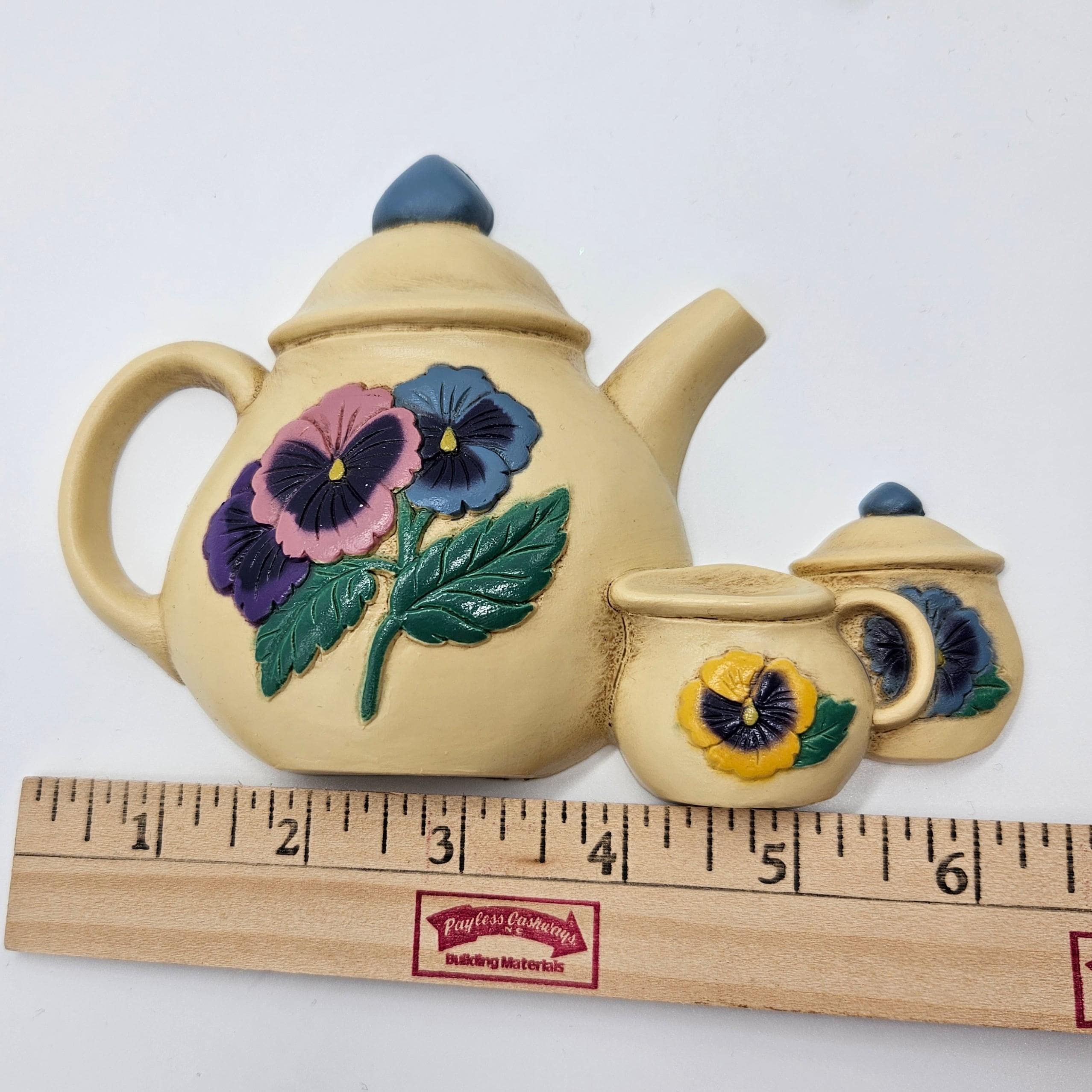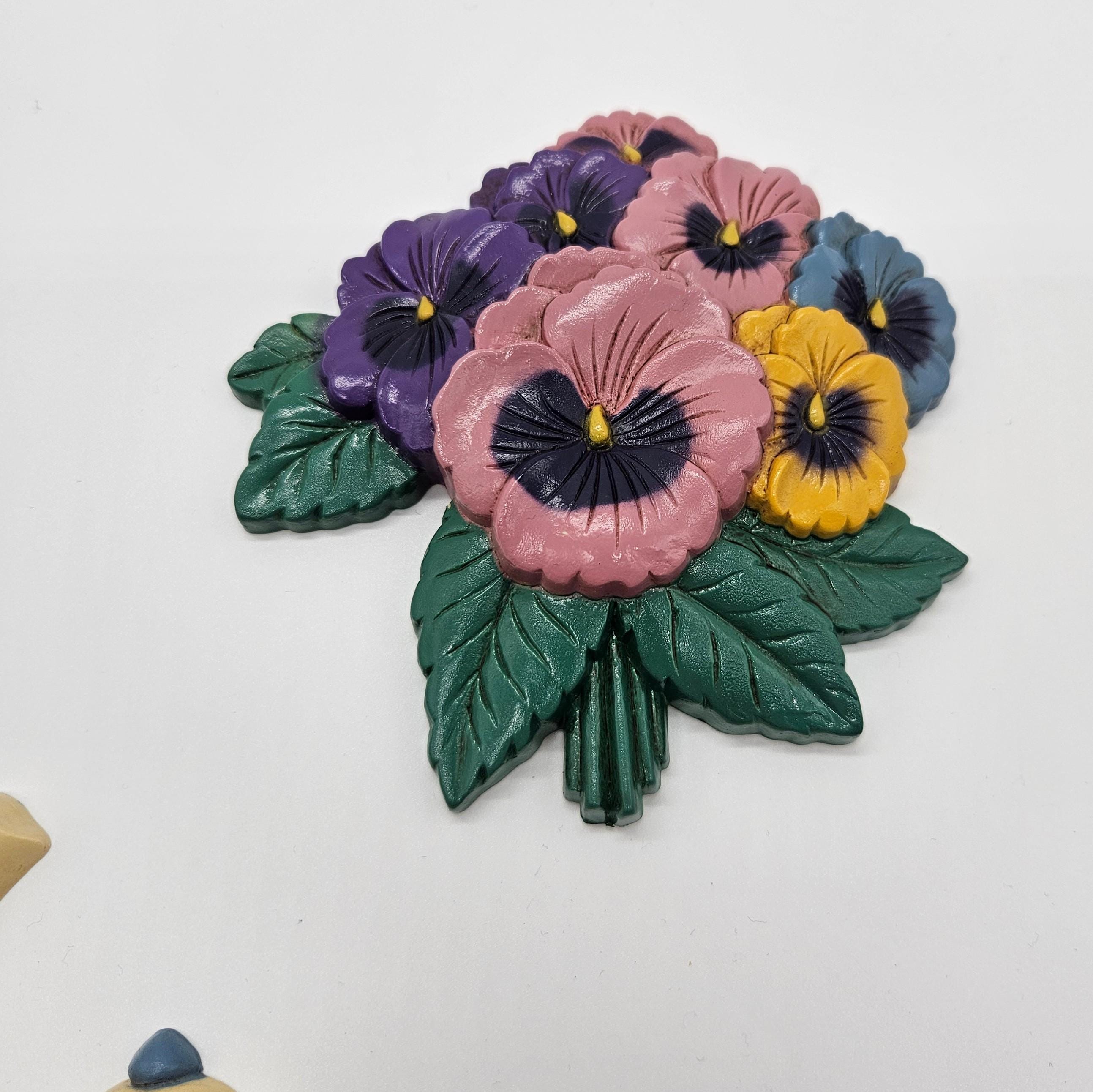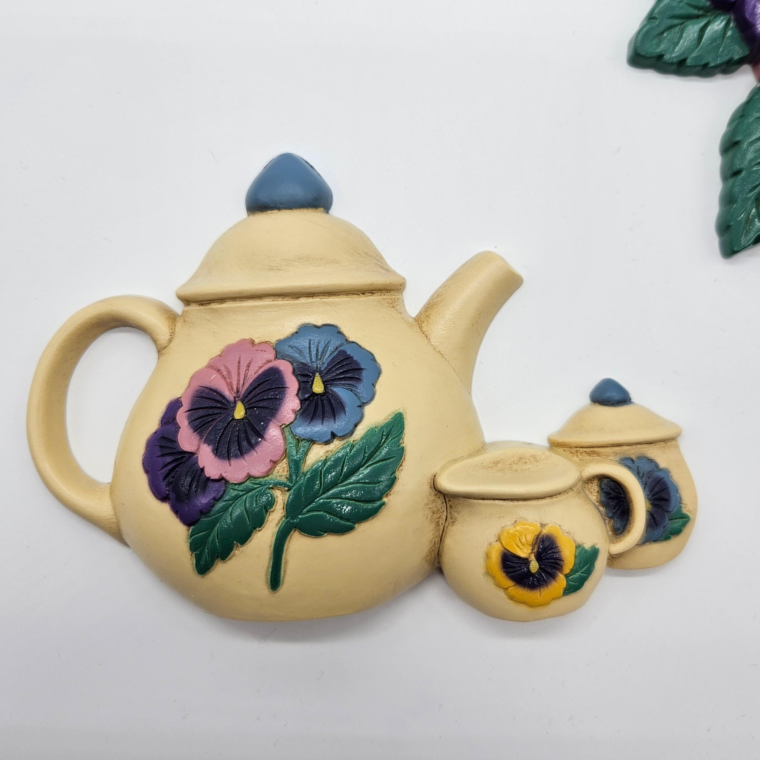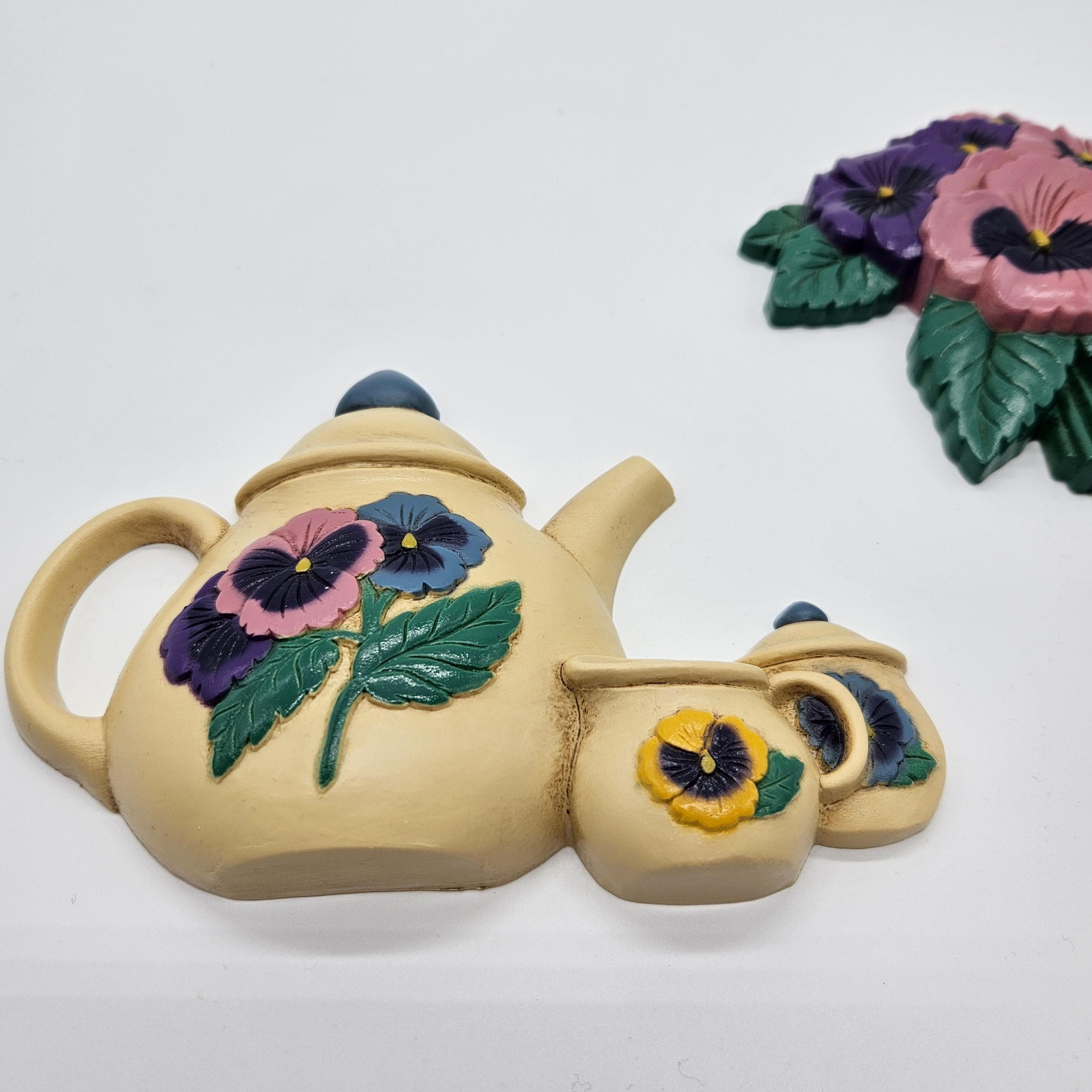 Brighten your kitchen with this charming set of vintage Burwood molded plastic wall plaques featuring colorful pansies and teapot. One plaque is a cheerful pansy bouquet (model 3320-2), and the other is a matching teapot with pansy accents, plus a tiny creamer and sugar pot.