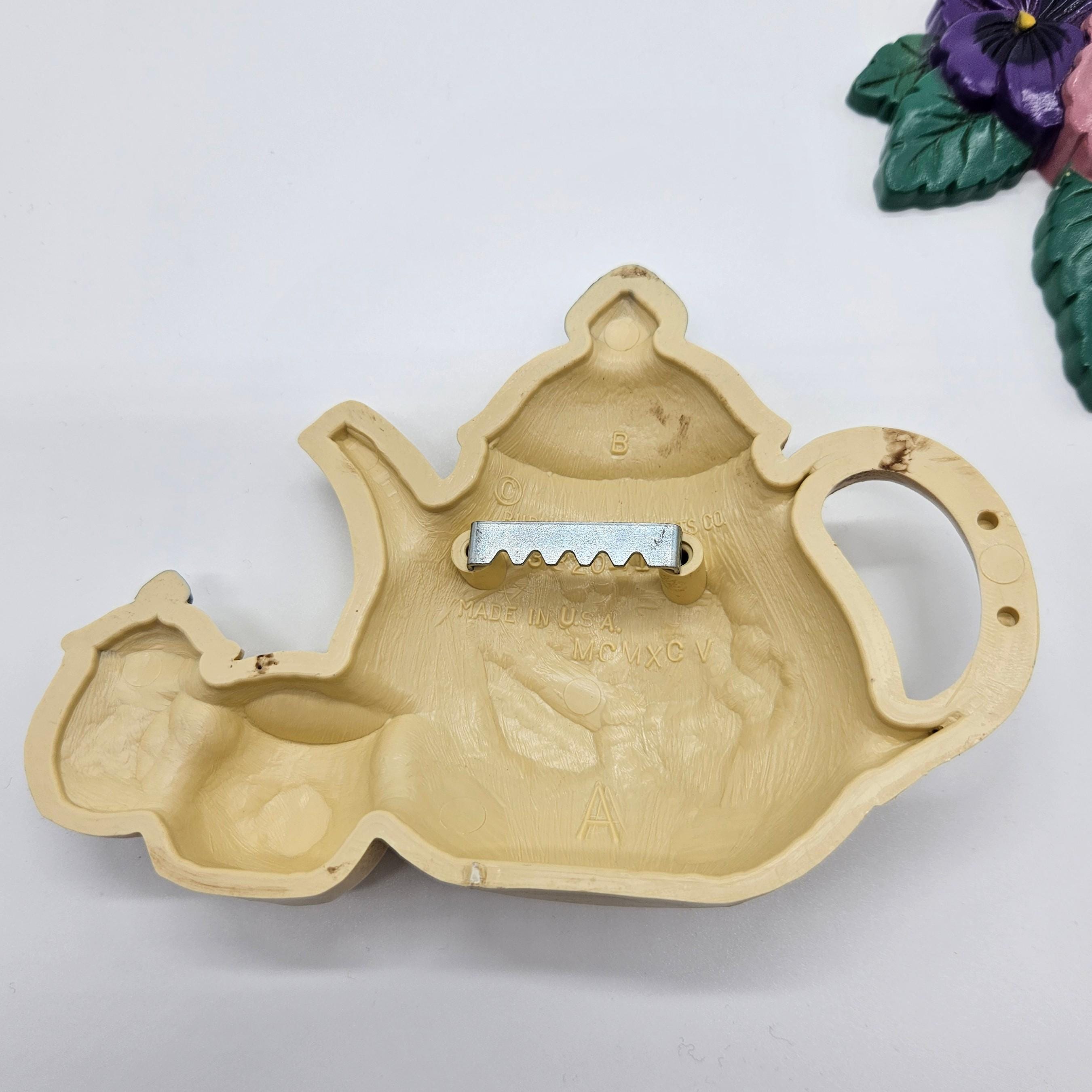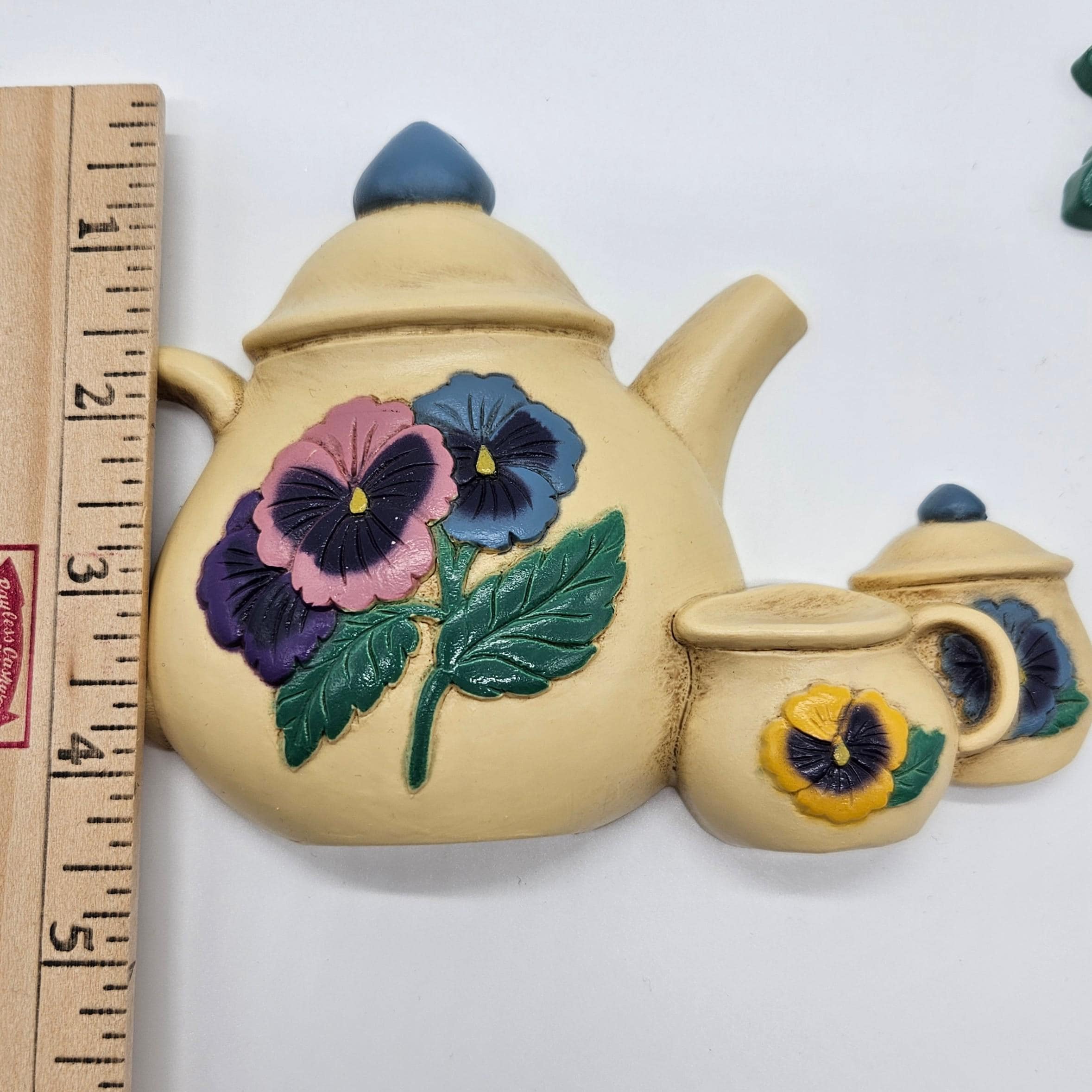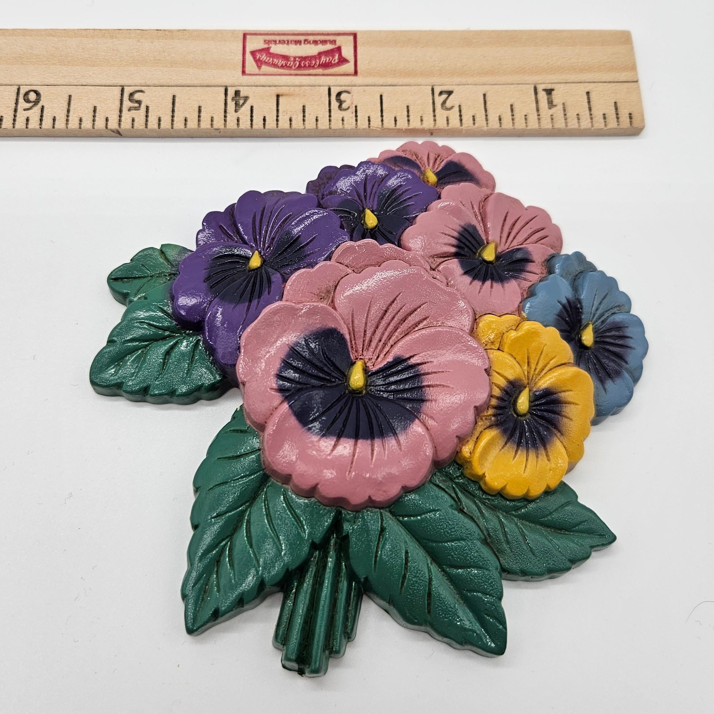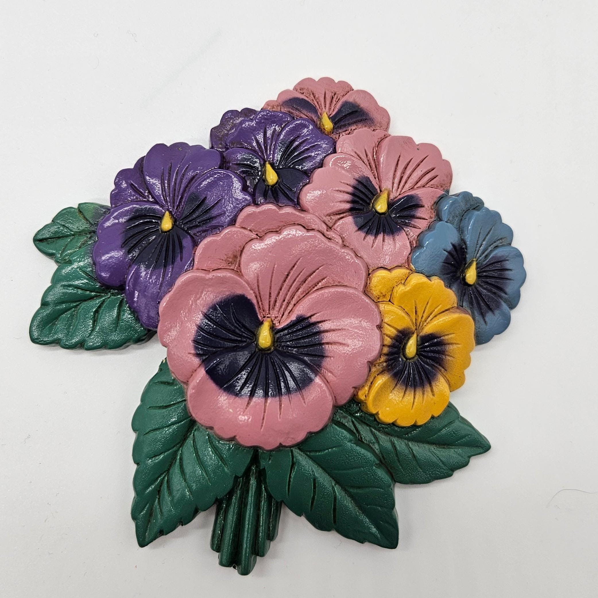 Brighten your kitchen with this charming set of vintage Burwood molded plastic wall plaques featuring colorful pansies and teapot. One plaque is a cheerful pansy bouquet (model 3320-2), and the other is a matching teapot with pansy accents, plus a tiny creamer and sugar pot.