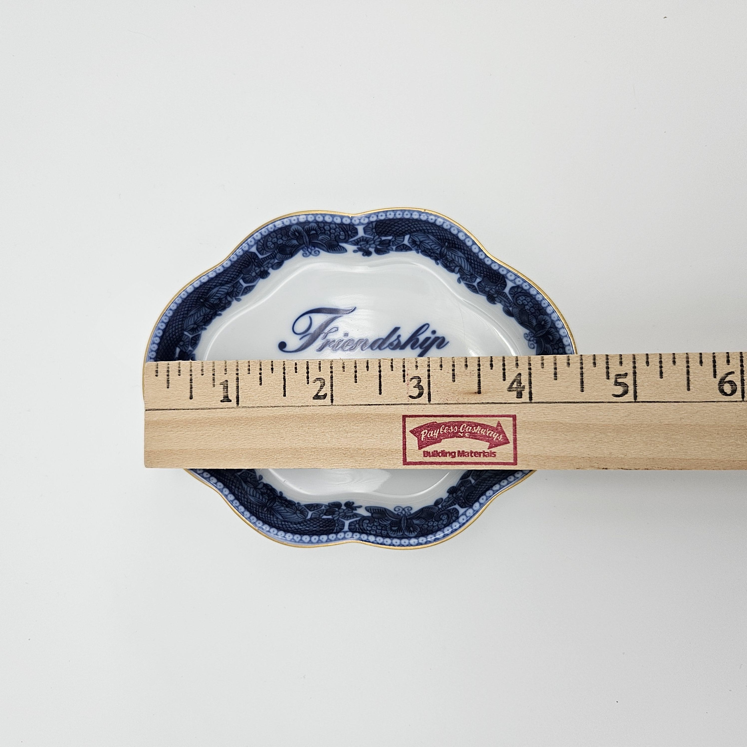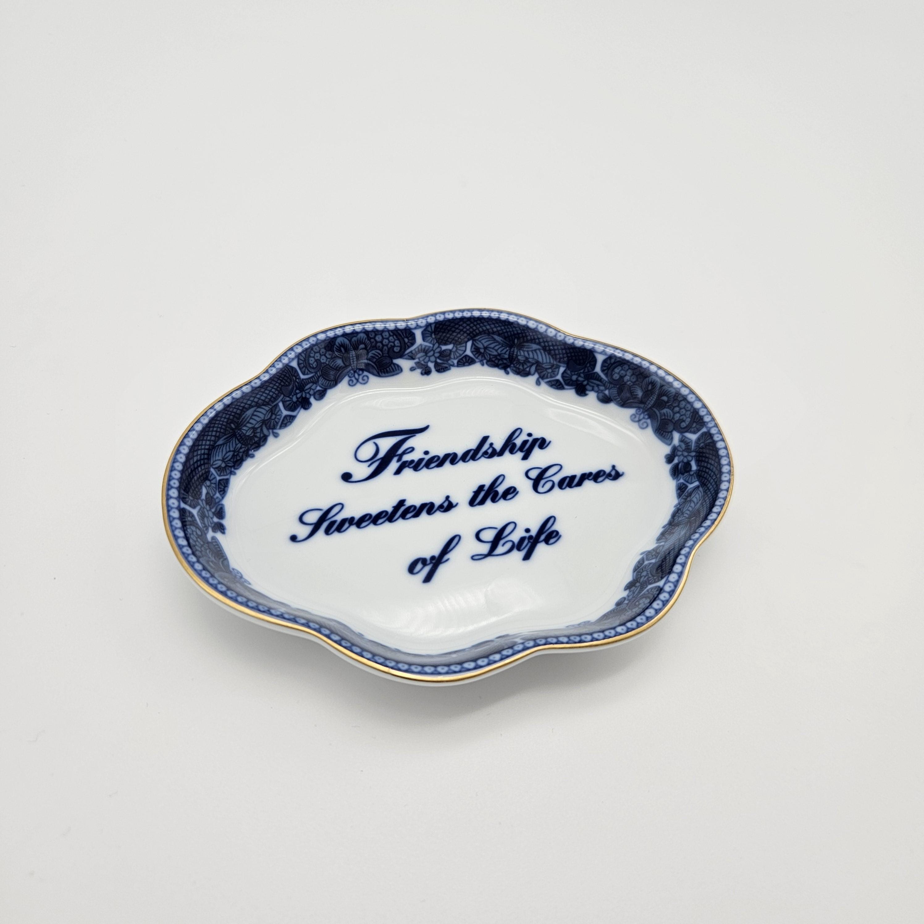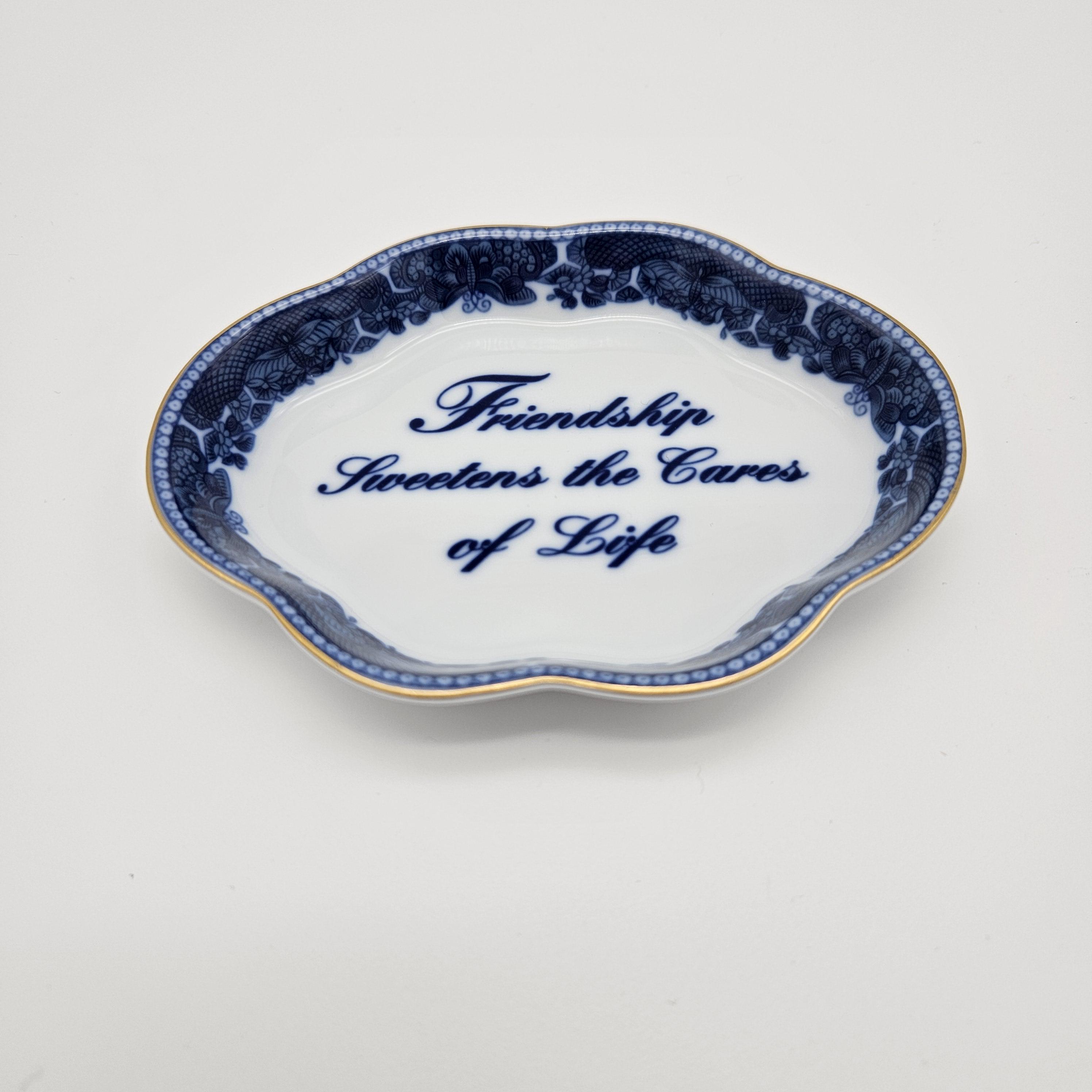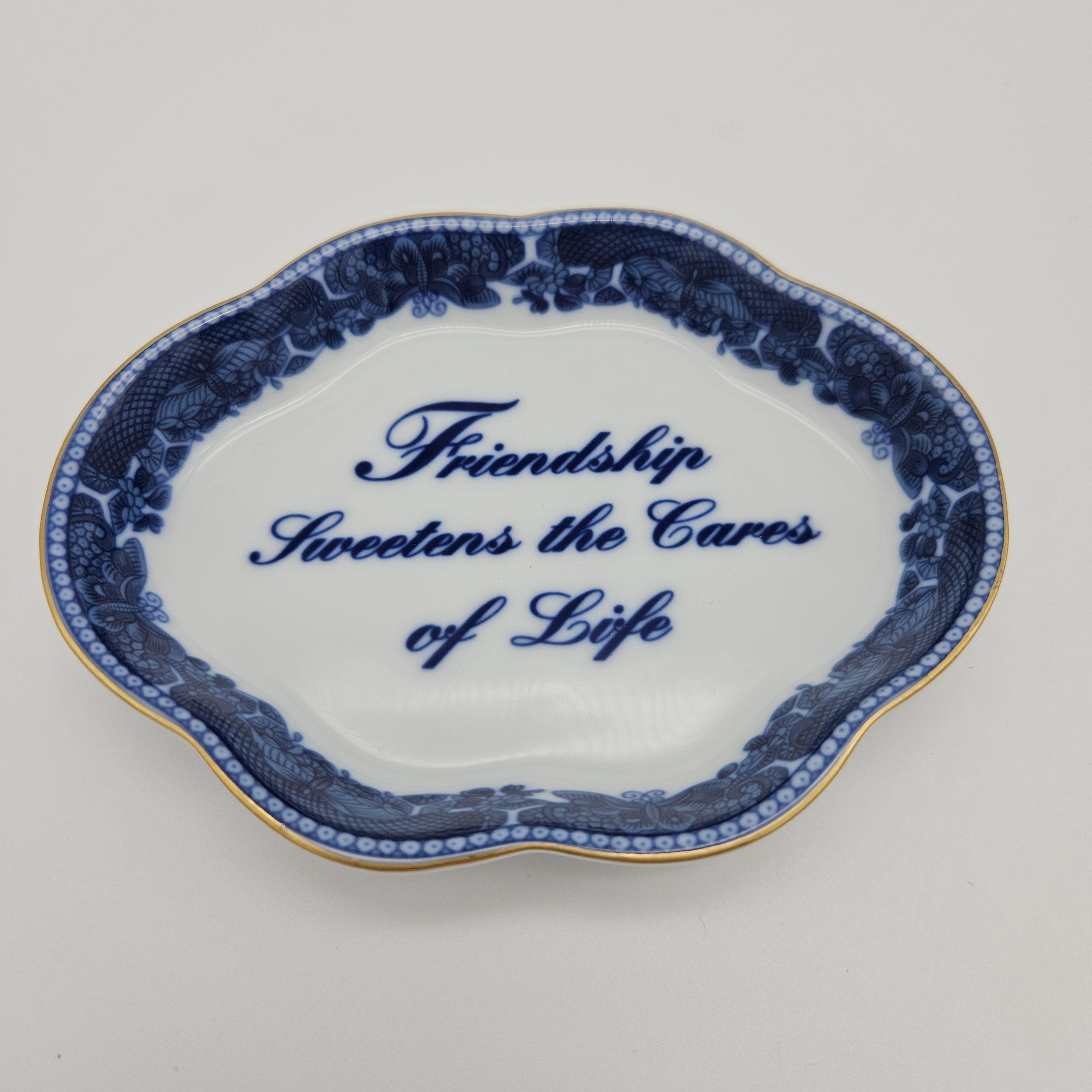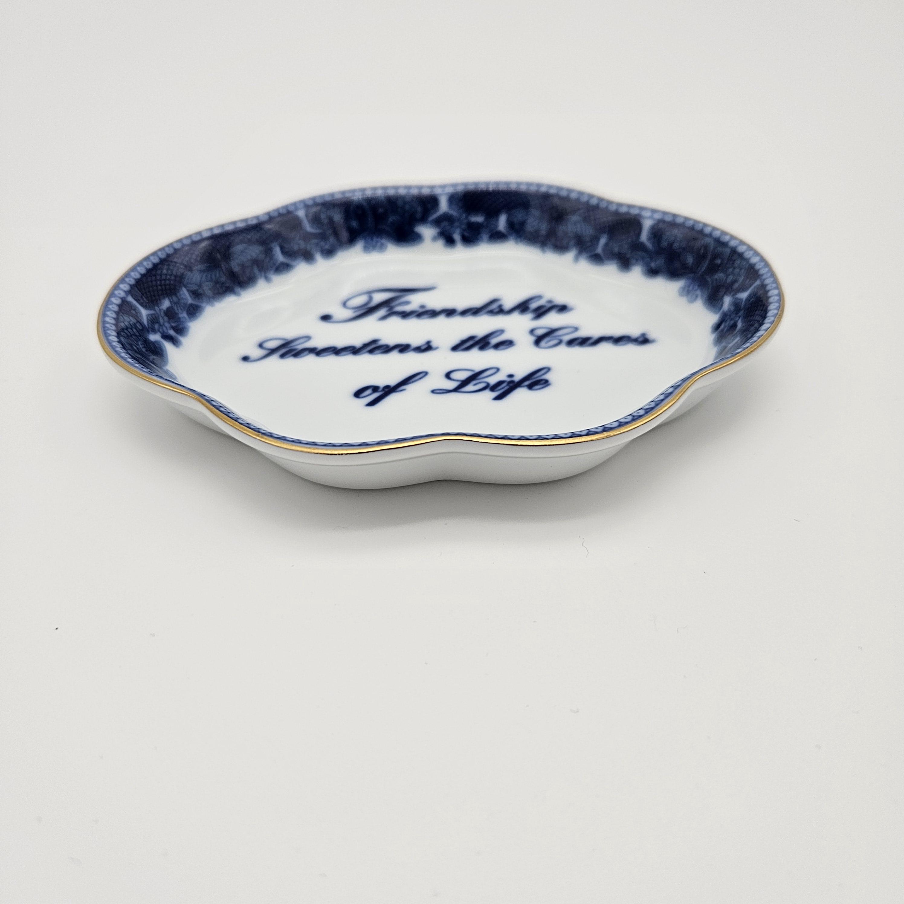This charming blue and white Mottahedeh porcelain dish features the sentiment “Friendship Sweetens the Cares of Life”. Has a scalloped edge, delicate floral border, and gold trim.