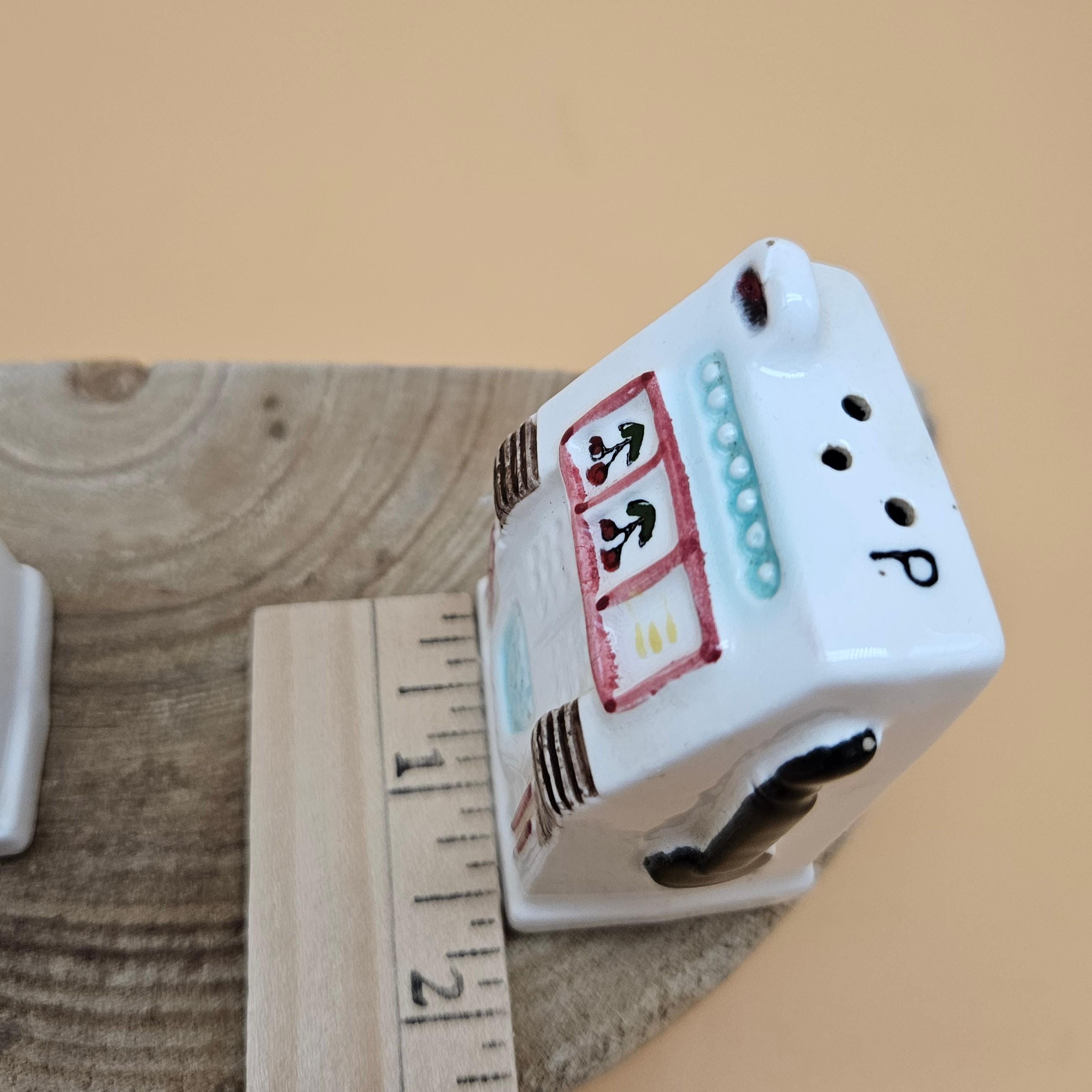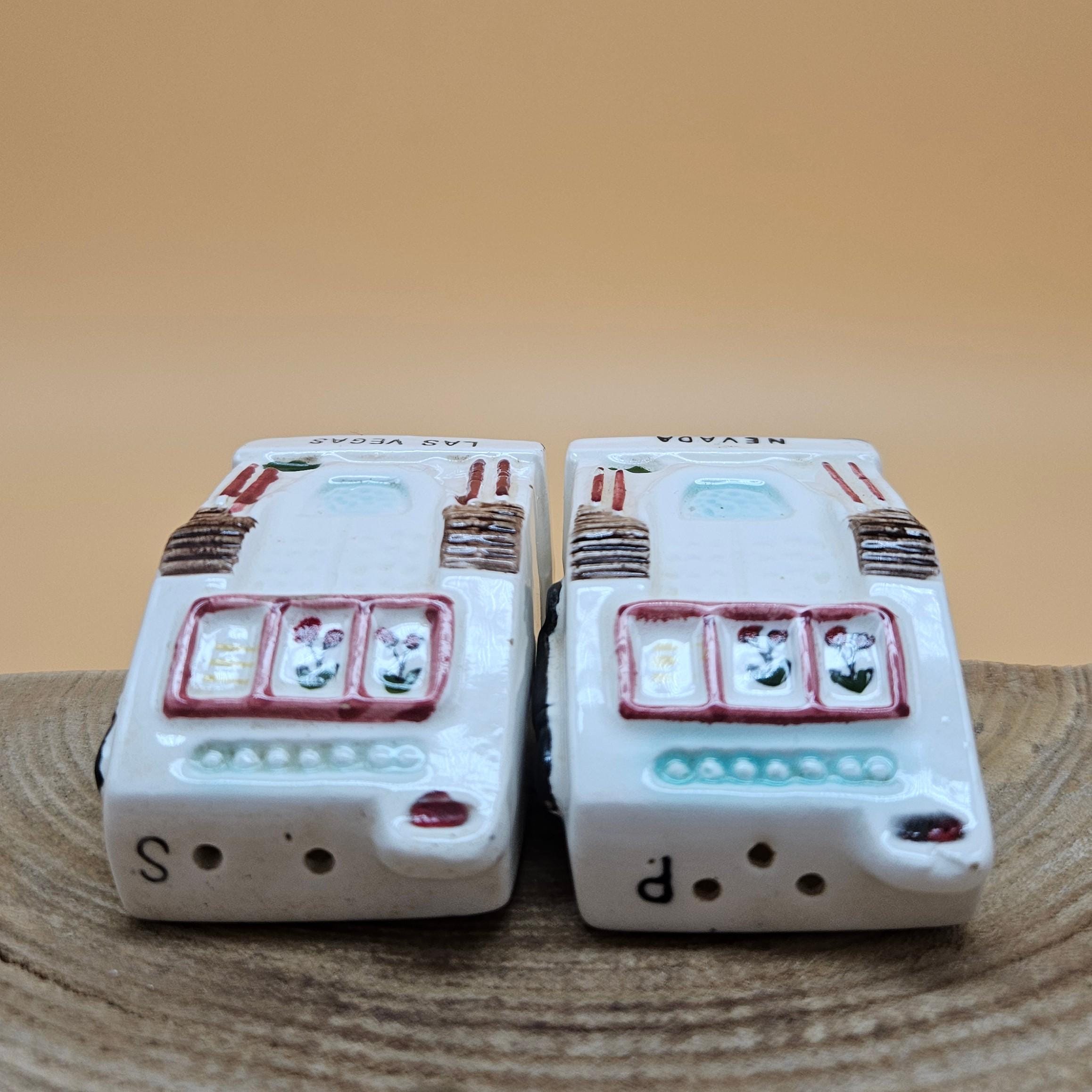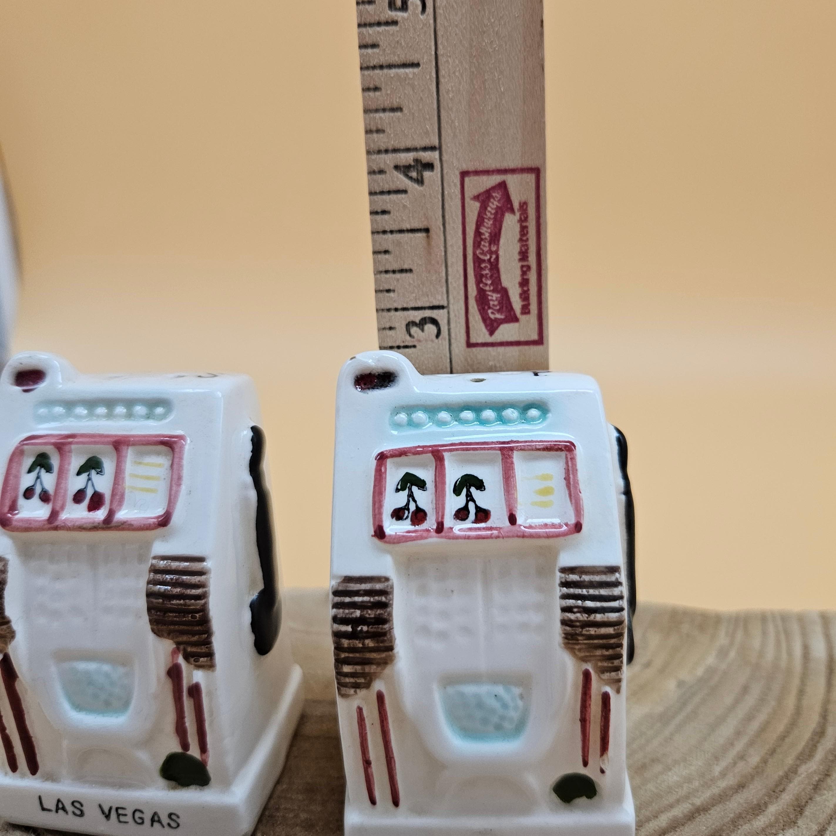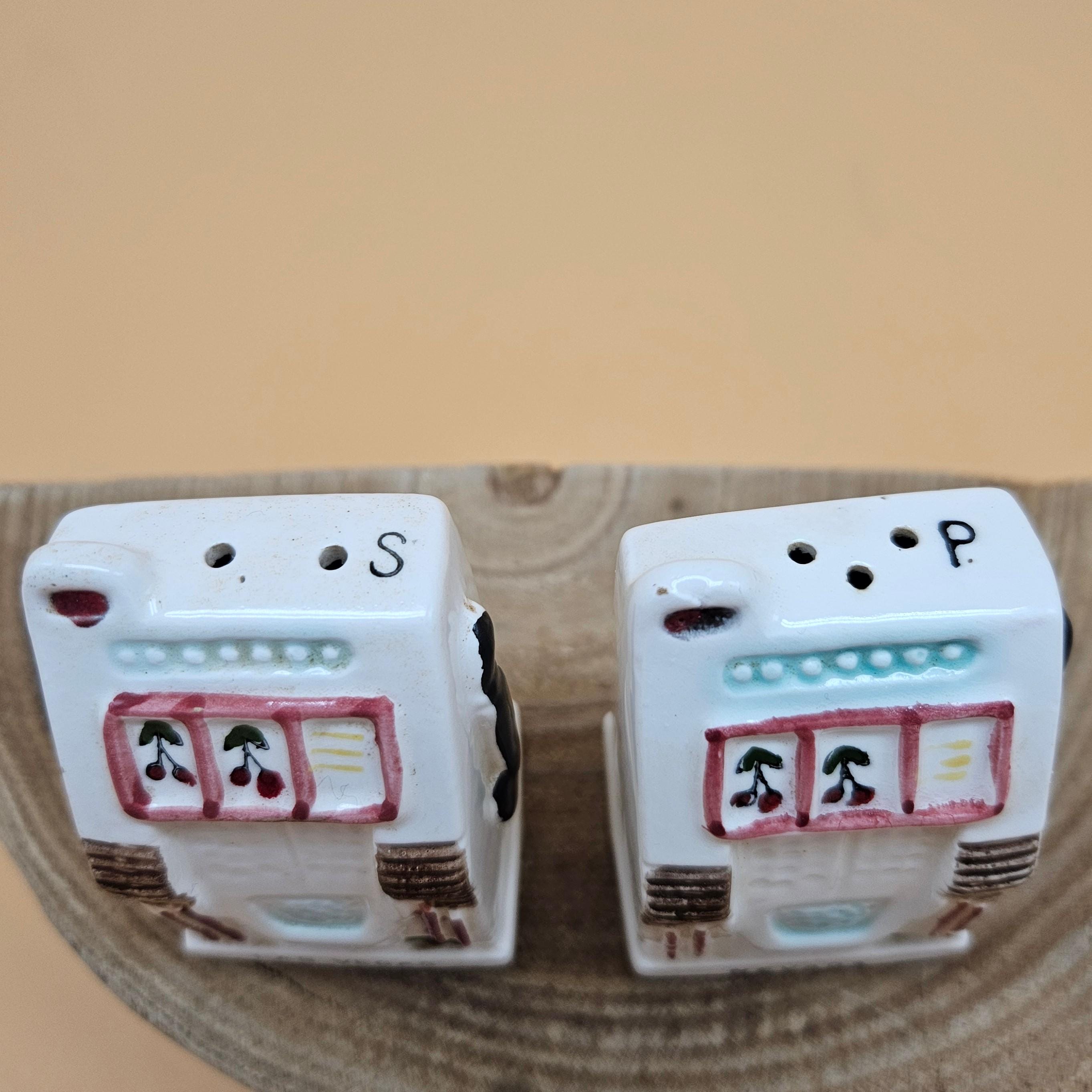 This vintage slot machine salt and pepper shaker set was made in Japan and sold through Cornet Stores decades ago. These mid-century ceramic shakers are hand painted with adorable details, cherries, levers, the classic “Las Vegas” and “Nevada” labeling ..and still have their original stoppers and foil stickers attached.