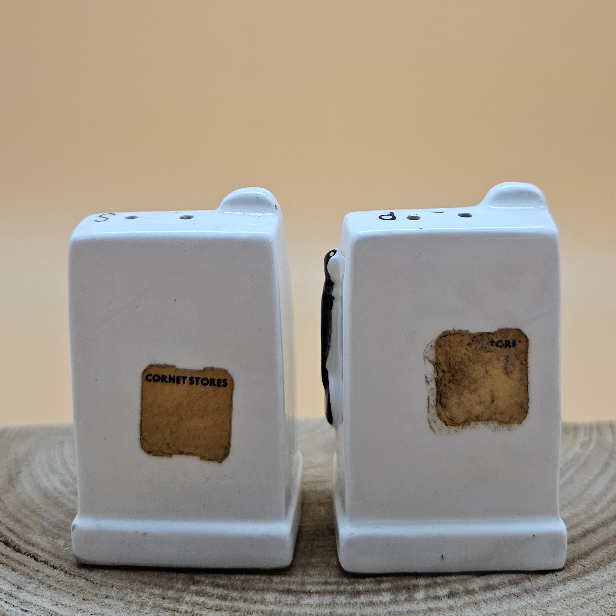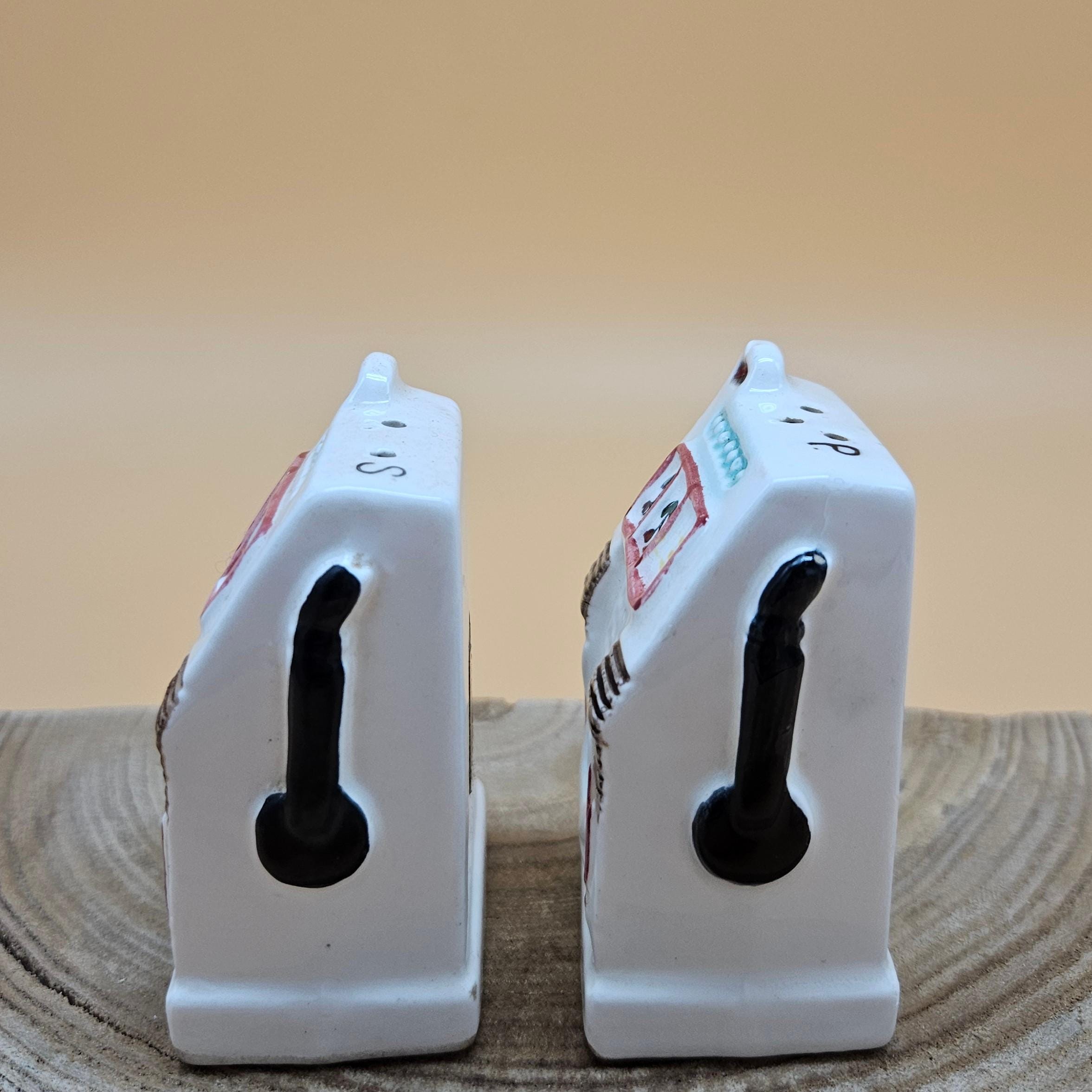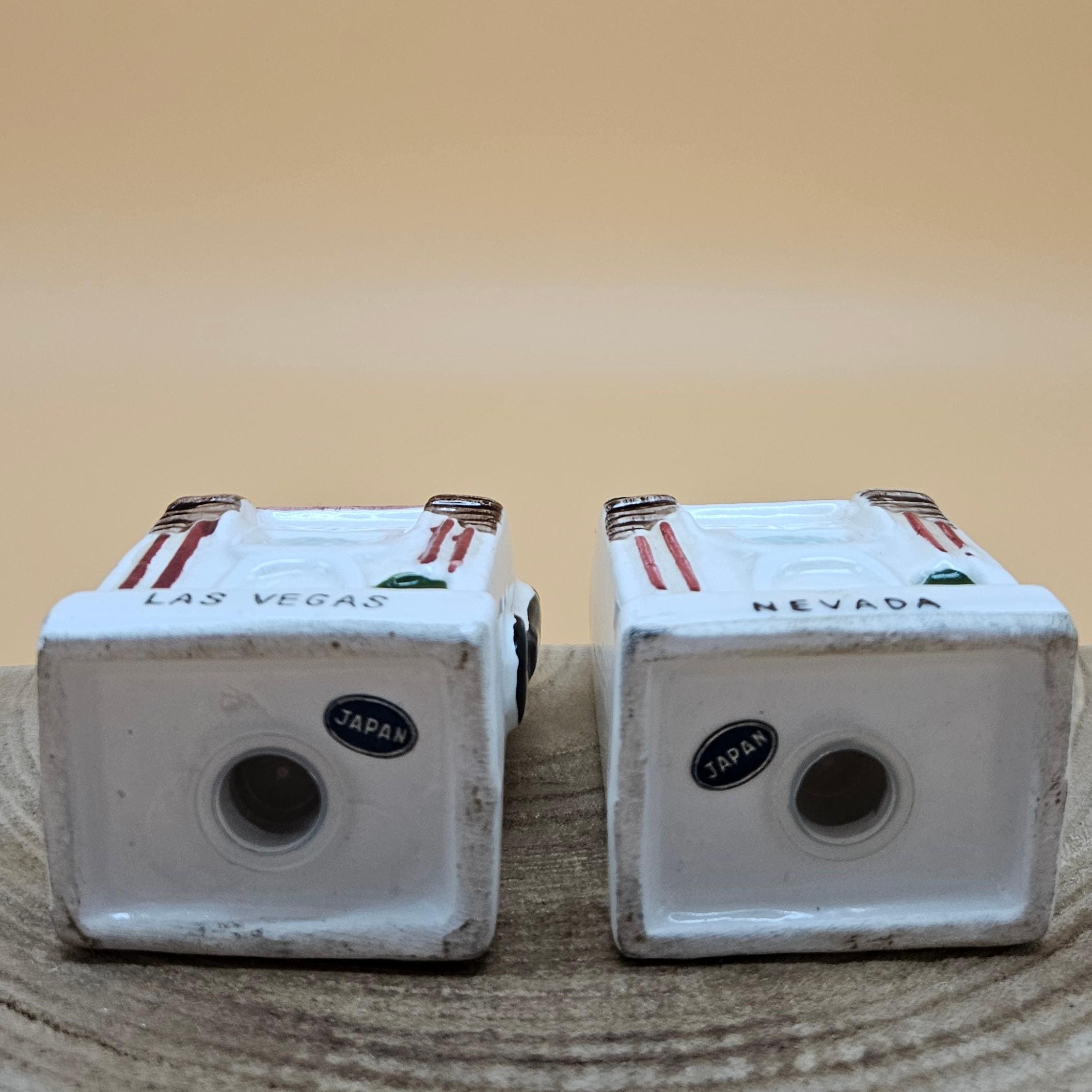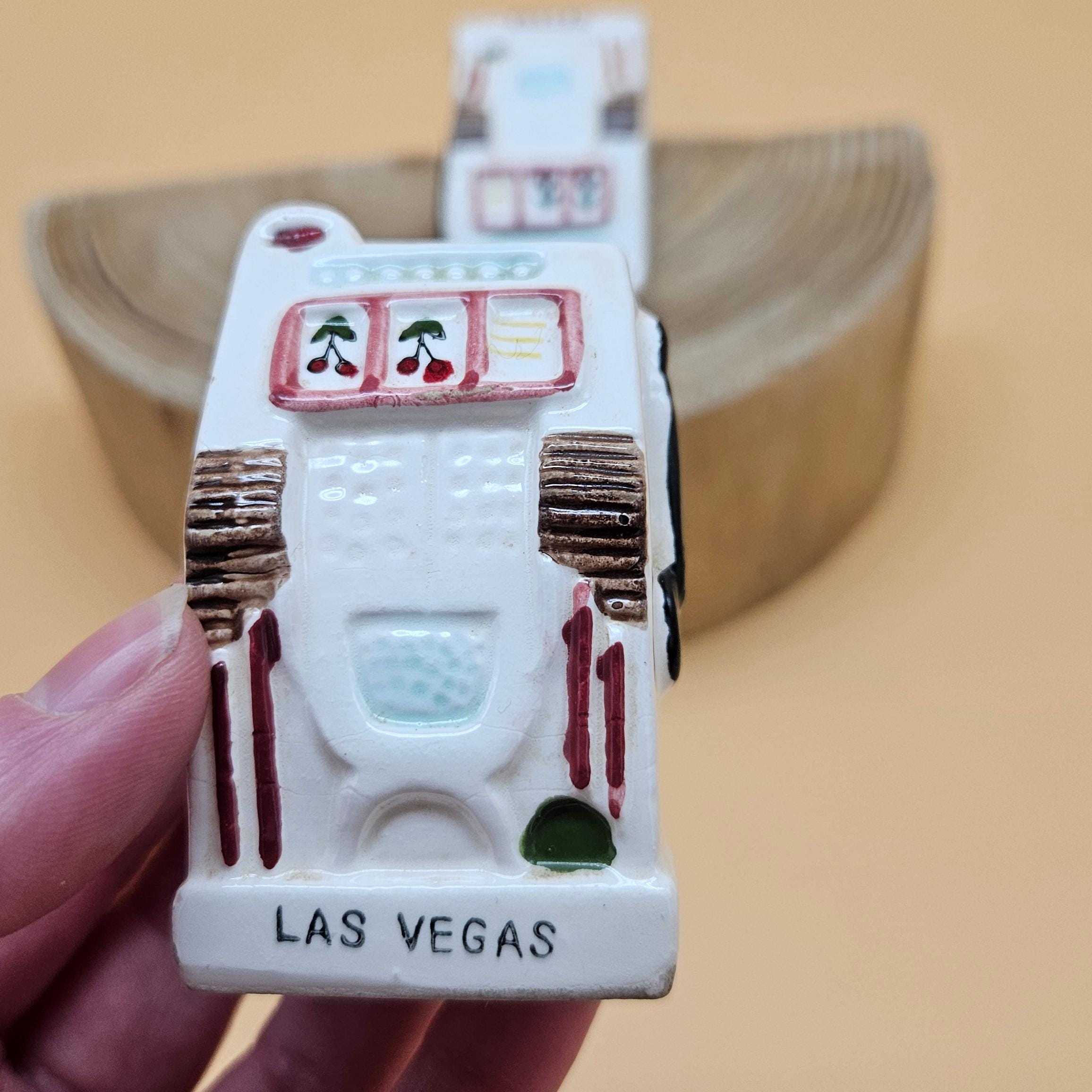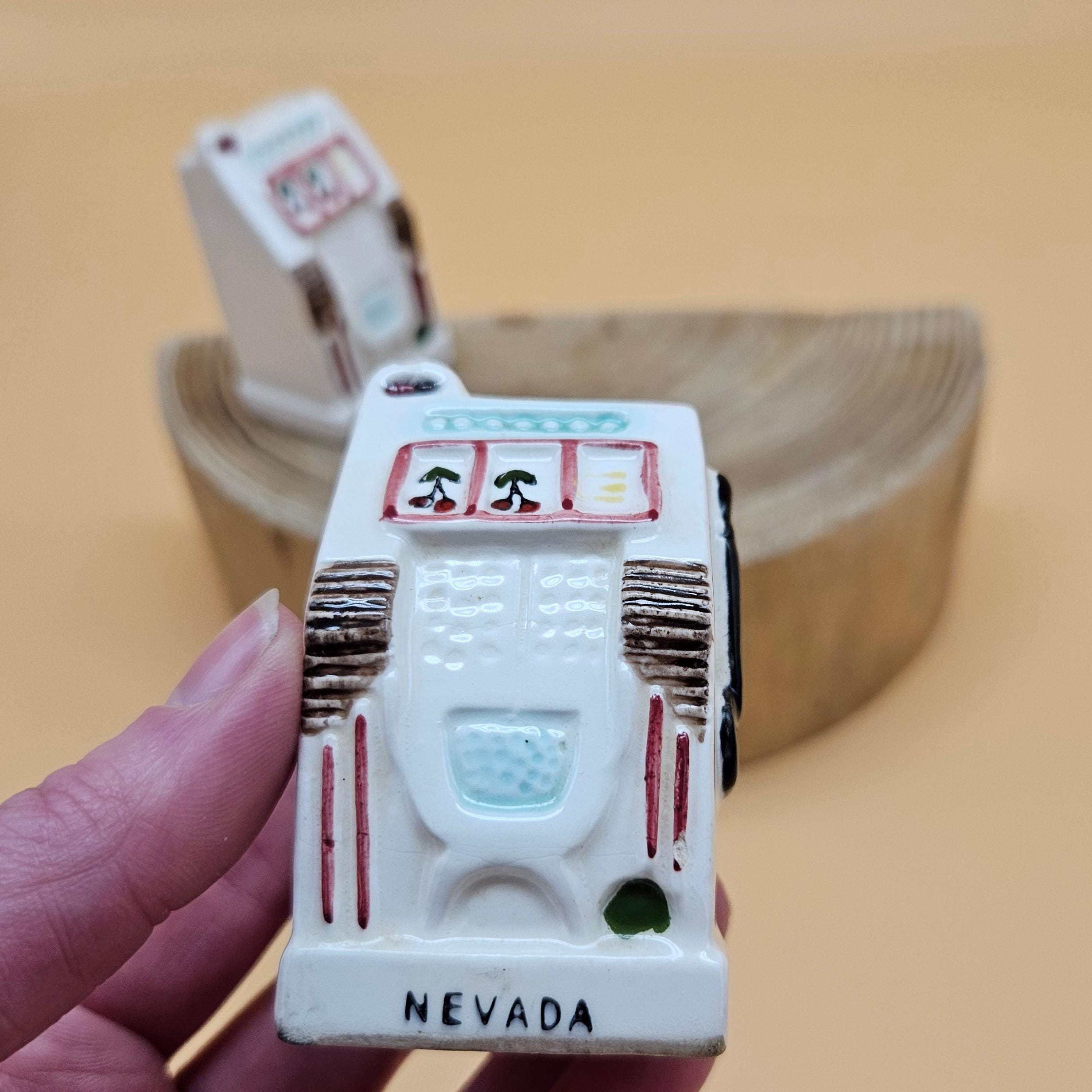 This vintage slot machine salt and pepper shaker set was made in Japan and sold through Cornet Stores decades ago. These mid-century ceramic shakers are hand painted with adorable details, cherries, levers, the classic “Las Vegas” and “Nevada” labeling ..and still have their original stoppers and foil stickers attached.