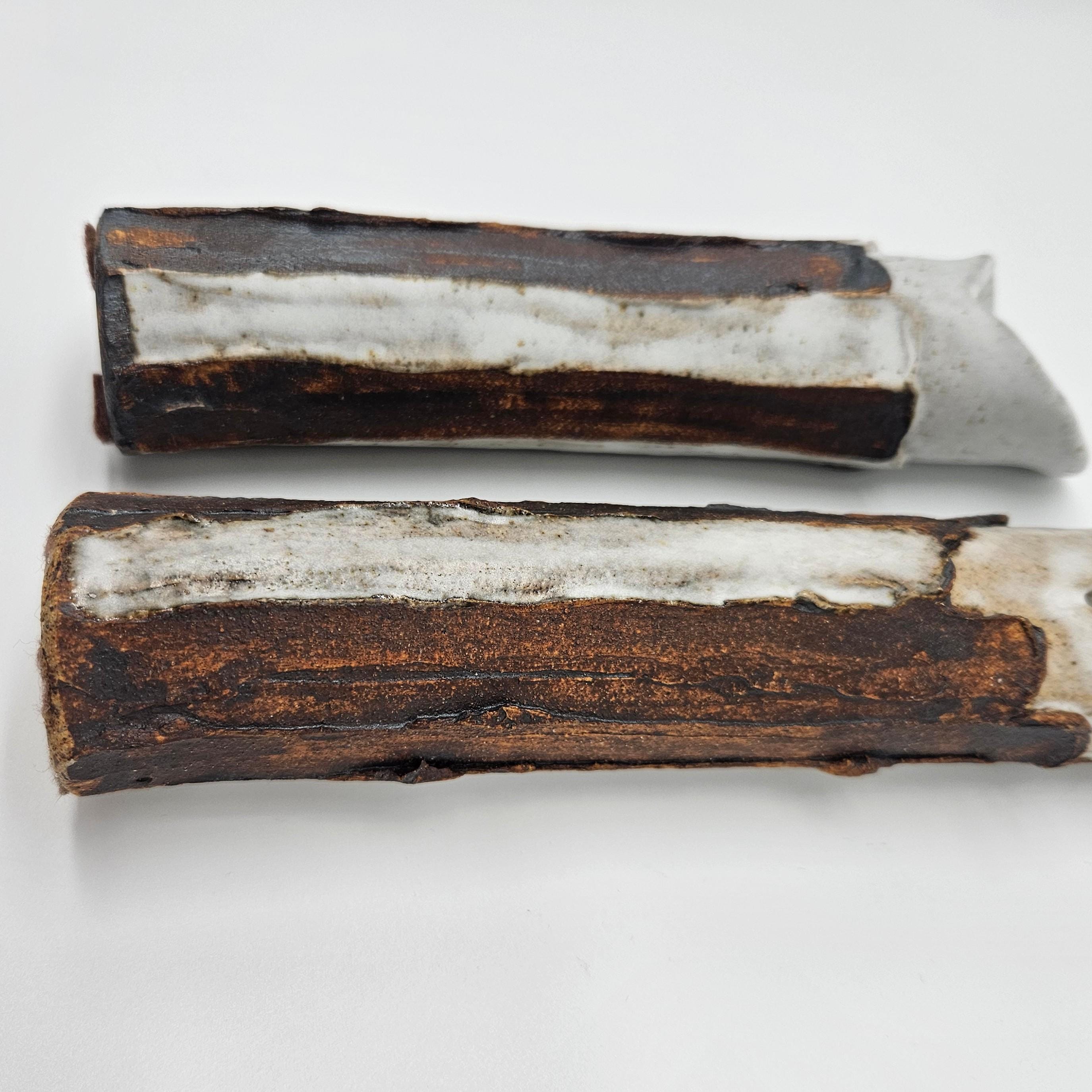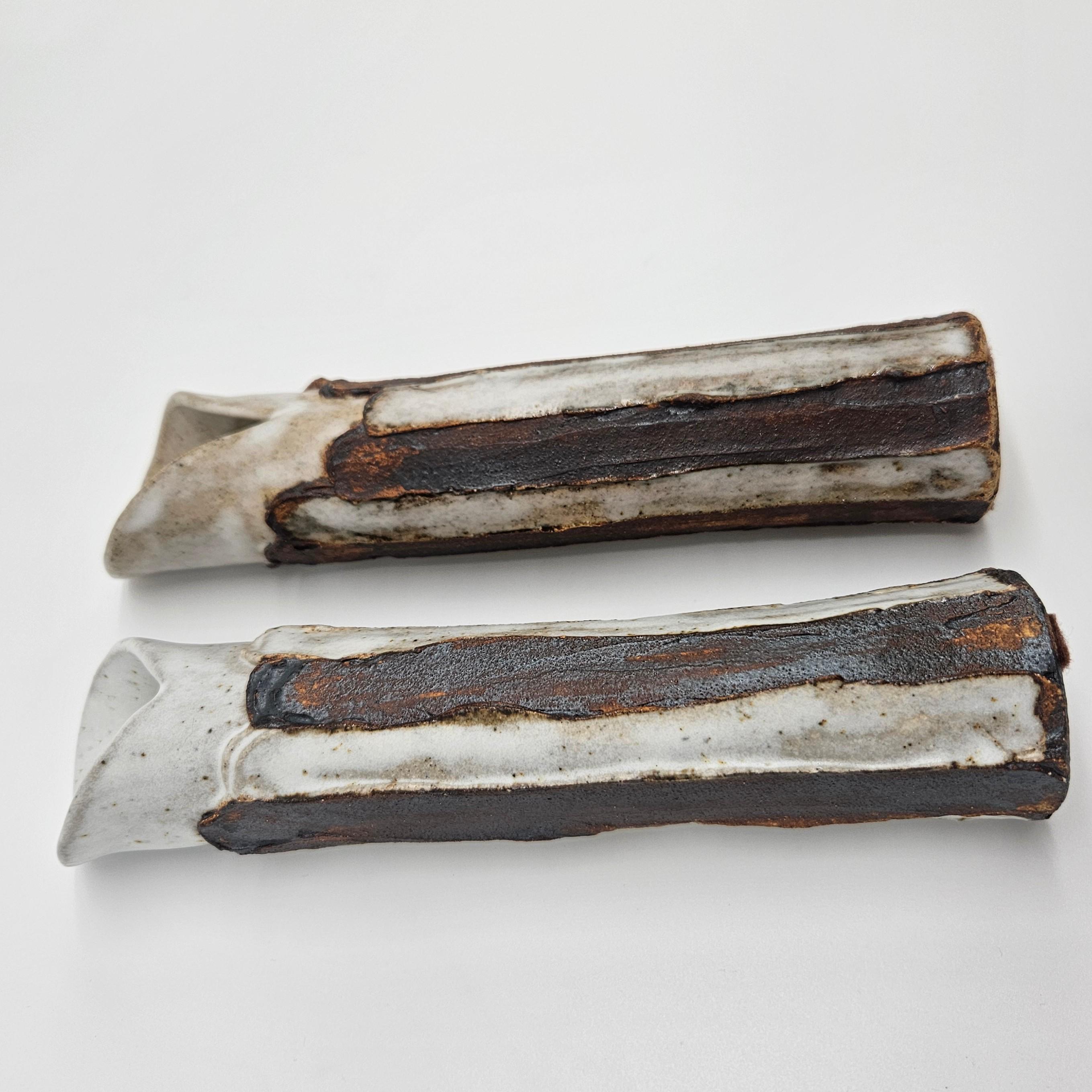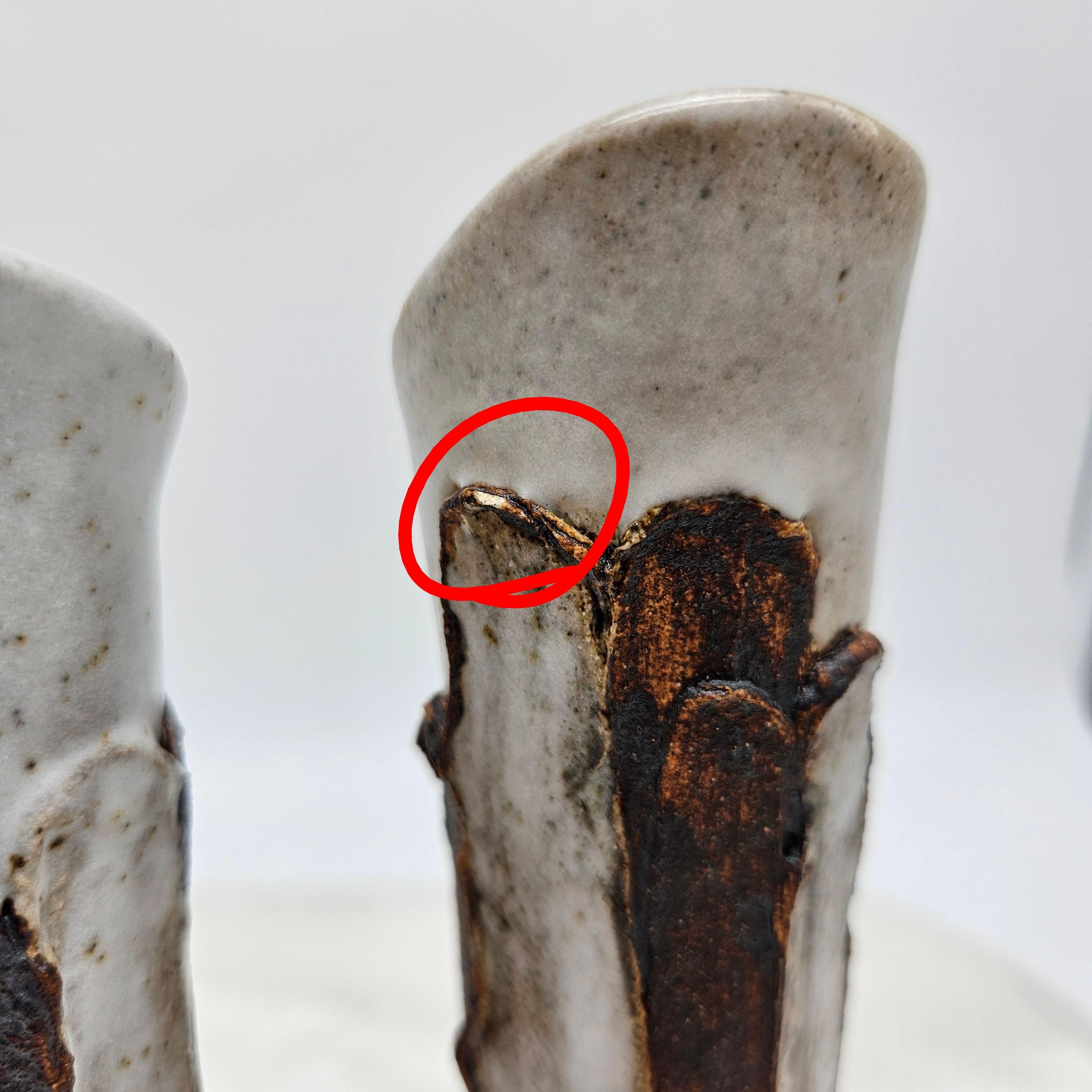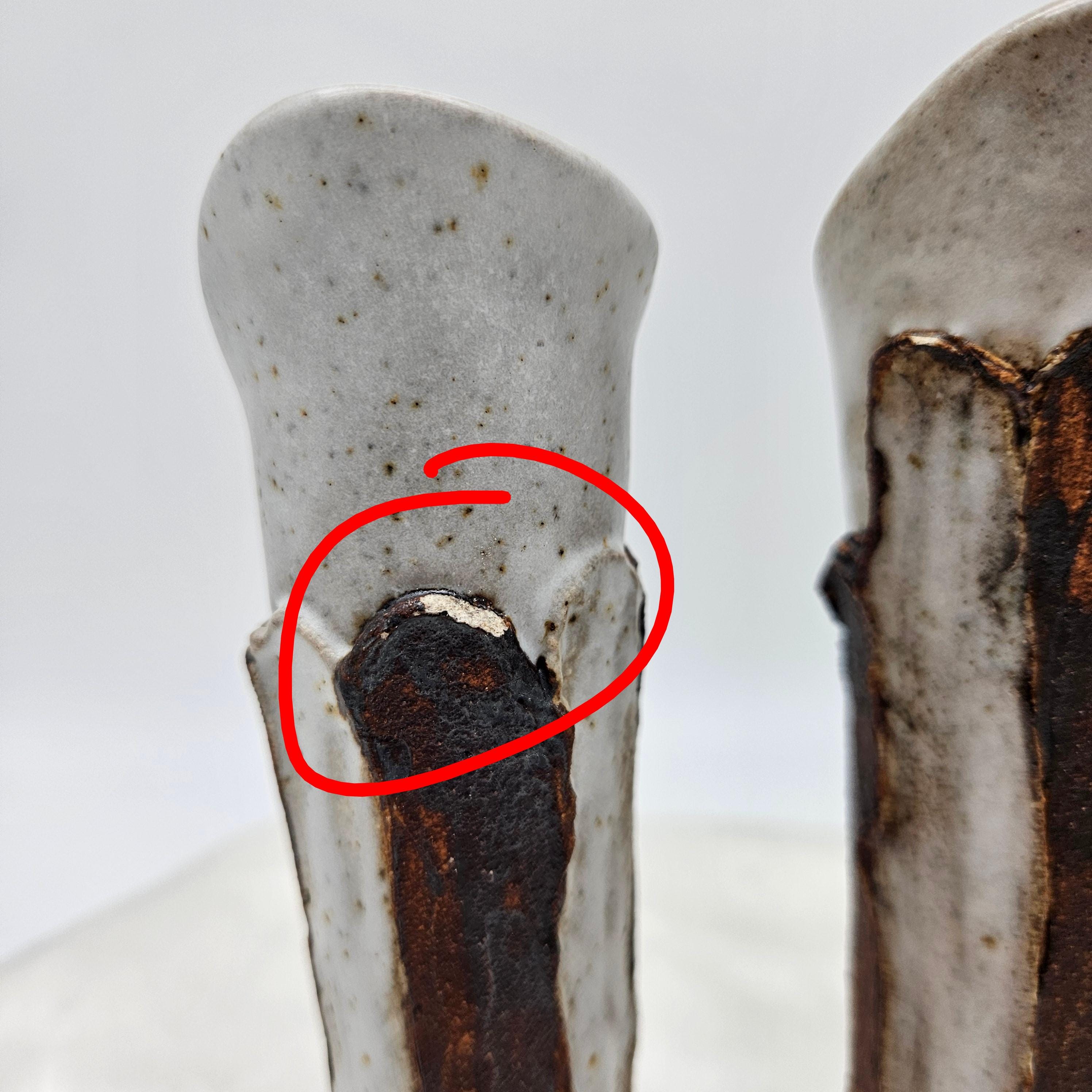 Very good pre owned condition. One small chip on the back side of each item (circled in red). Natural variations, glaze breaks, and surface texture are intentional to the design. Felt pads on one base, the other has worn off over time.