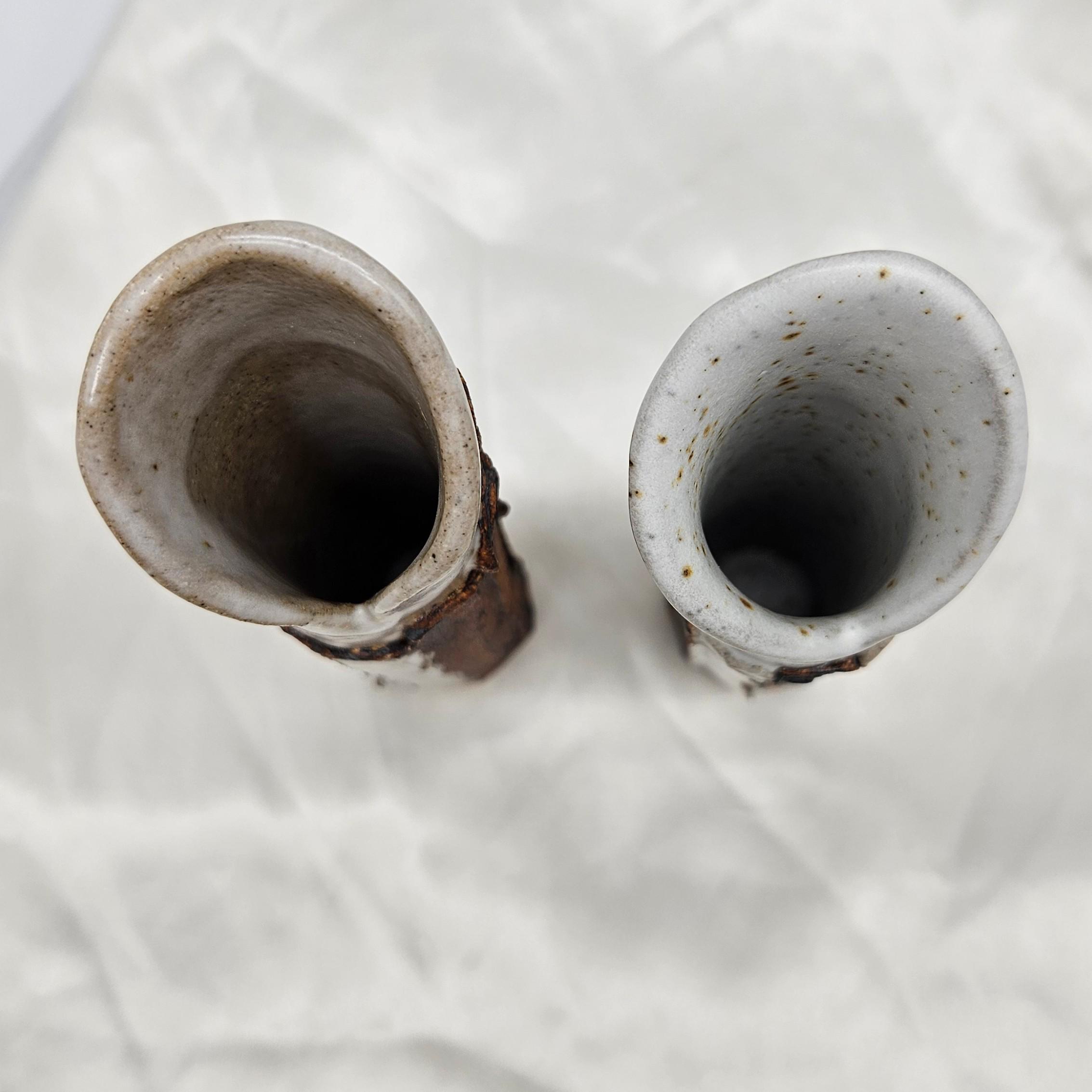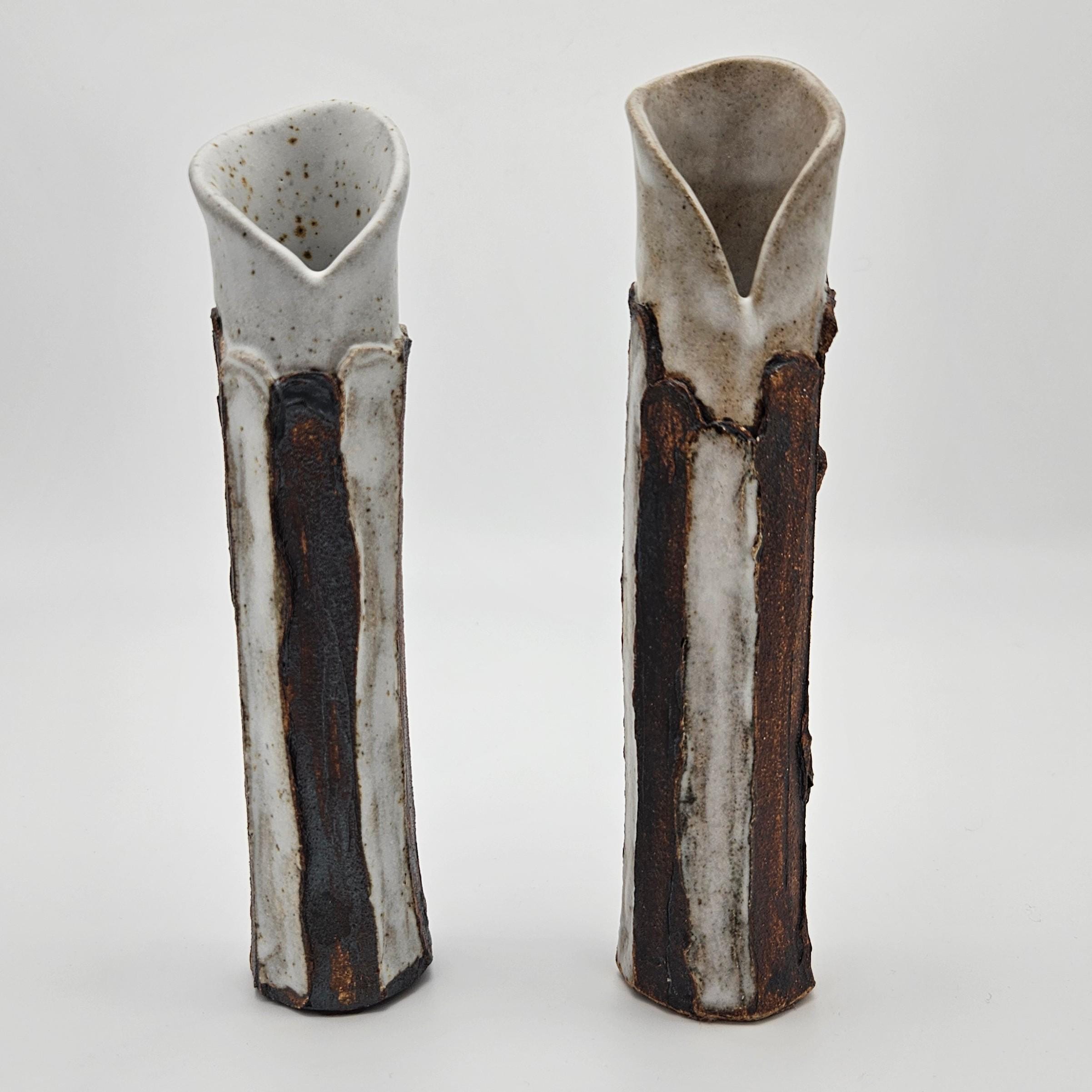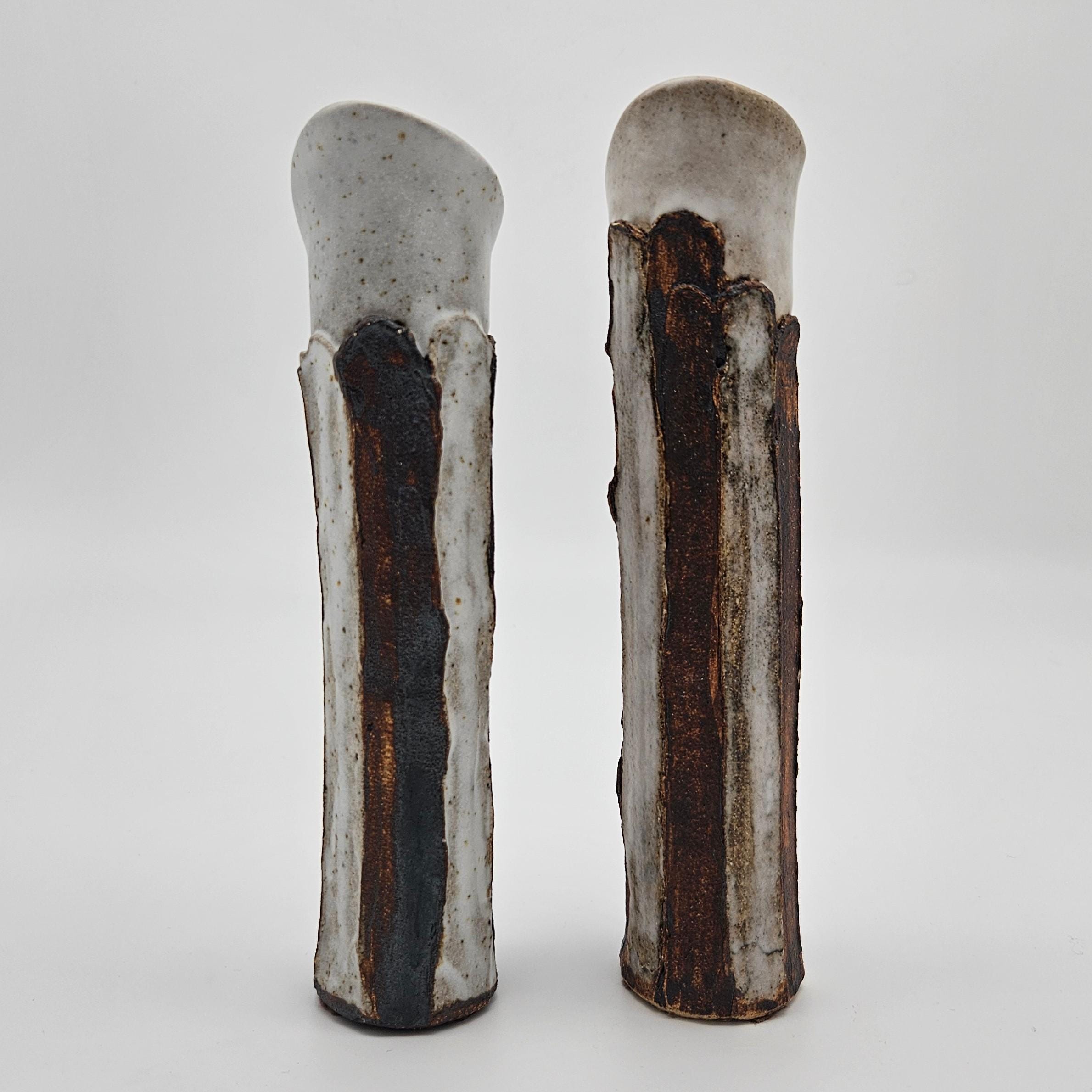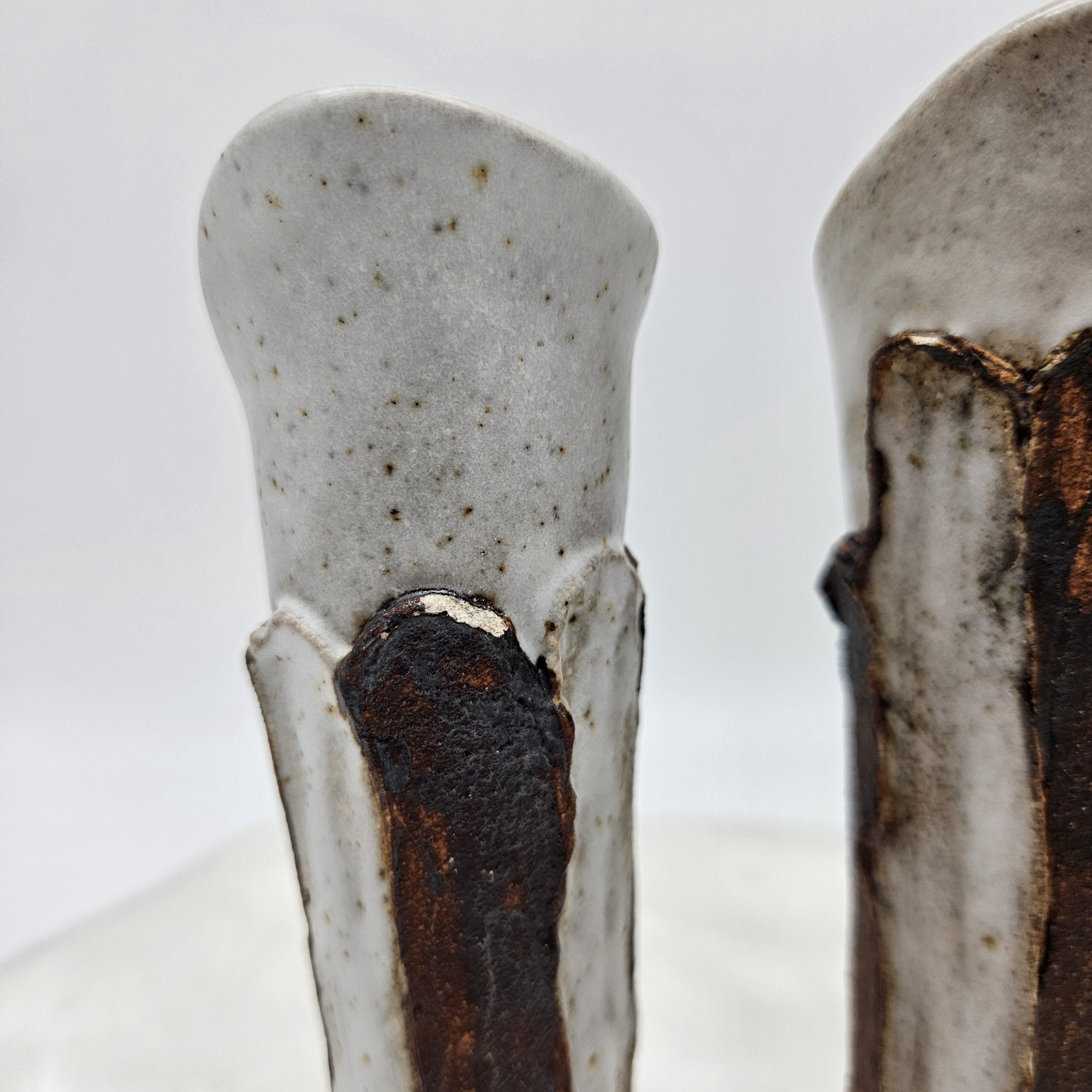 This striking pair of handbuilt studio pottery vases features sculptural, vertical forms with folded rims and dramatic surface texture. Made from iron rich stoneware and signed and dated 2007, these vessels showcase a beautiful contrast between soft matte glaze and darker exposed clay areas with a subtle metallic sheen from high fire reduction.