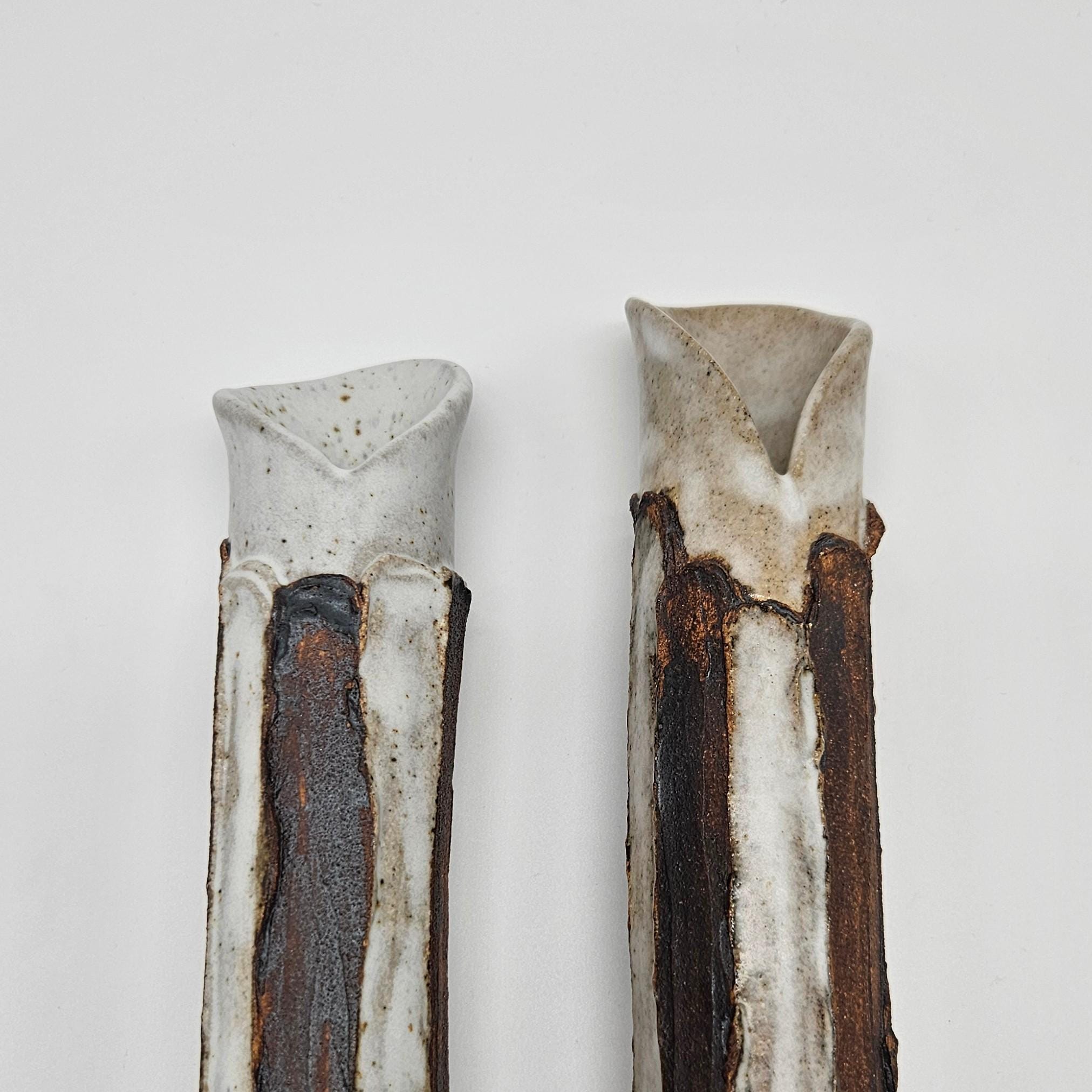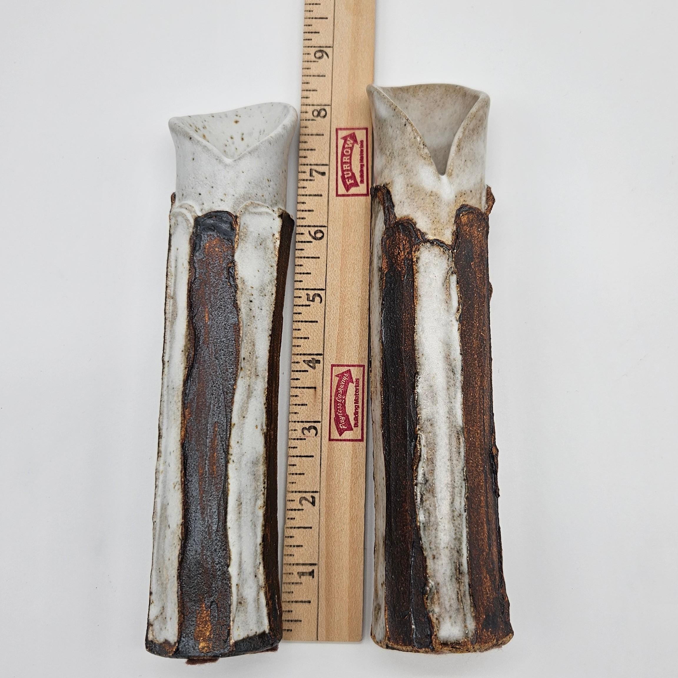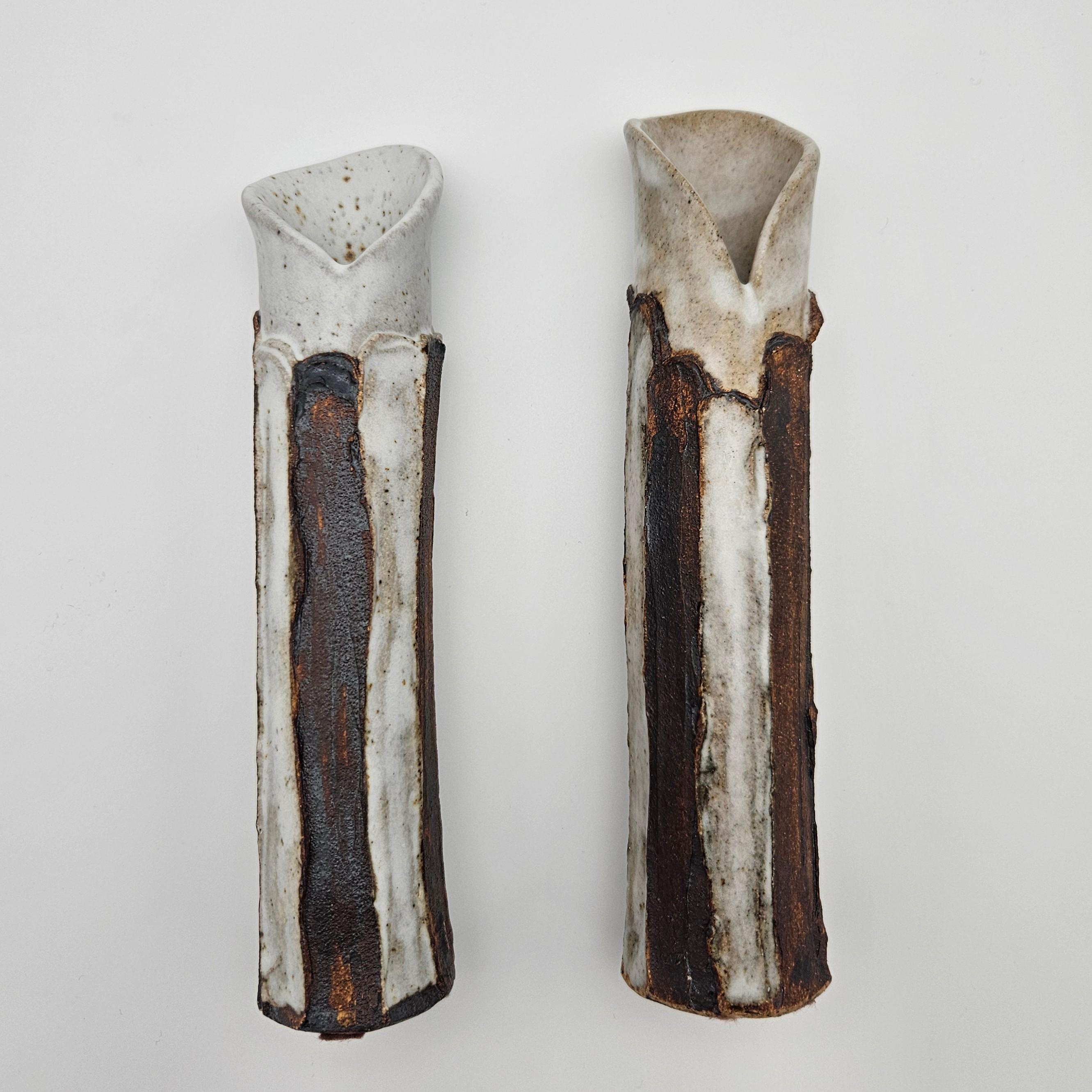 This striking pair of handbuilt studio pottery vases features sculptural, vertical forms with folded rims and dramatic surface texture. Made from iron rich stoneware and signed and dated 2007, these vessels showcase a beautiful contrast between soft matte glaze and darker exposed clay areas with a subtle metallic sheen from high fire reduction.