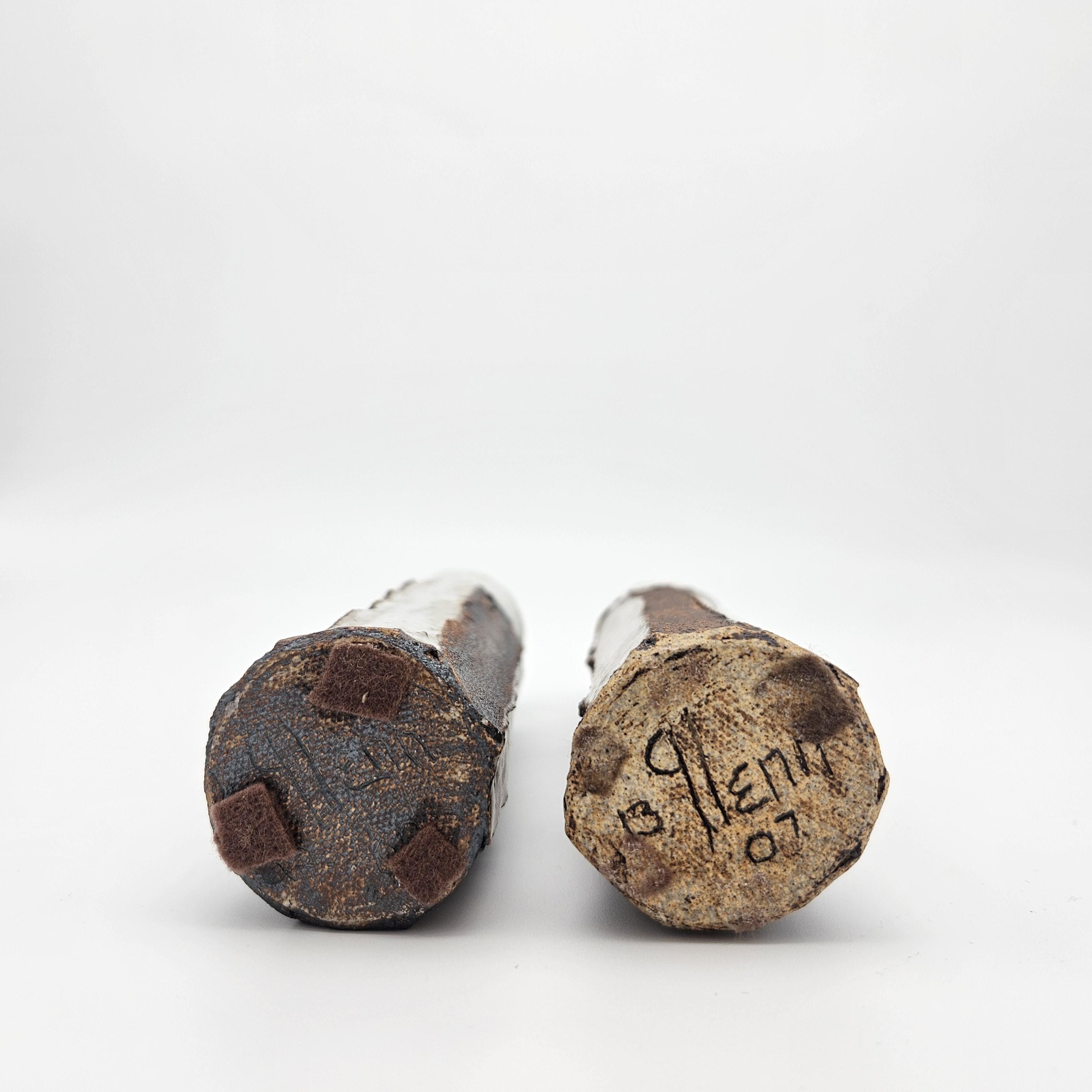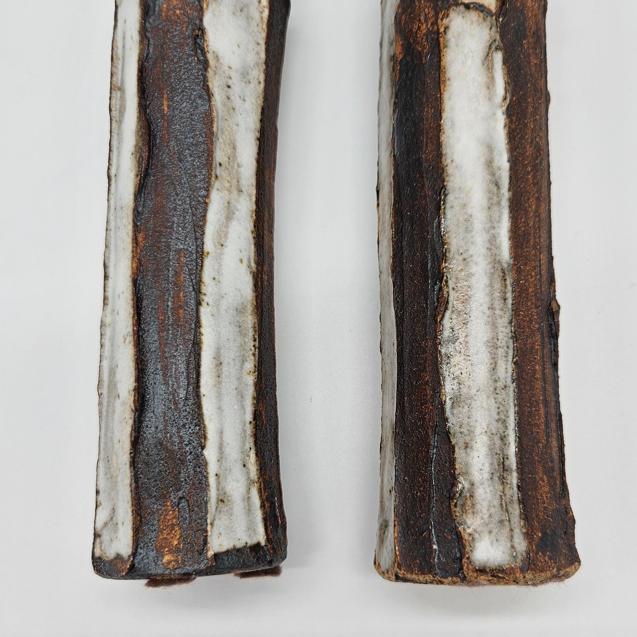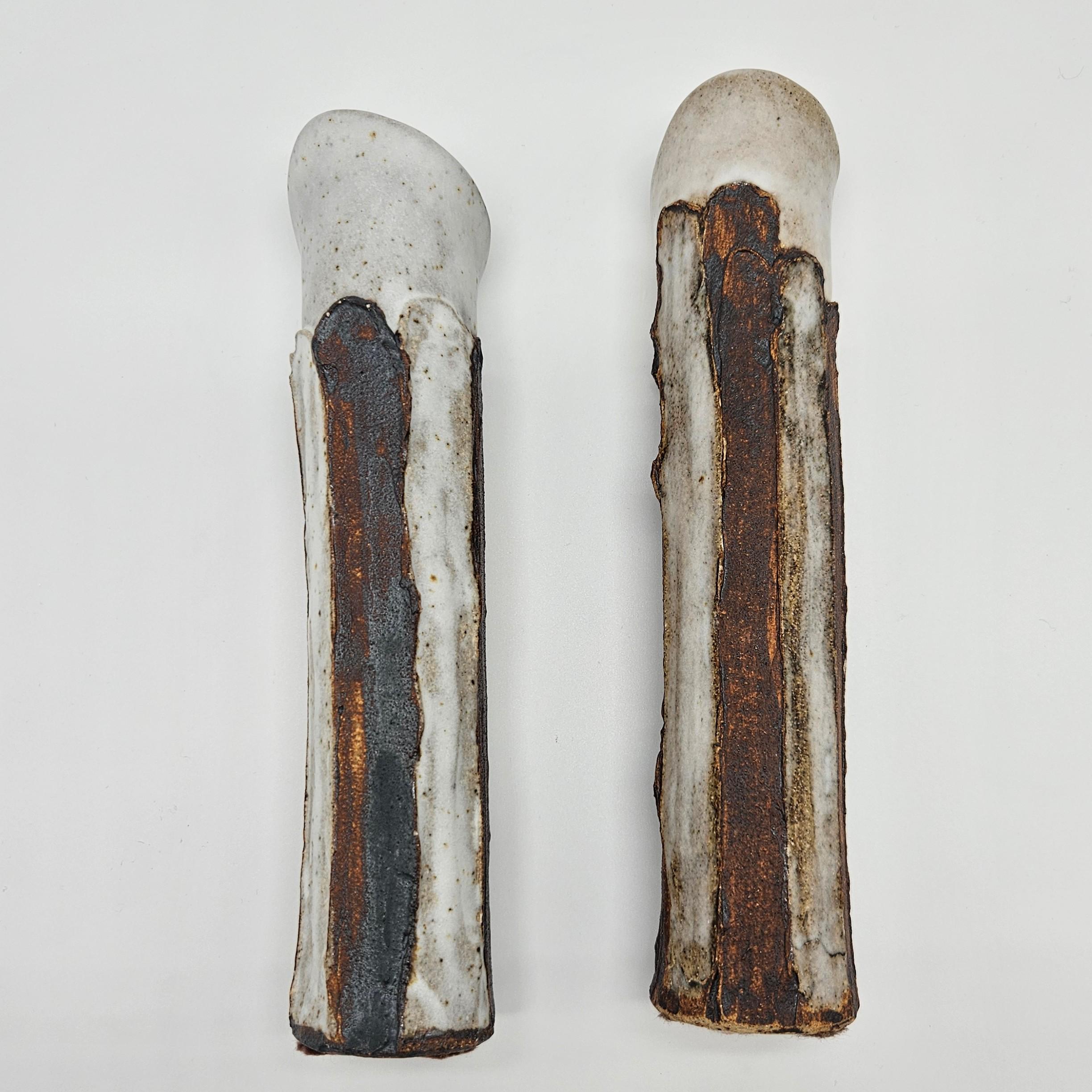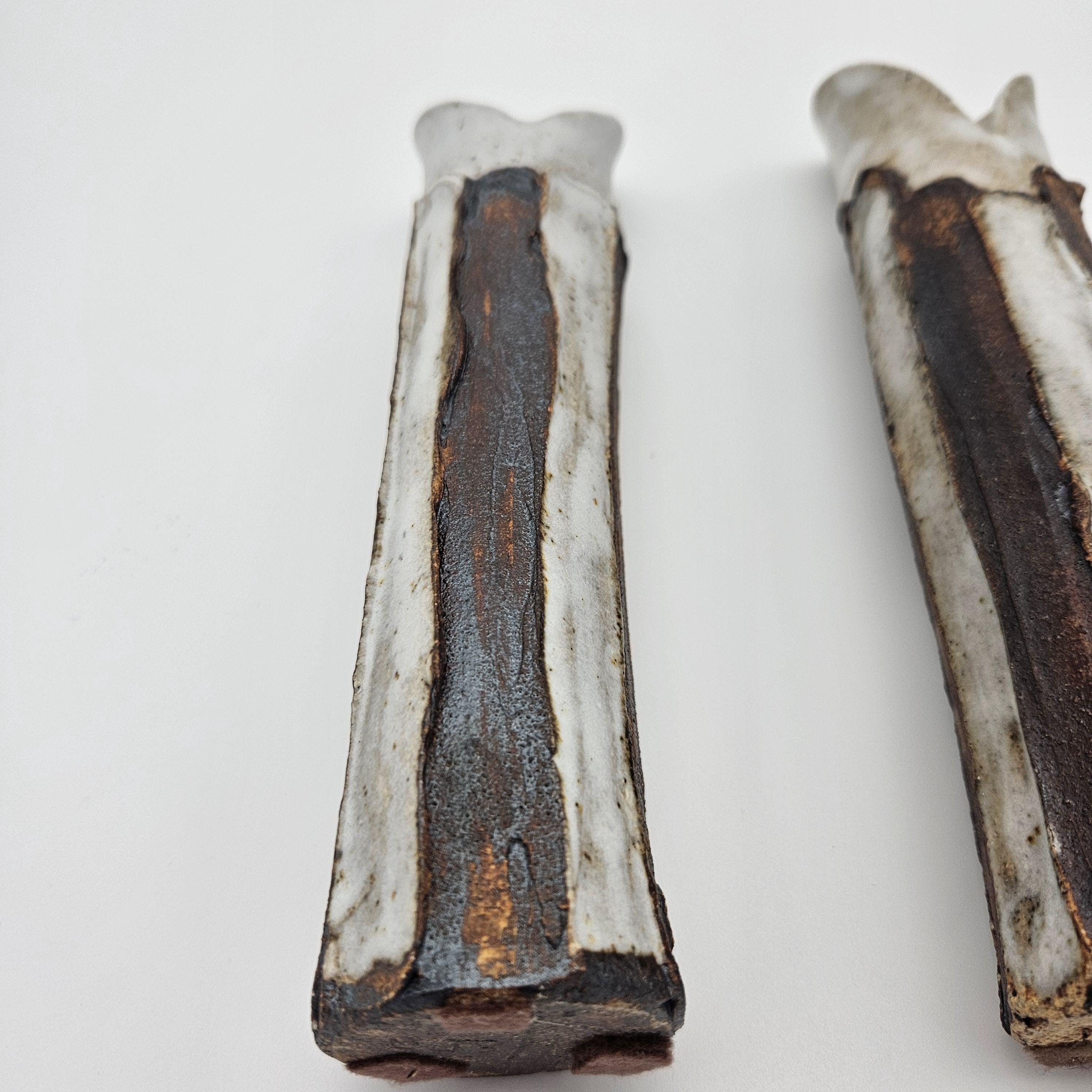 This striking pair of handbuilt studio pottery vases features sculptural, vertical forms with folded rims and dramatic surface texture. Made from iron rich stoneware and signed and dated 2007, these vessels showcase a beautiful contrast between soft matte glaze and darker exposed clay areas with a subtle metallic sheen from high fire reduction.