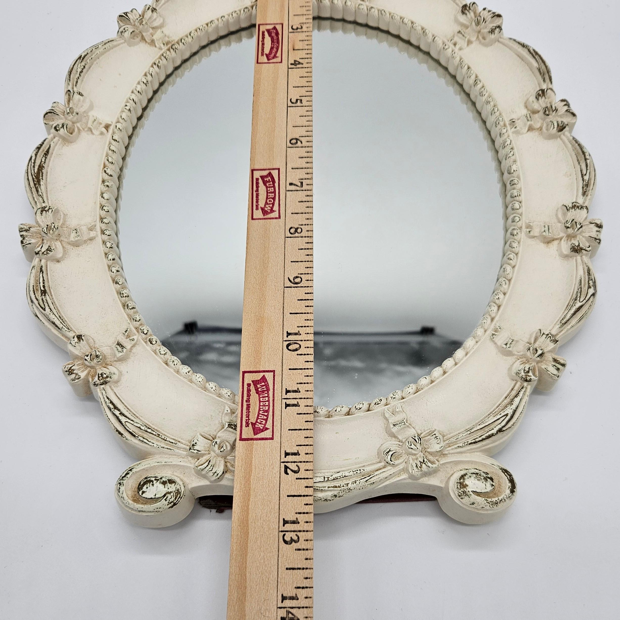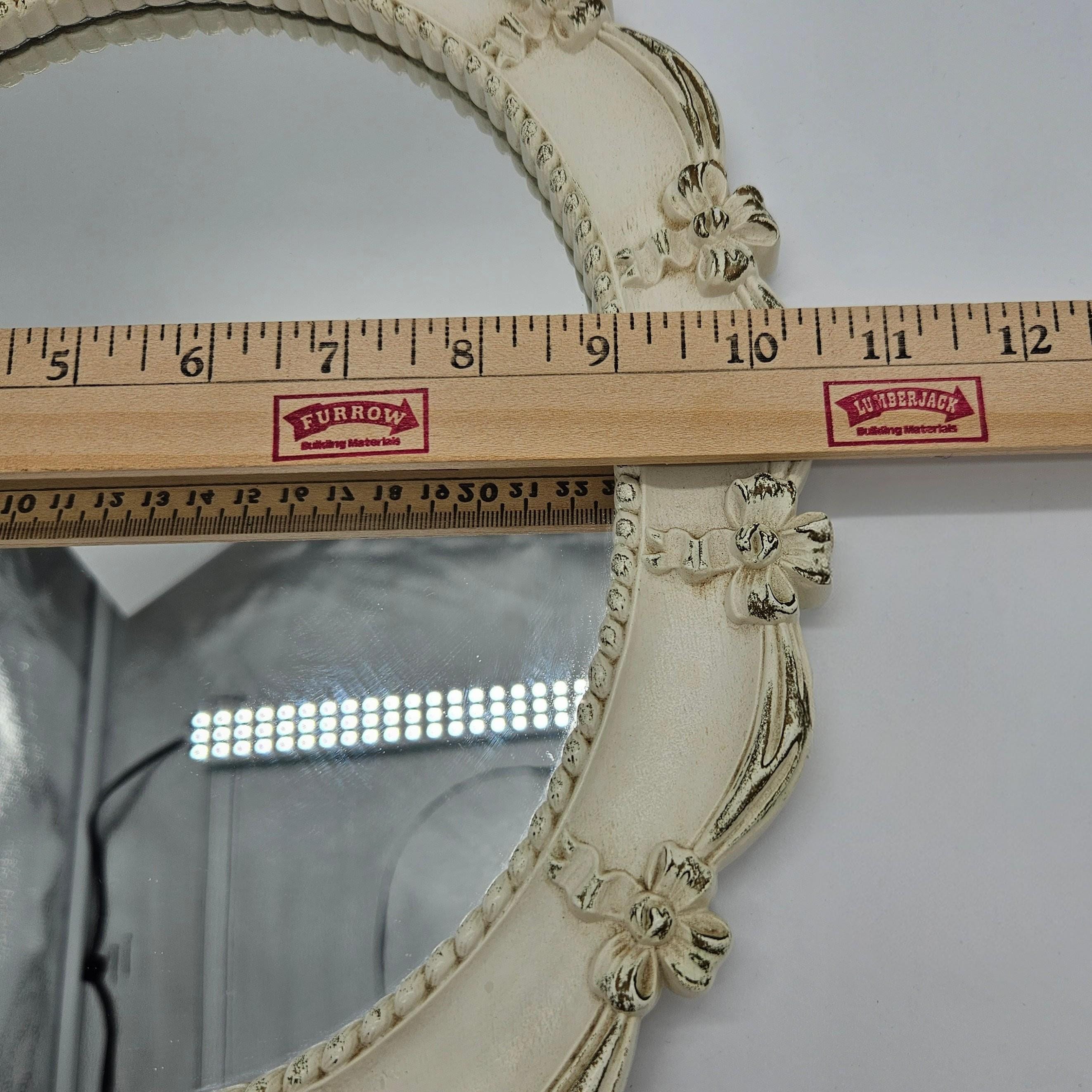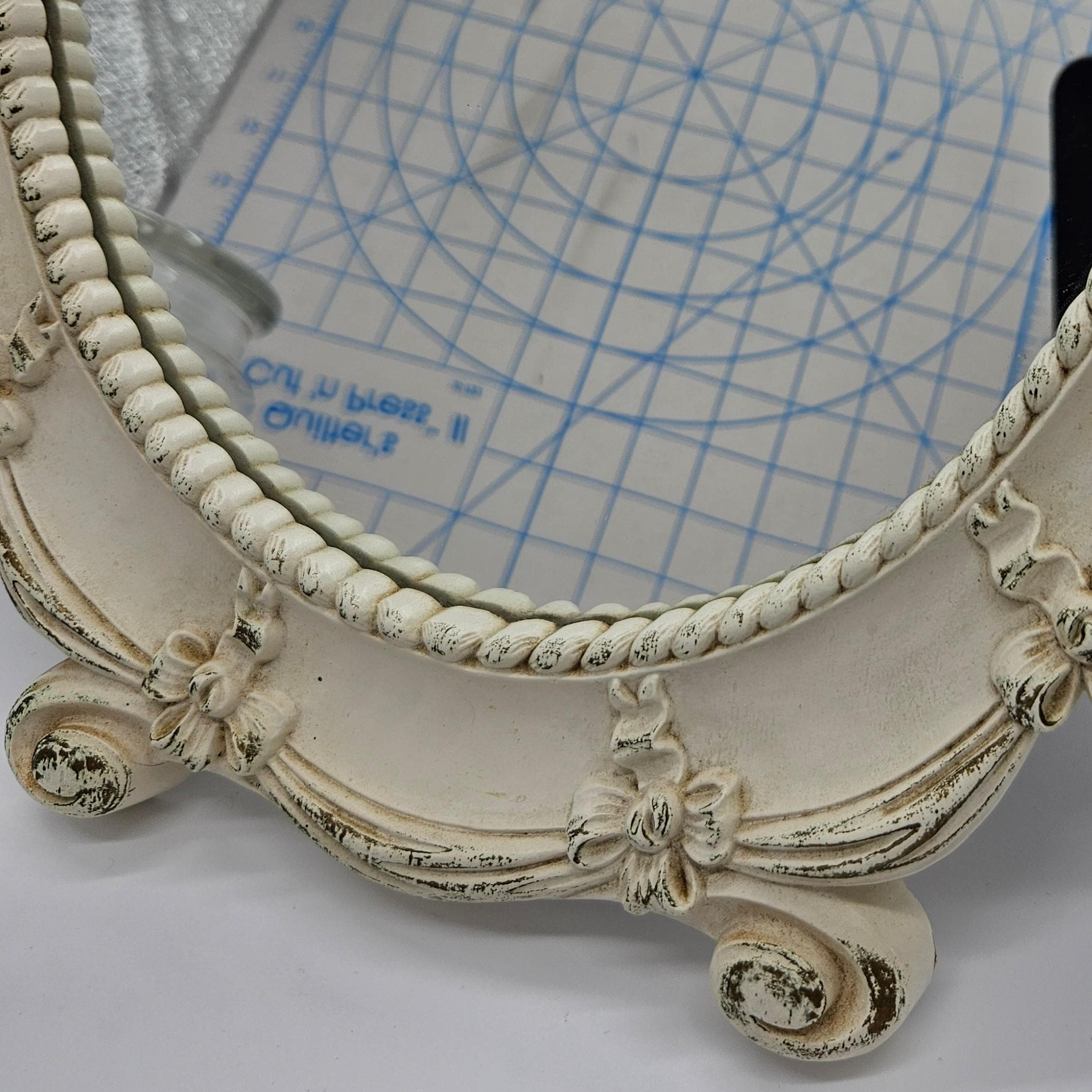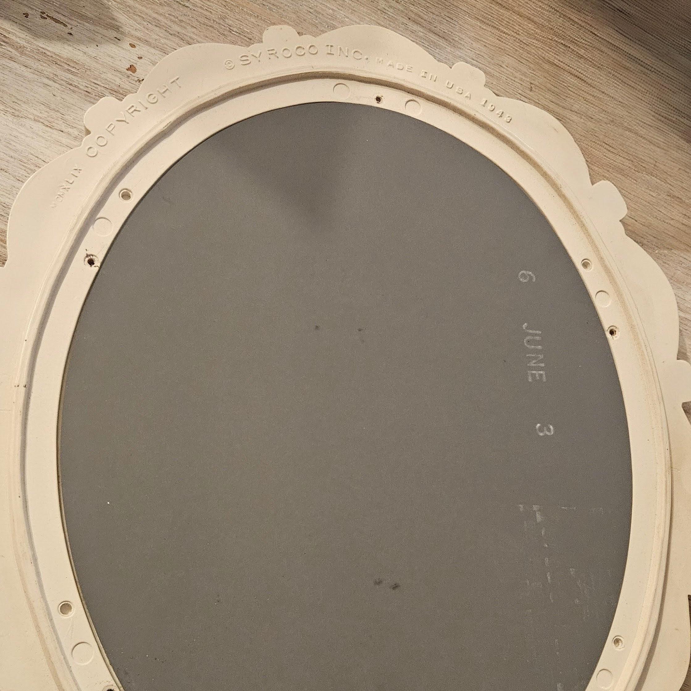Gorgeous vintage Syroco mirror dated 1943. Creamy frame with gold detailing and a clean, bright reflection. This old oval mirror has a classic, romantic look. The mirror glass is in excellent vintage condition with a clean reflection, and the frame is also in excellent vintage condition with only light, age-appropriate wear.
