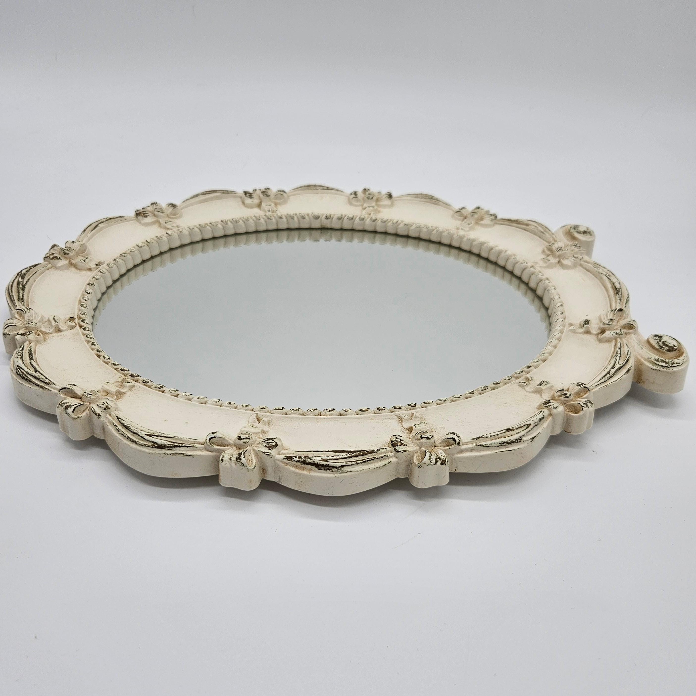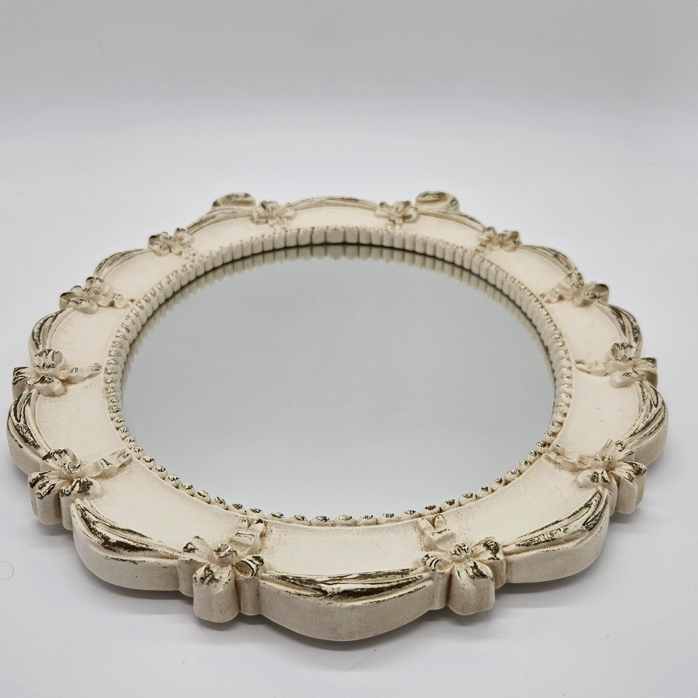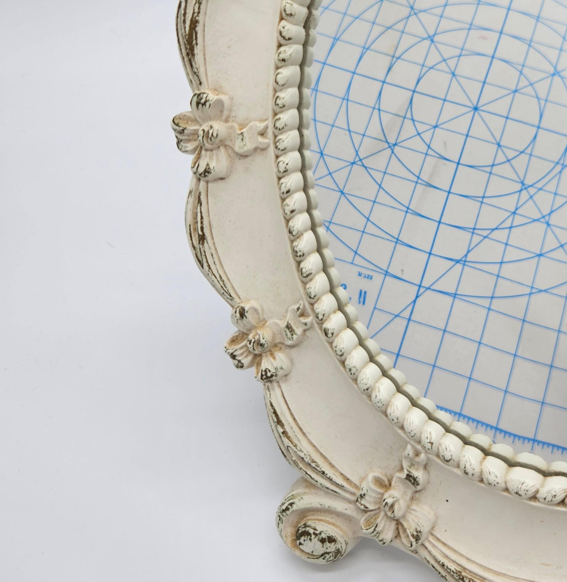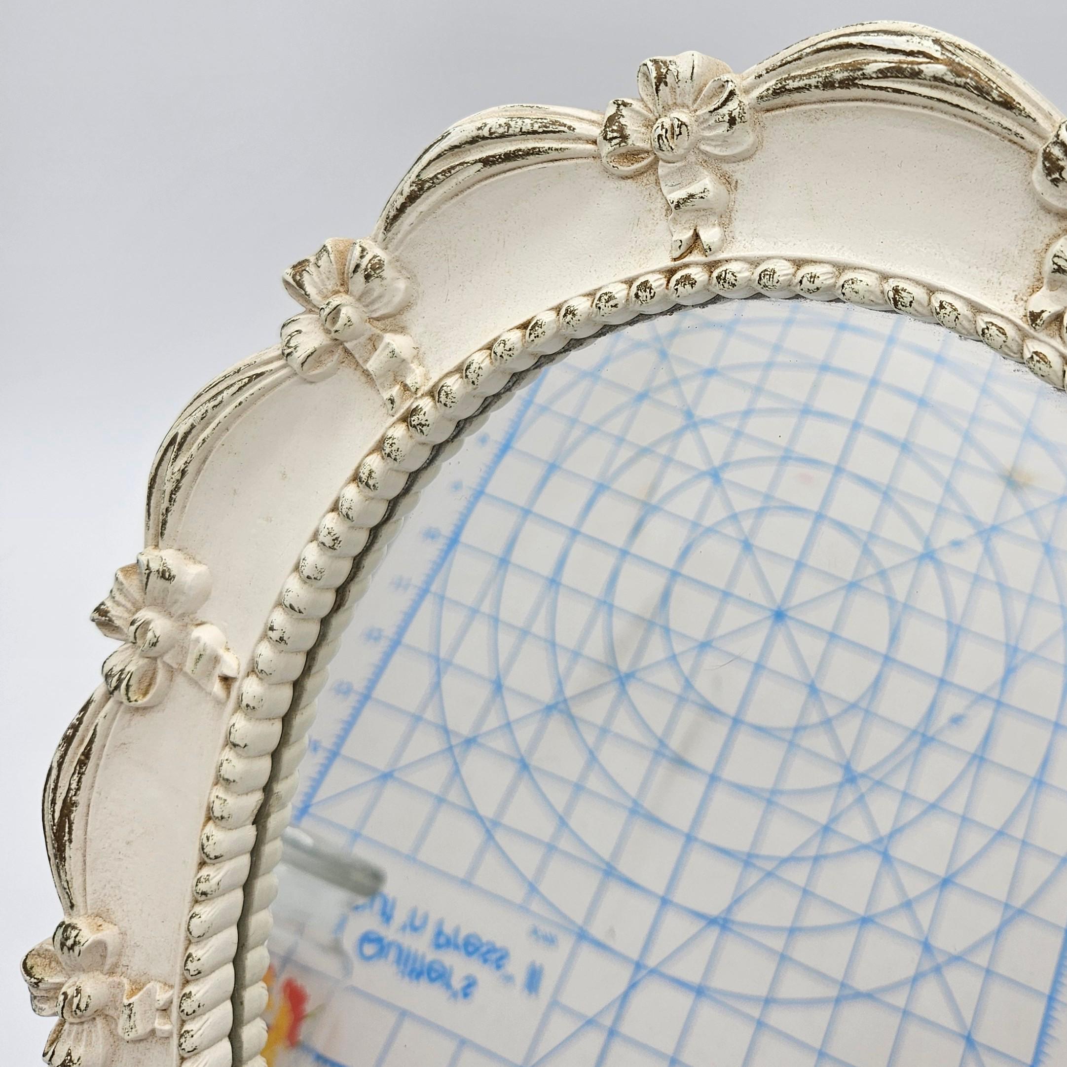 Gorgeous vintage Syroco mirror dated 1943. Creamy frame with gold detailing and a clean, bright reflection. This old oval mirror has a classic, romantic look. The mirror glass is in excellent vintage condition with a clean reflection, and the frame is also in excellent vintage condition with only light, age-appropriate wear.