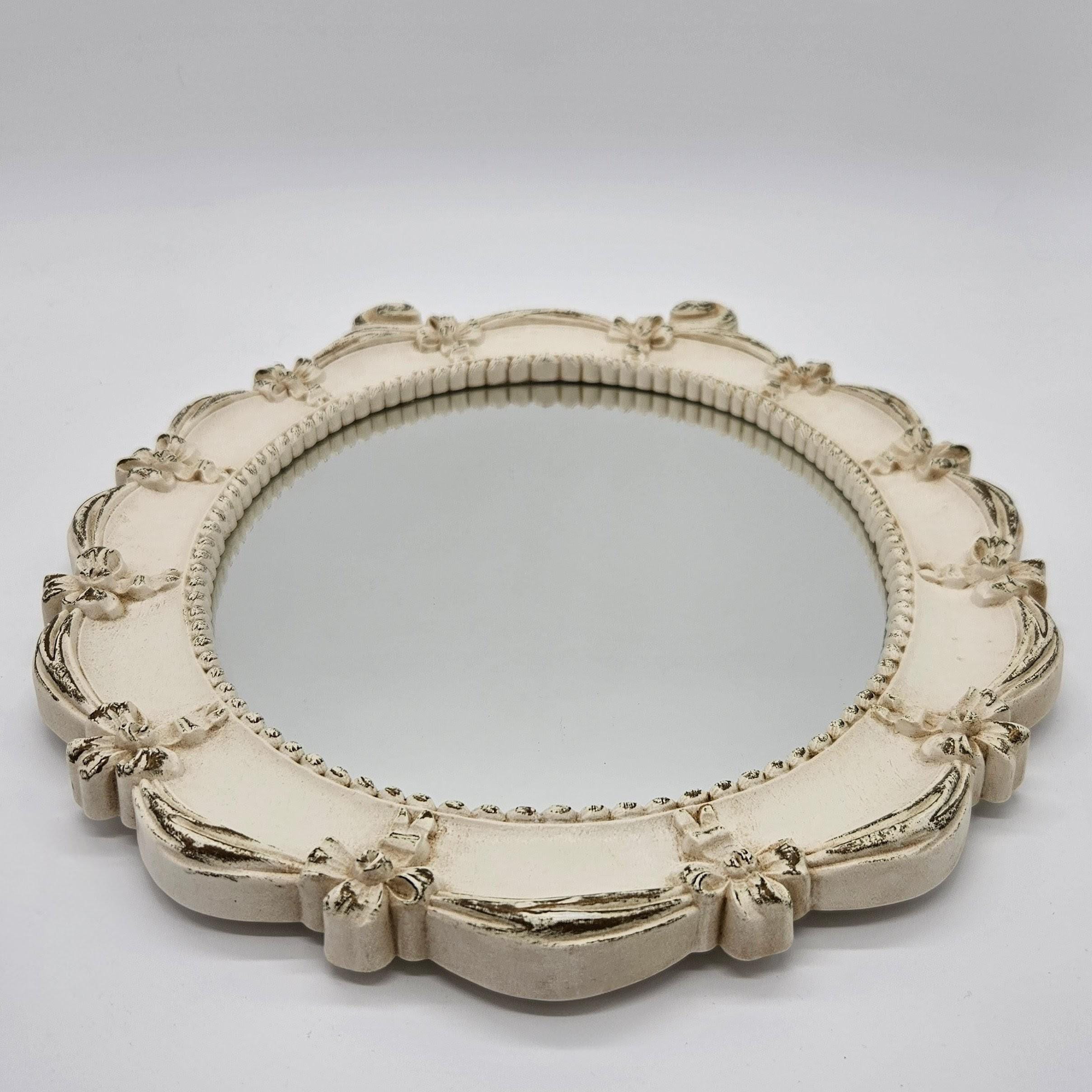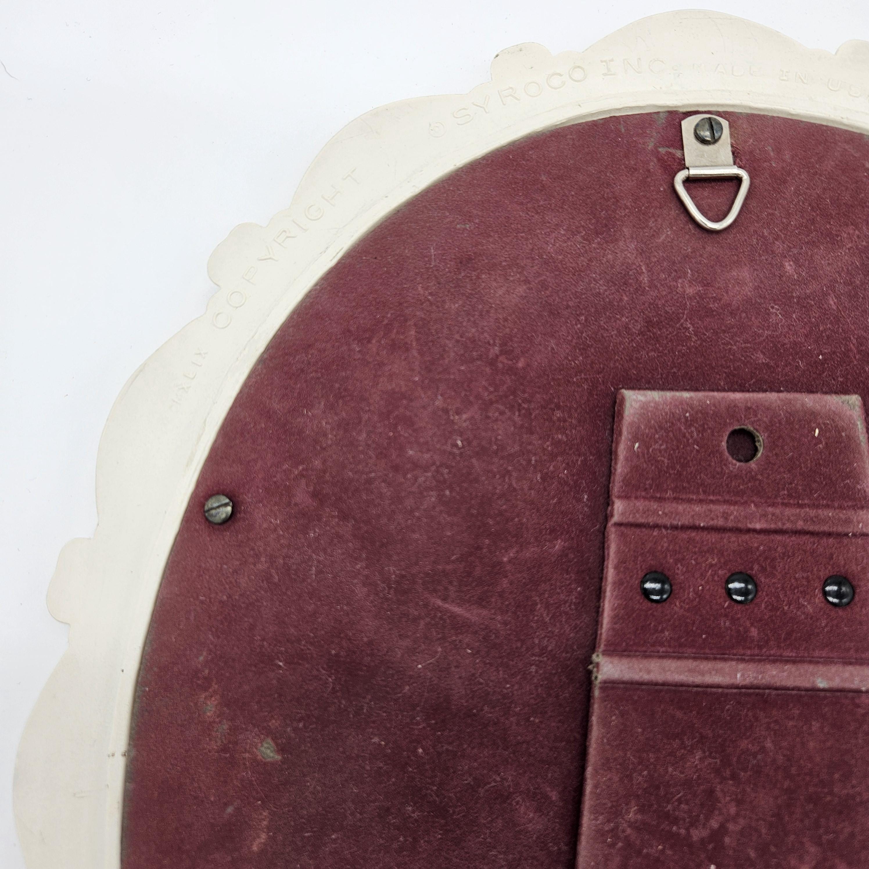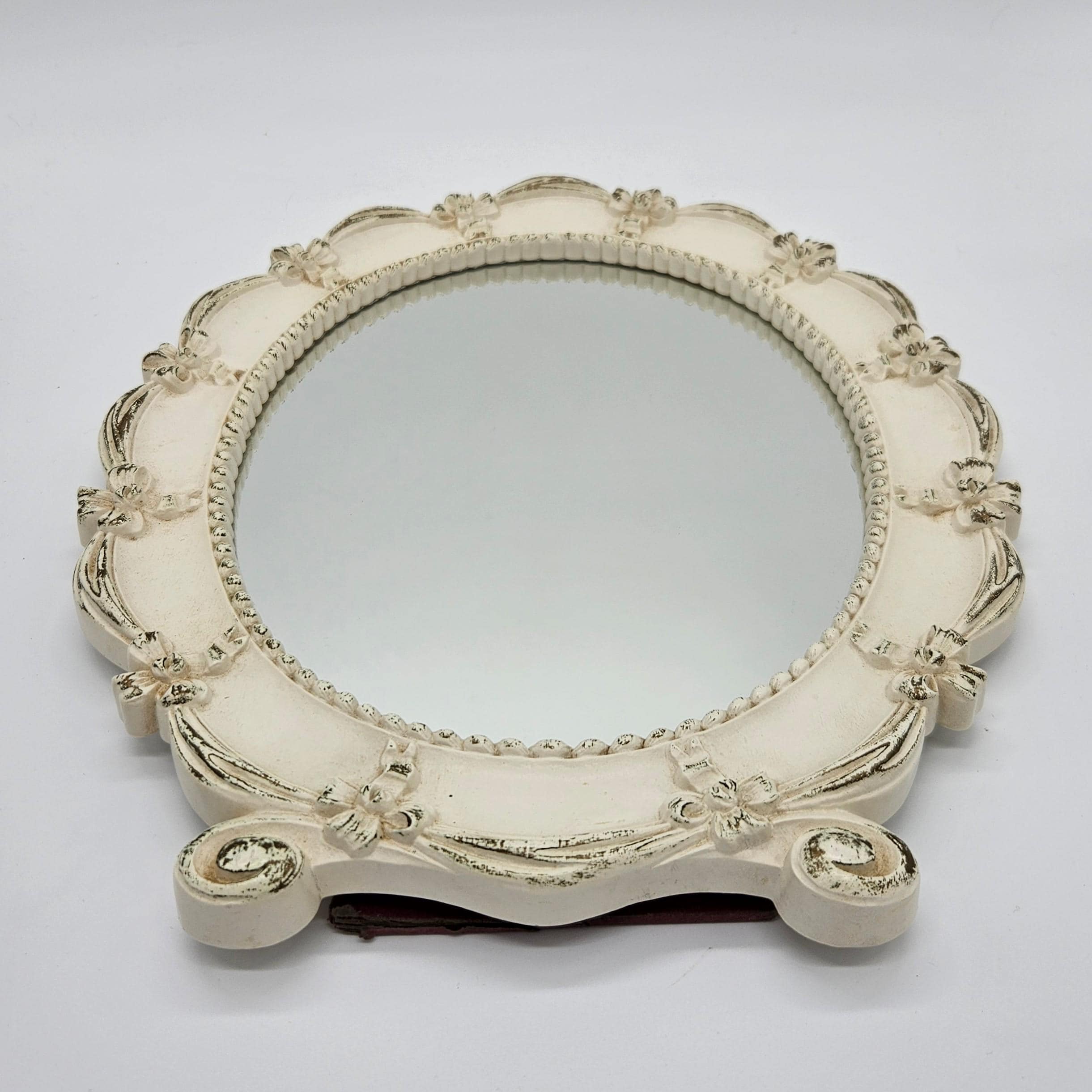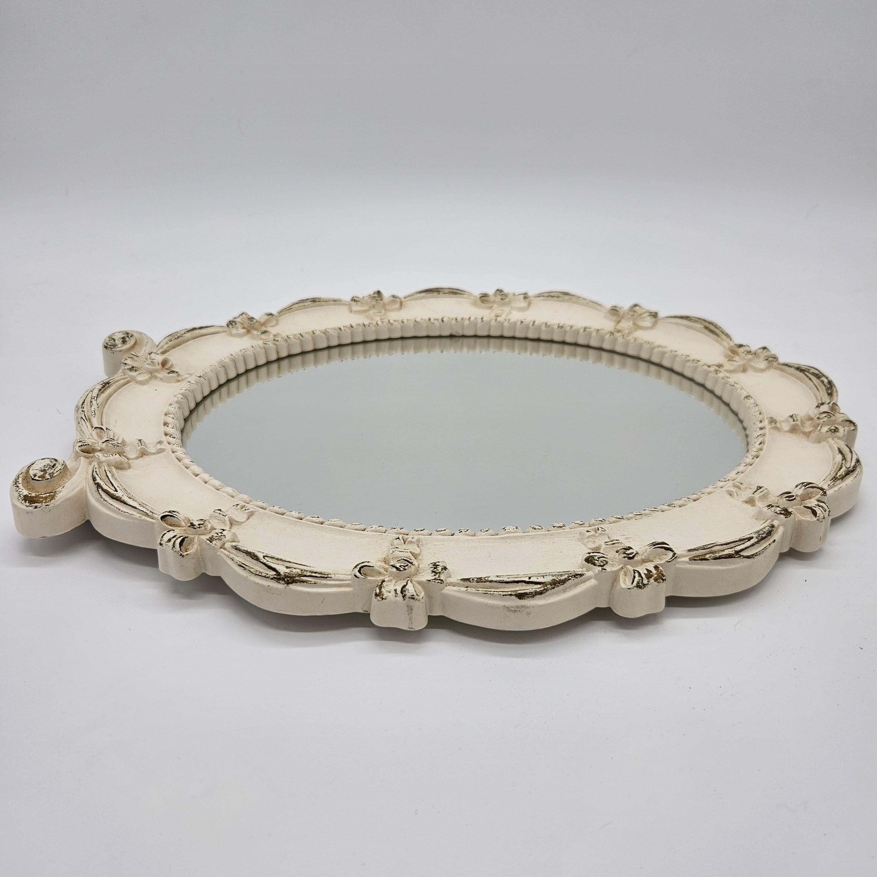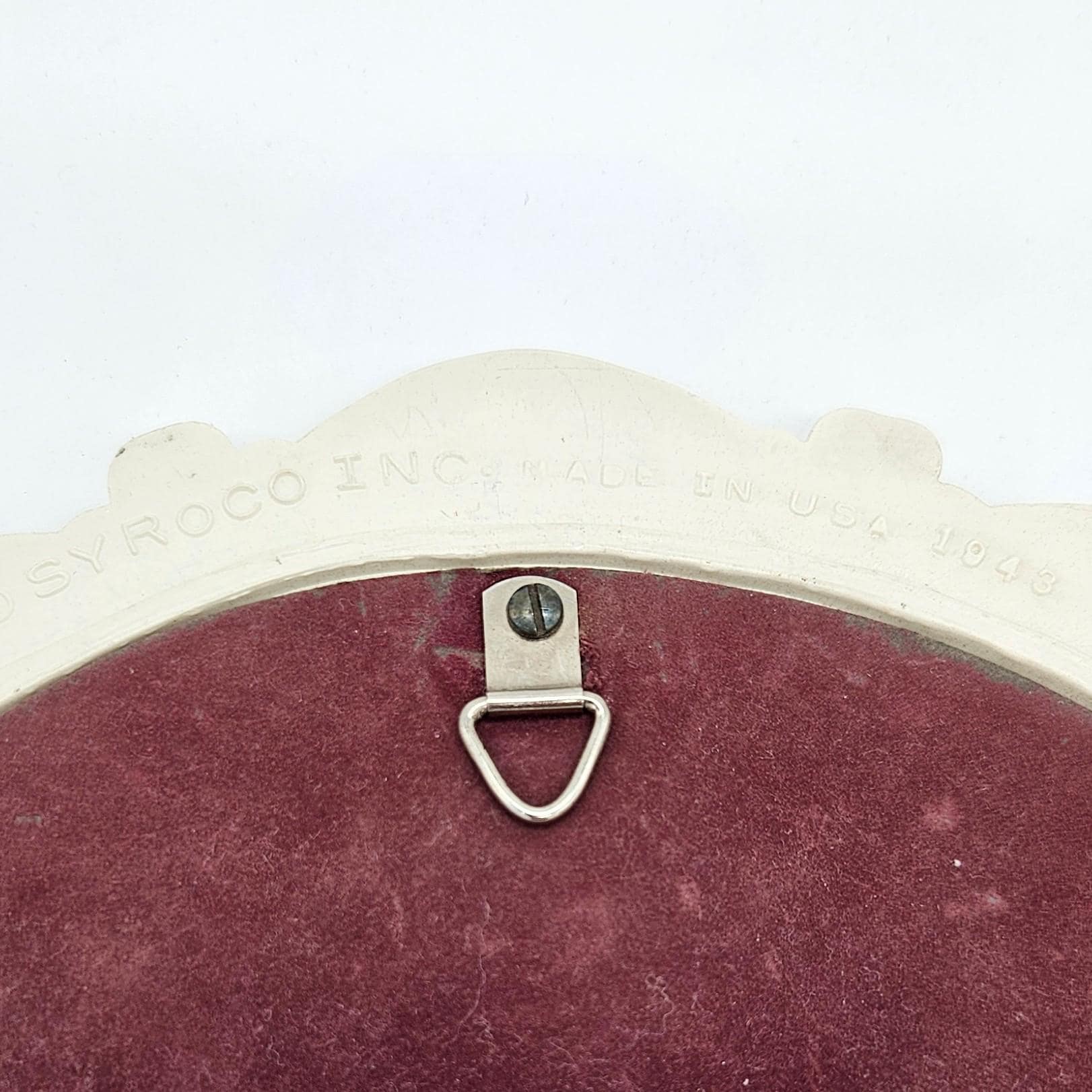Gorgeous vintage Syroco mirror dated 1943. Creamy frame with gold detailing and a clean, bright reflection. This old oval mirror has a classic, romantic look. The mirror glass is in excellent vintage condition with a clean reflection, and the frame is also in excellent vintage condition with only light, age-appropriate wear.