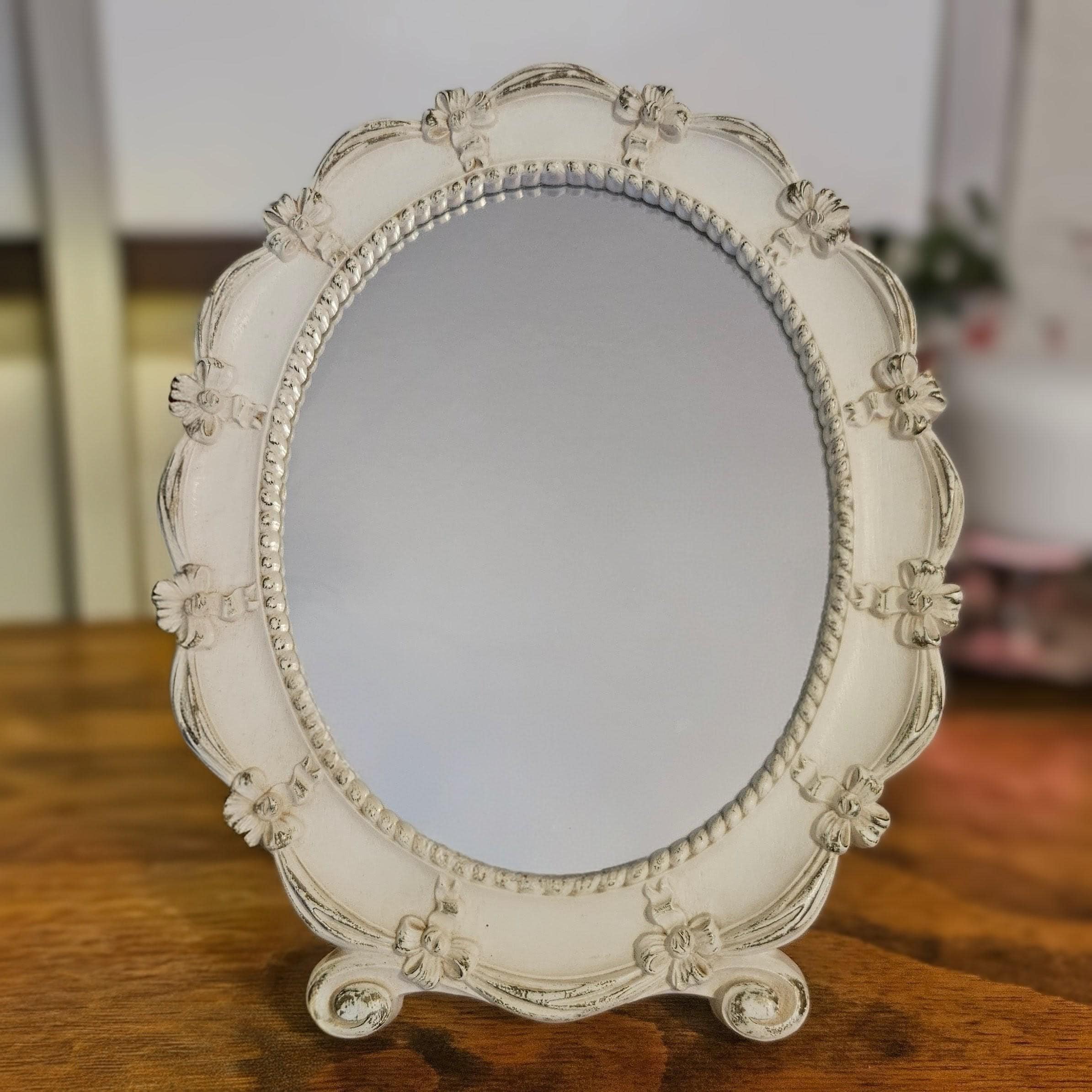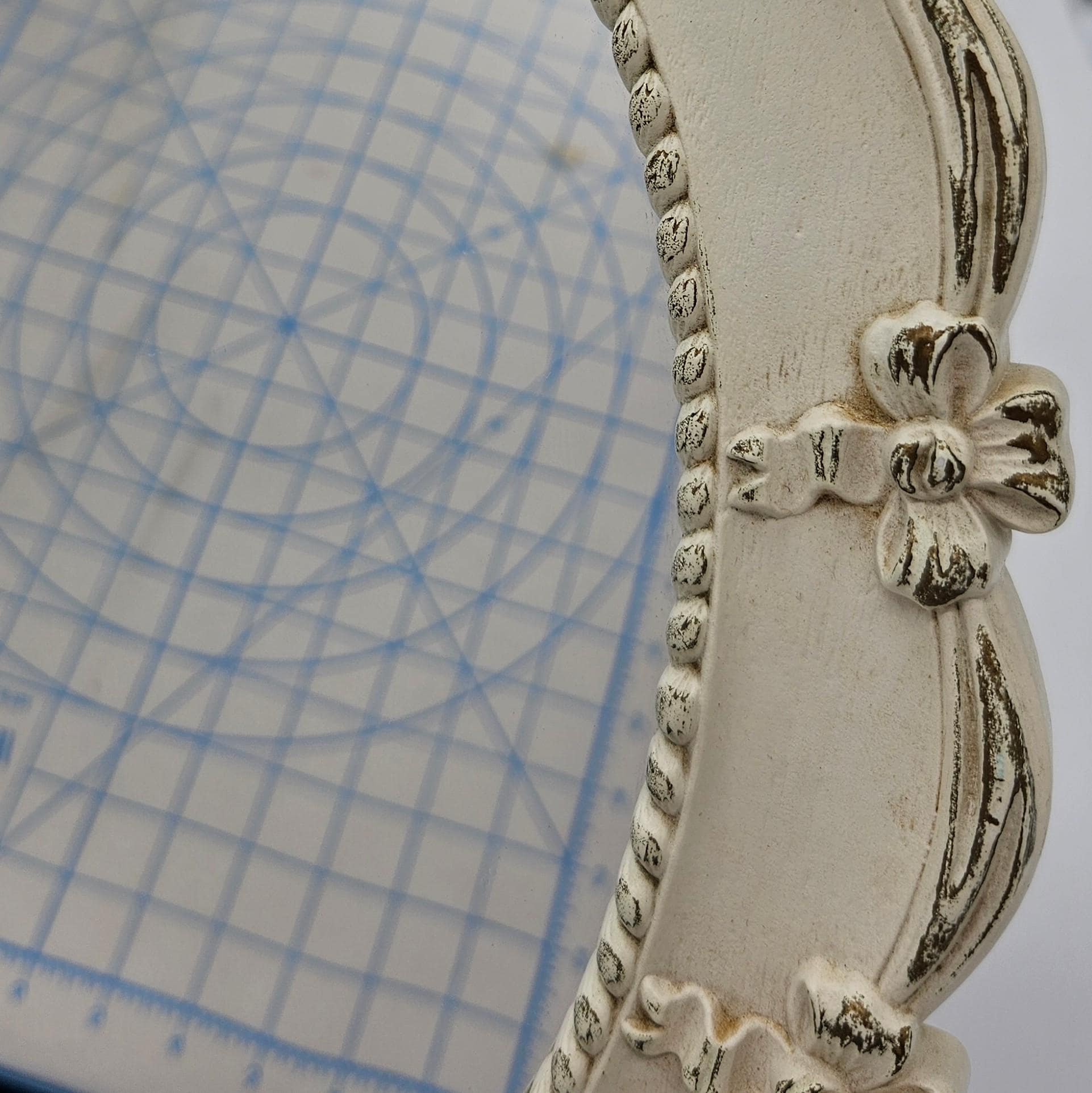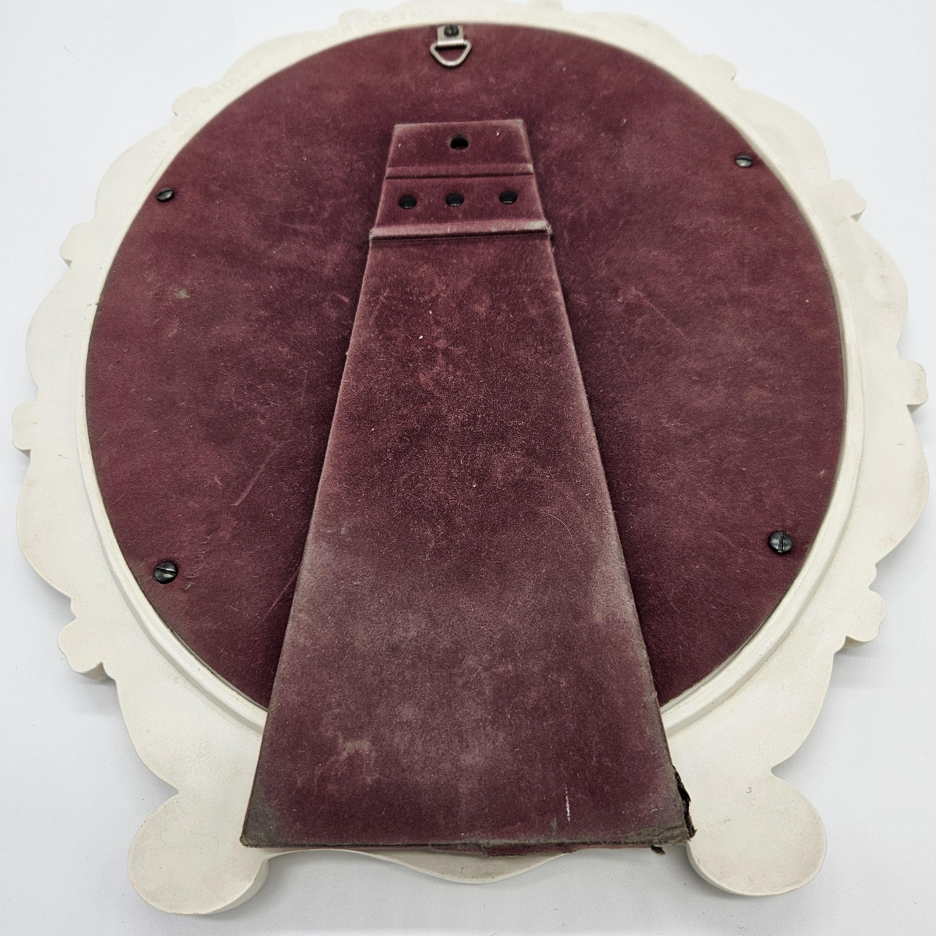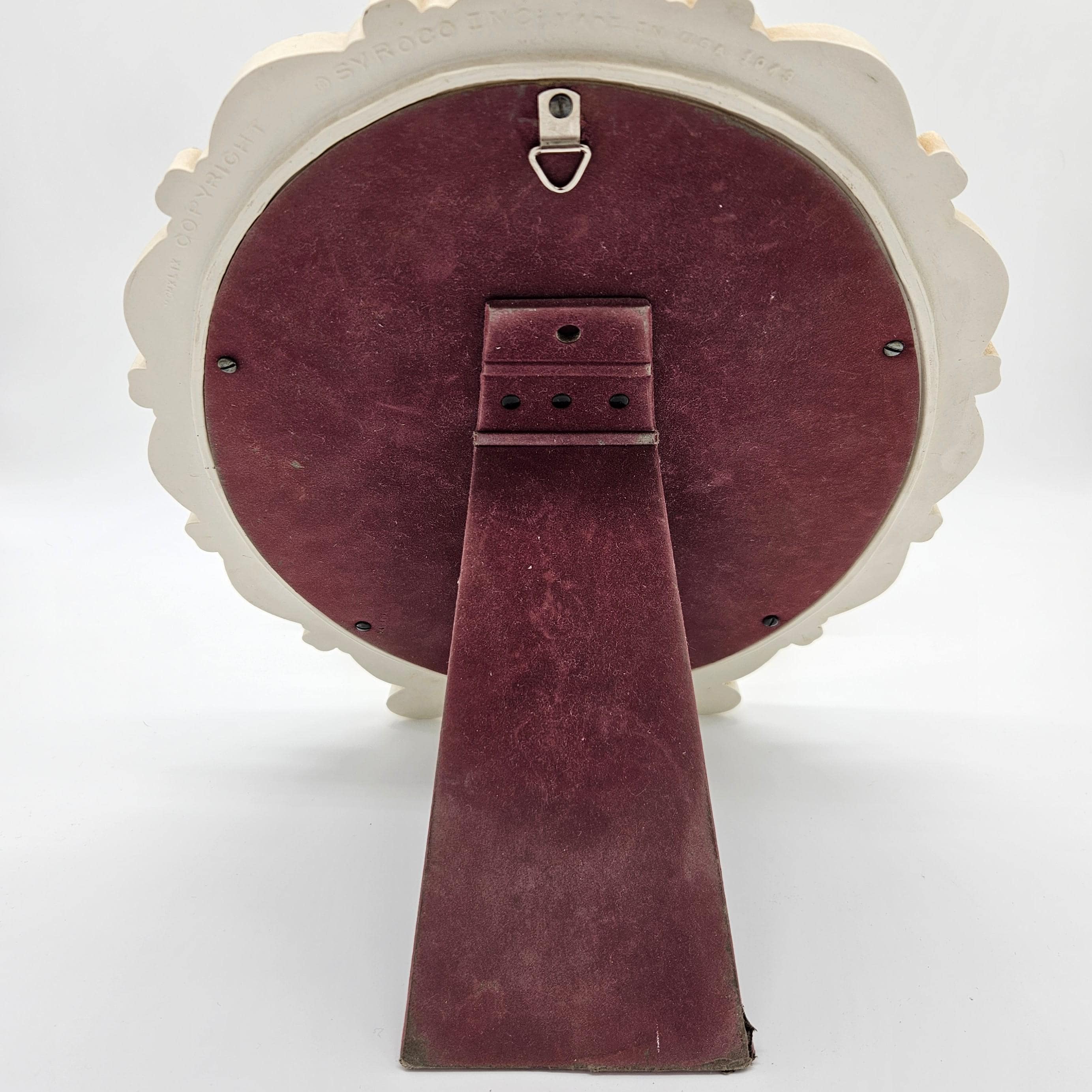 Gorgeous vintage Syroco mirror dated 1943. Creamy frame with gold detailing and a clean, bright reflection. This old oval mirror has a classic, romantic look. The mirror glass is in excellent vintage condition with a clean reflection, and the frame is also in excellent vintage condition with only light, age-appropriate wear.