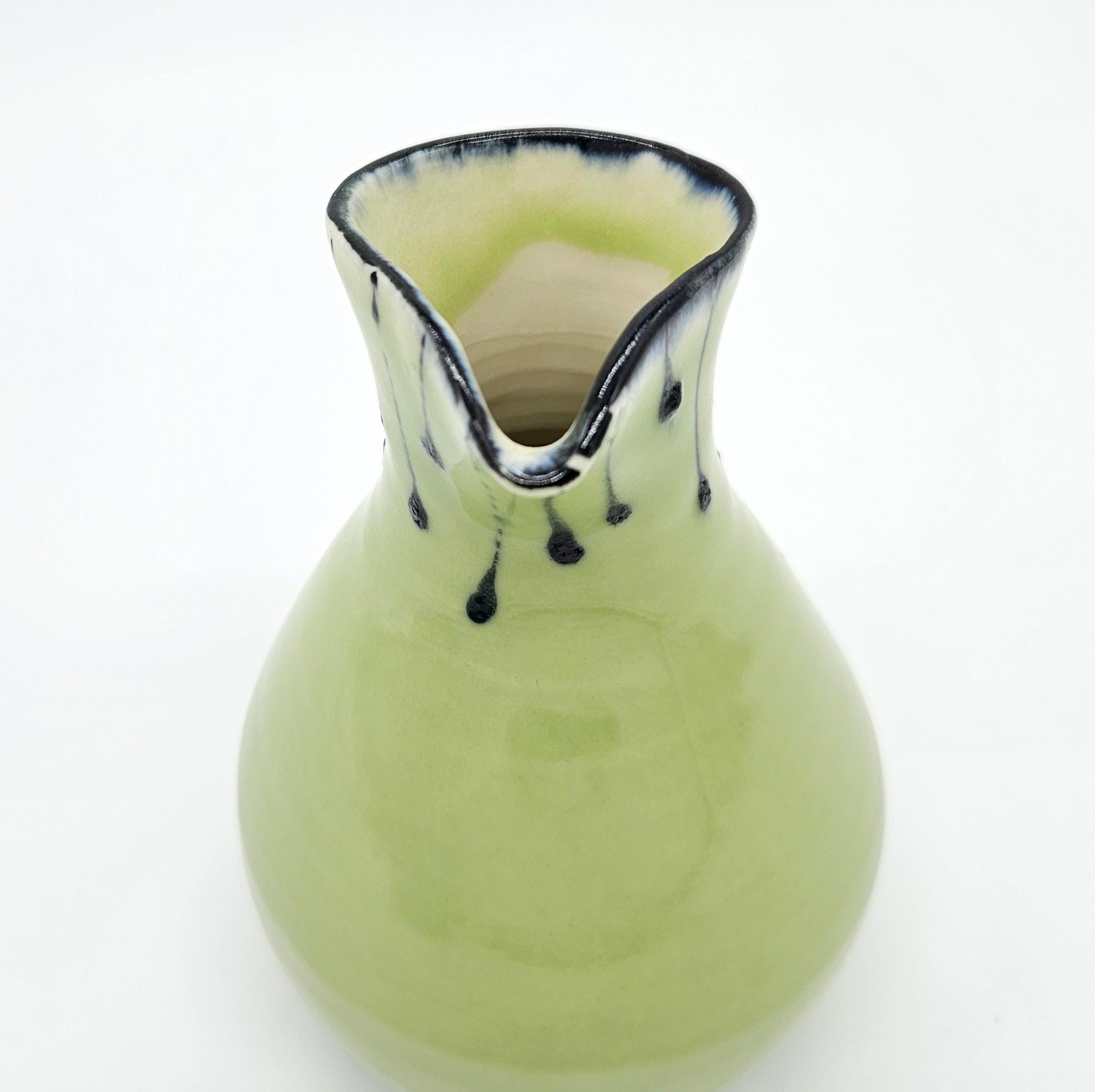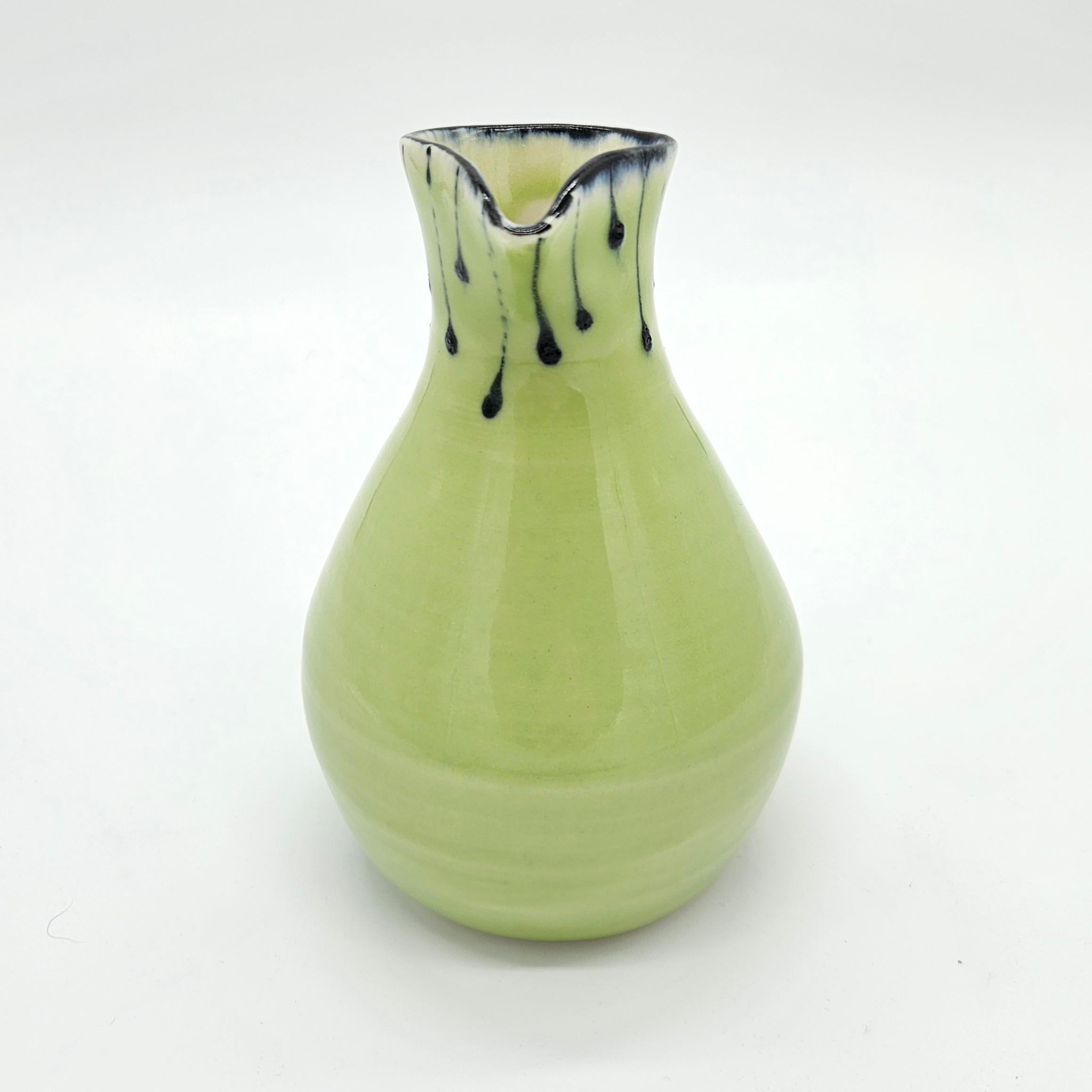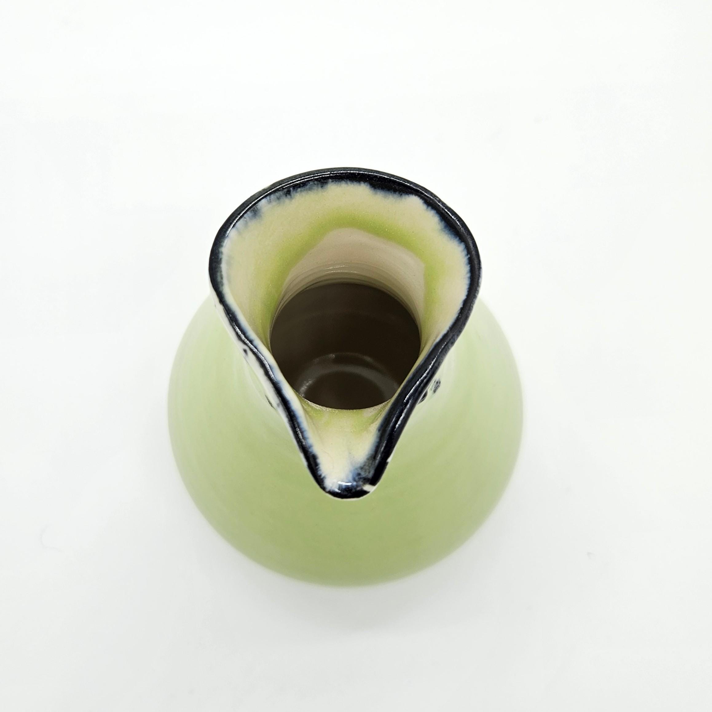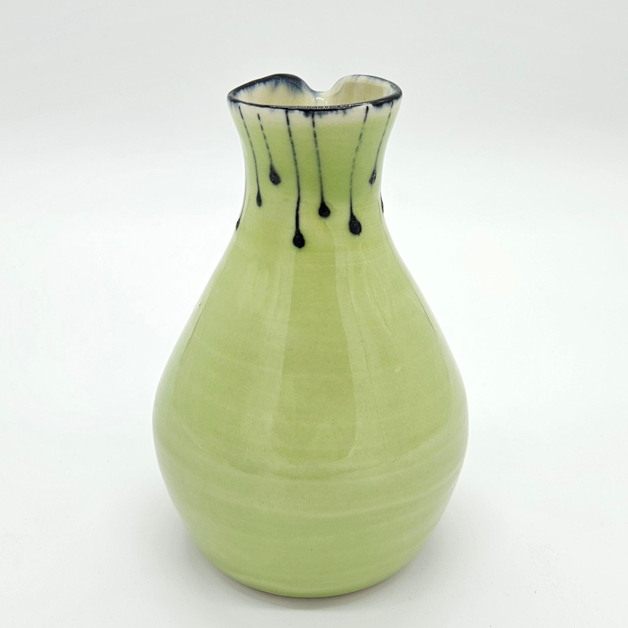 Beautiful handmade studio pottery vase attributed to Mary Covell, a Boulder County Colorado ceramic artist. This piece features a soft chartreuse green glaze with navy dark drip detailing around the ring. It’s the perfect size for a small bouquet, a few stems, or as a standalone art pottery accent on a shelf, desk, or side table.