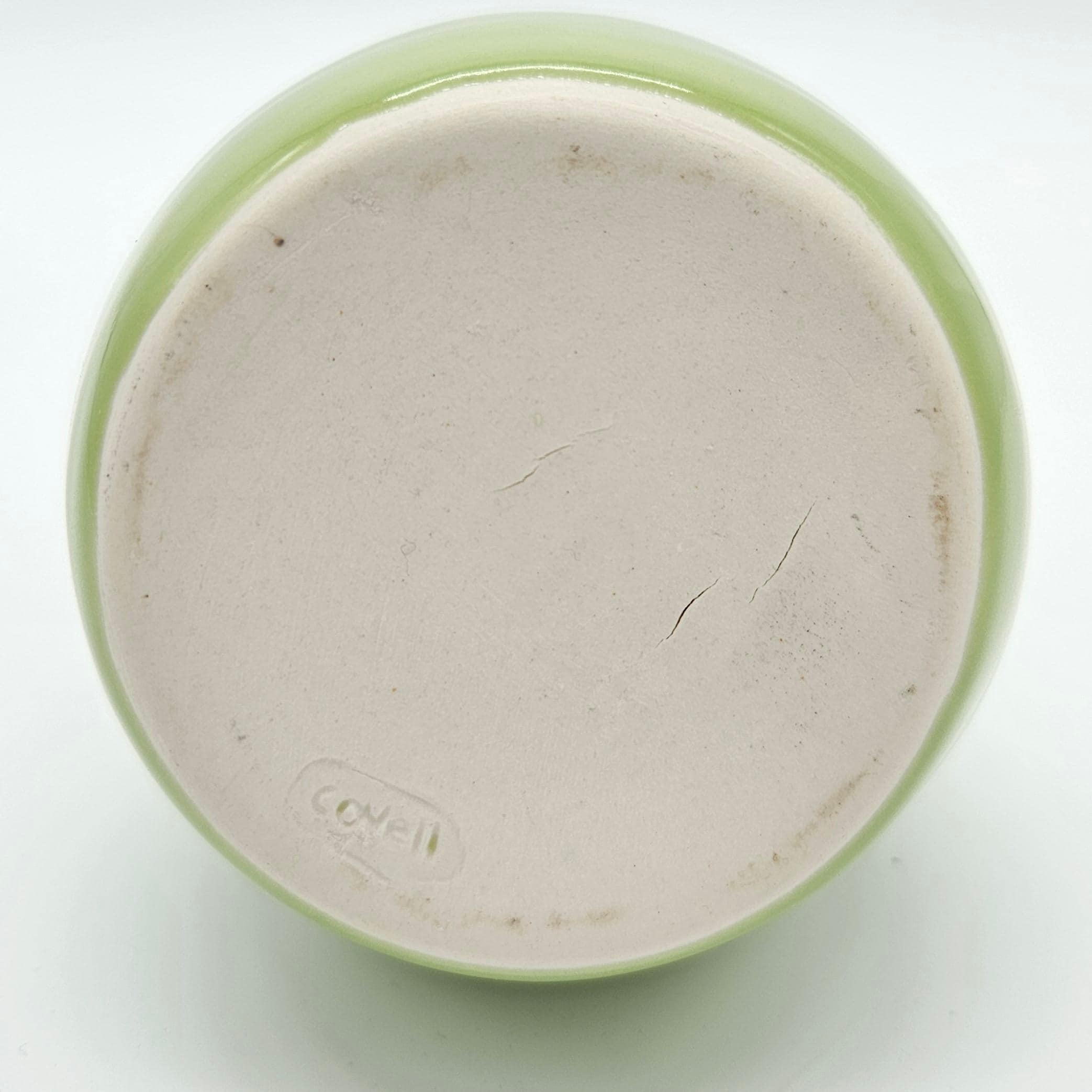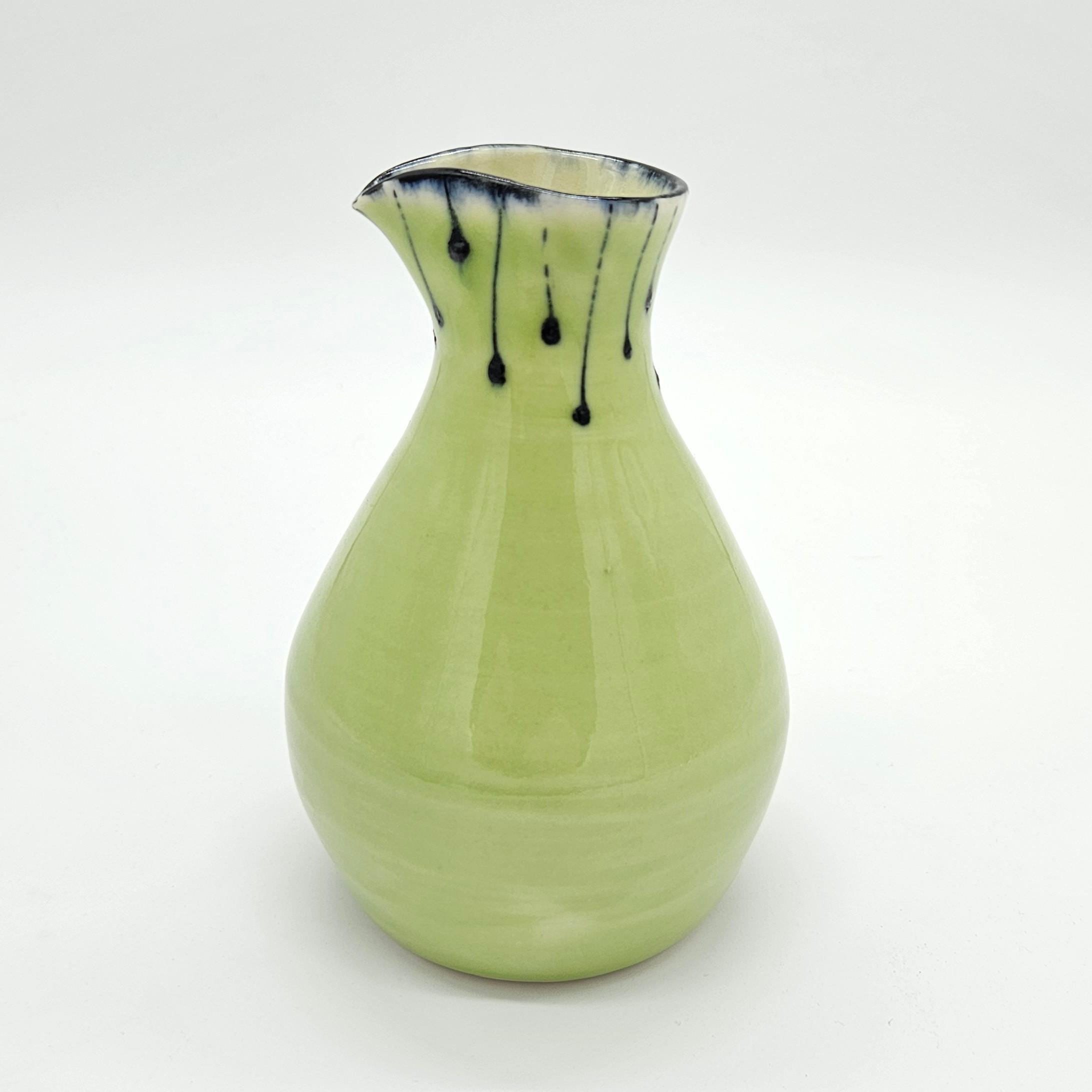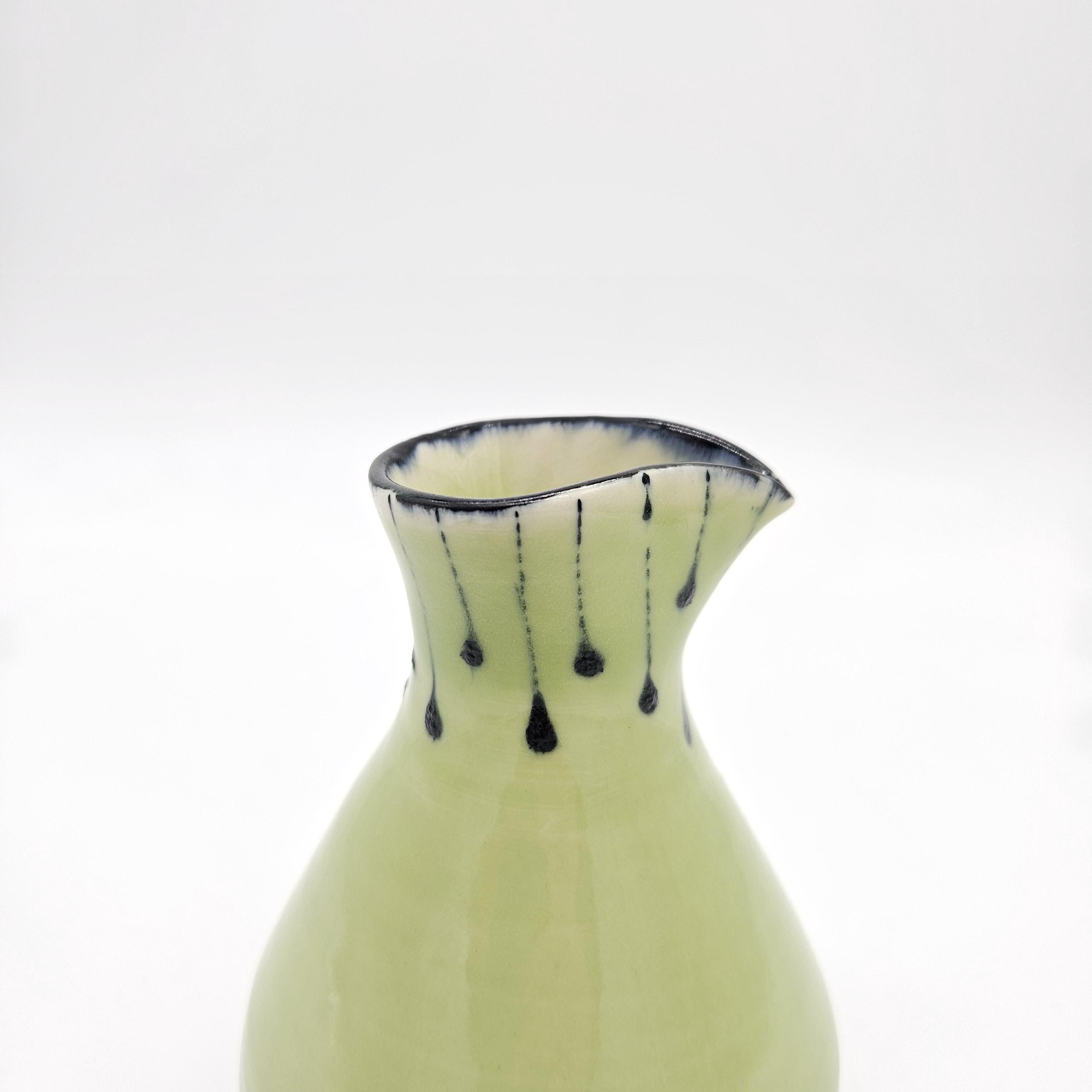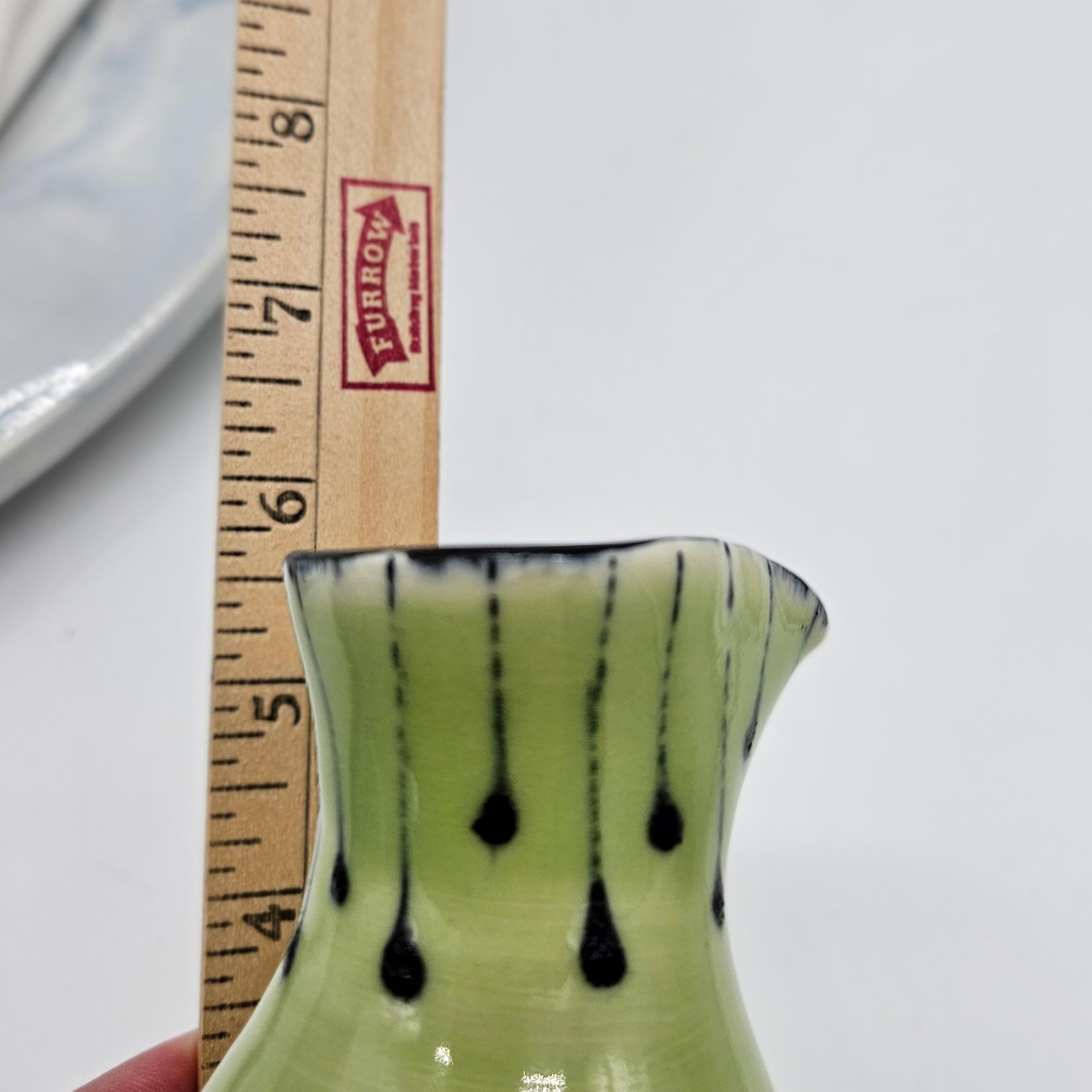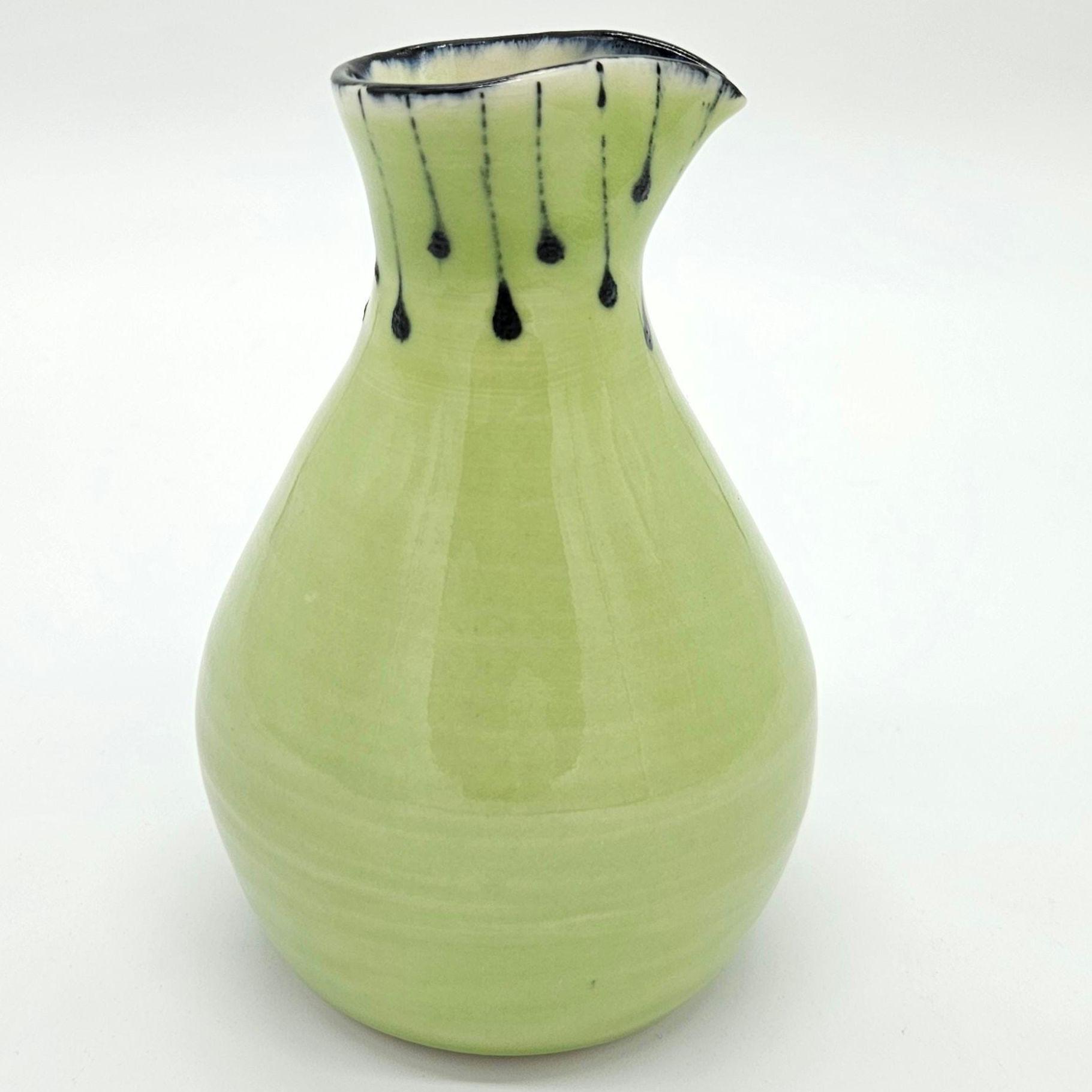 Beautiful handmade studio pottery vase attributed to Mary Covell, a Boulder County Colorado ceramic artist. This piece features a soft chartreuse green glaze with navy dark drip detailing around the ring. It’s the perfect size for a small bouquet, a few stems, or as a standalone art pottery accent on a shelf, desk, or side table.