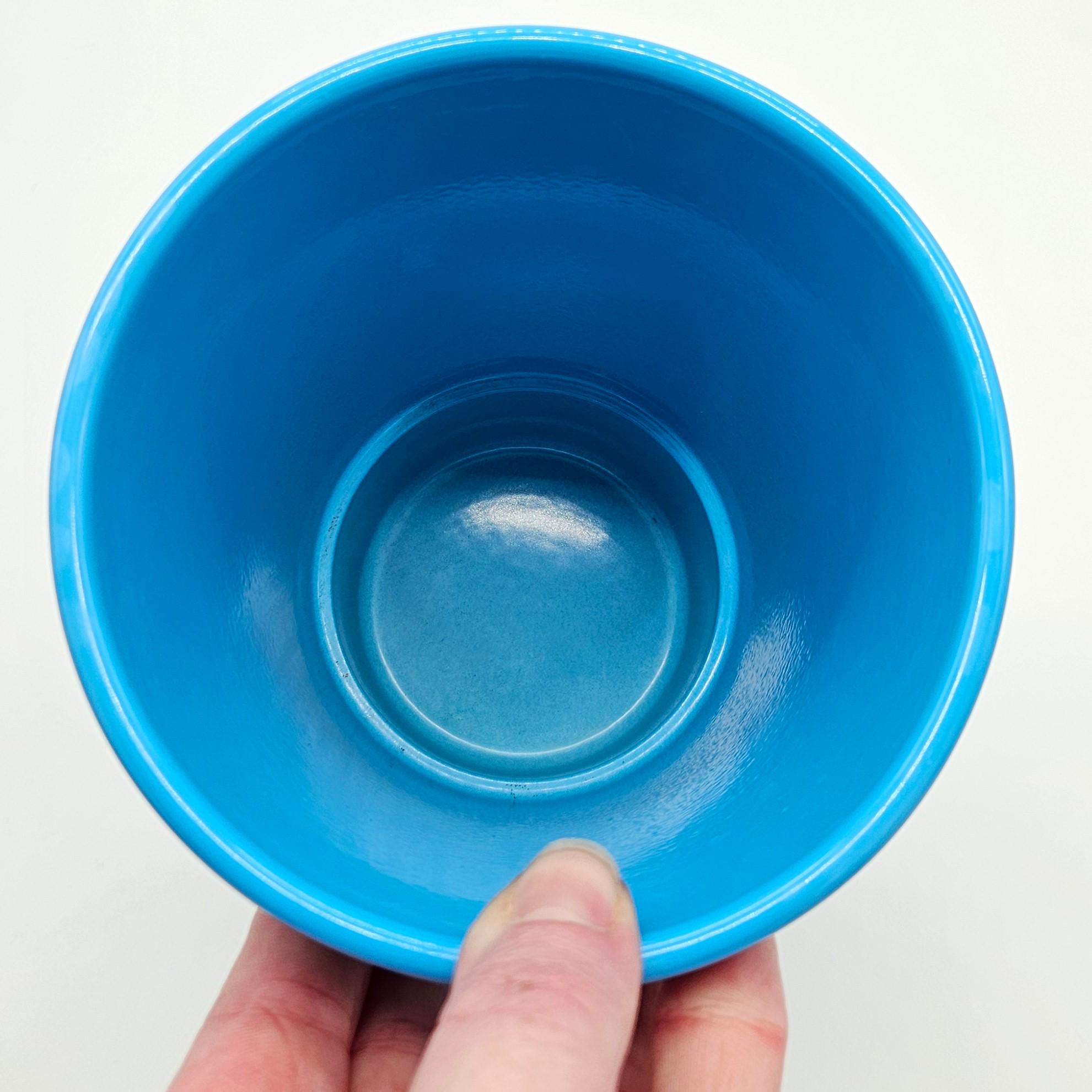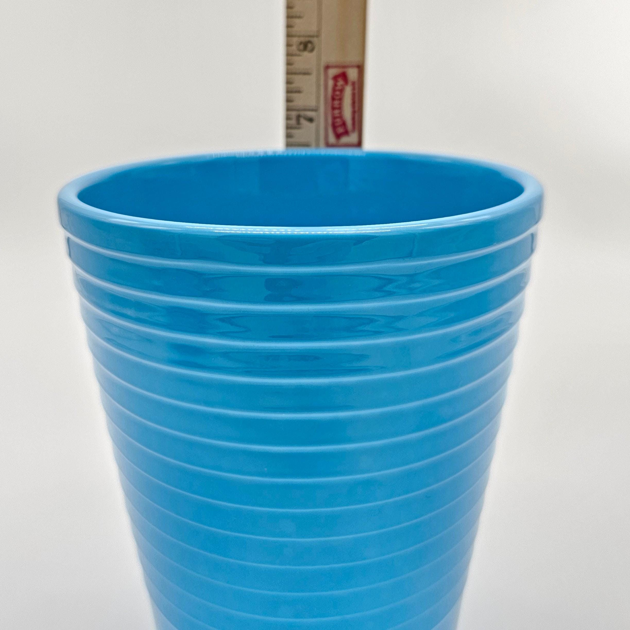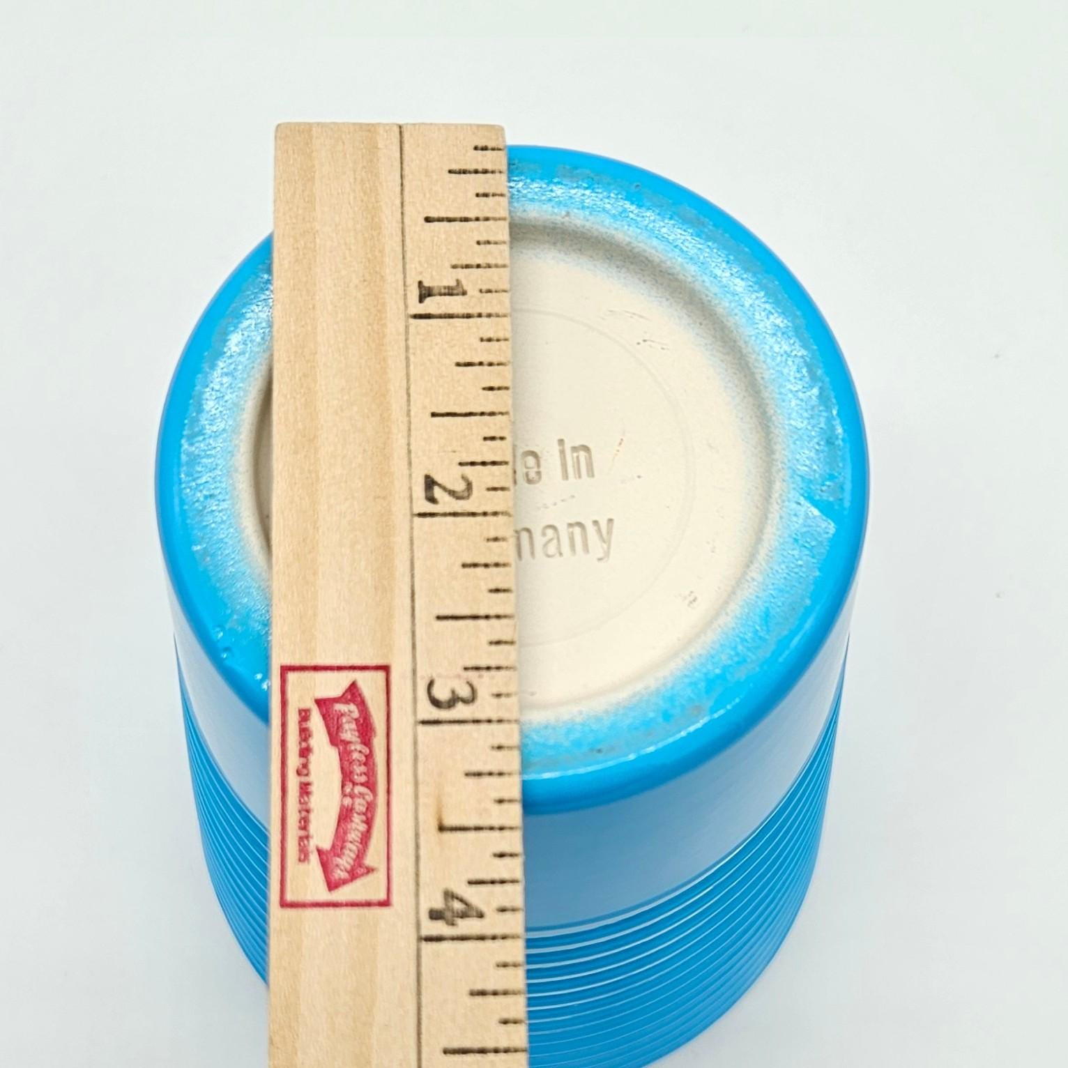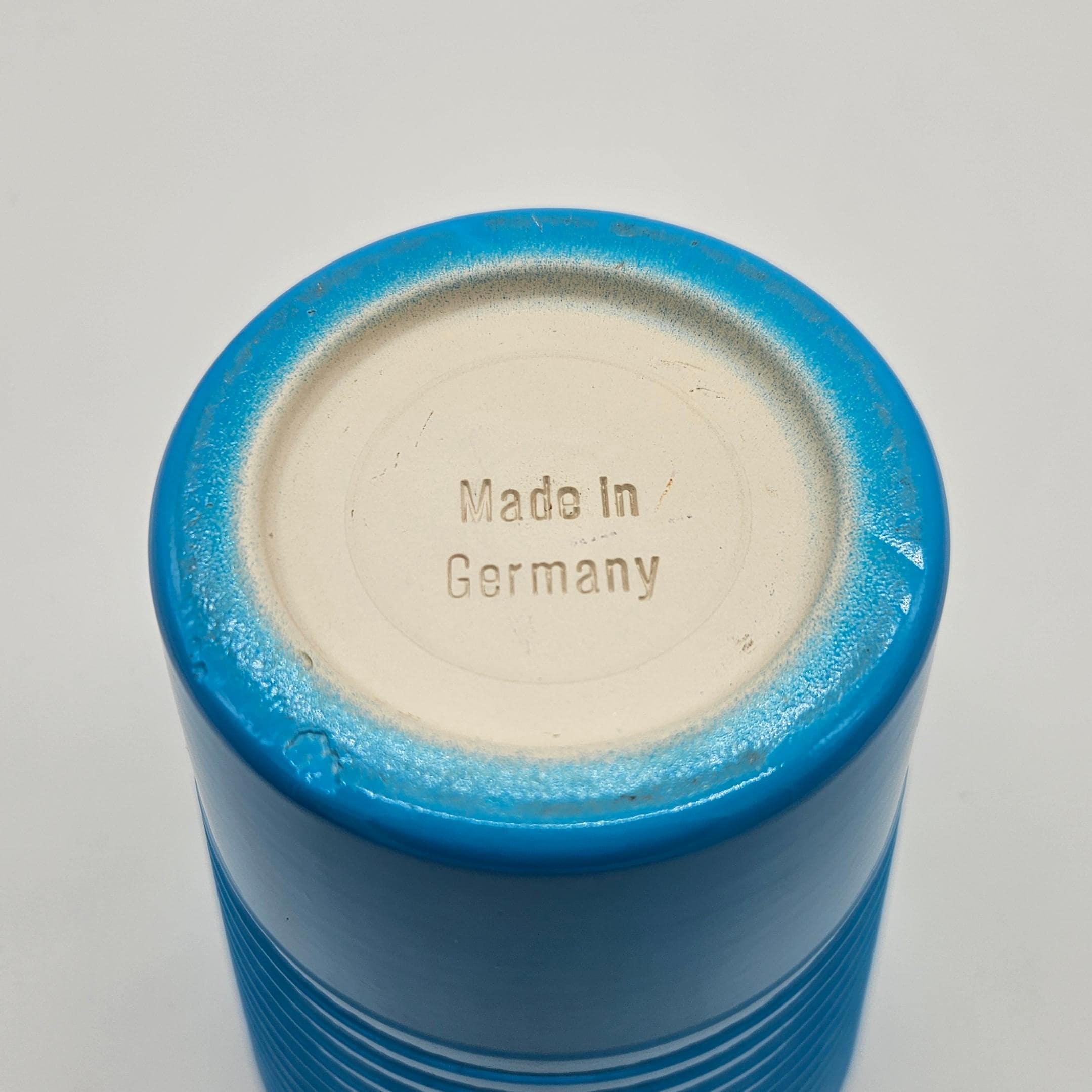 Beautiful vintage Made in Germany vase in a bright retro blue glaze. Clean modern shape with subtle horizontal banding, perfect for a mid-century modern shelf, entry table, or styled coffee table moment.
