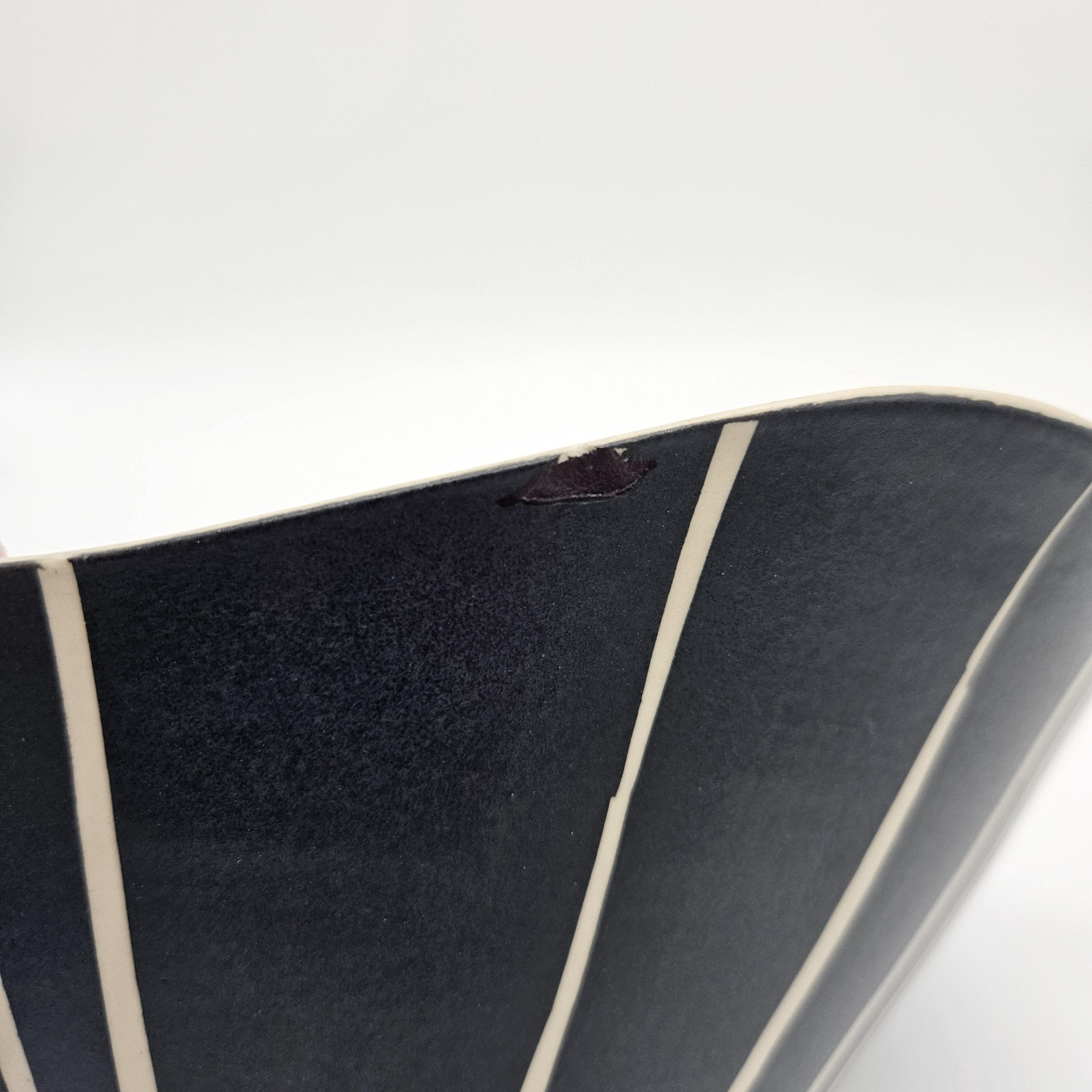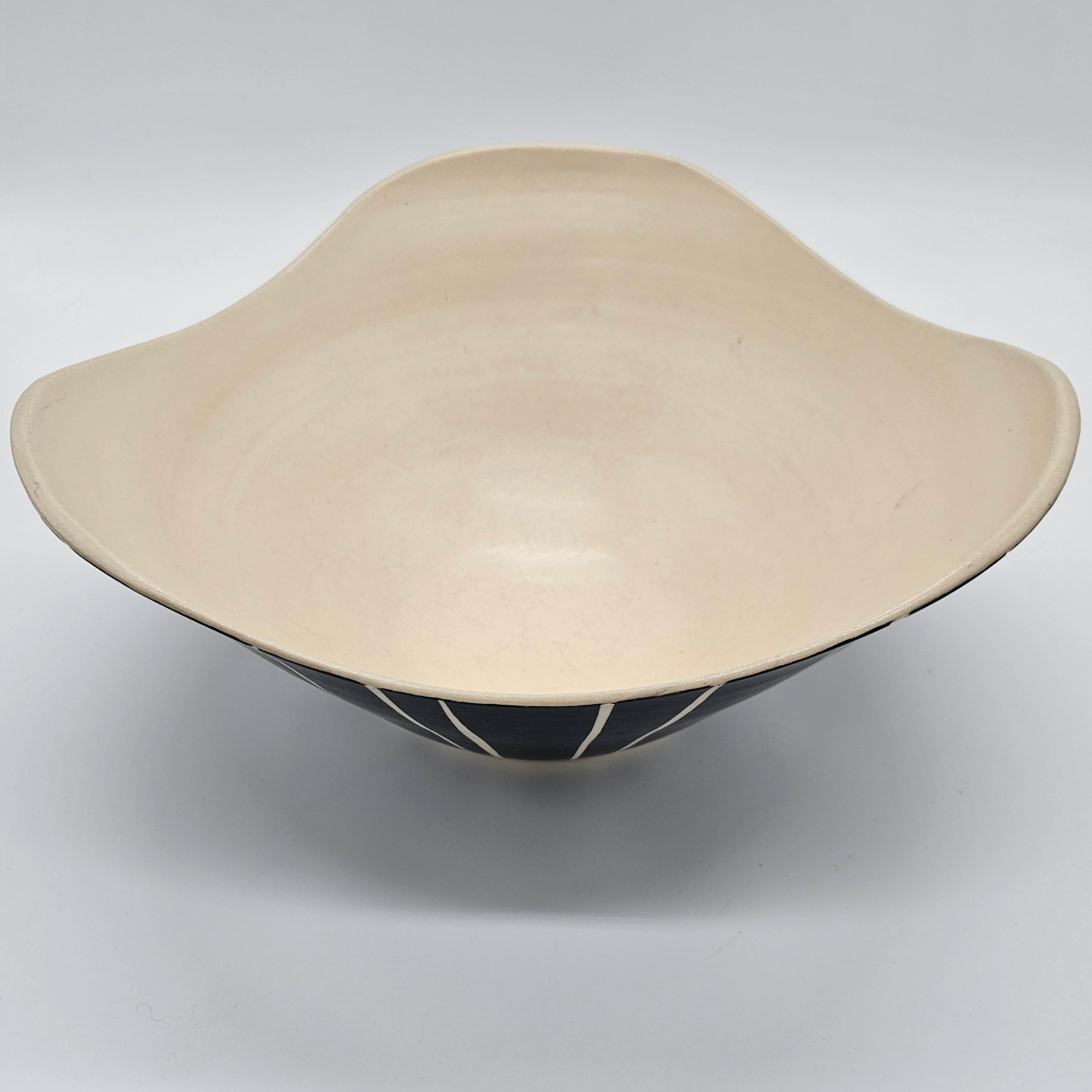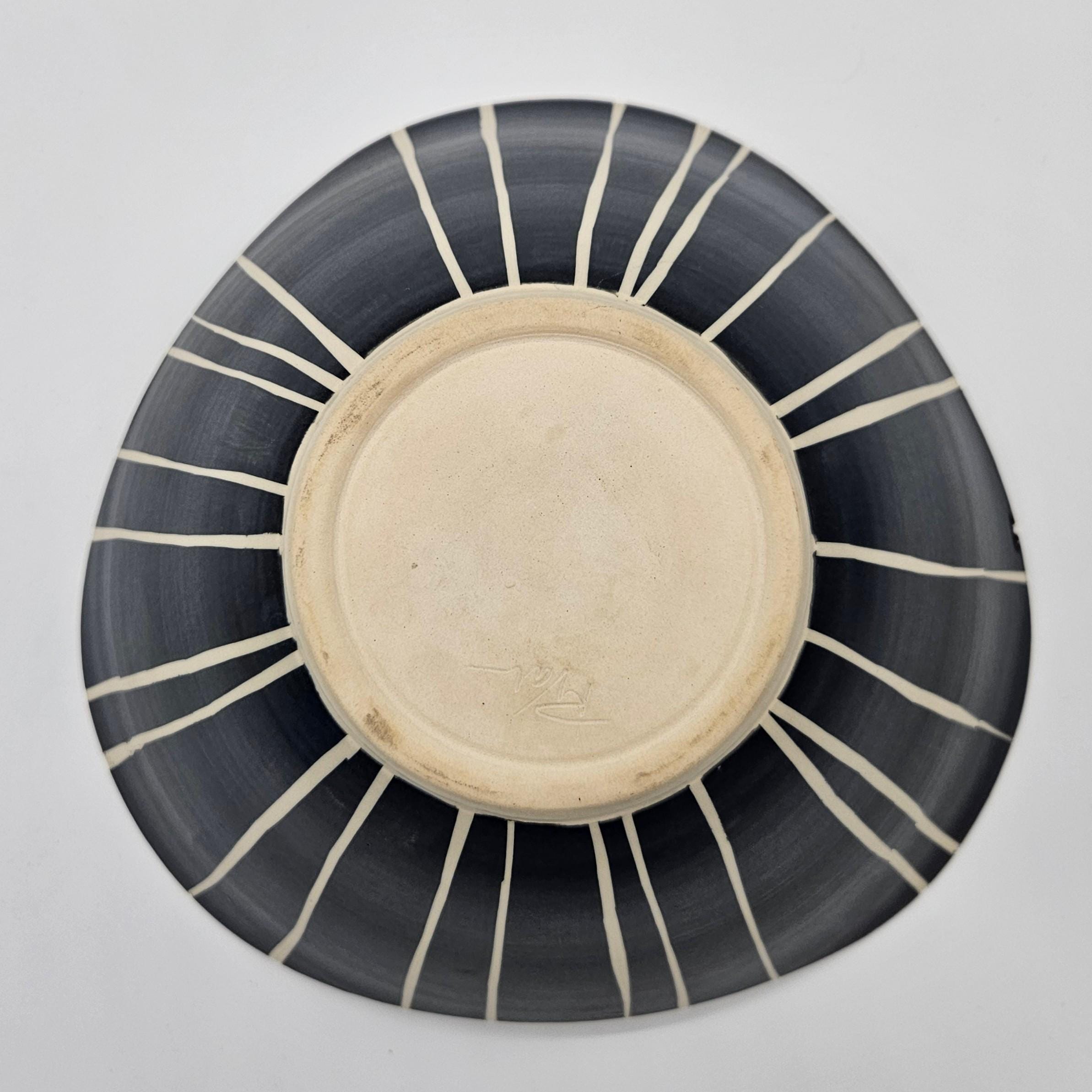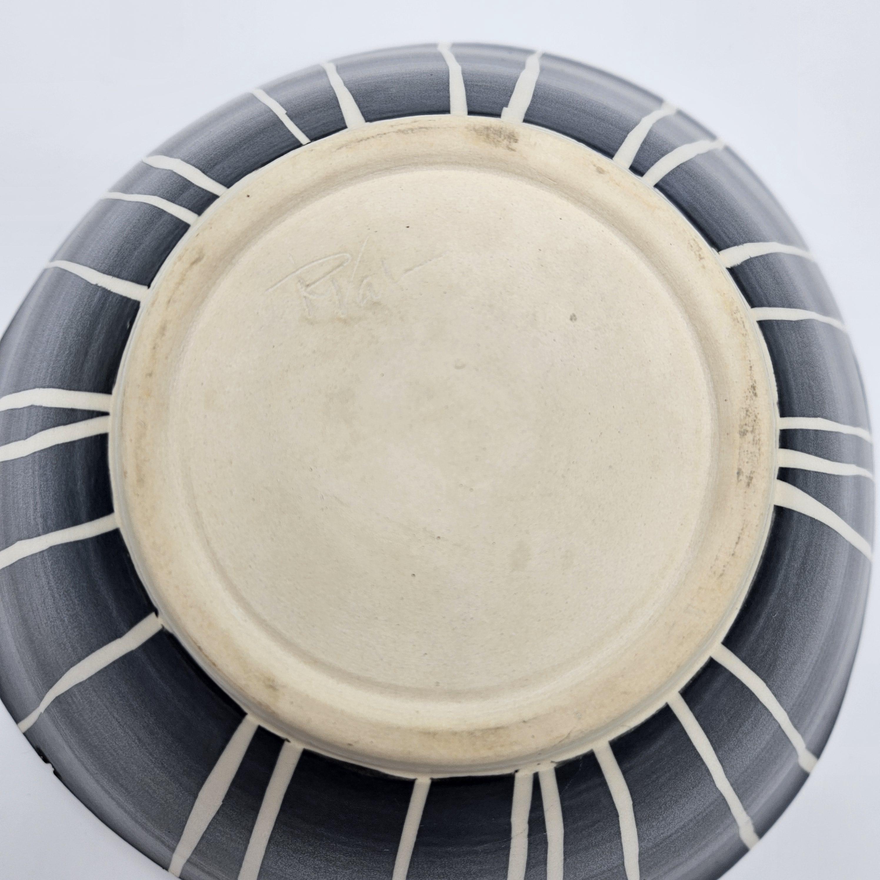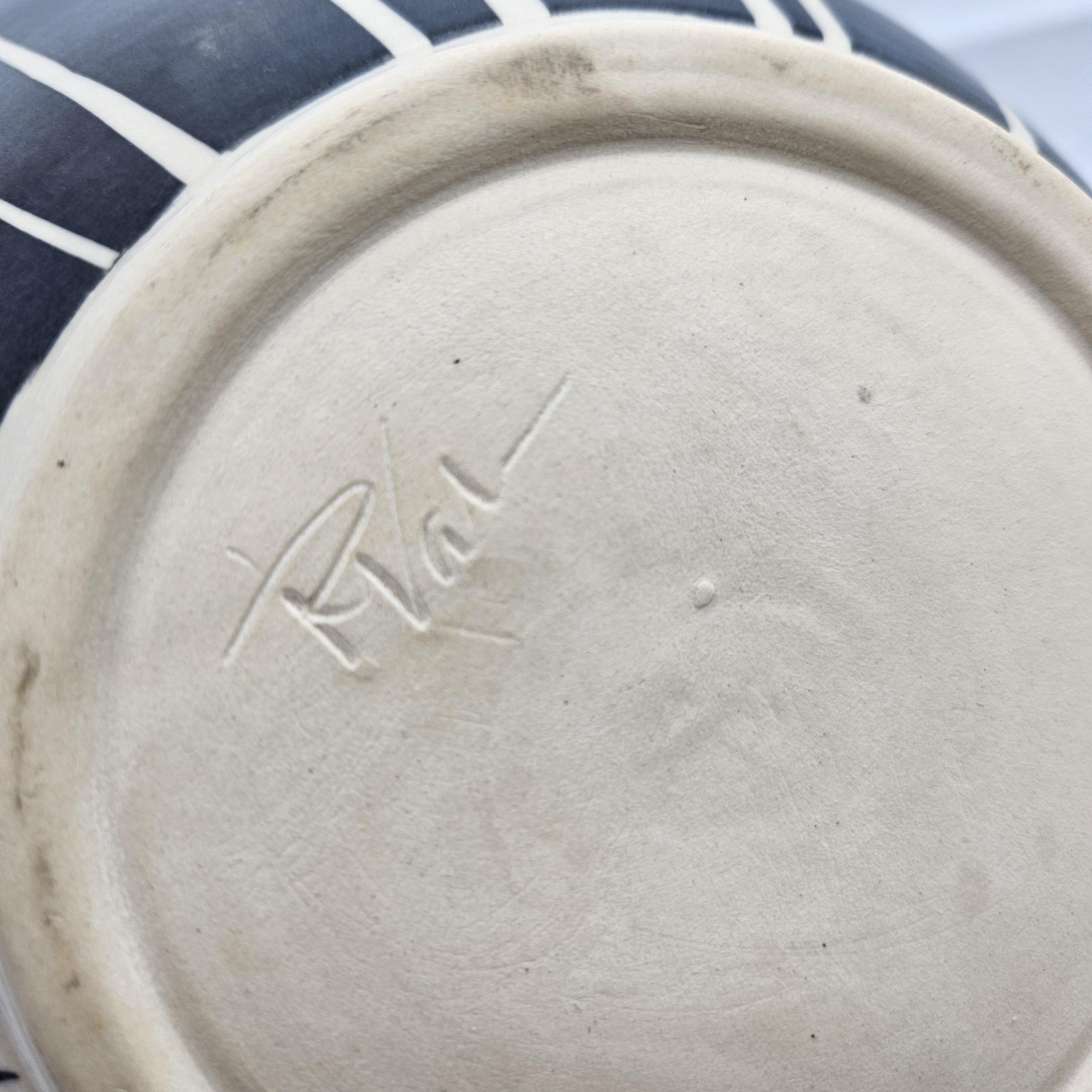 Bold handmade studio pottery bowl attributed to Rita Vali, signed “RVAL” on the base (see photos). This piece has a beautiful sculptural wavy rim, a matte black exterior with clean white geometric striping. It’s heavy, substantial, and makes an incredible centerpiece. approx 11” diameter, 5.25” tall