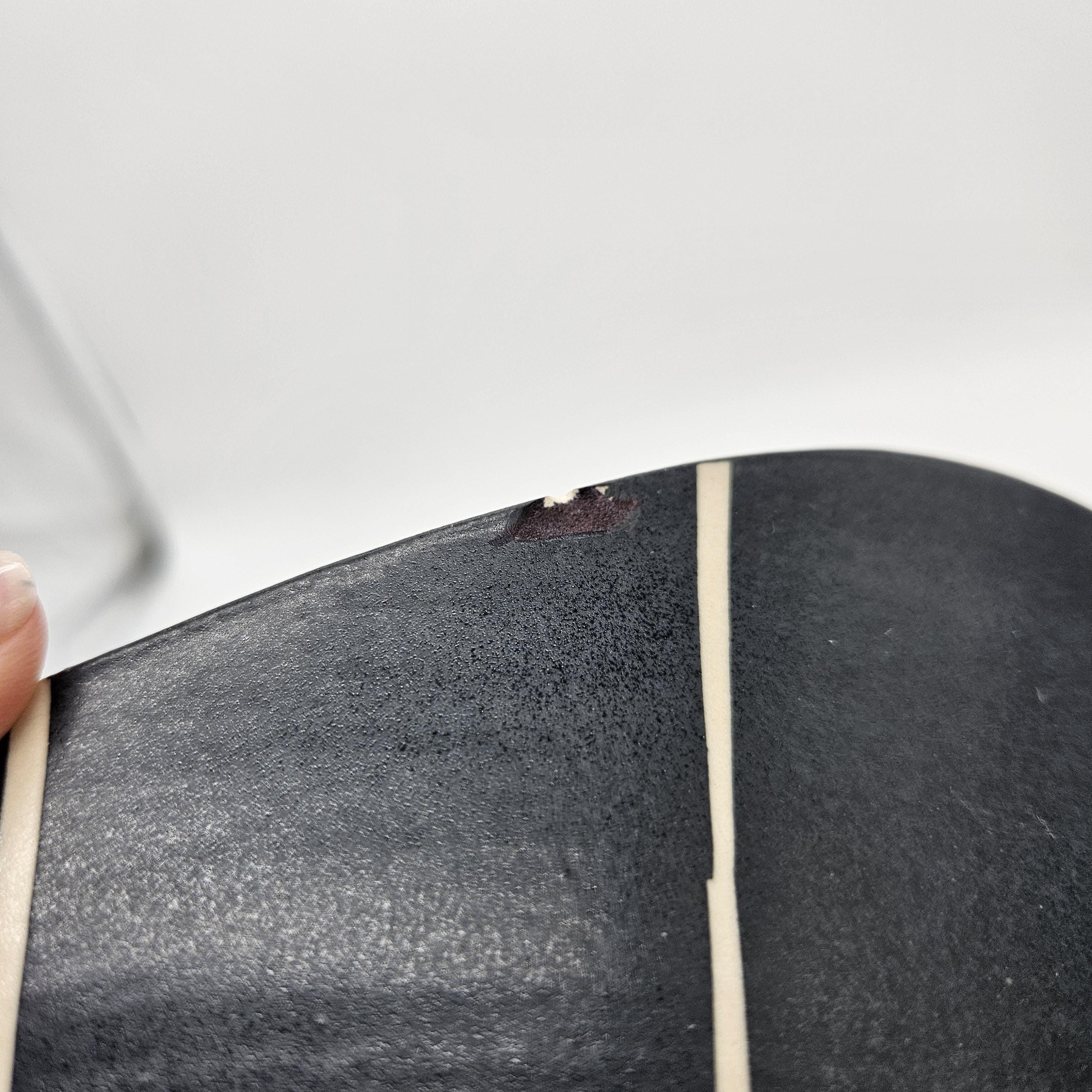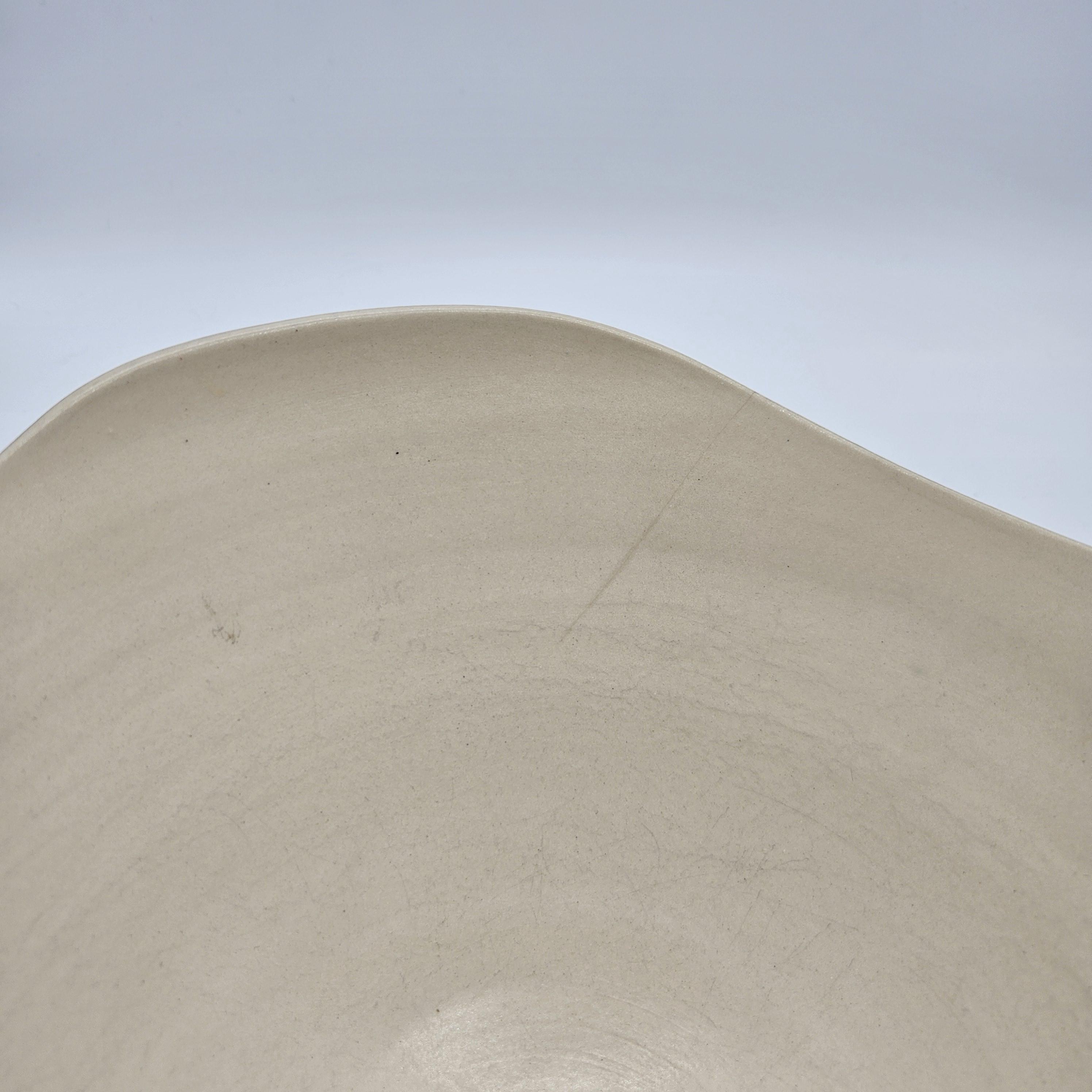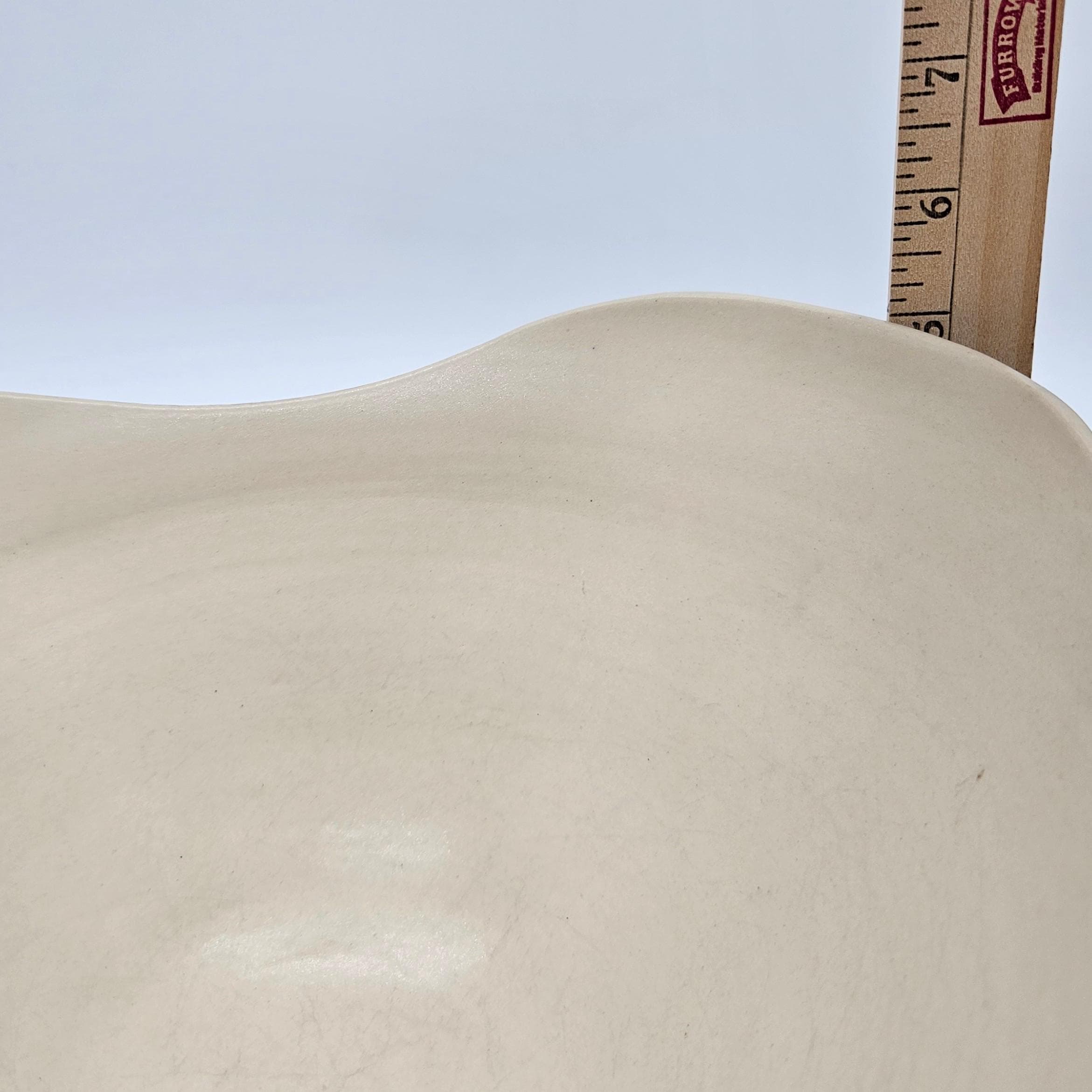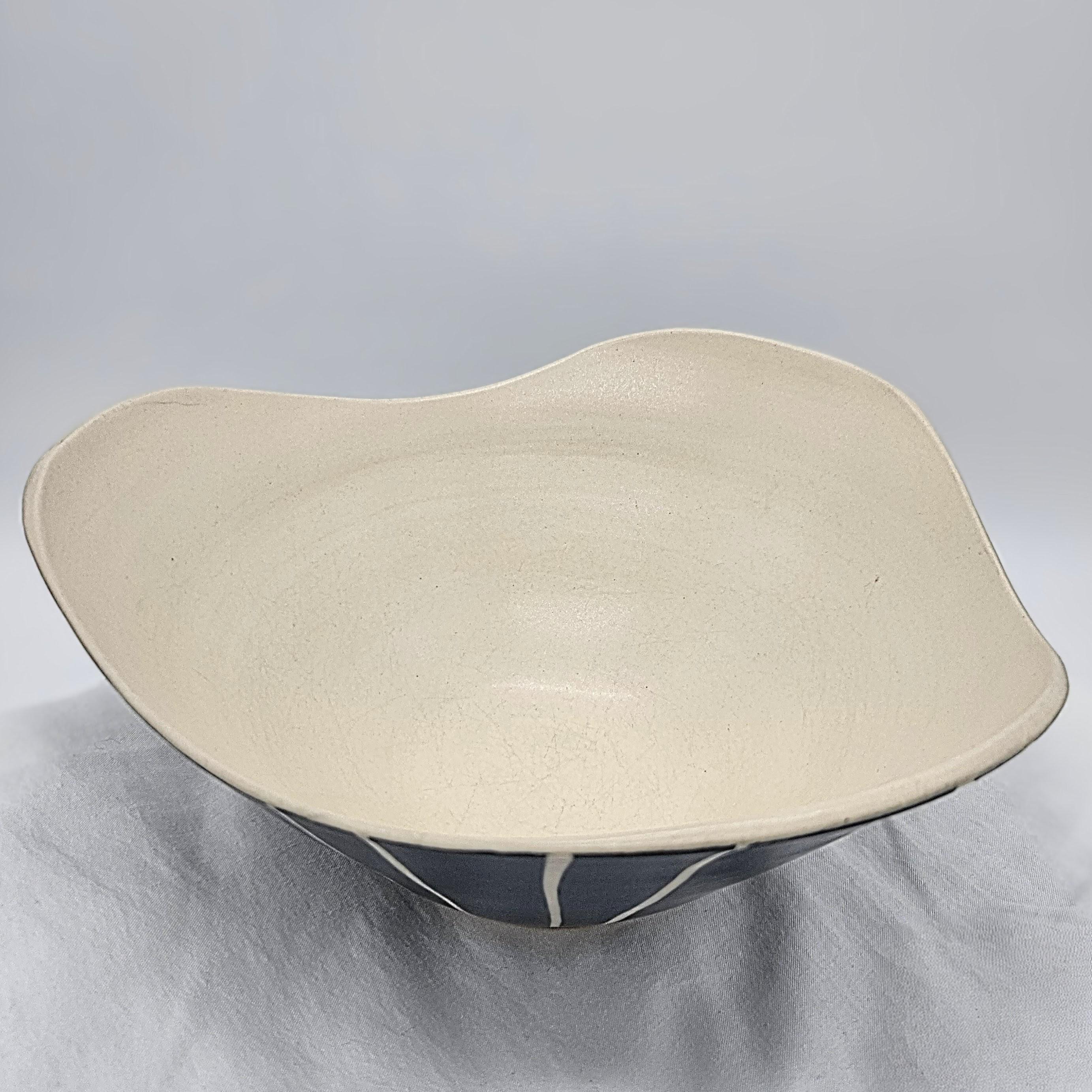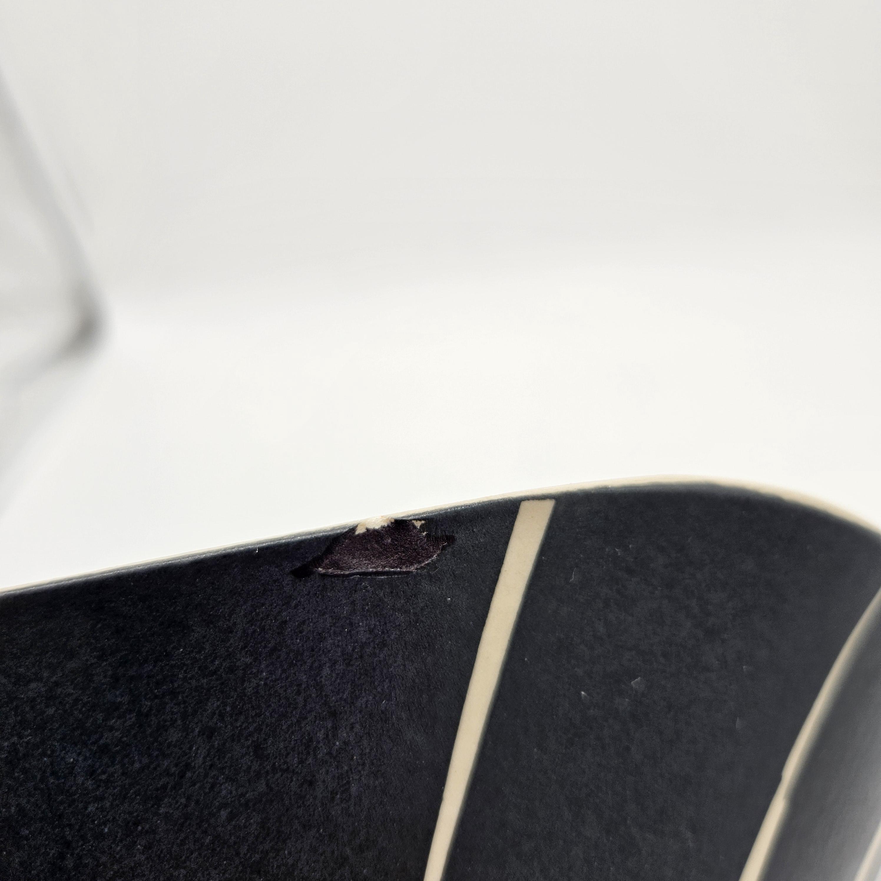 Bold handmade studio pottery bowl attributed to Rita Vali, signed “RVAL” on the base (see photos). This piece has a beautiful sculptural wavy rim, a matte black exterior with clean white geometric striping. It’s heavy, substantial, and makes an incredible centerpiece. approx 11” diameter, 5.25” tall