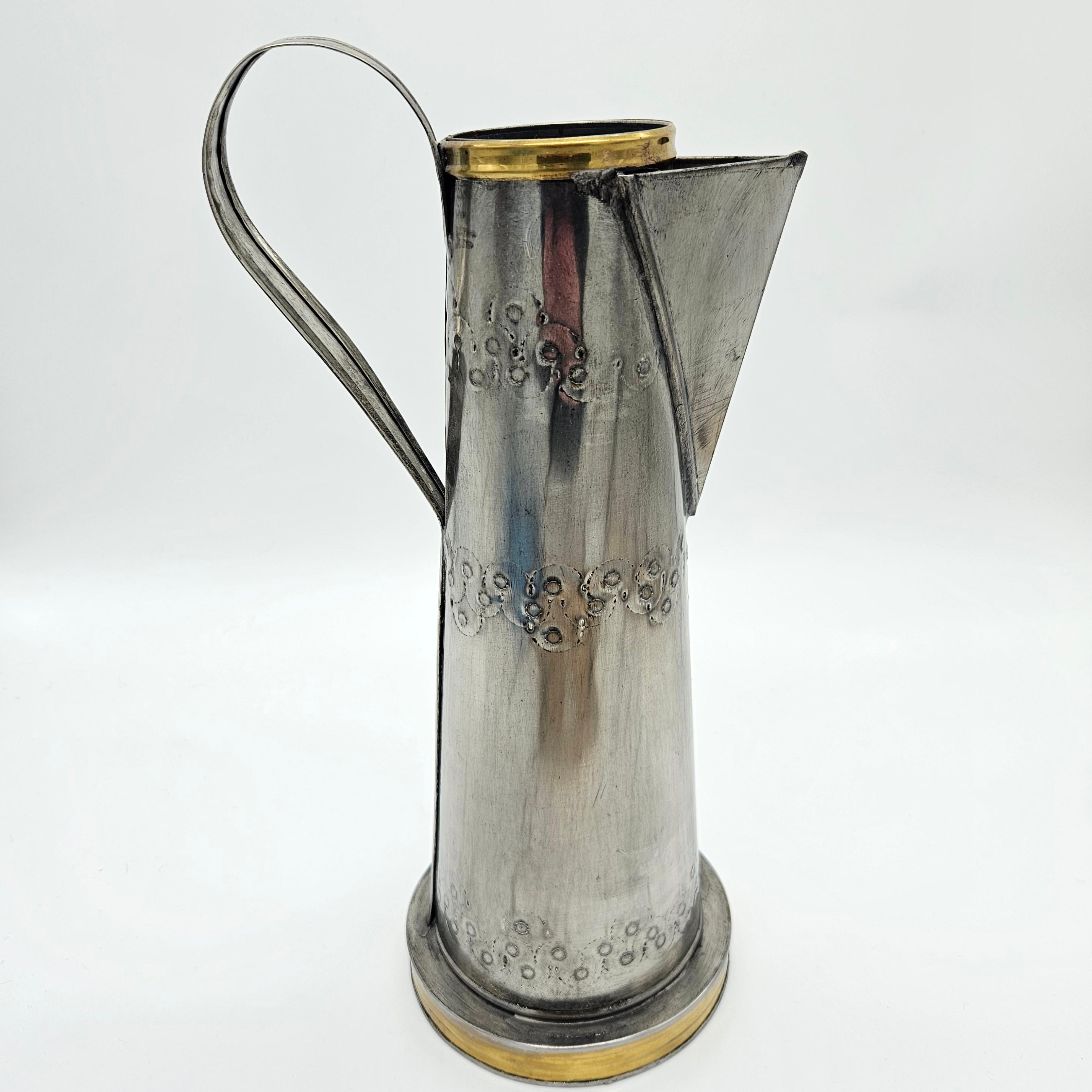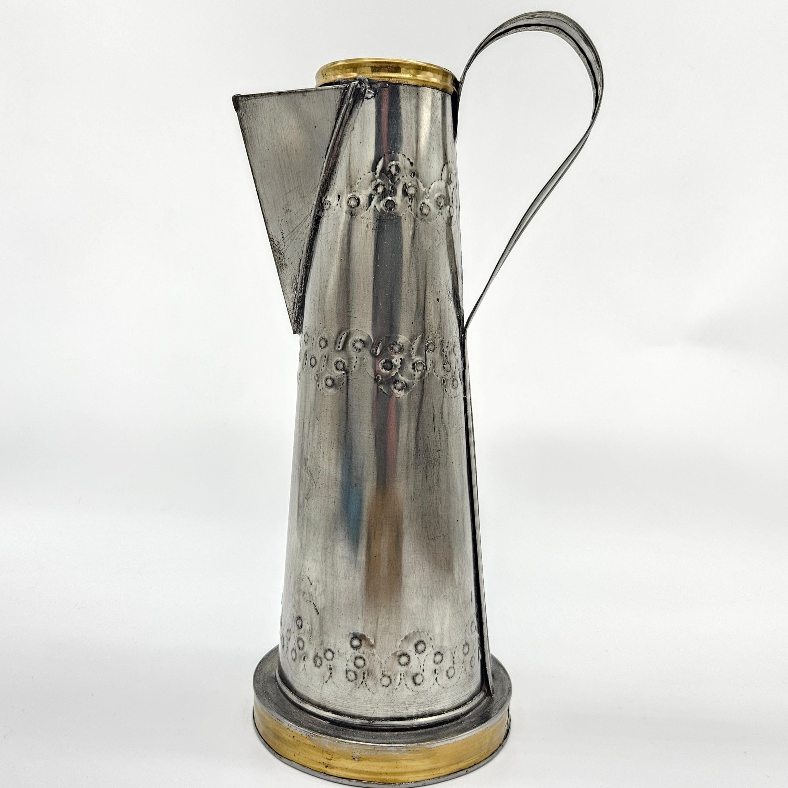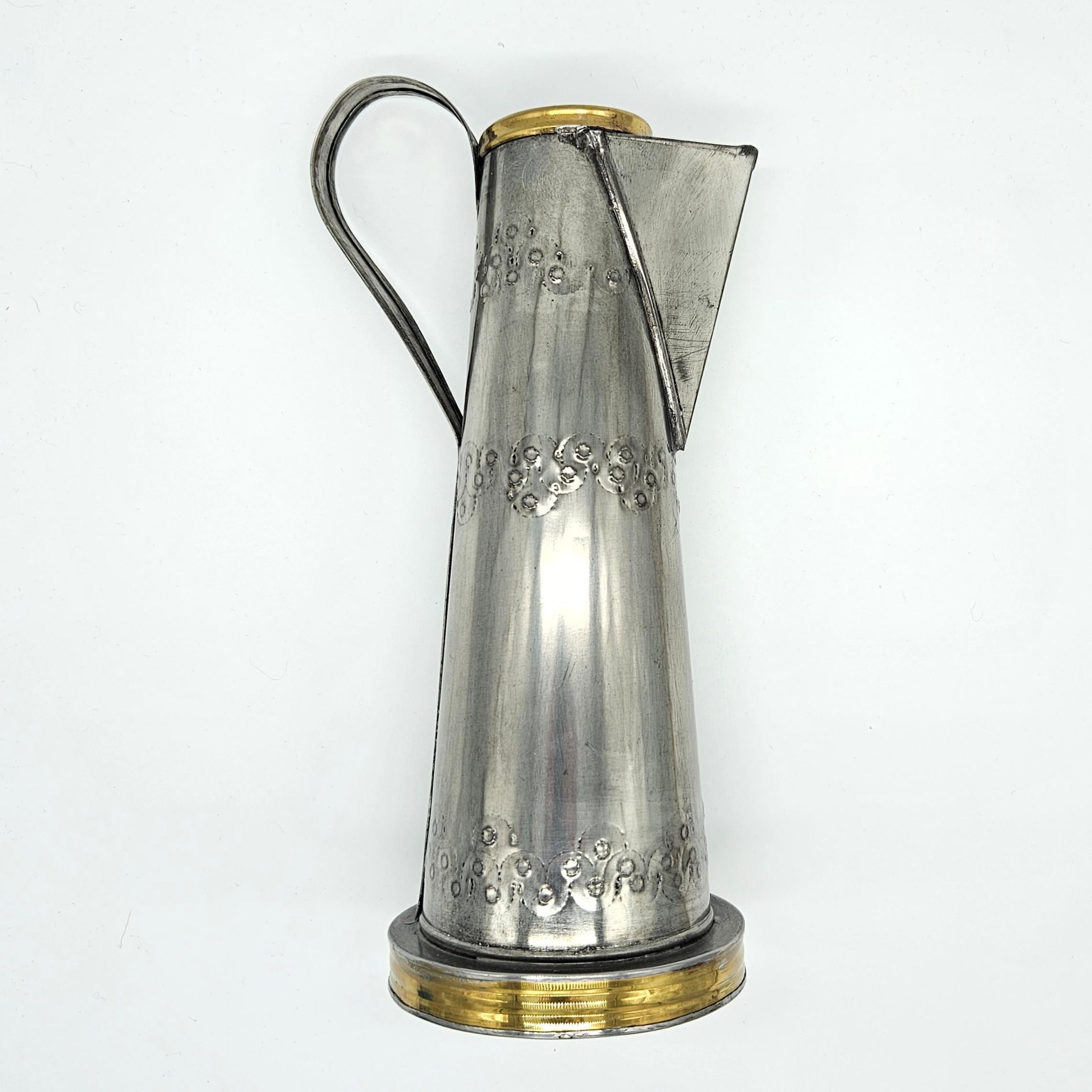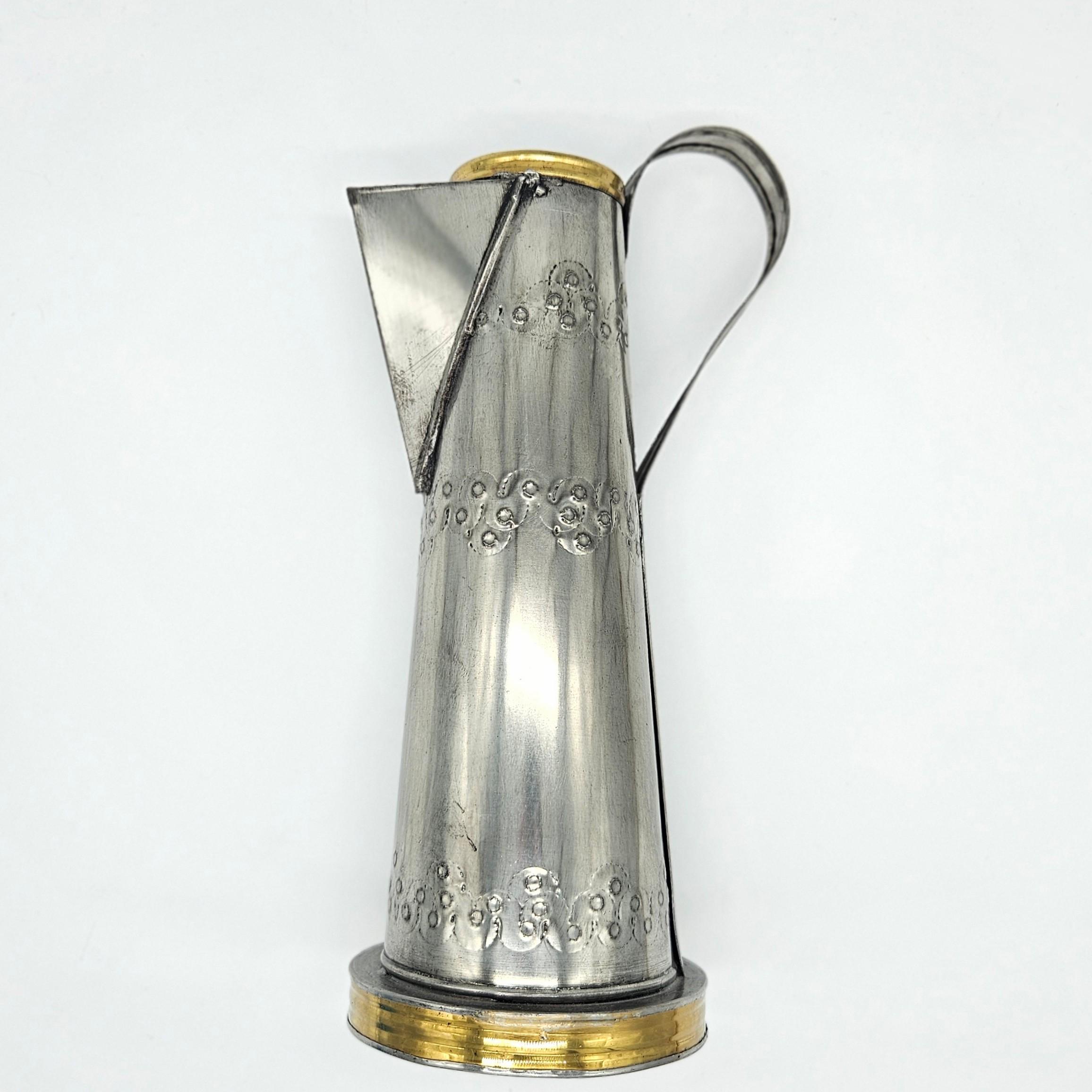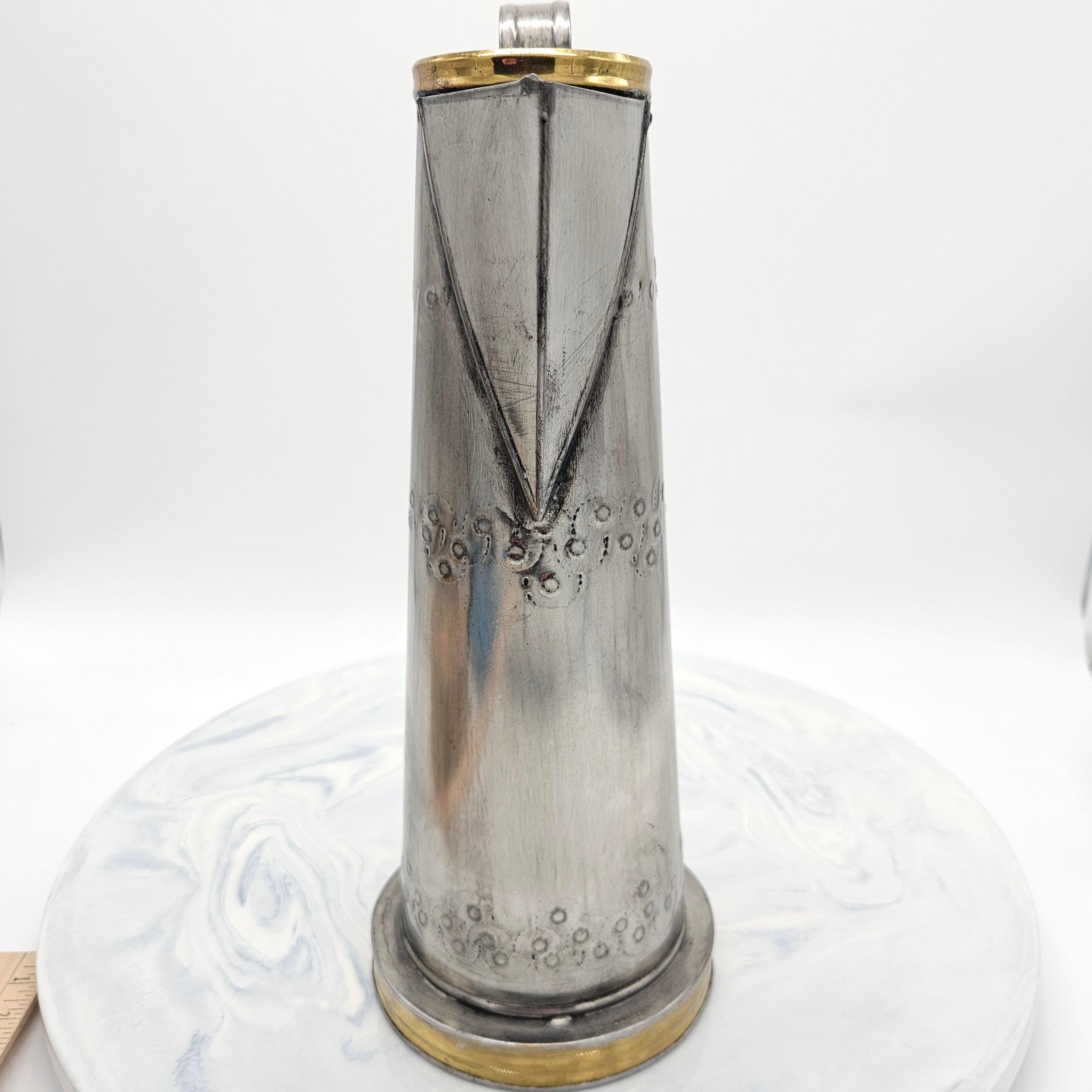 This is a vintage Mexican pewter decorative vessel, crafted in Mexico and likely dating to the mid-20th century. The piece features a tall, sculptural pitcher-style form with hand-finished detailing, a riveted handle, and brass-tone accents at the rim and base. While inspired by coffee pot or pitcher silhouettes, this piece is decorative by design.