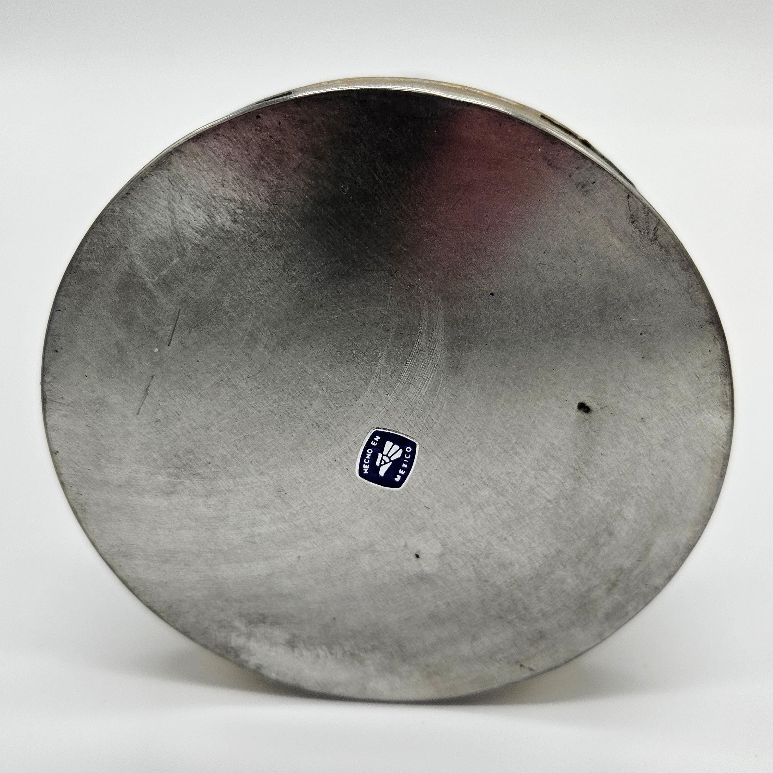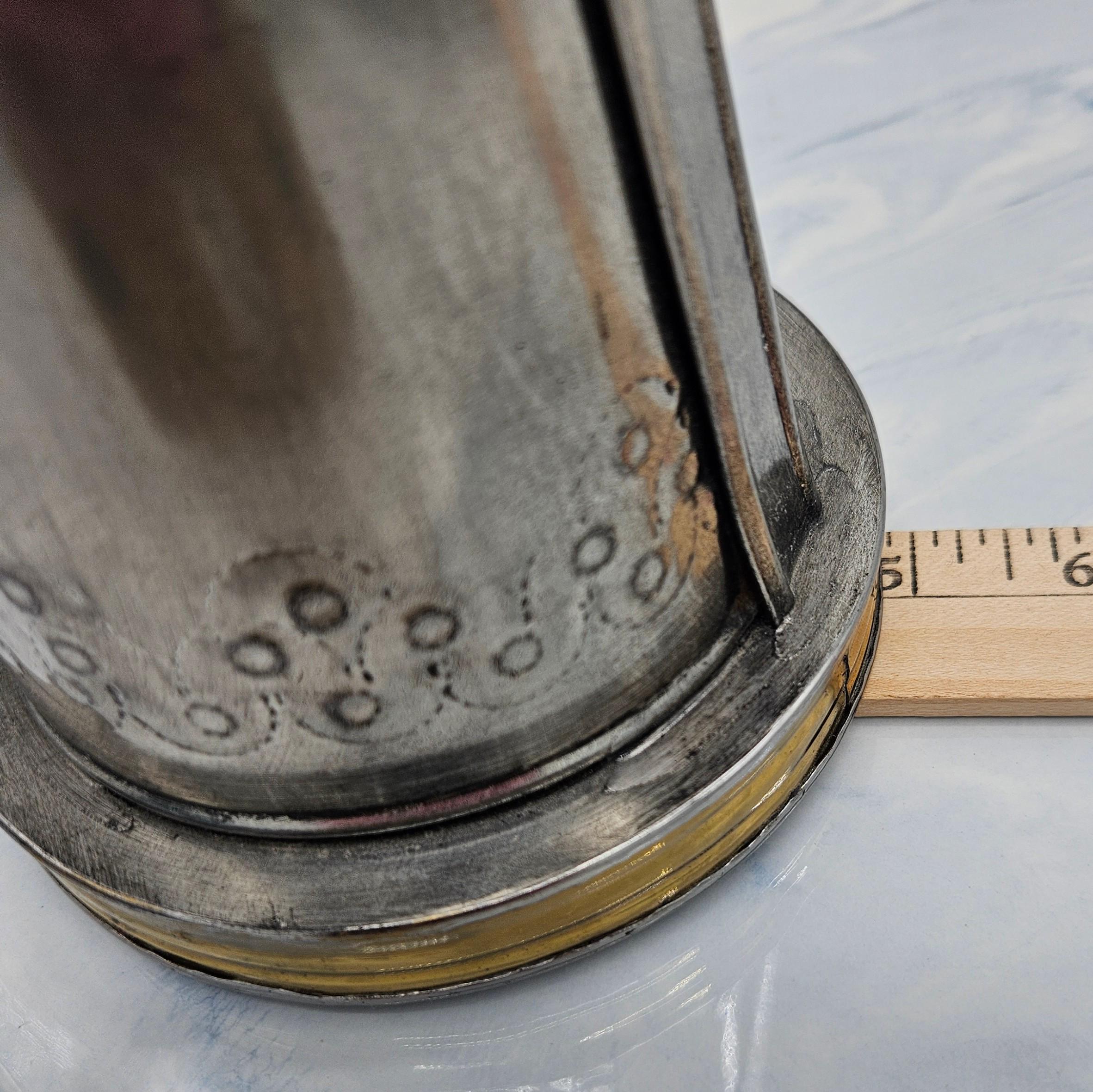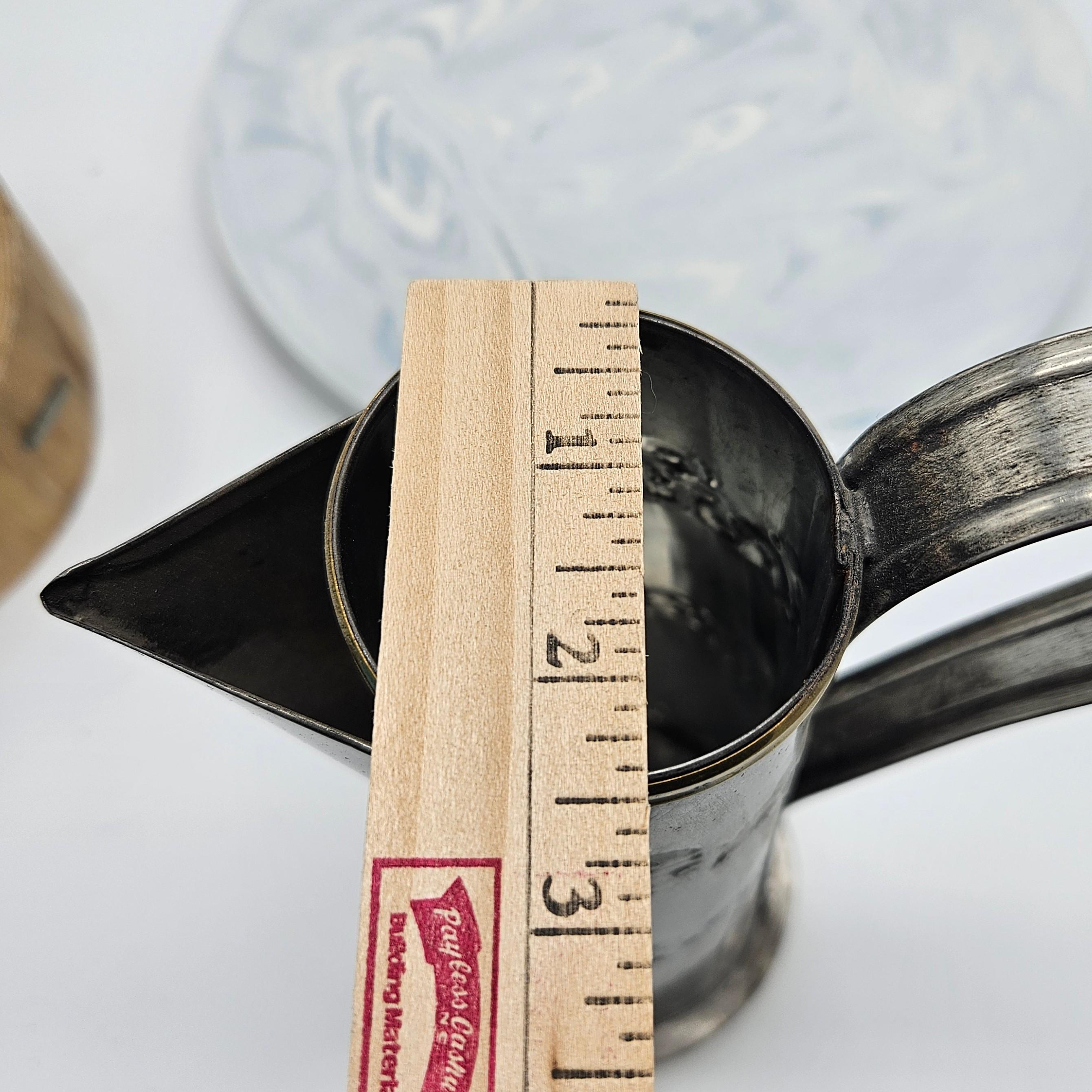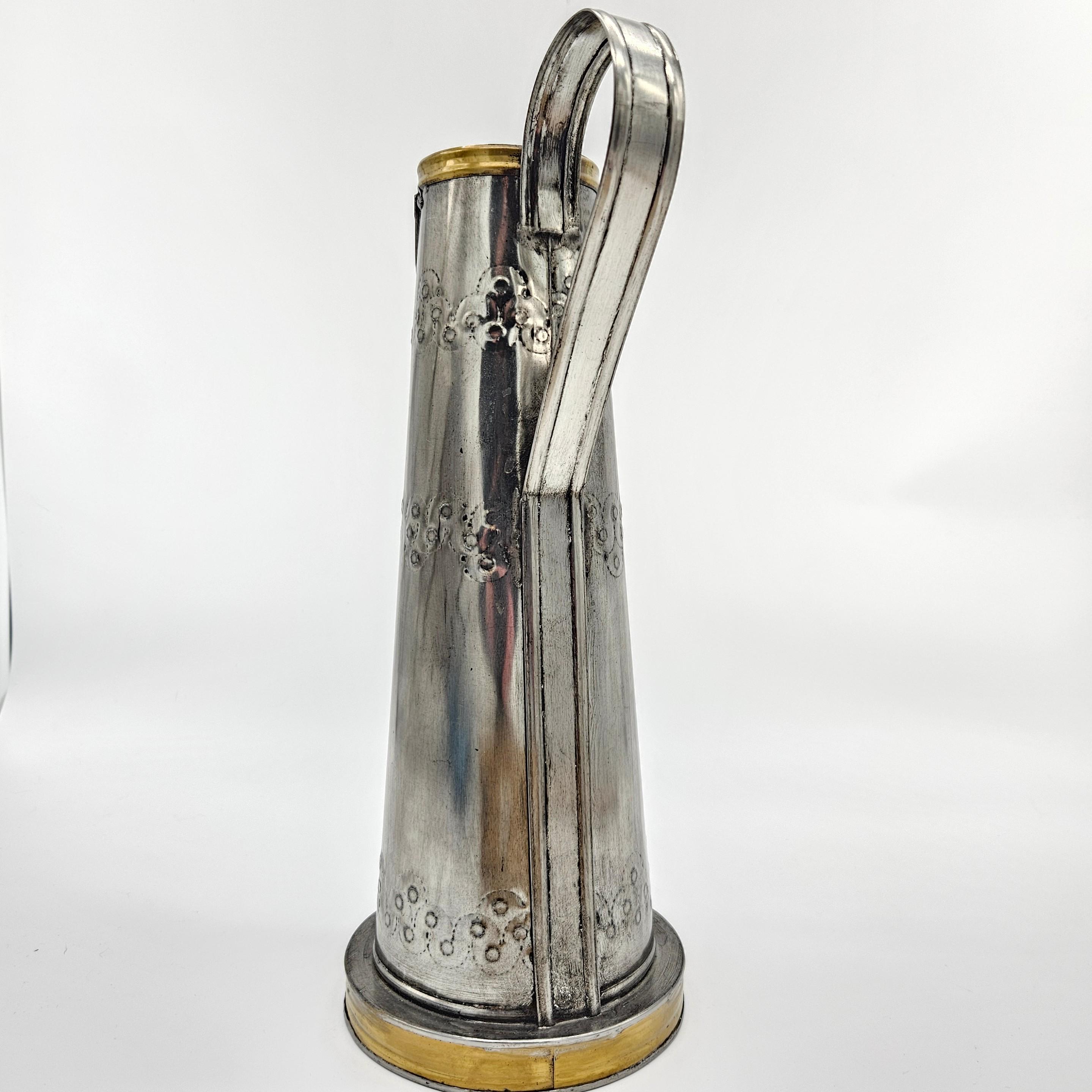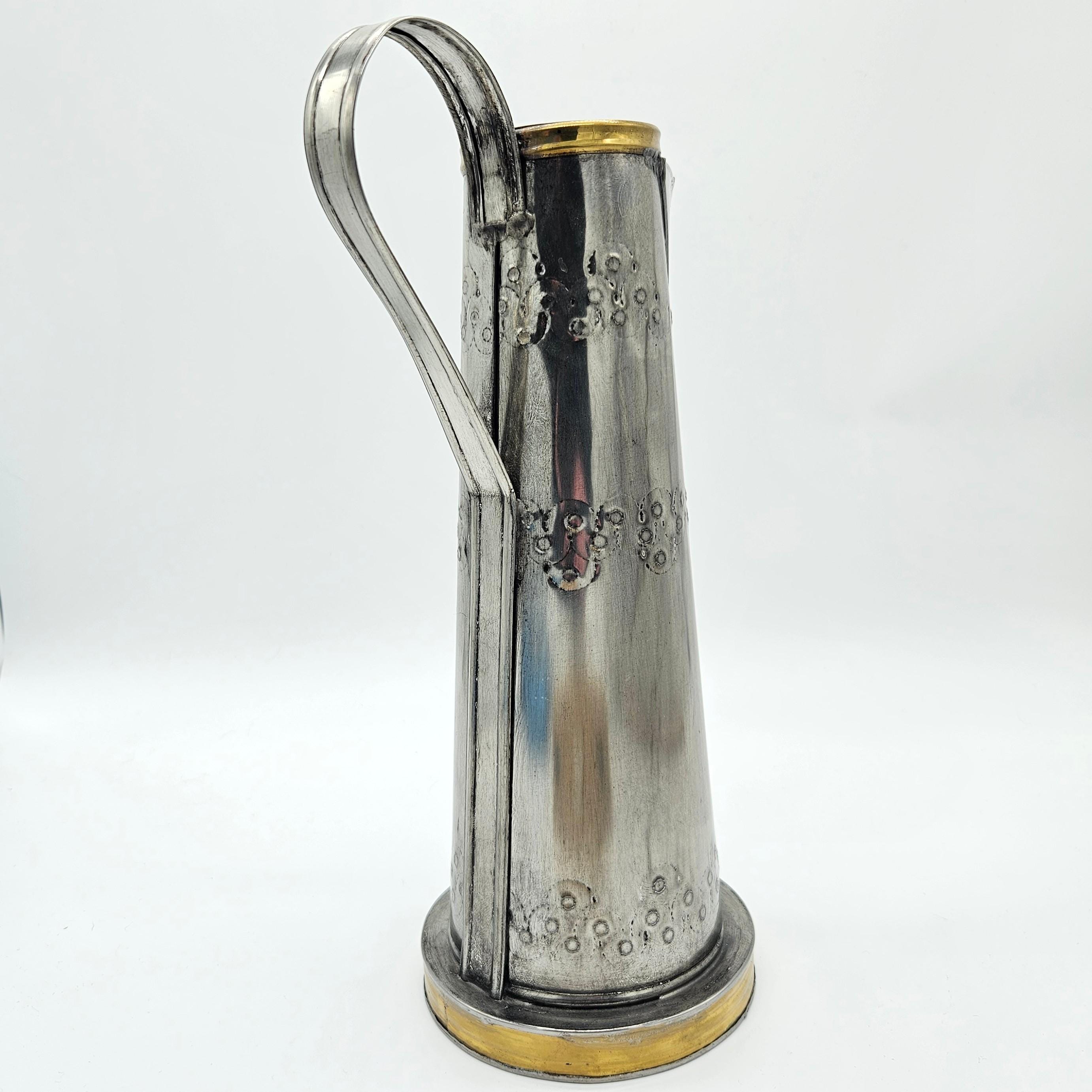 This is a vintage Mexican pewter decorative vessel, crafted in Mexico and likely dating to the mid-20th century. The piece features a tall, sculptural pitcher-style form with hand-finished detailing, a riveted handle, and brass-tone accents at the rim and base. While inspired by coffee pot or pitcher silhouettes, this piece is decorative by design.