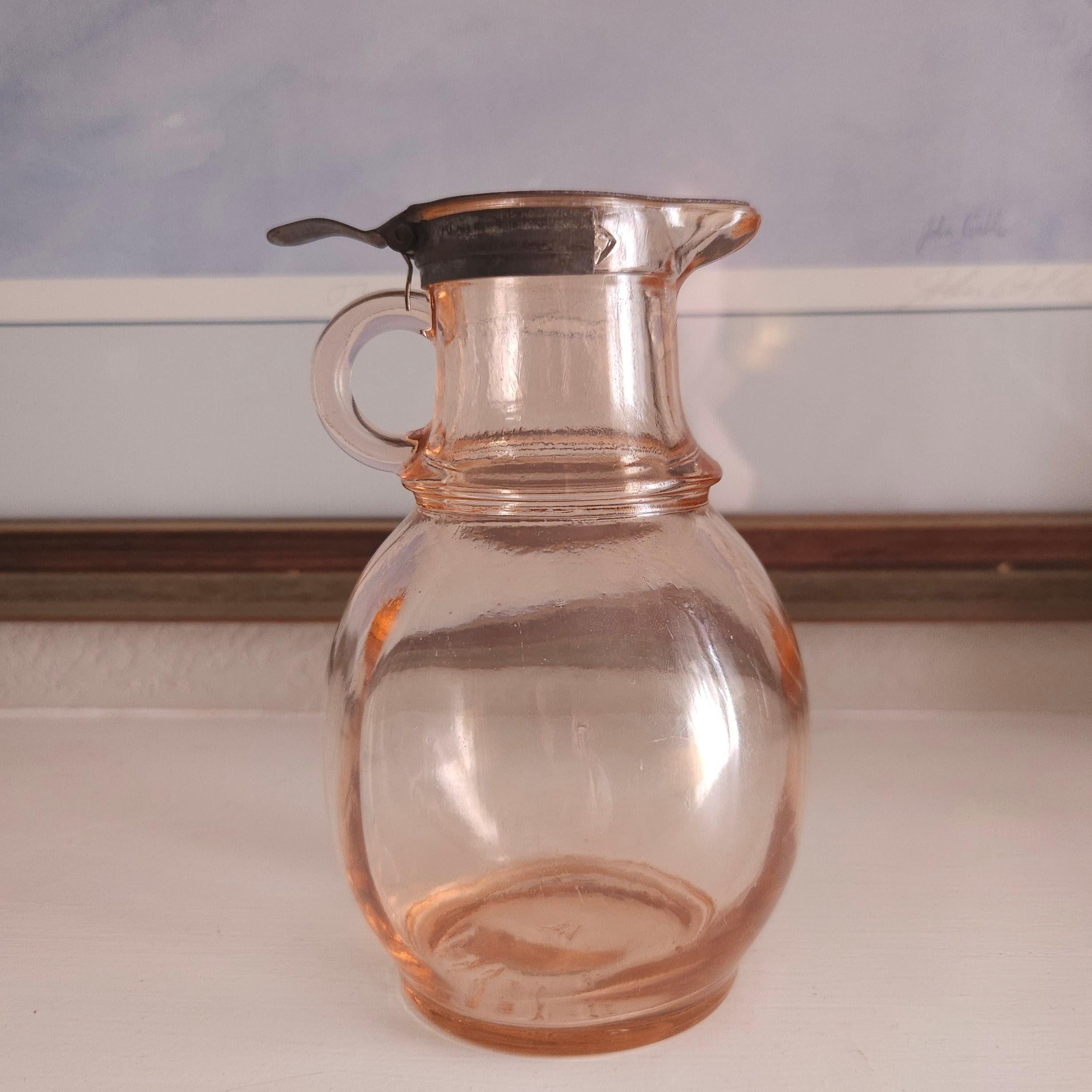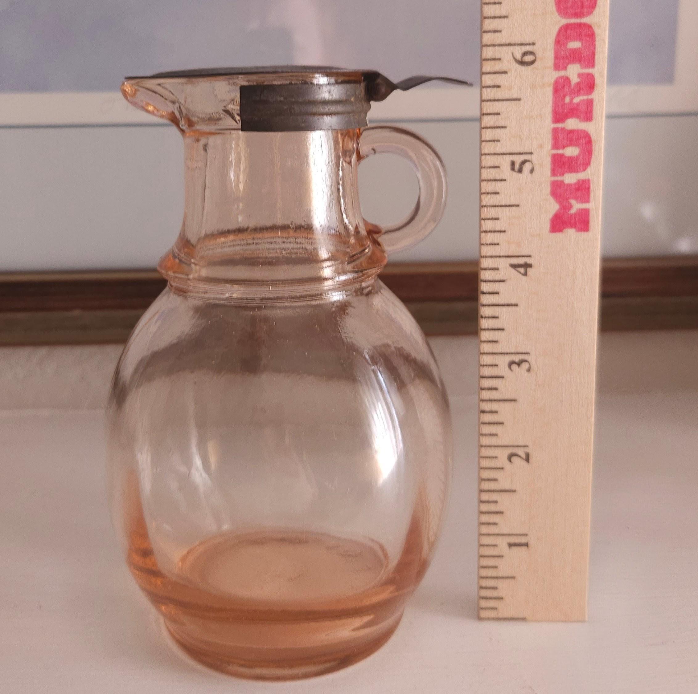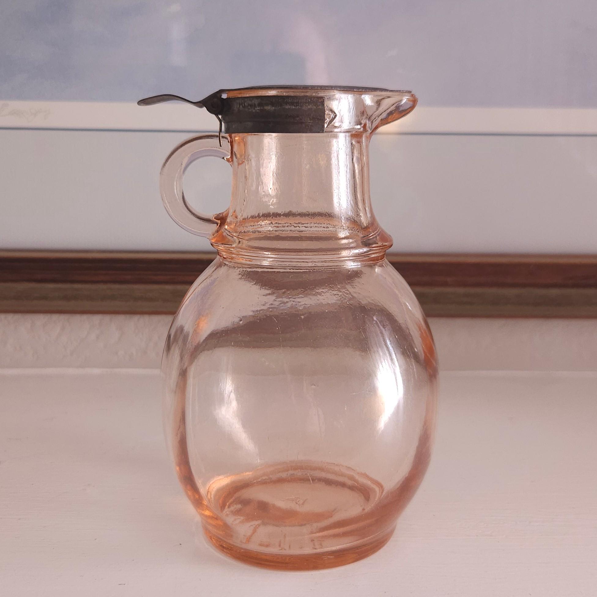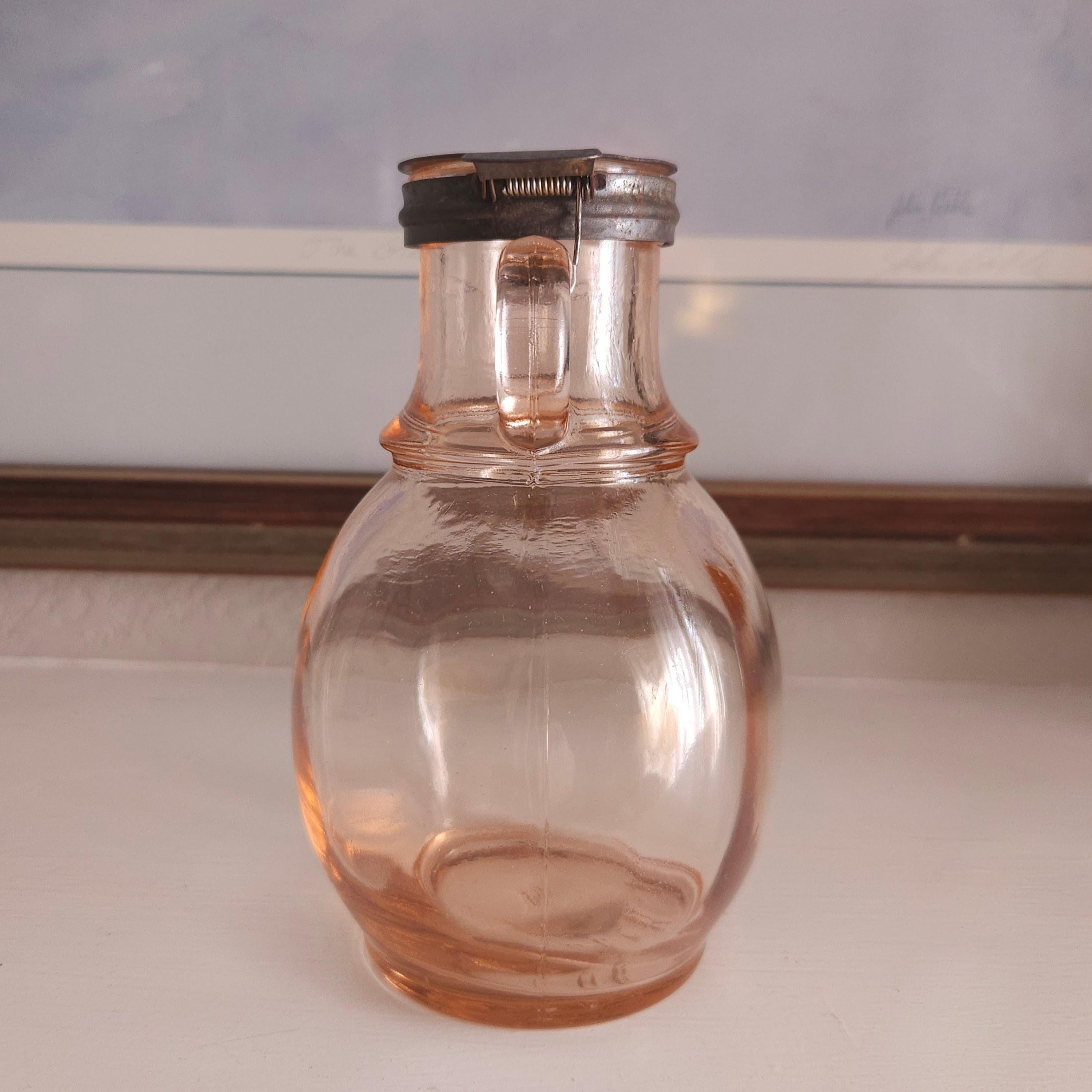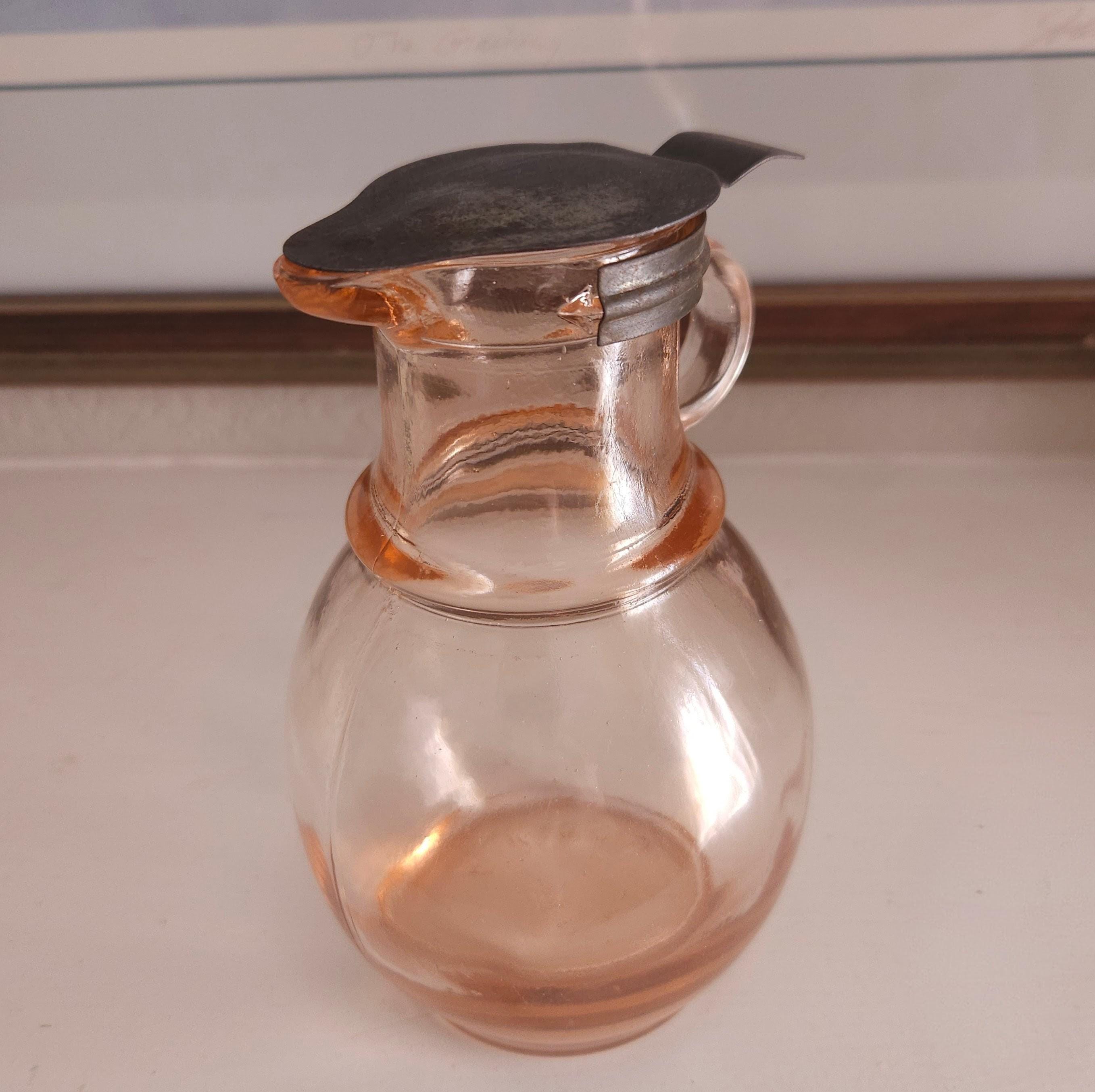 This pink depression glass syrup pitcher was made for the breakfast table. The bulb body and narrow neck help control the pour, and the spring-hinge lid still opens and closes nicely.