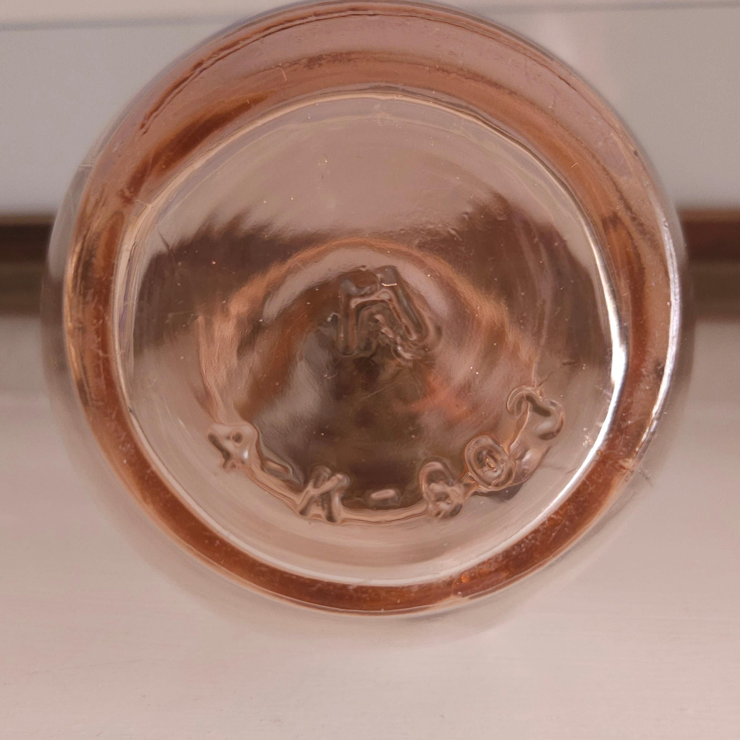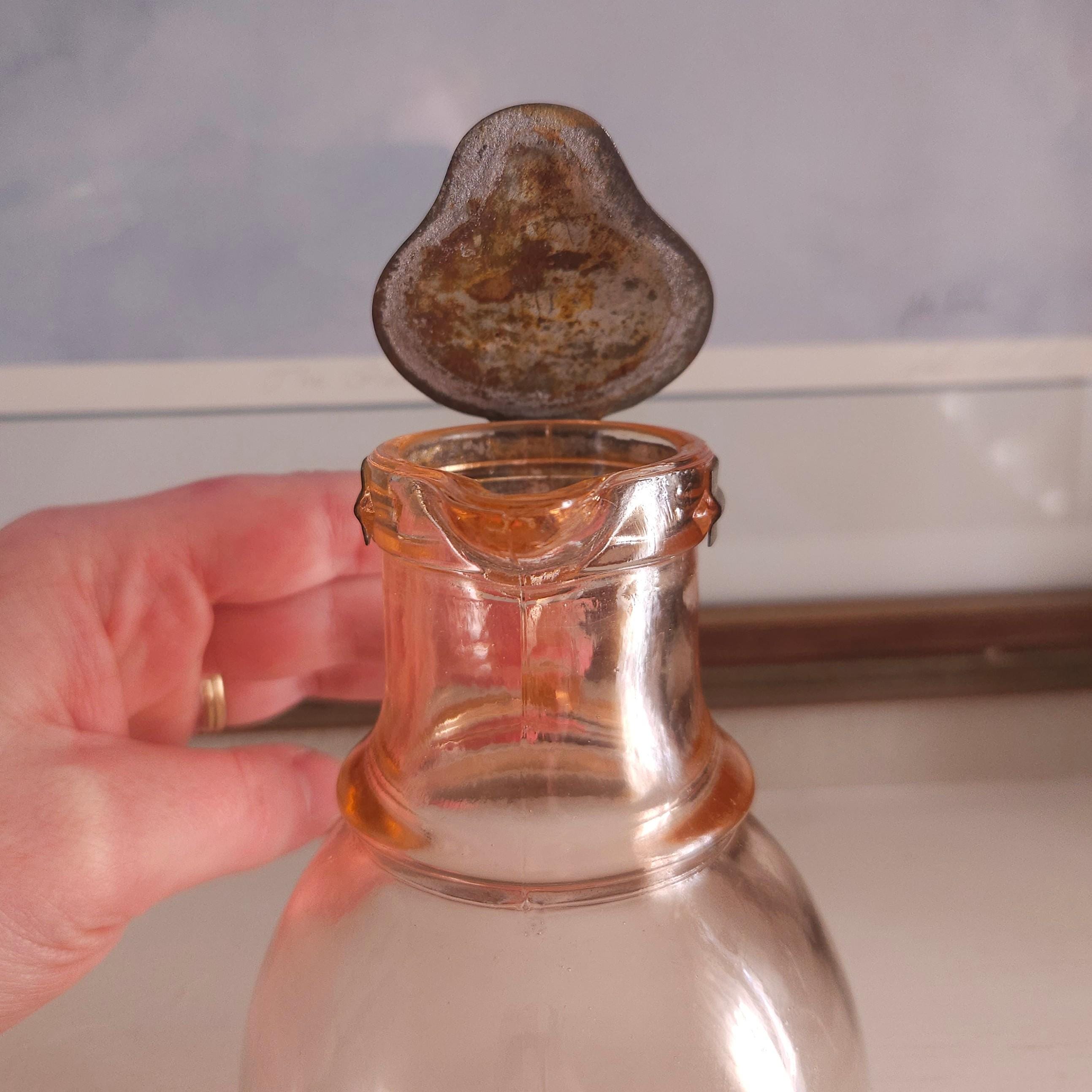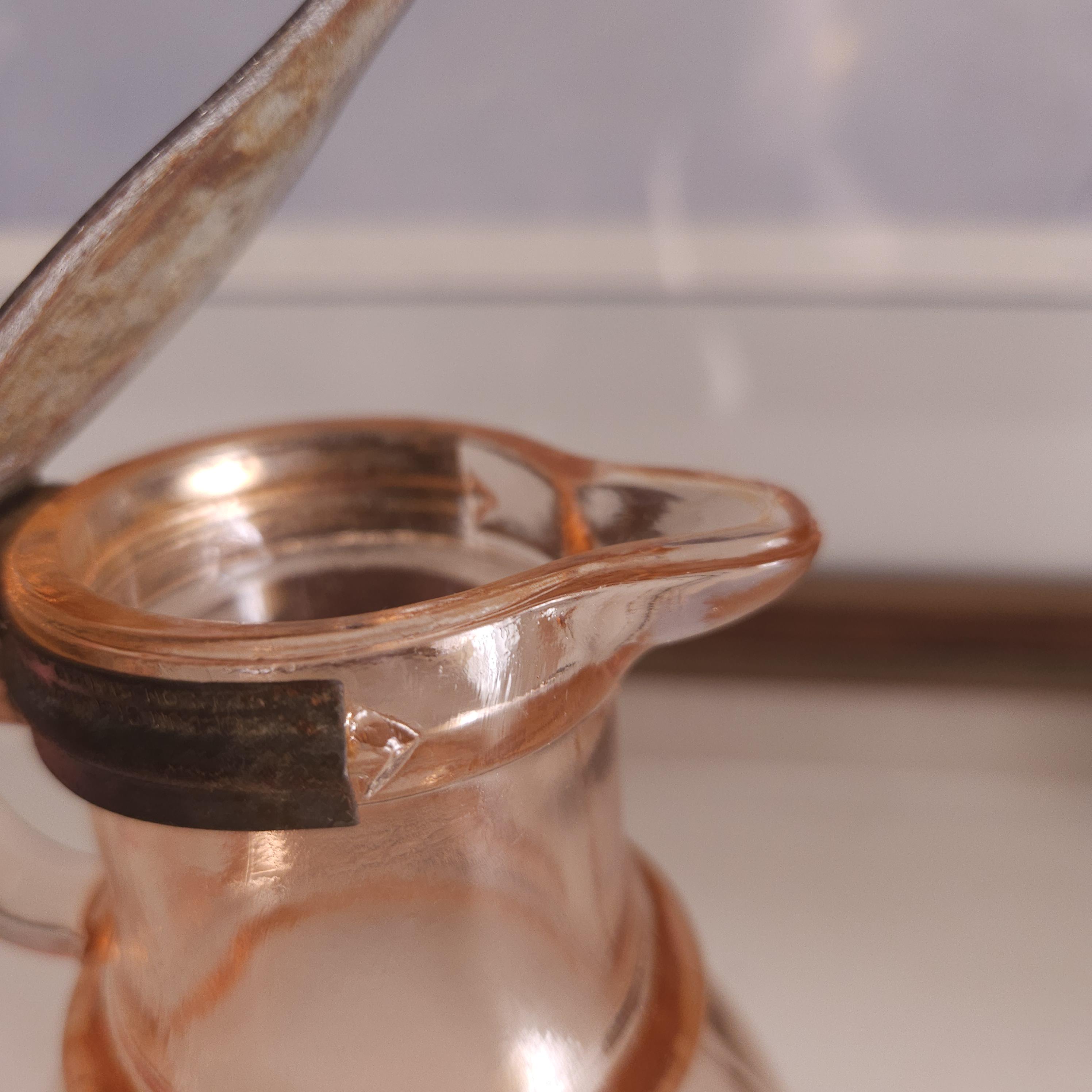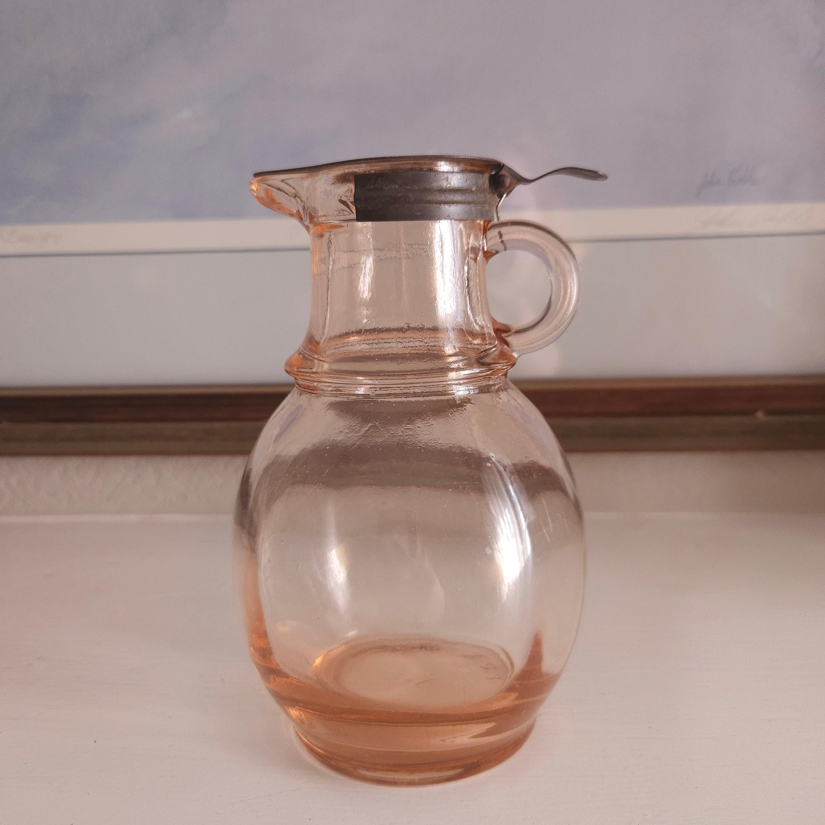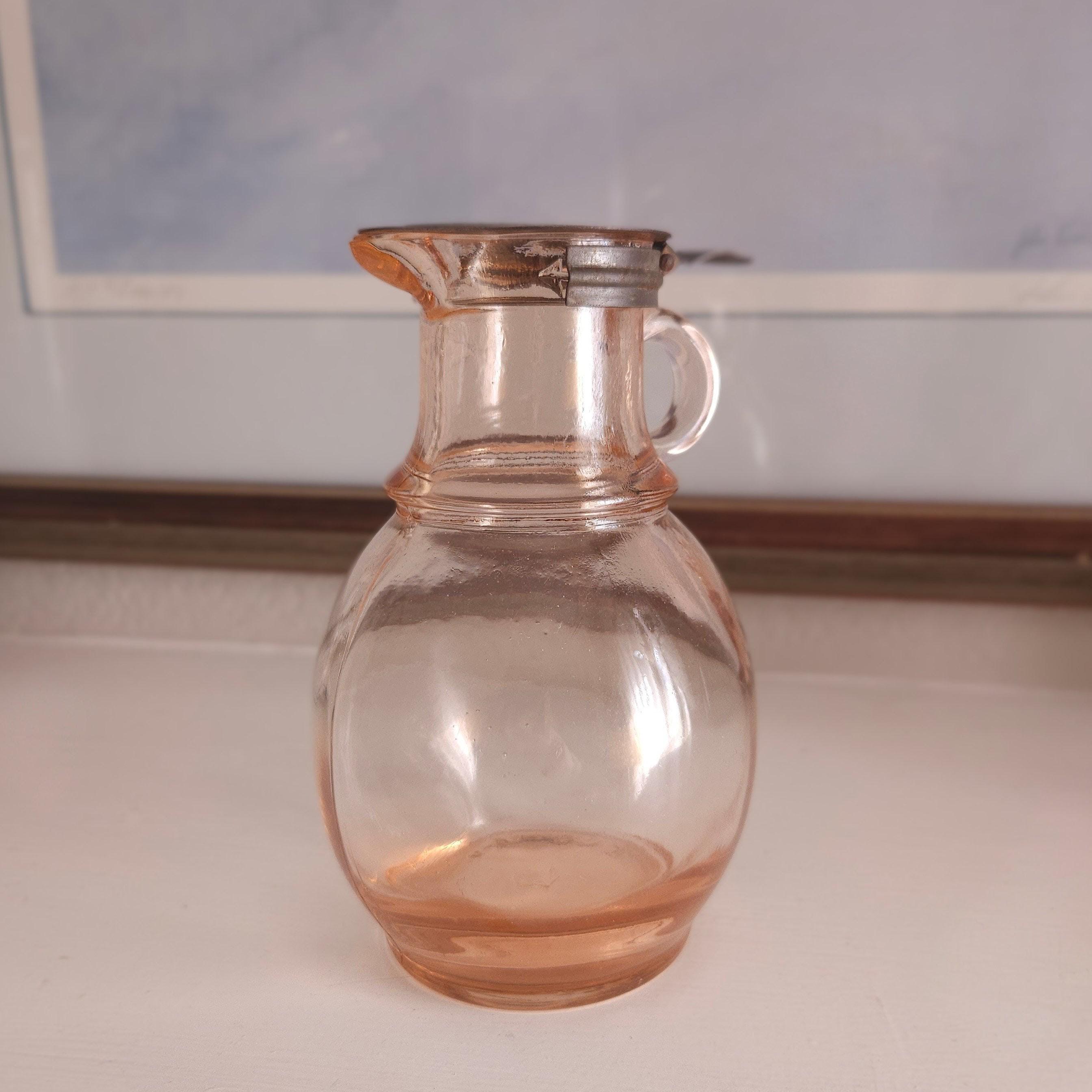 This pink depression glass syrup pitcher was made for the breakfast table. The bulb body and narrow neck help control the pour, and the spring-hinge lid still opens and closes nicely.