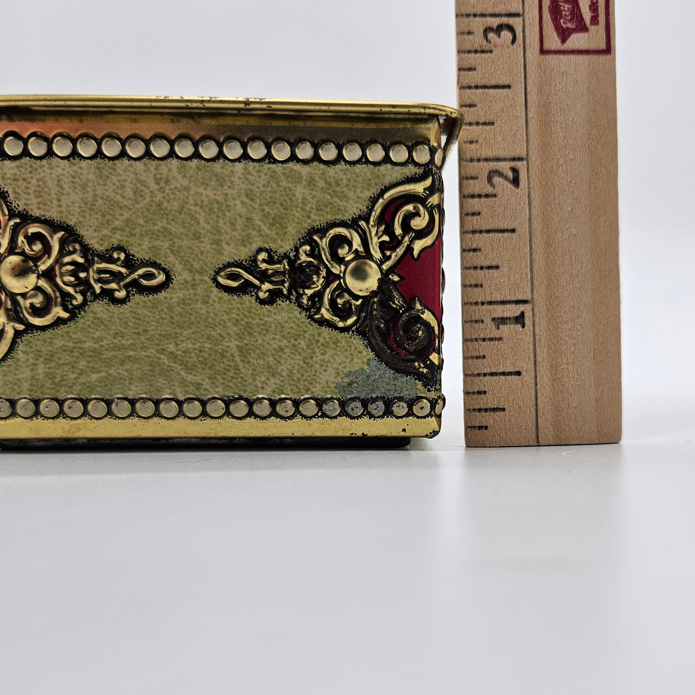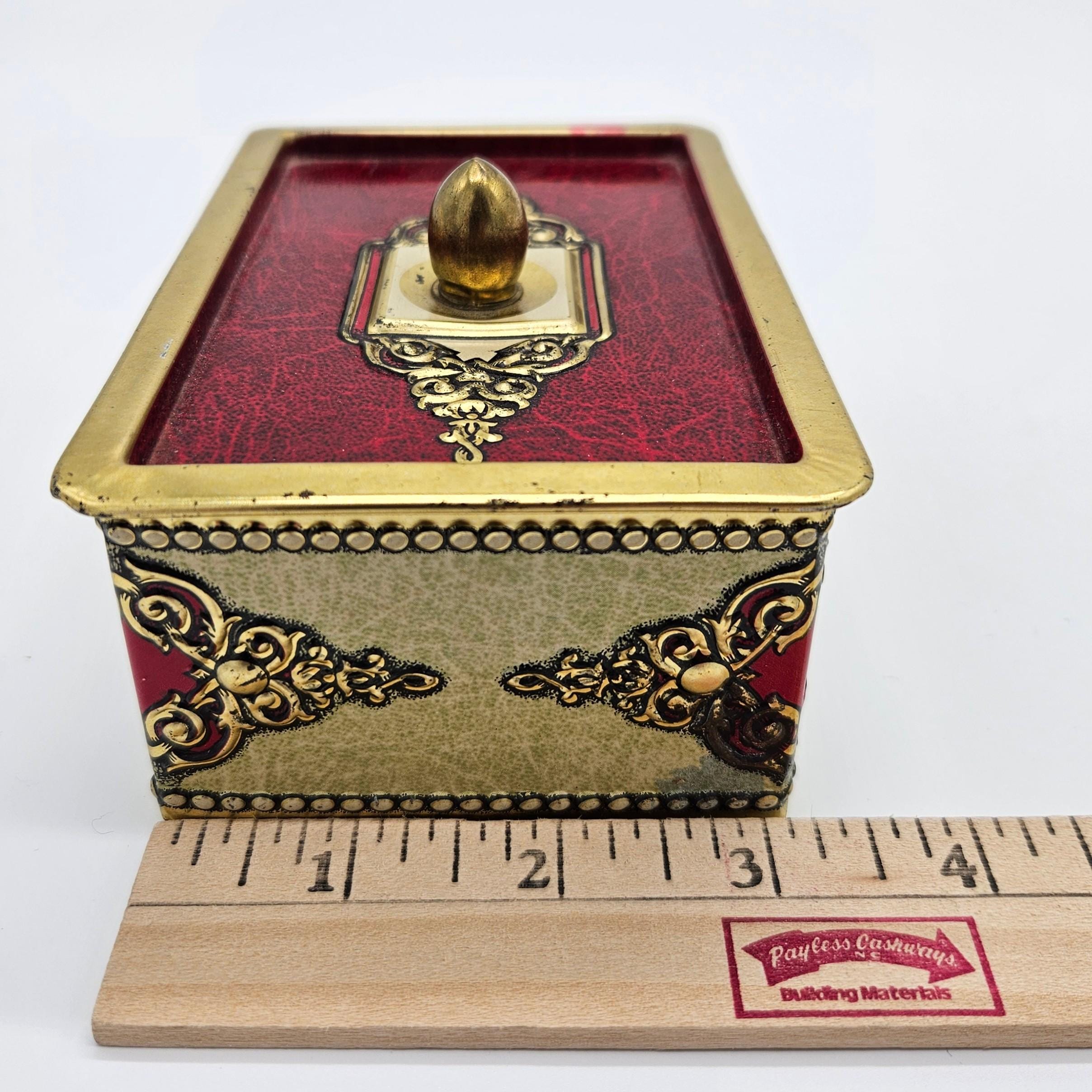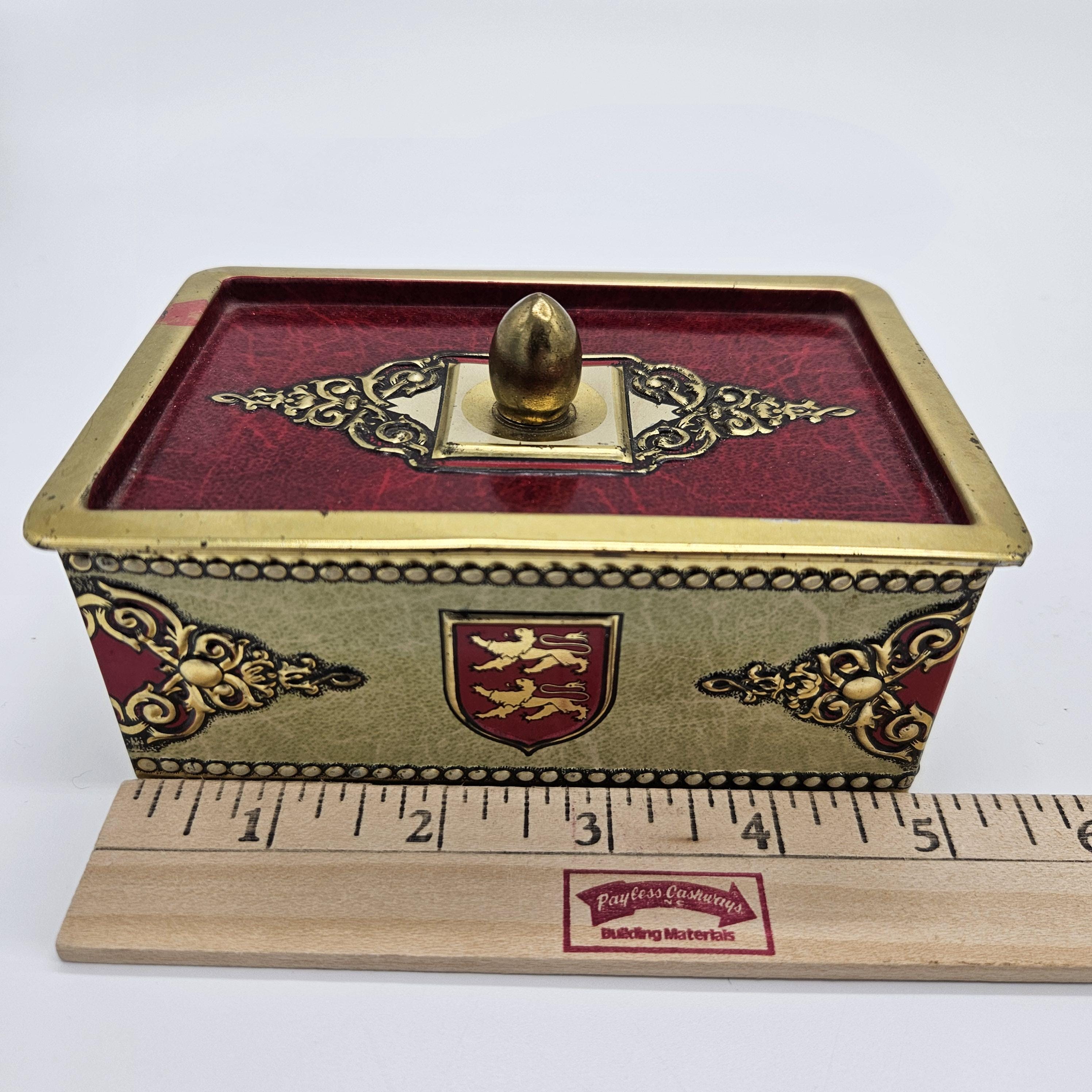 Good vintage condition. The lid fits securely. Light interior oxidation/patina from age and prior candy storage. Exterior graphics remain vibrant with minor edge wear and small marks consistent with use. Finial knob intact and secure.