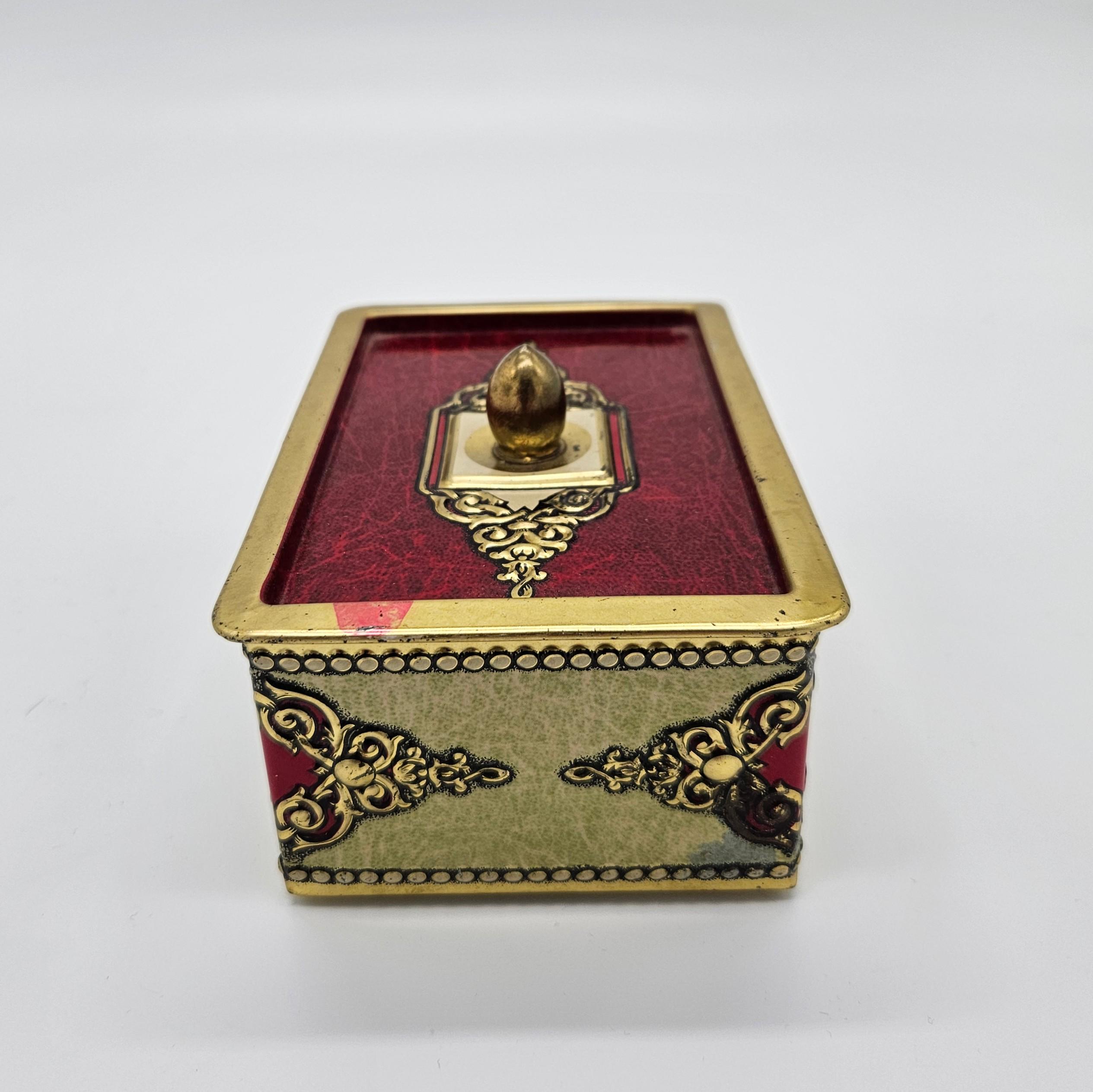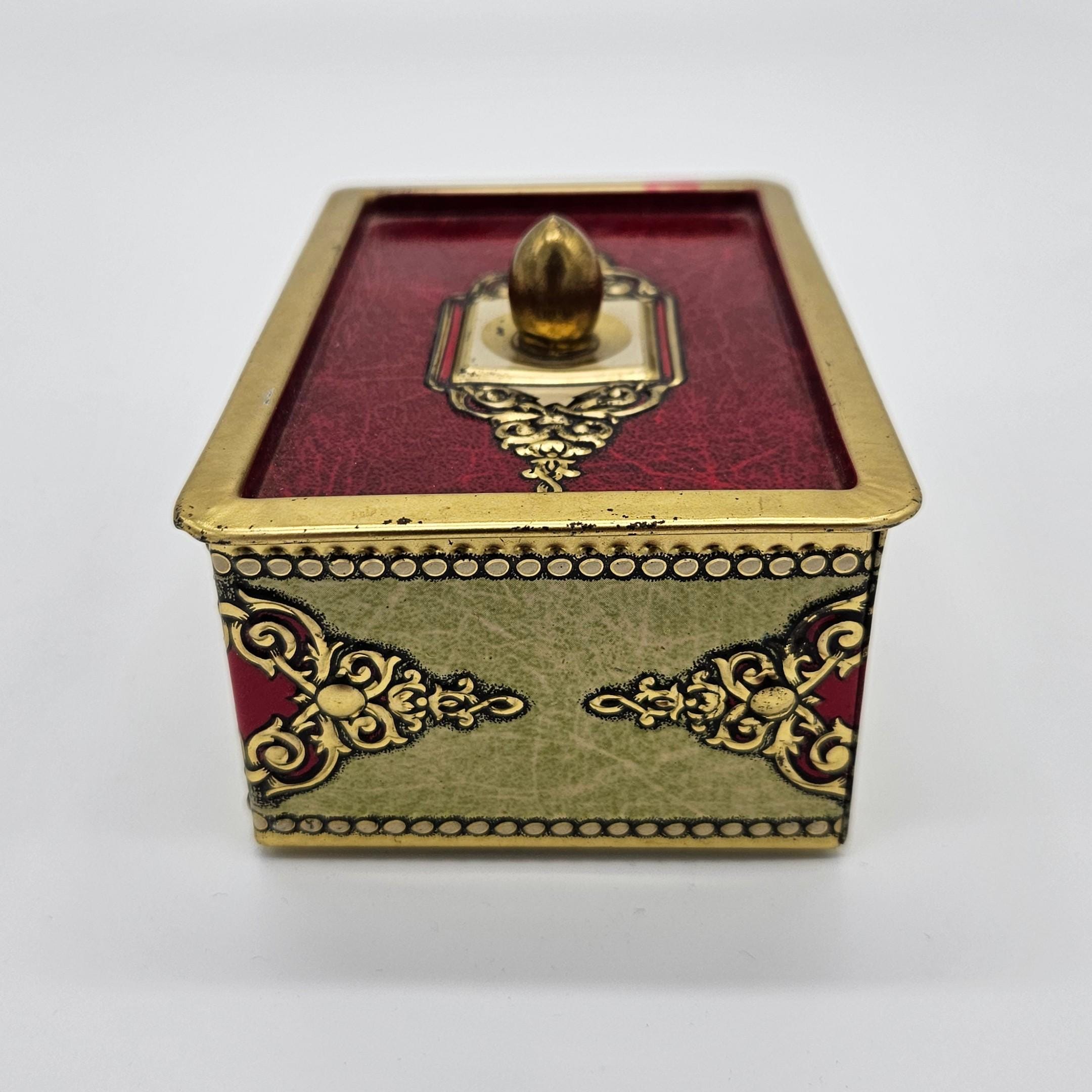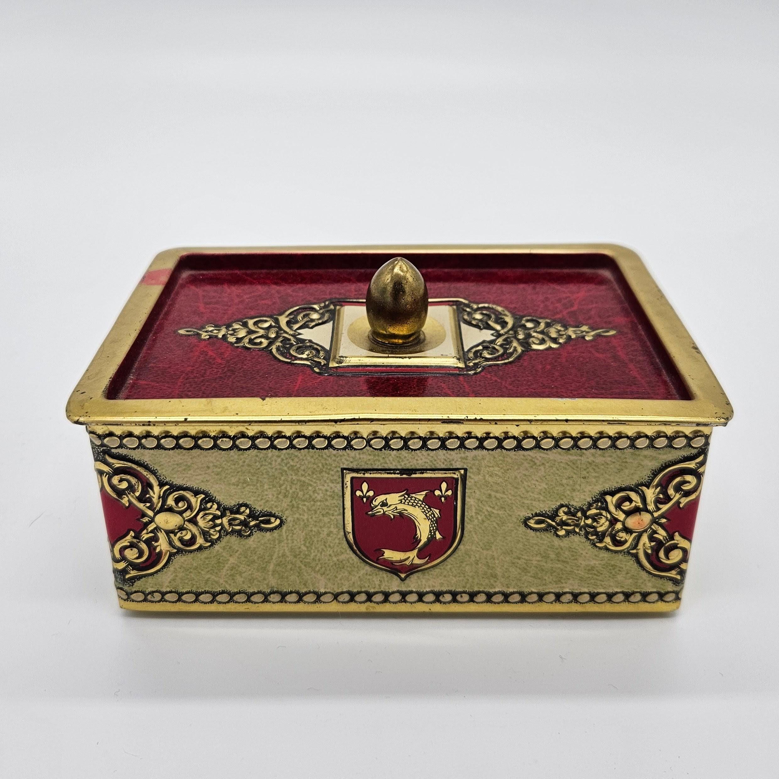 Good vintage condition. The lid fits securely. Light interior oxidation/patina from age and prior candy storage. Exterior graphics remain vibrant with minor edge wear and small marks consistent with use. Finial knob intact and secure.