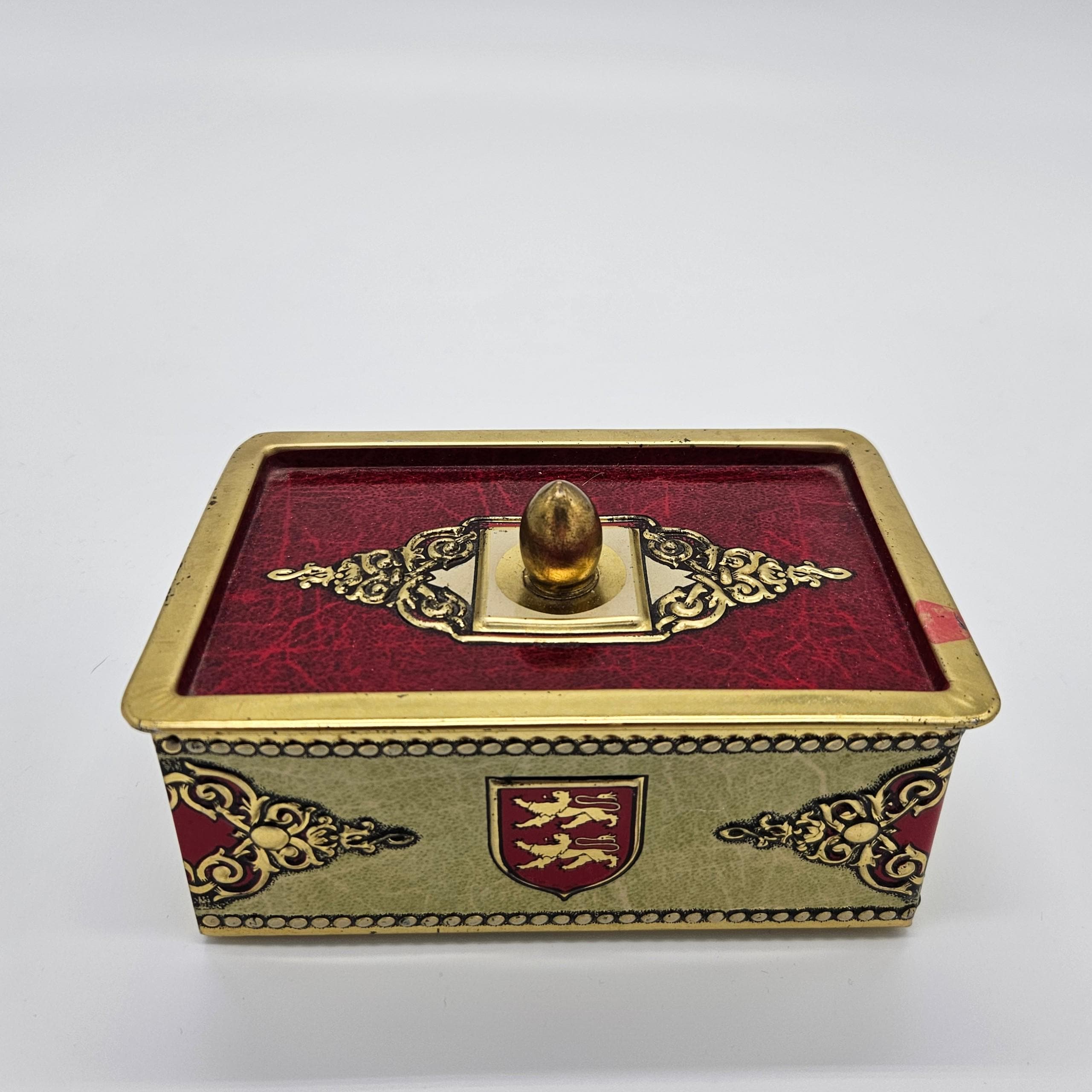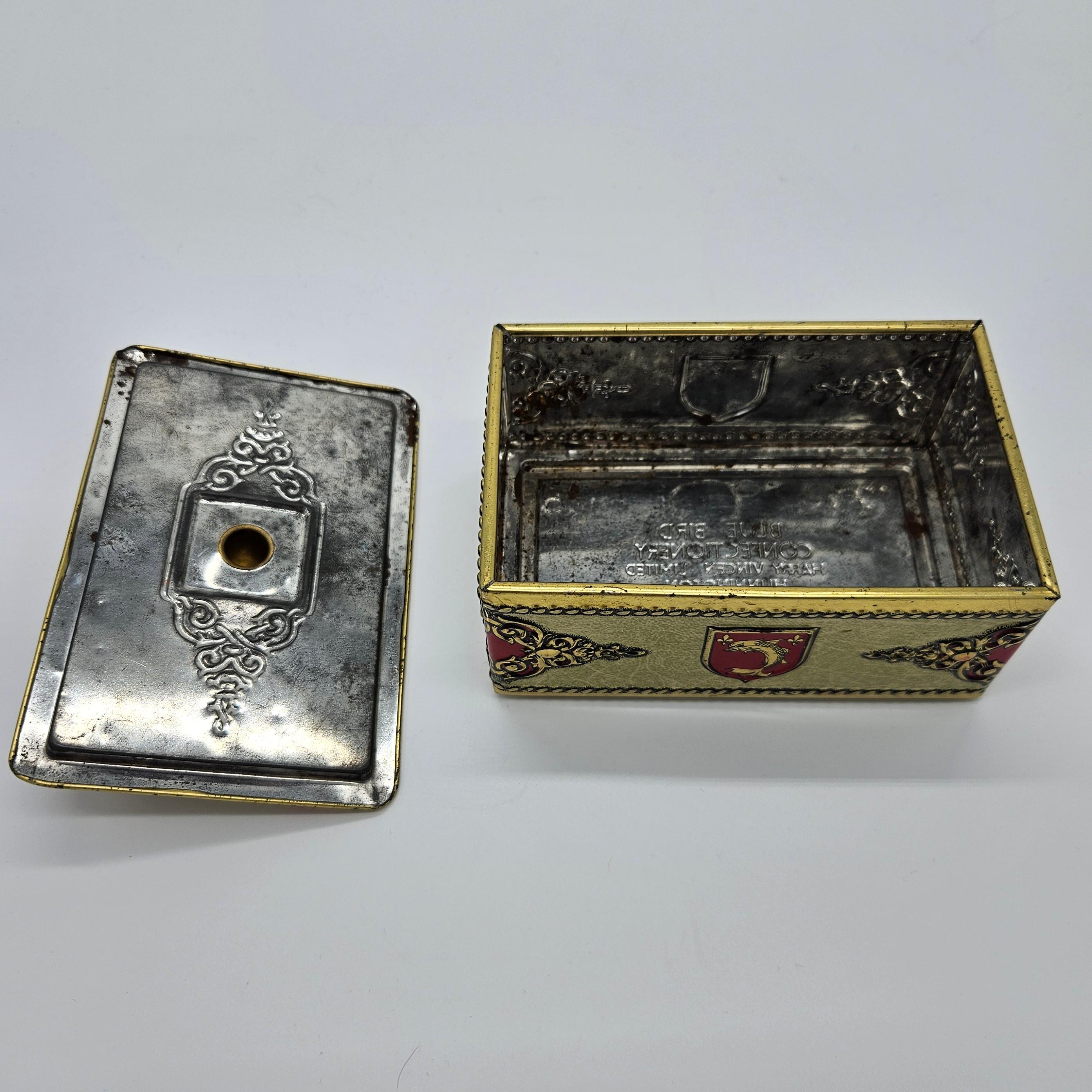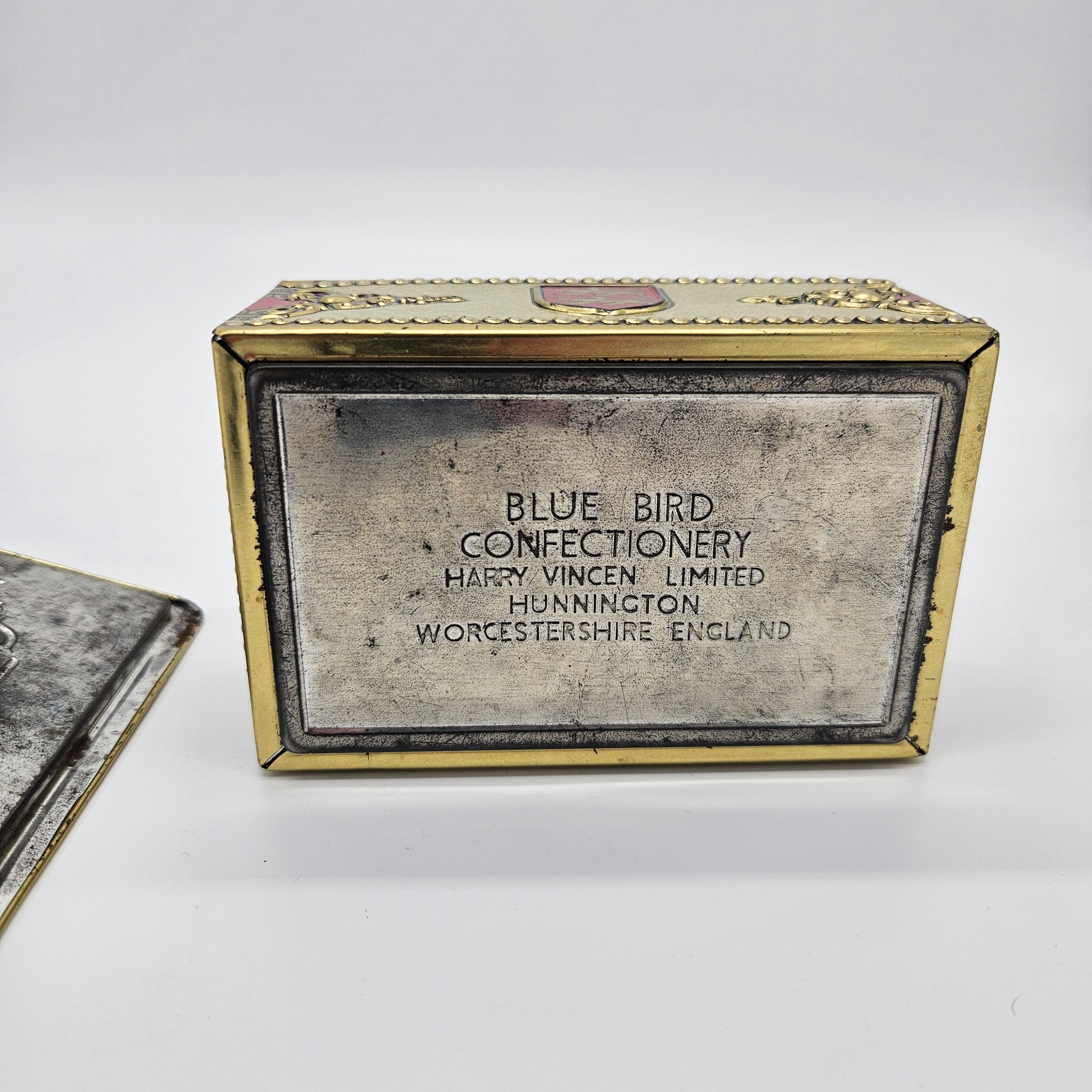 Detailed mid-century English confectionery tin from Blue Bird Confectionery (Harry Vincent Ltd, Worcestershire, England). These tins originally held butter toffee and were designed to be reused. The faux heraldic shields and gold detailing give it a classic English cottage feel. Perfect for tea bags, recipe cards, sewing supplies, or simply displayed on a kitchen shelf.