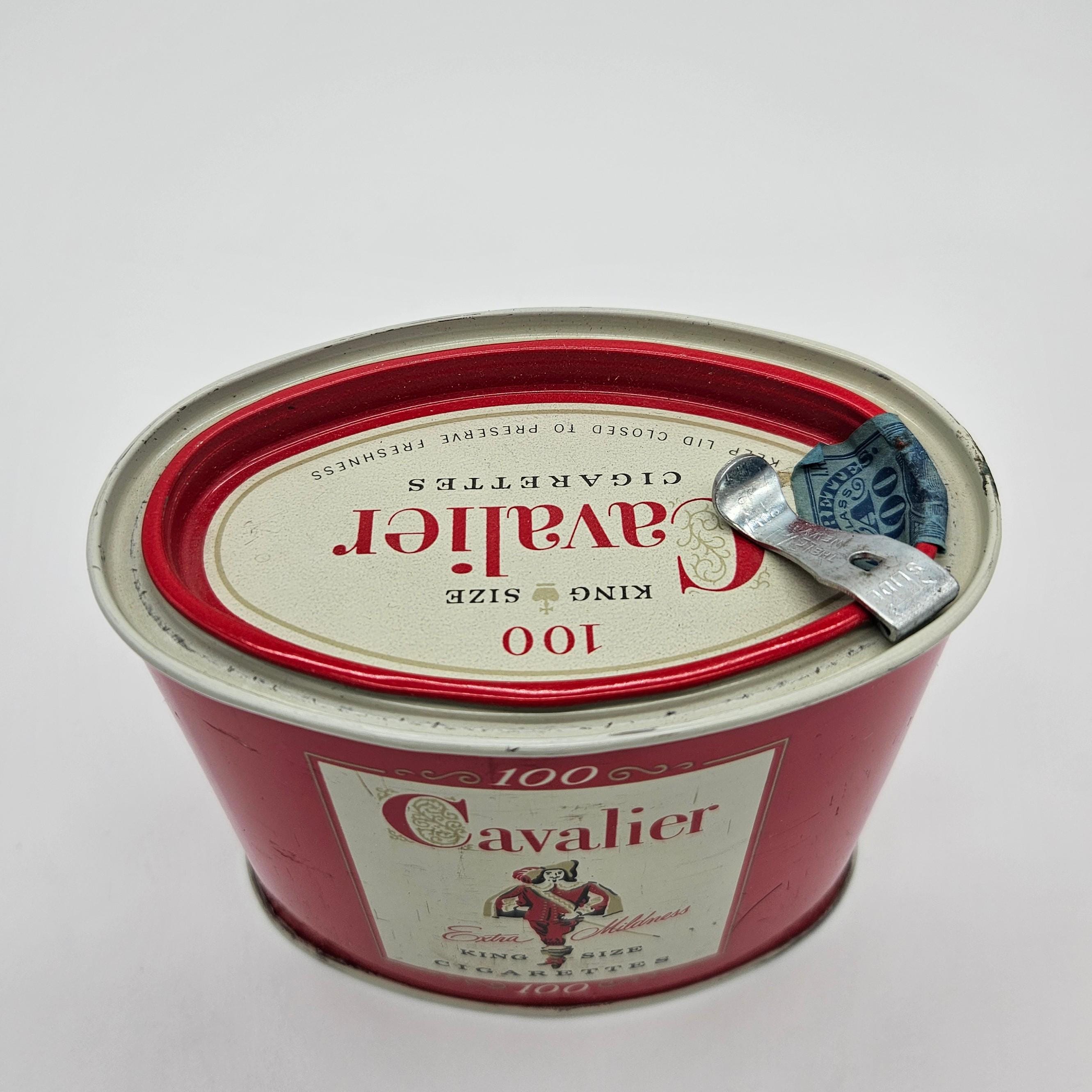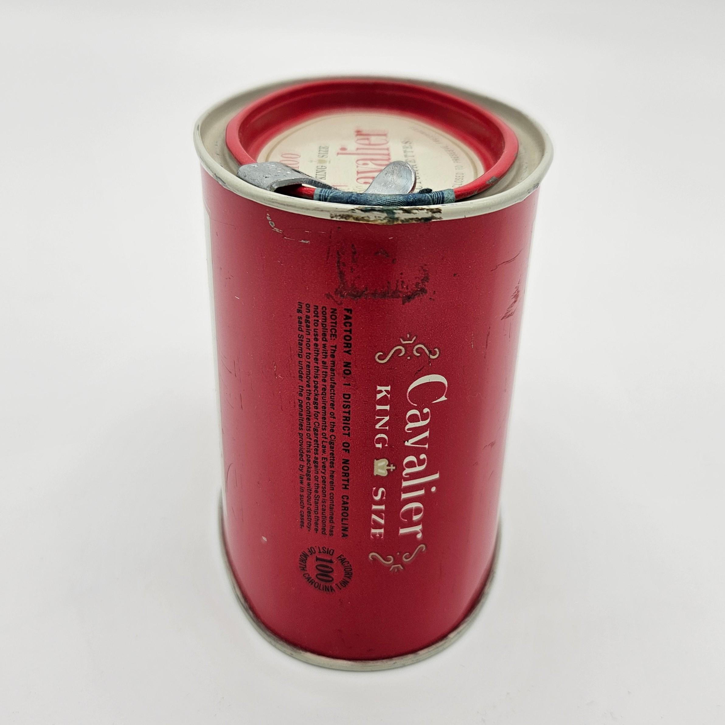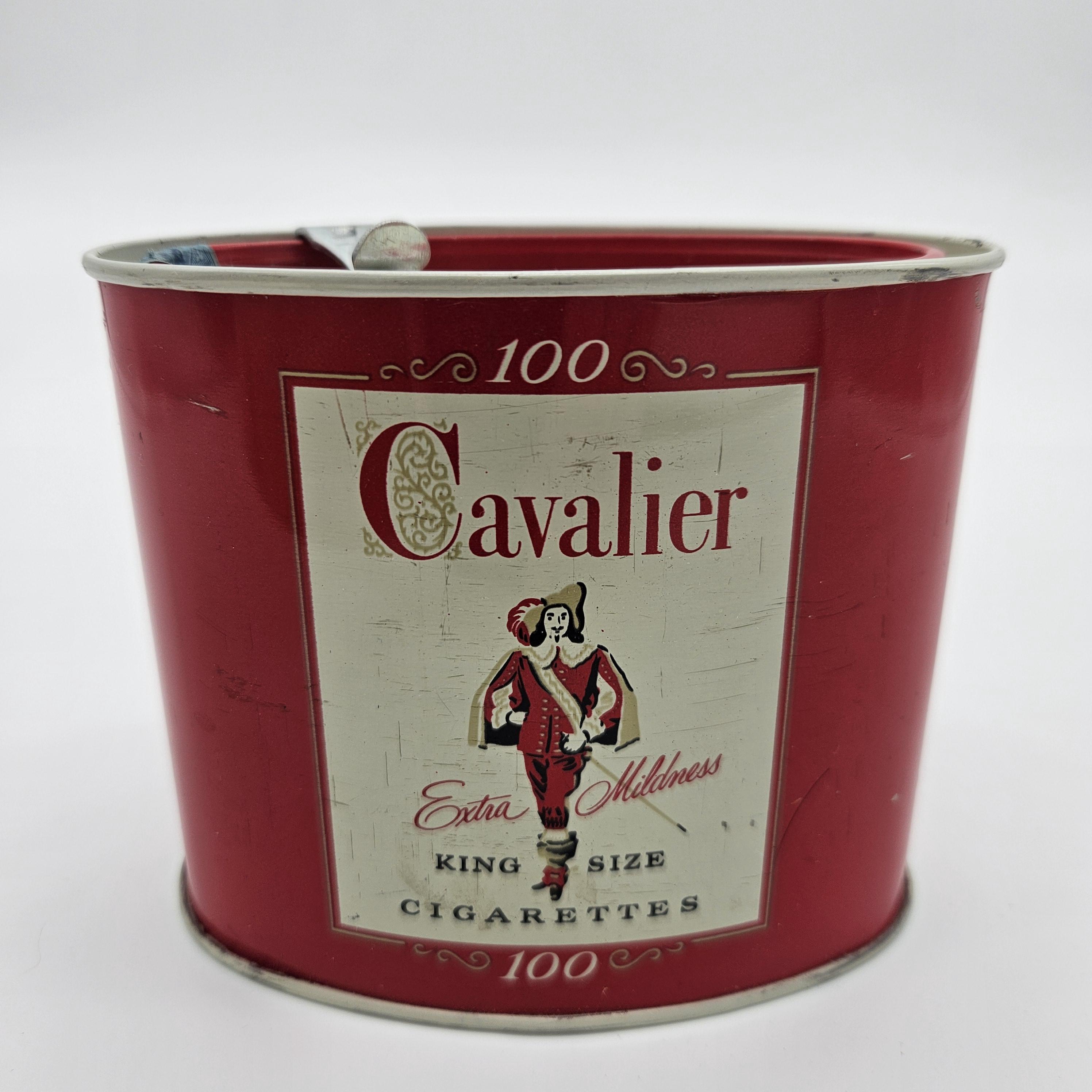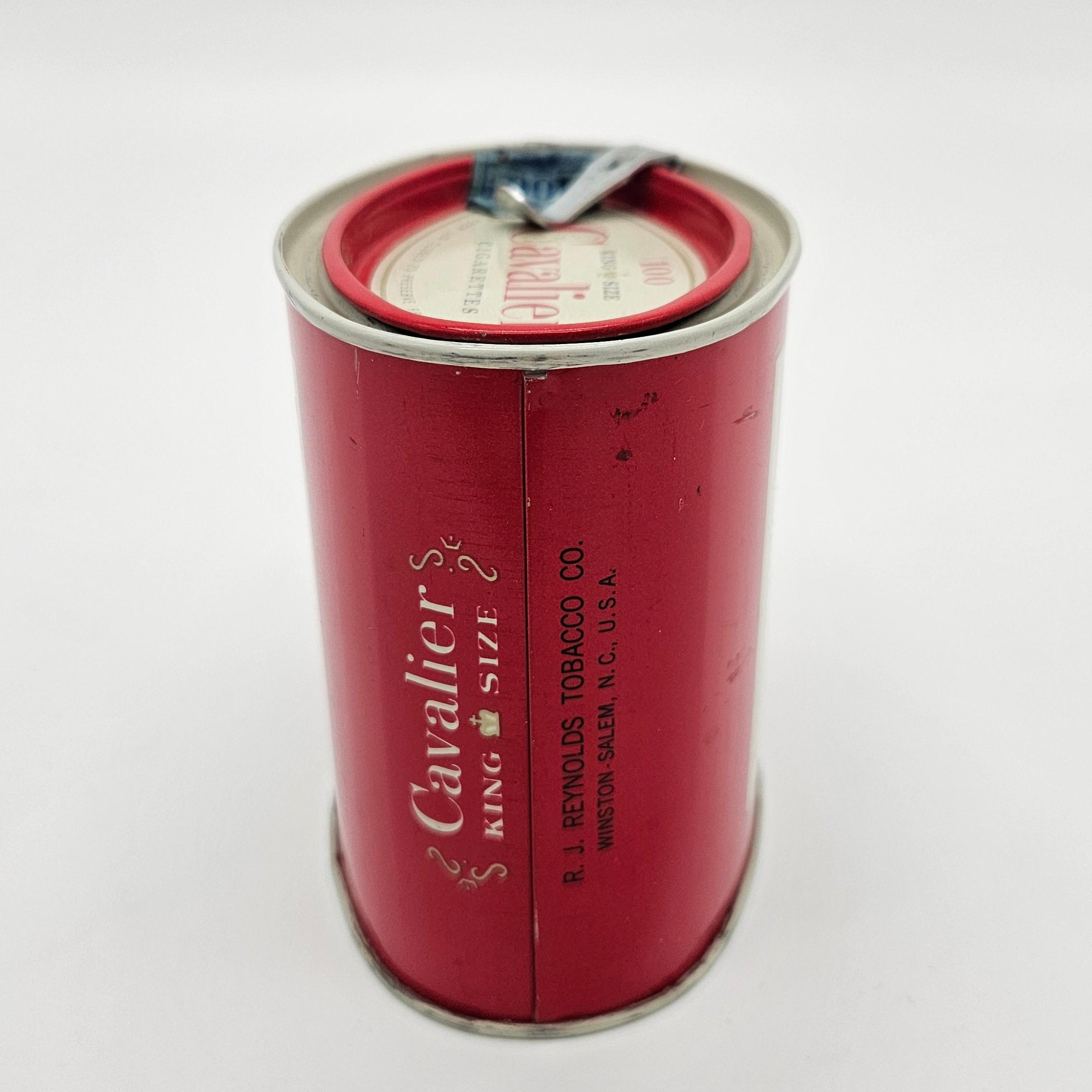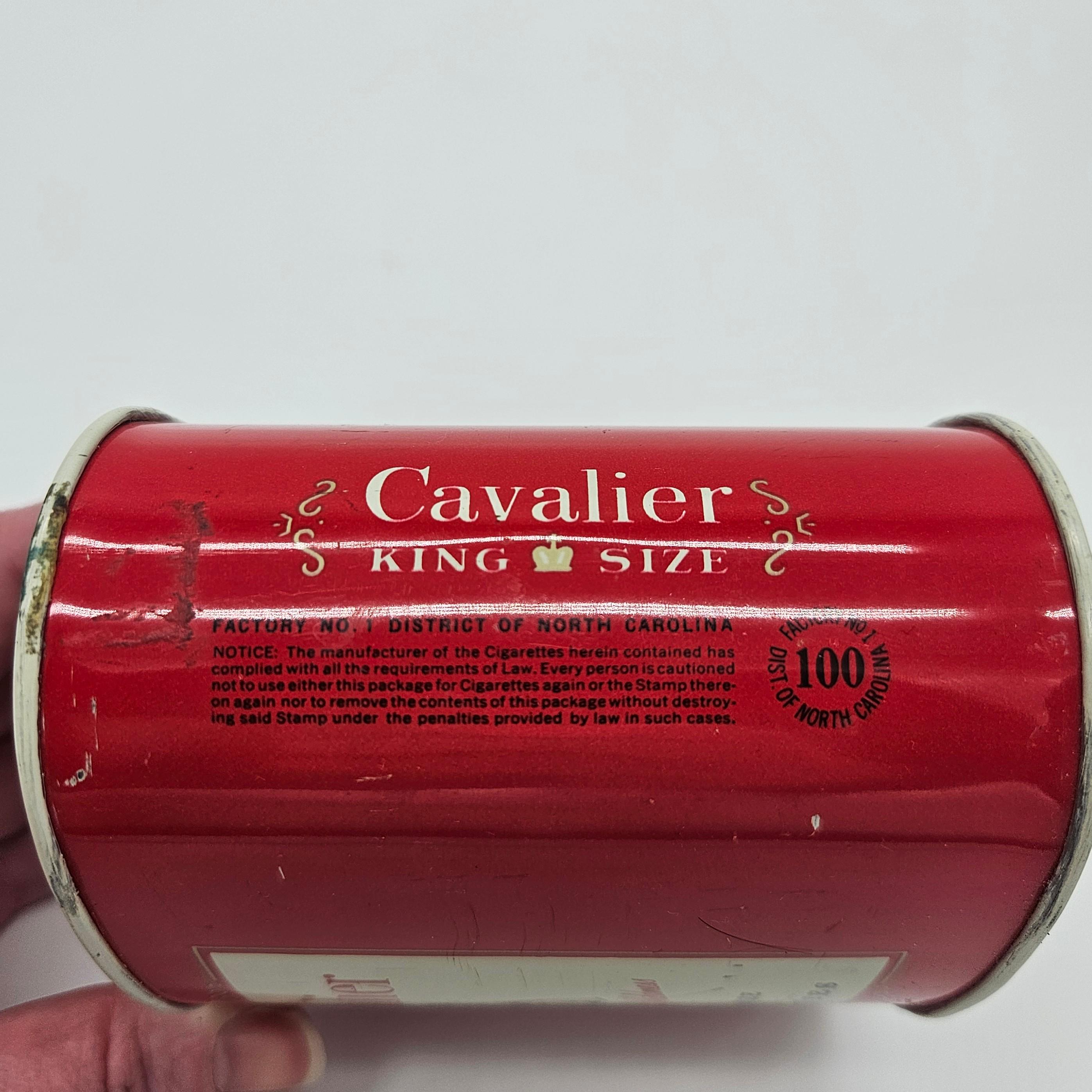Vintage red Cavalier King Size cigarette counter canister made by R.J. Reynolds Tobacco Co., Winston-Salem, North Carolina. These larger tins were used behind shop counters to hold multiple cigarette packs and help keep them fresh. Works well for storage: tea bags, coffee pods, cocktail tools, or small supplies.