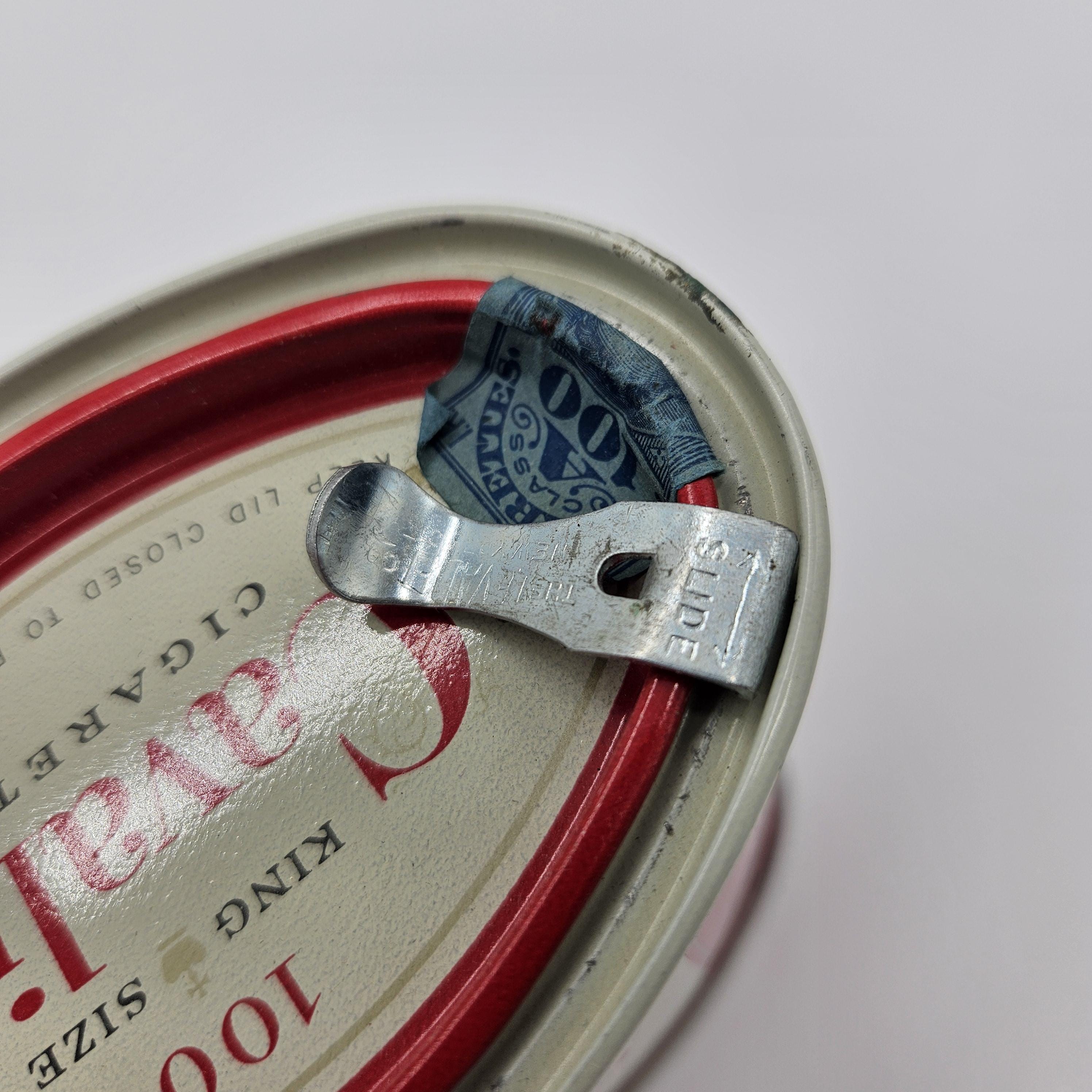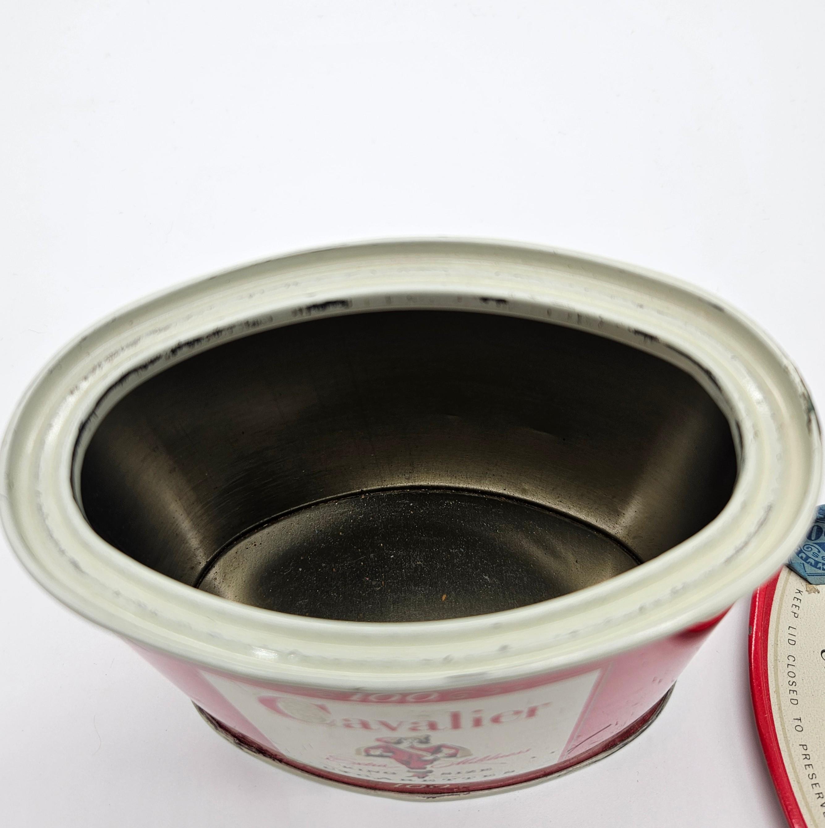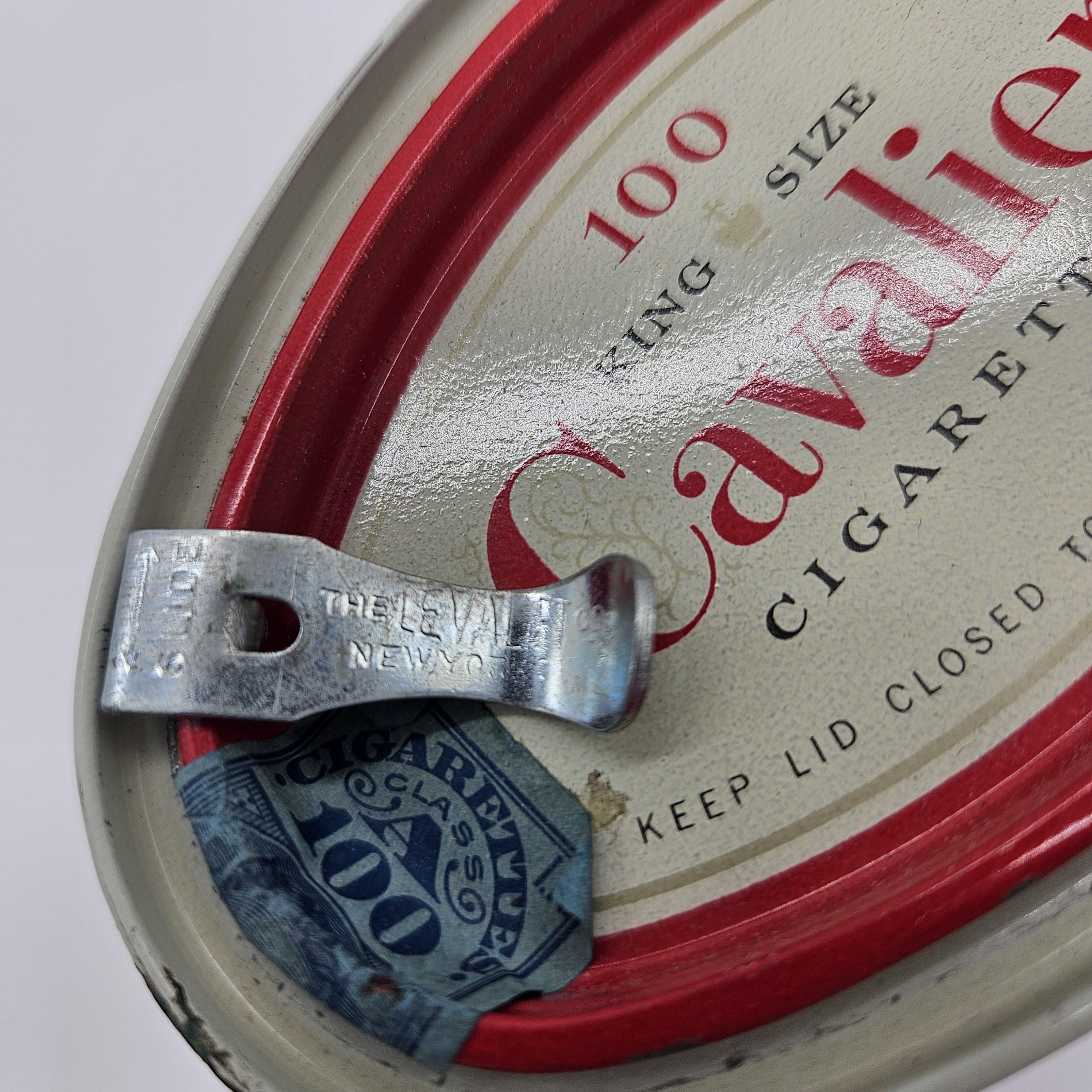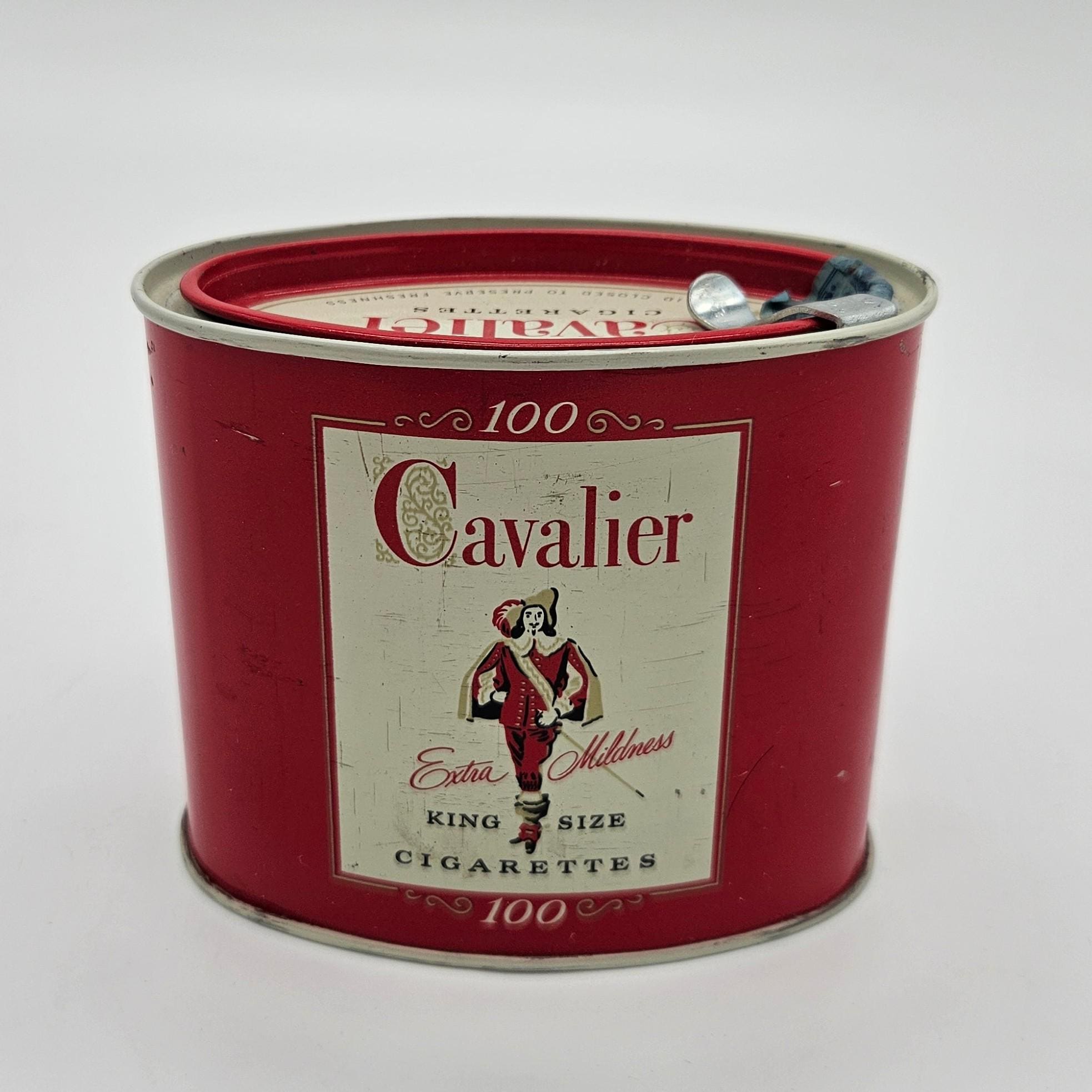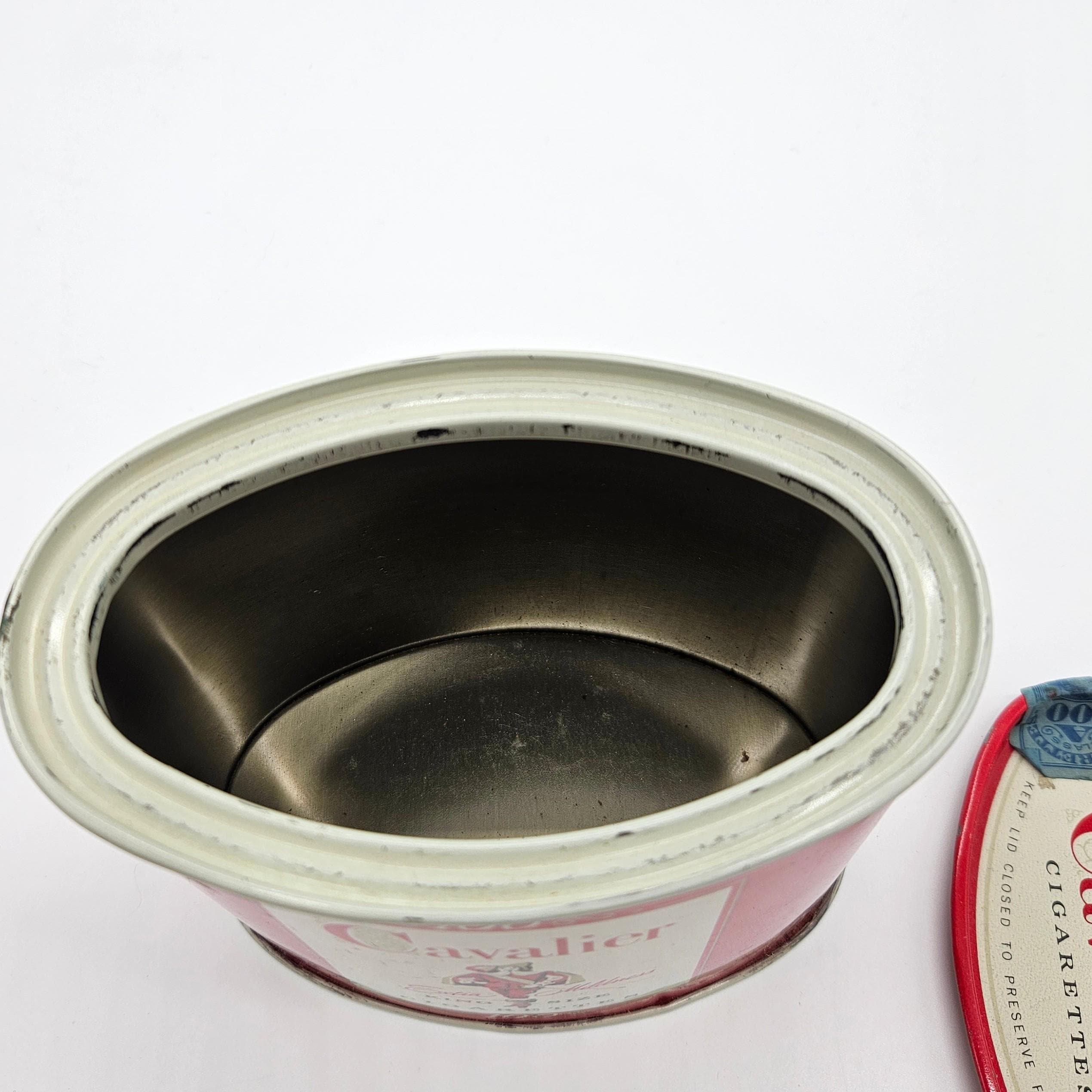 Vintage red Cavalier King Size cigarette counter canister made by R.J. Reynolds Tobacco Co., Winston-Salem, North Carolina. These larger tins were used behind shop counters to hold multiple cigarette packs and help keep them fresh. Works well for storage: tea bags, coffee pods, cocktail tools, or small supplies.