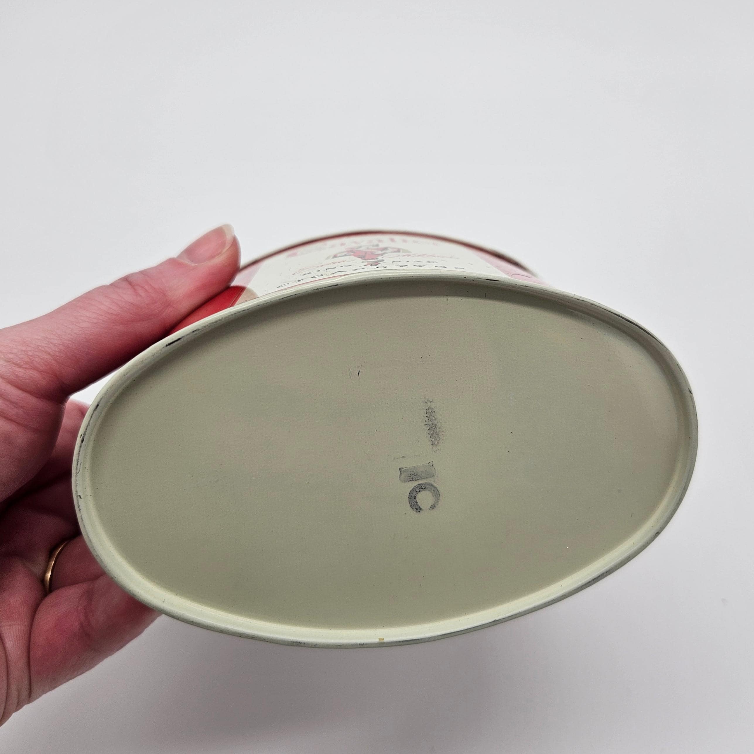 4" high, 4.5" long. Good vintage condition. Original lid and inner freshness insert present. Surface scratches, scuffs, and light discoloration consistent with age and use. Color remains strong and displays well. No major rust or holes. Clean interior and fully usable for storage.