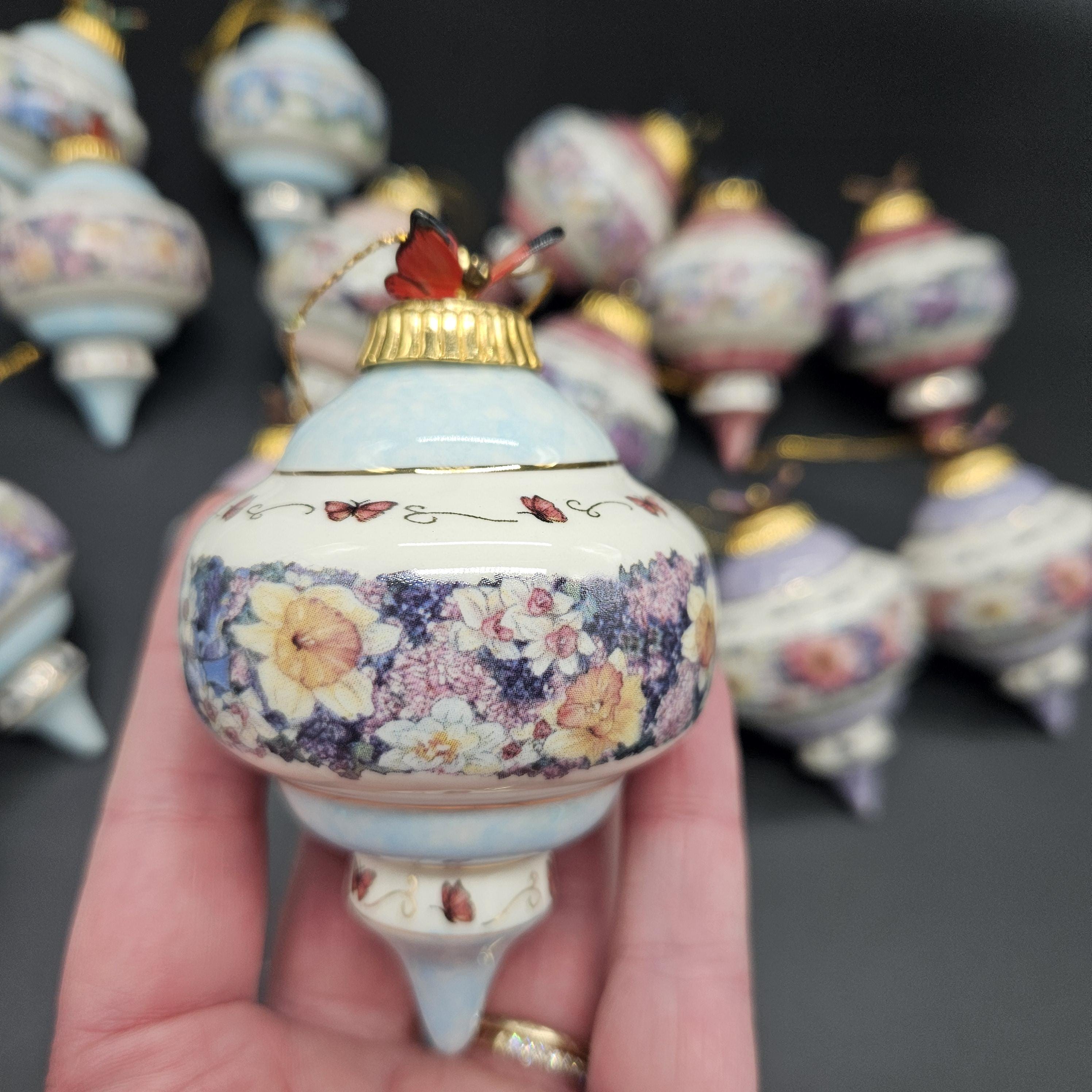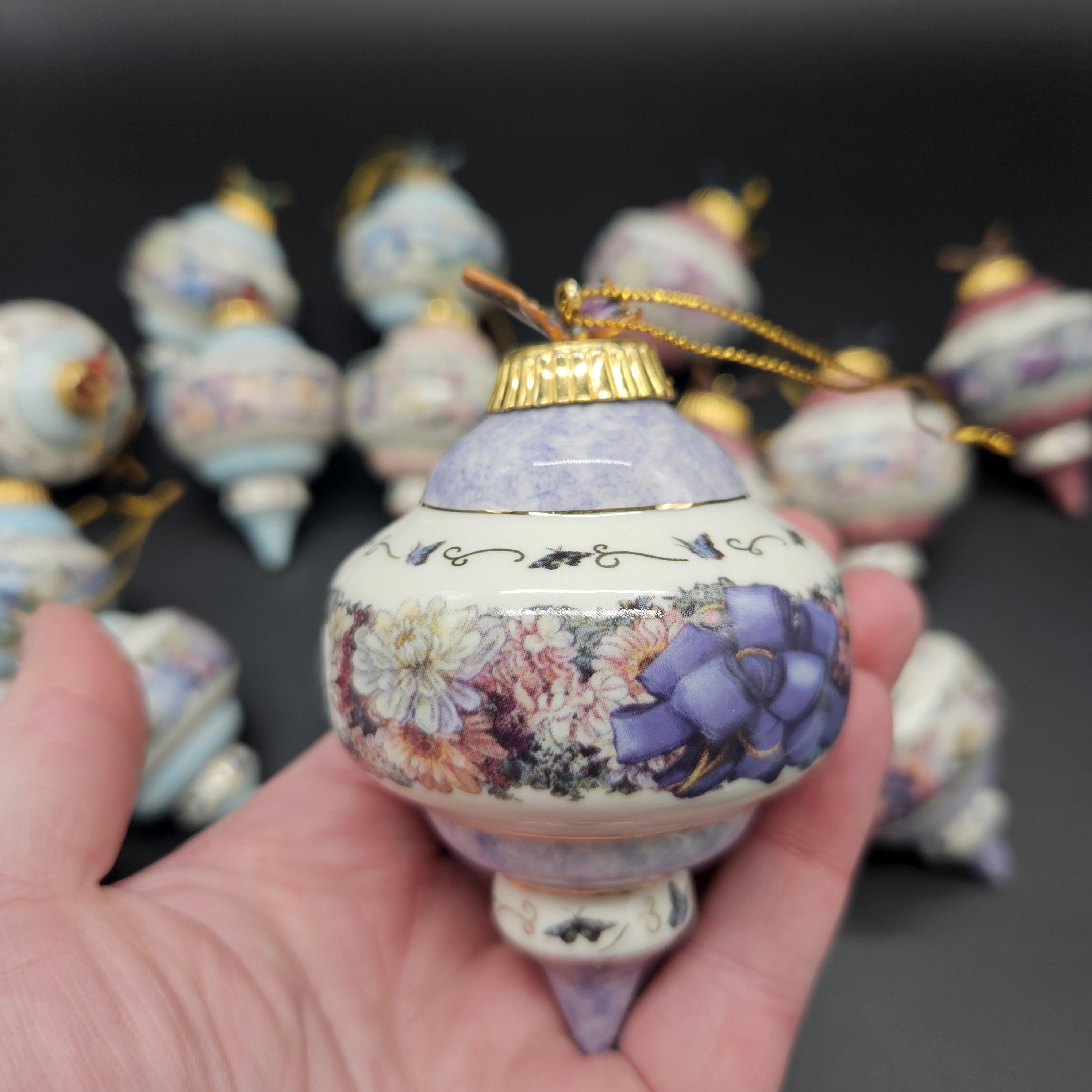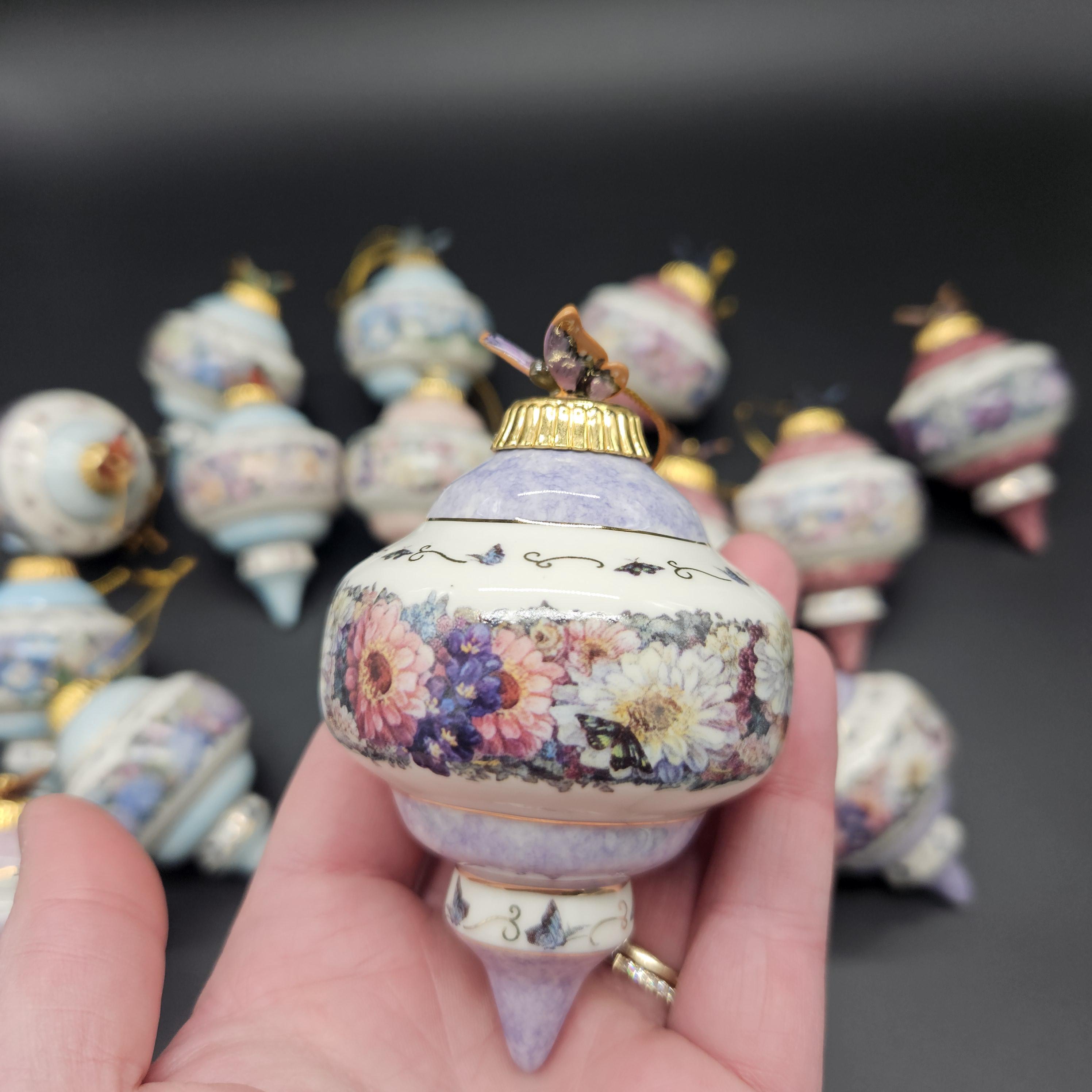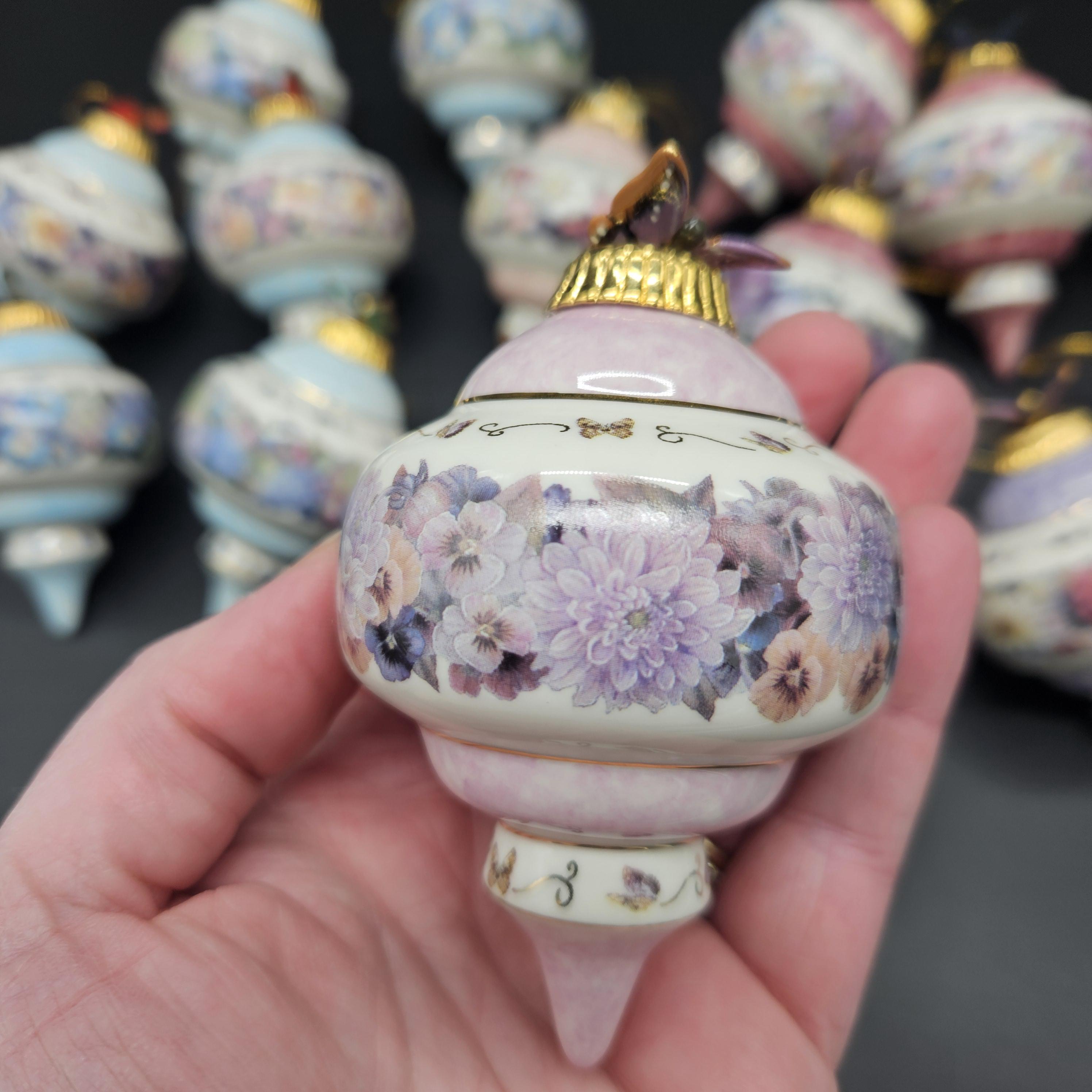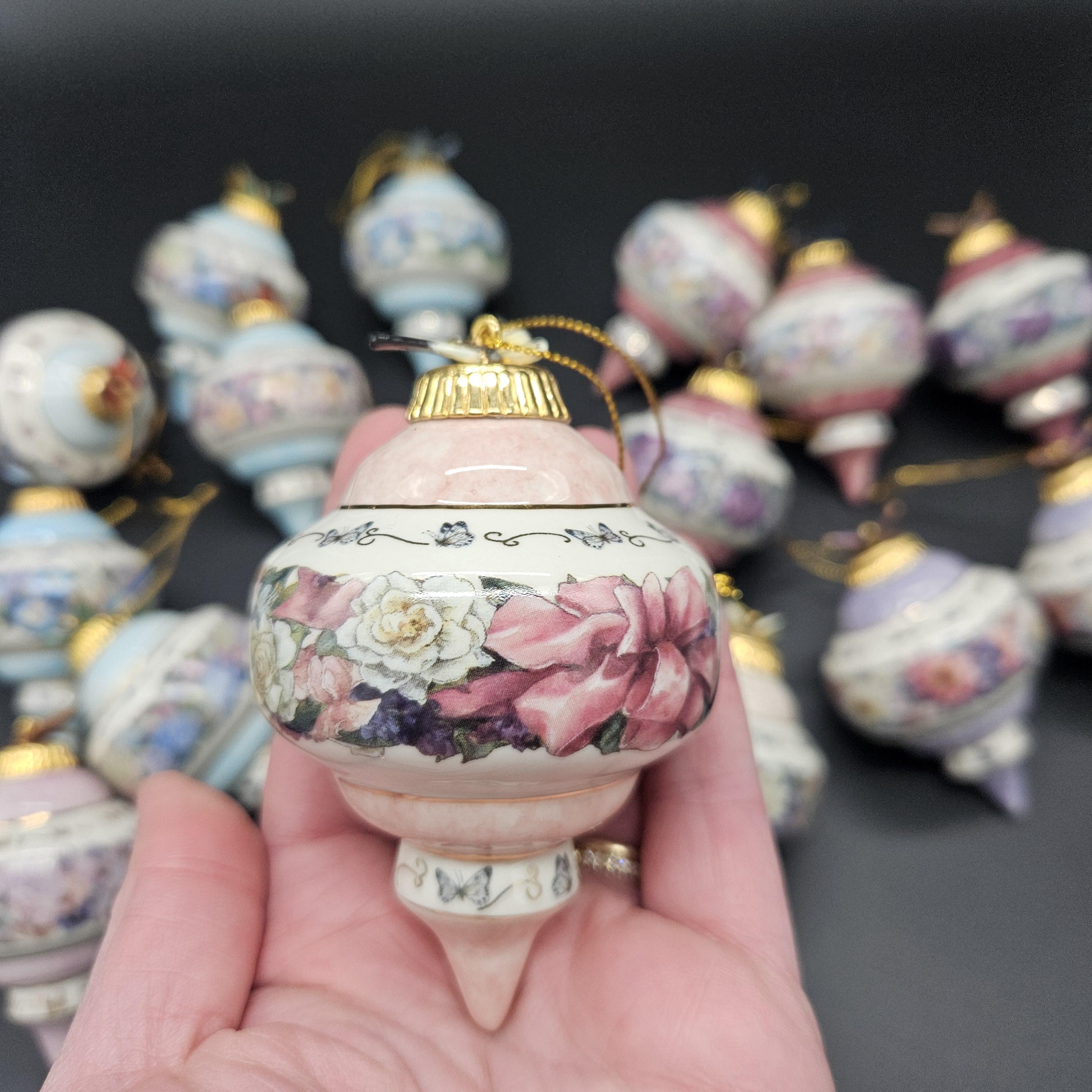 A full set of sixteen porcelain Christmas ornaments from the Lena Liu Floral Inspirations collection by Bradford Editions. These feature the classic spun-top silhouette with soft pastel color blocking and delicate floral artwork wrapping each piece.