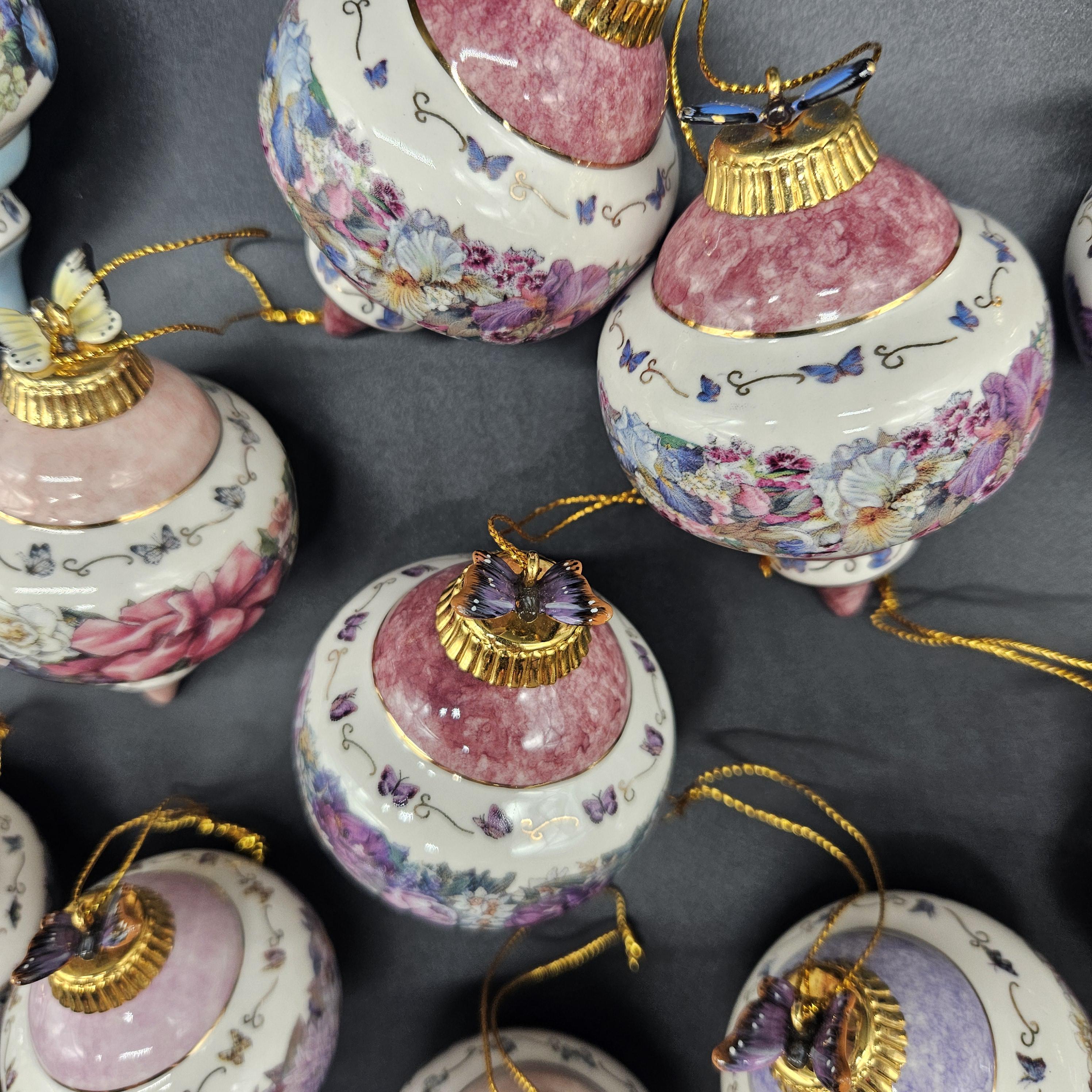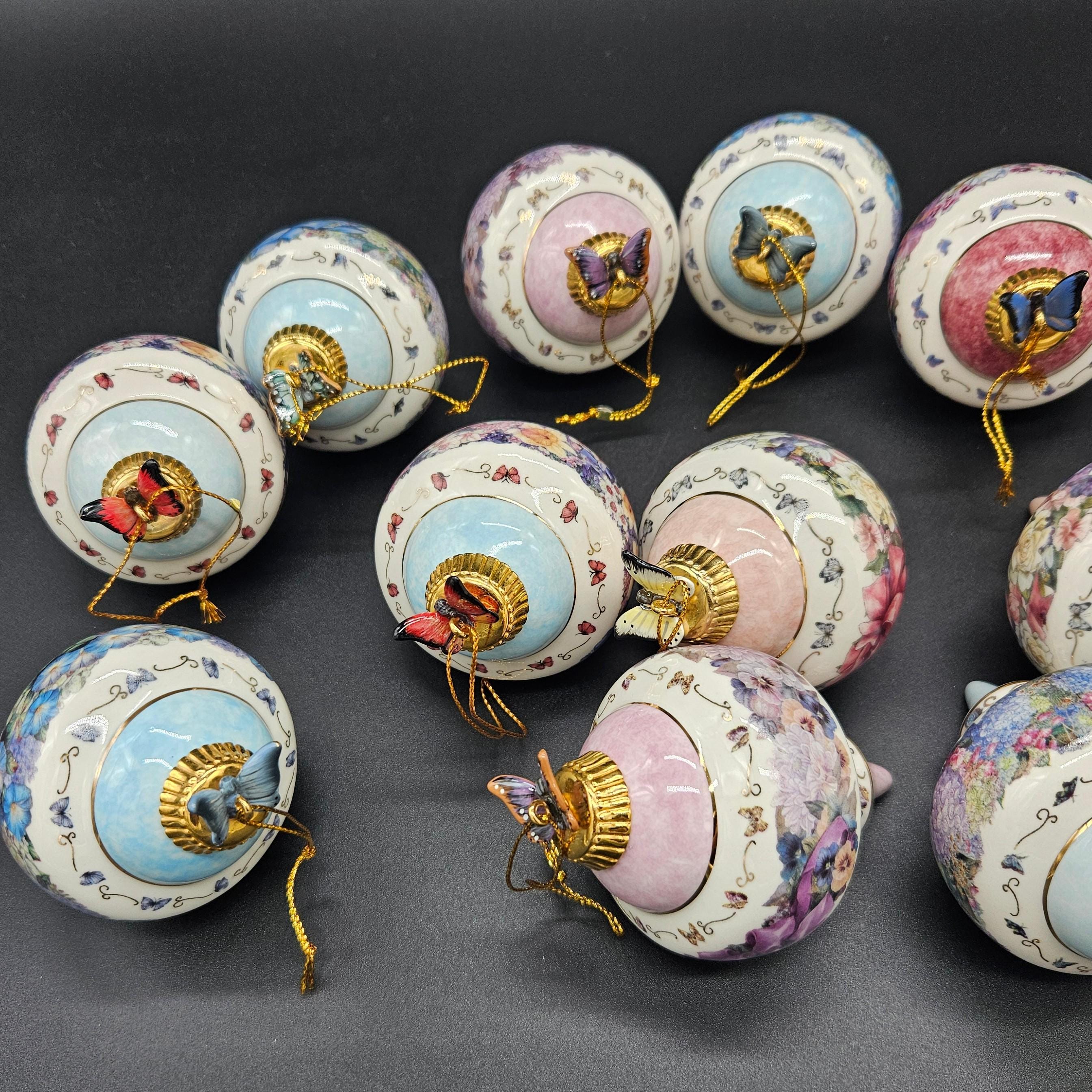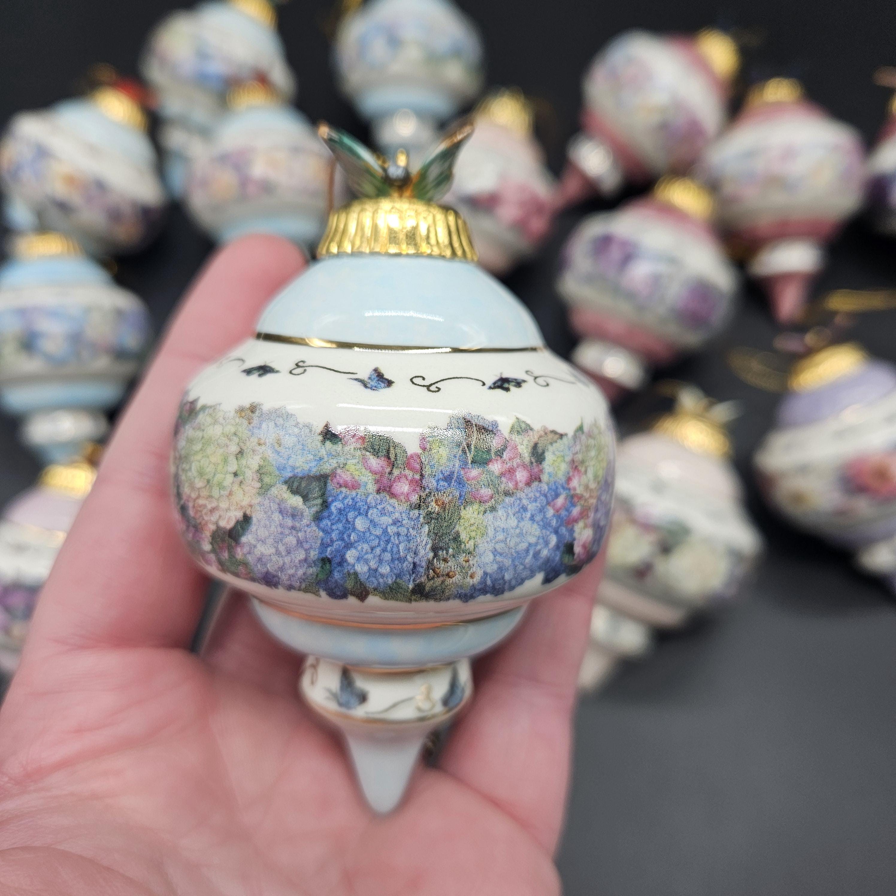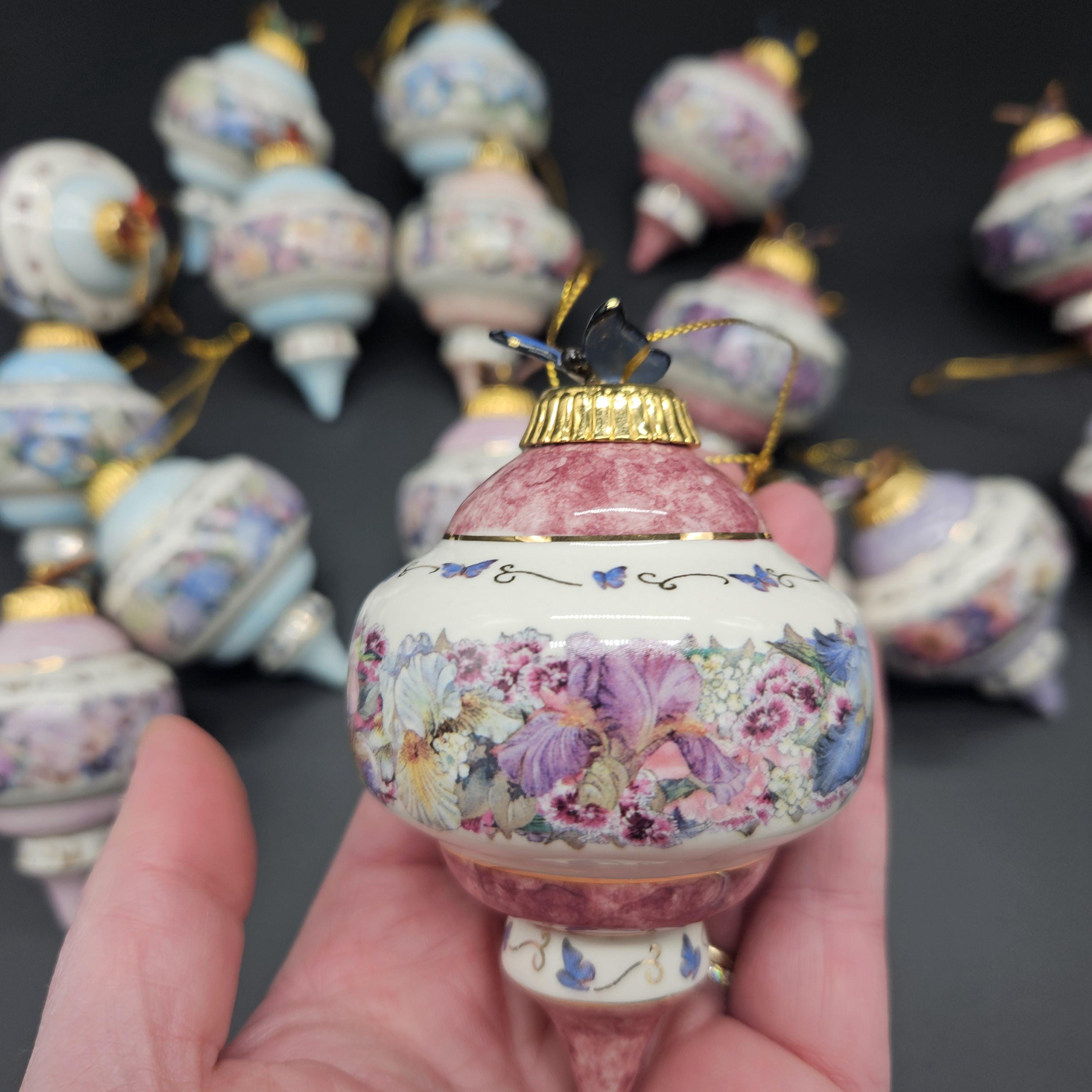 A full set of sixteen porcelain Christmas ornaments from the Lena Liu Floral Inspirations collection by Bradford Editions. These feature the classic spun-top silhouette with soft pastel color blocking and delicate floral artwork wrapping each piece.