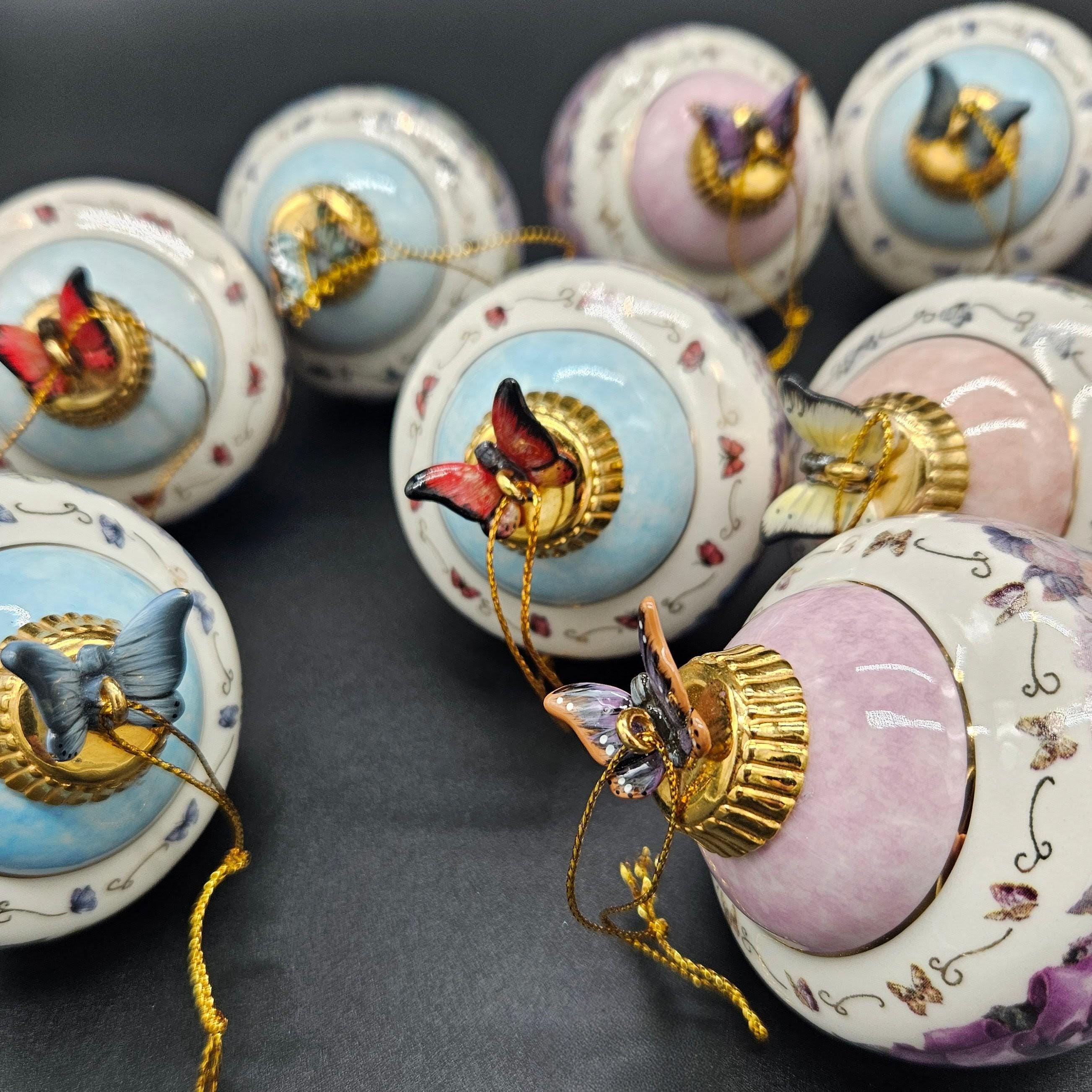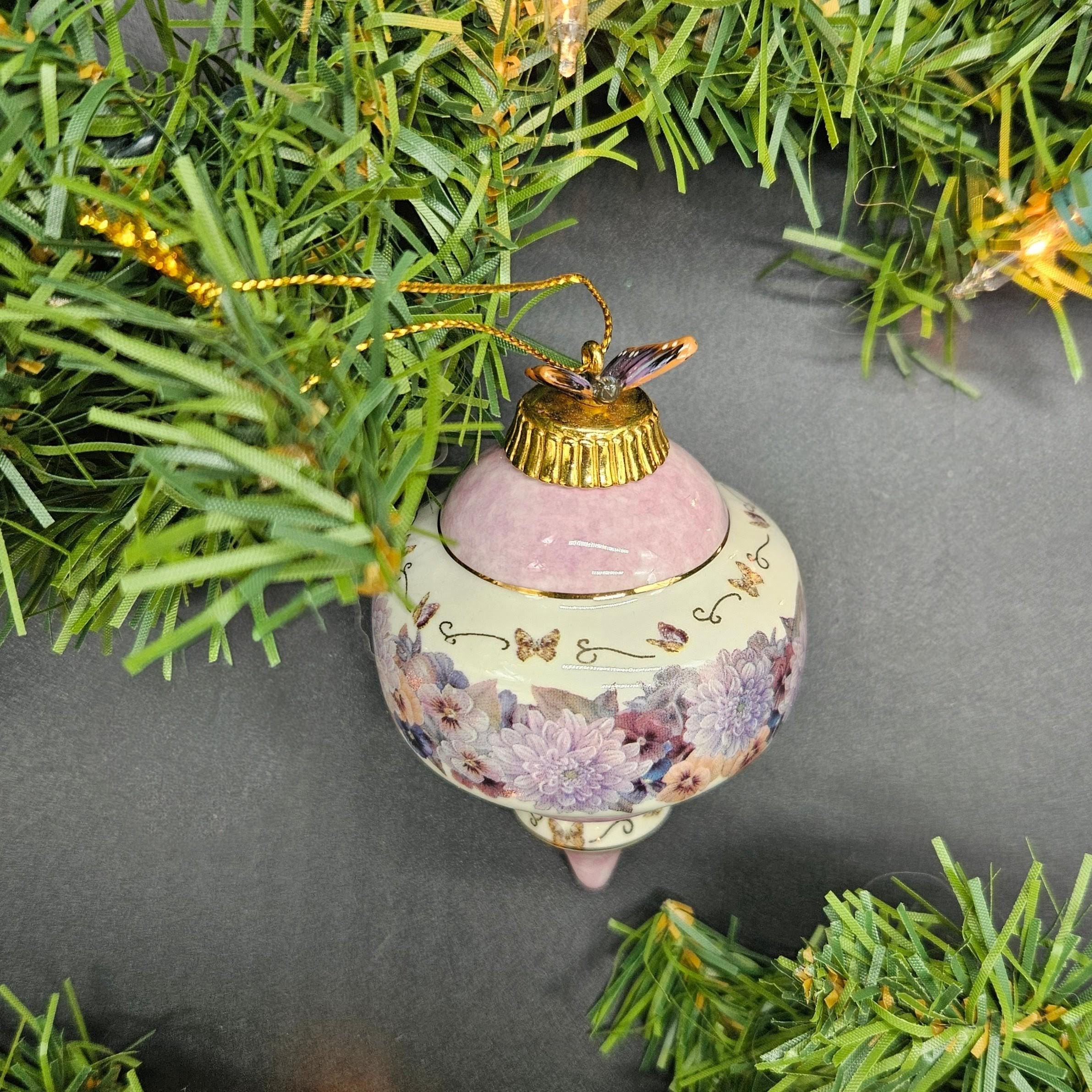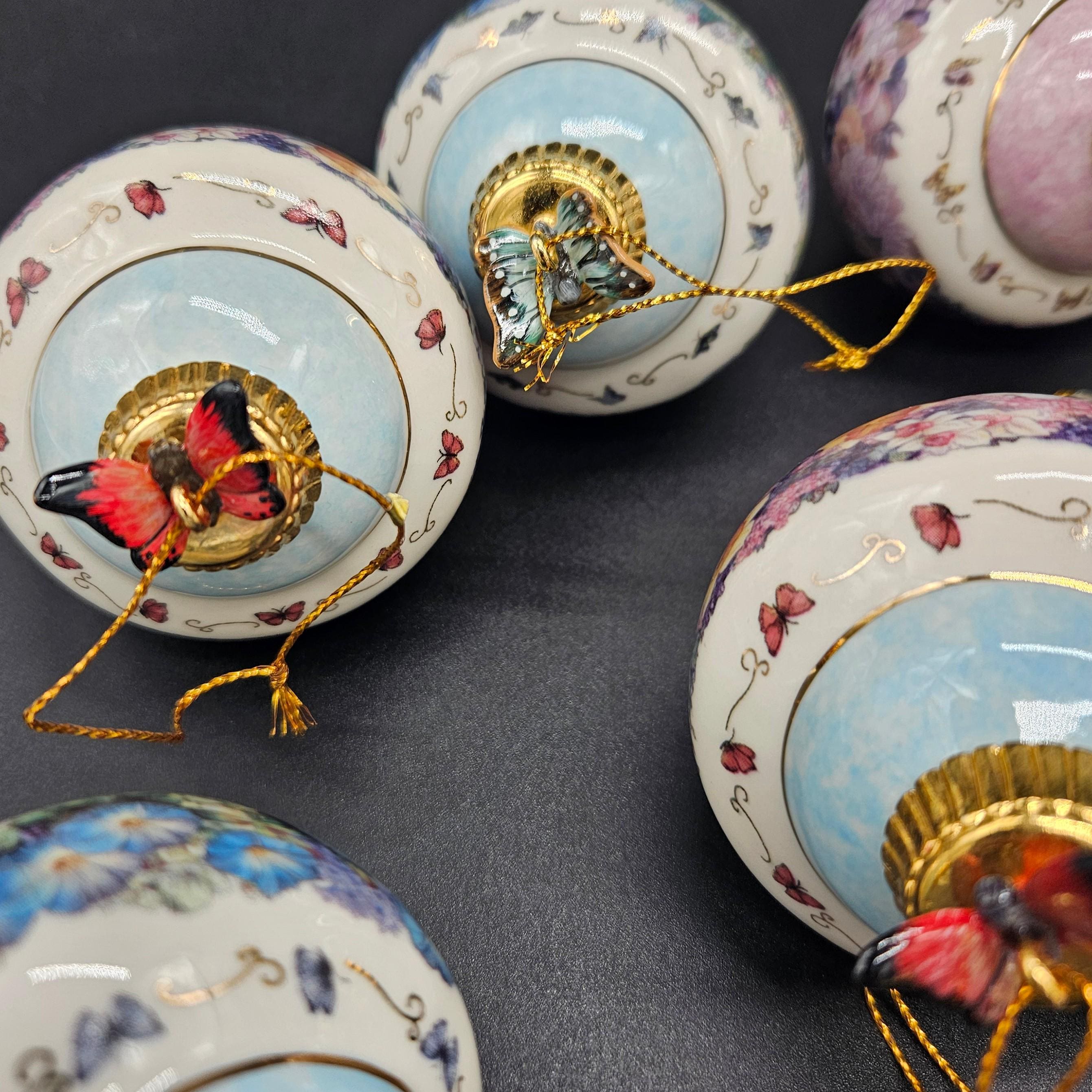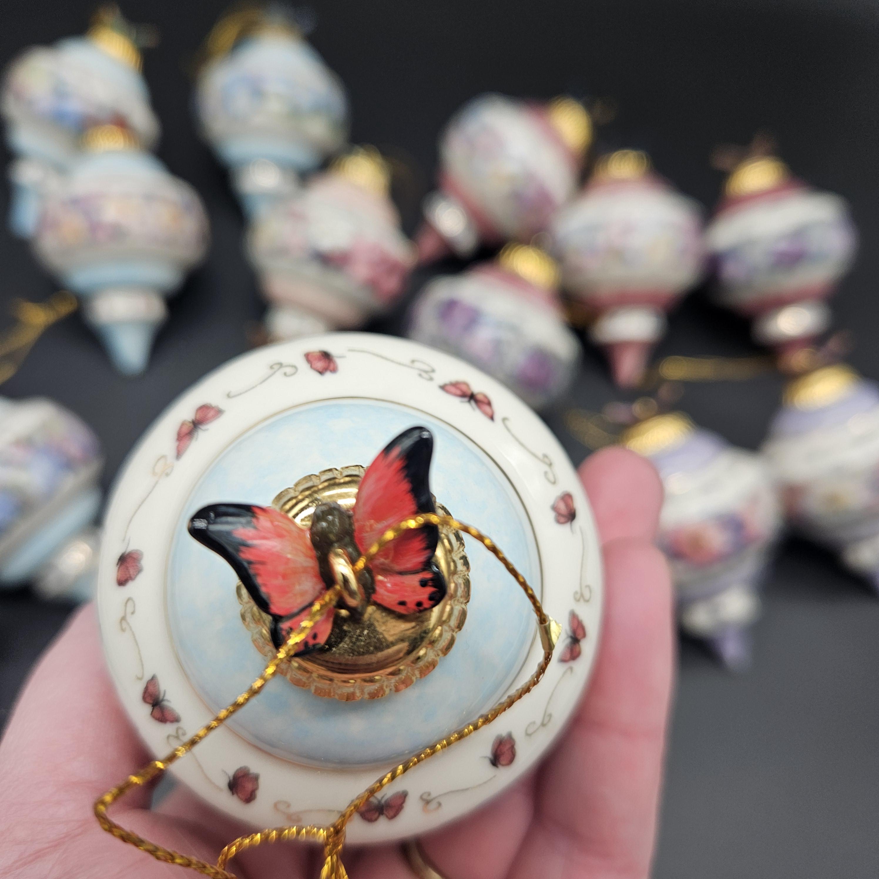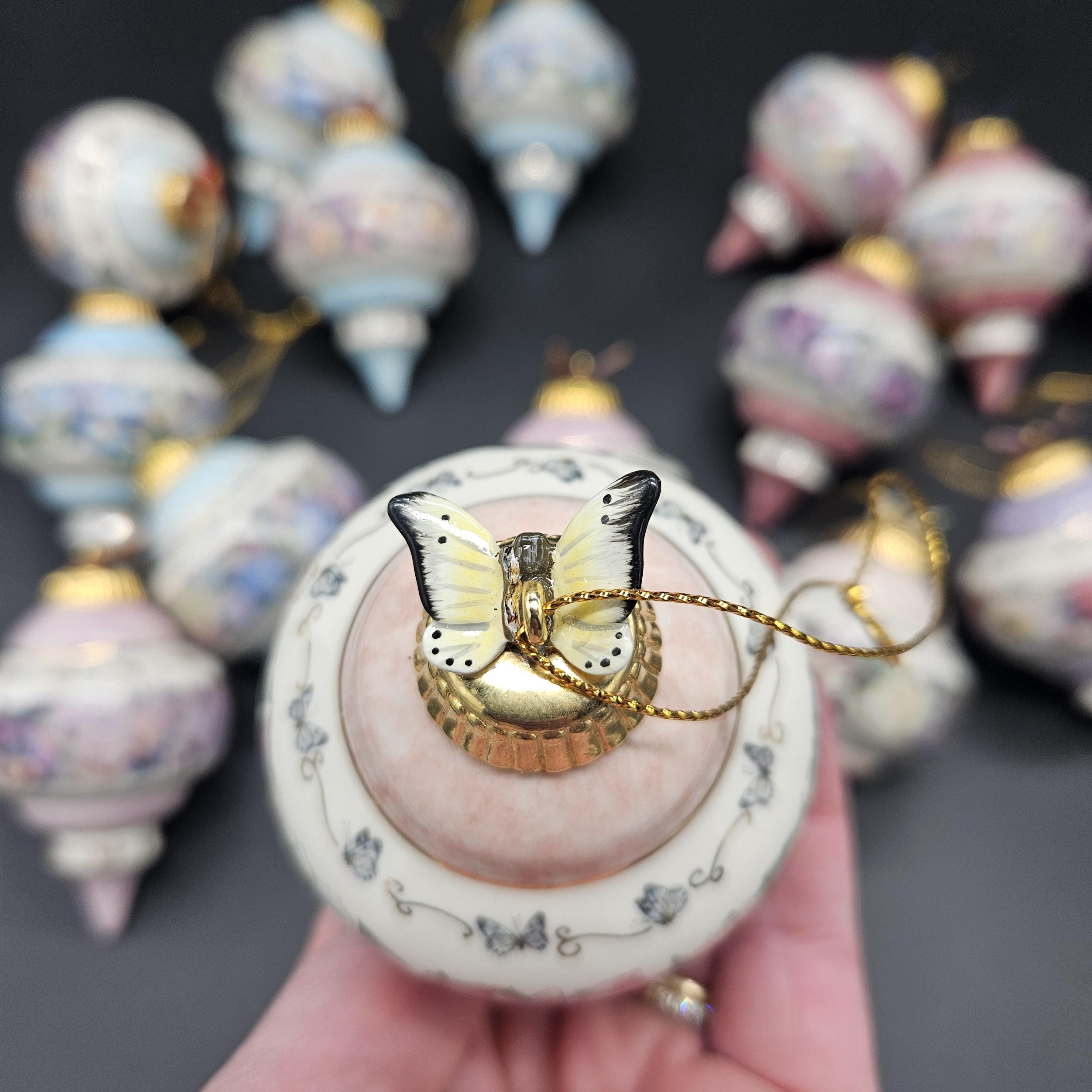 A full set of sixteen porcelain Christmas ornaments from the Lena Liu Floral Inspirations collection by Bradford Editions. These feature the classic spun-top silhouette with soft pastel color blocking and delicate floral artwork wrapping each piece.