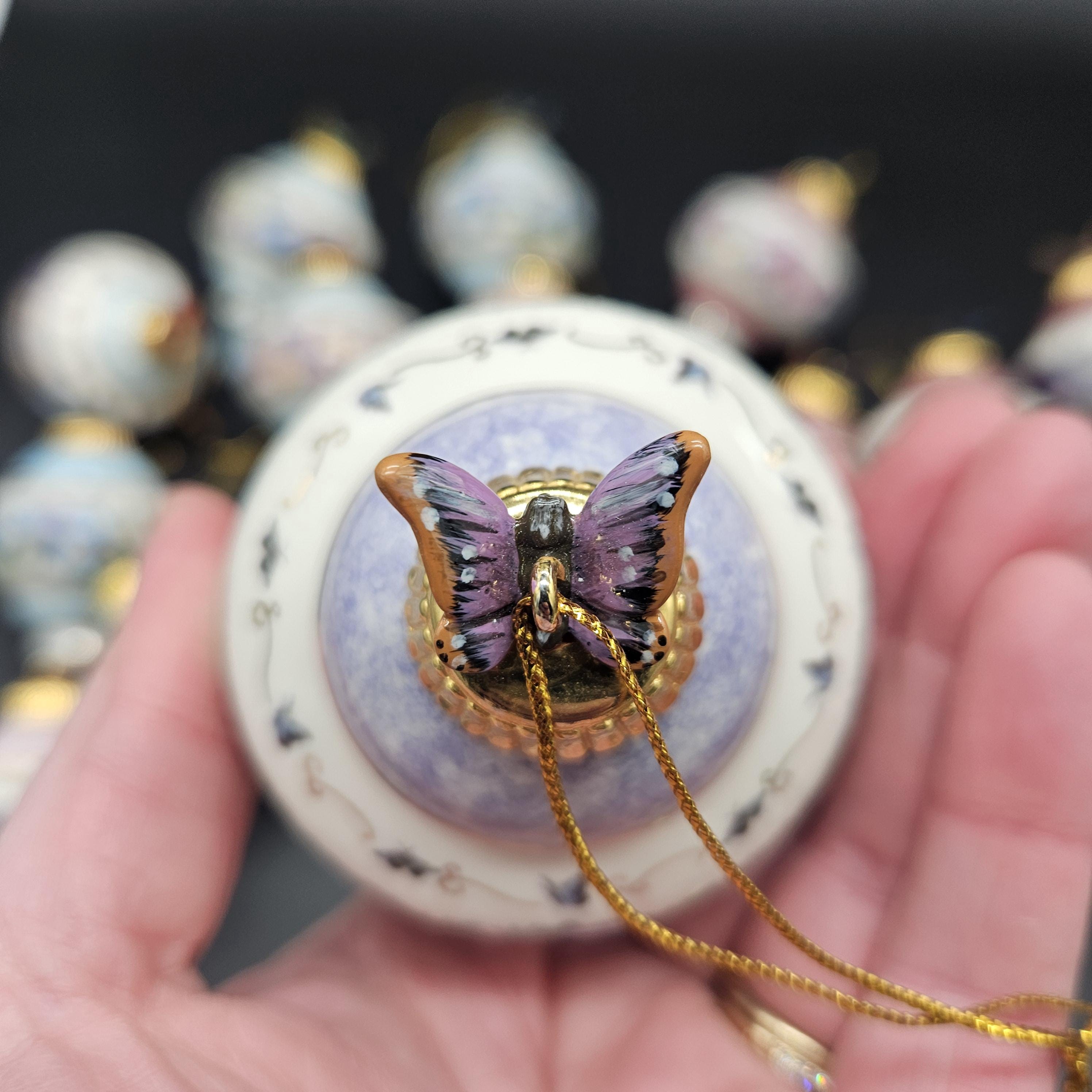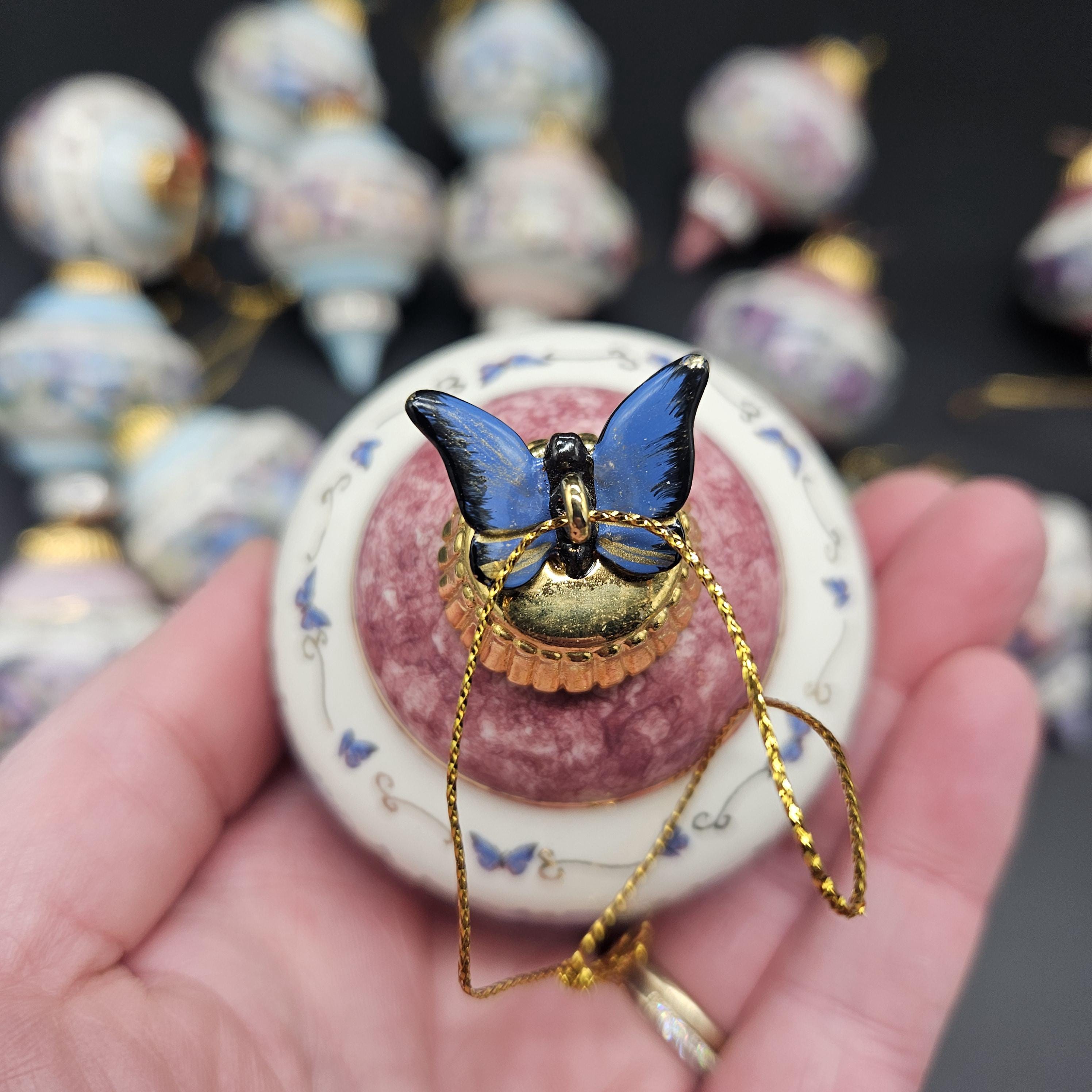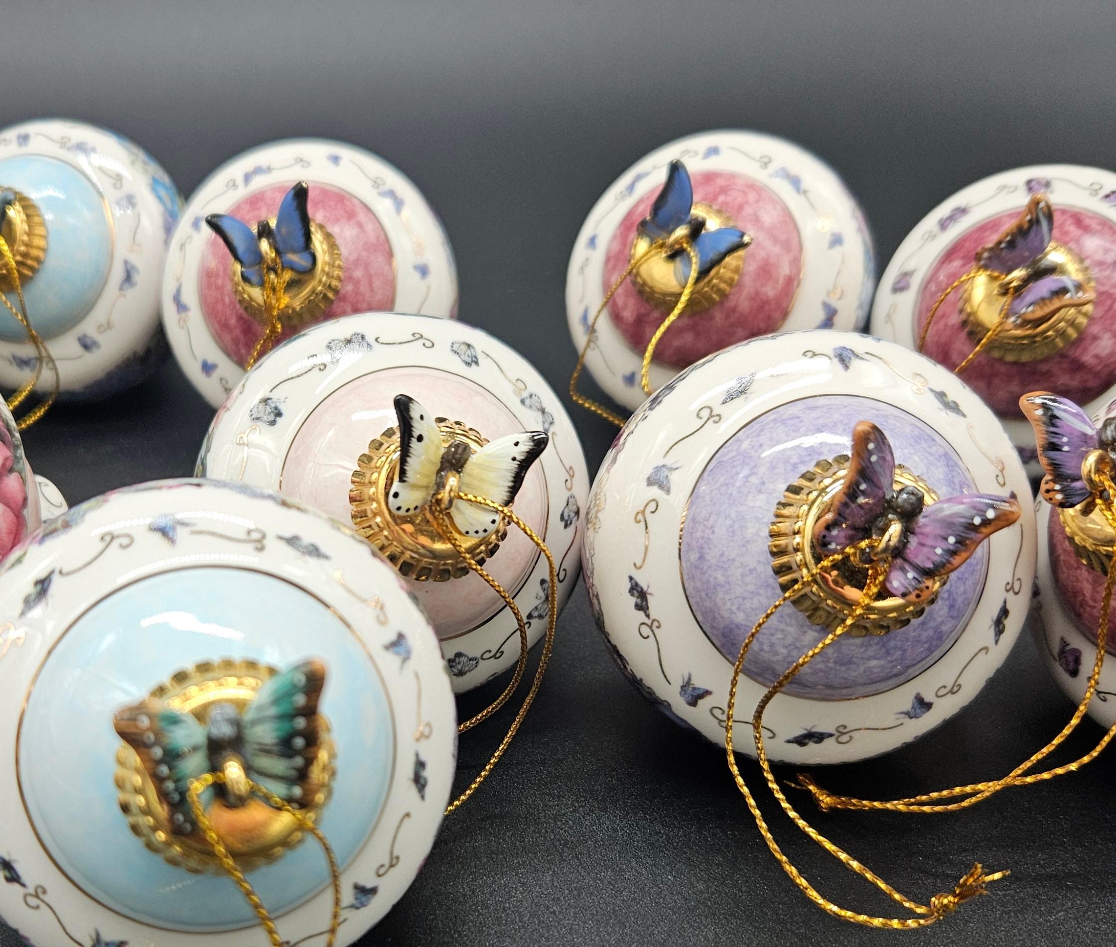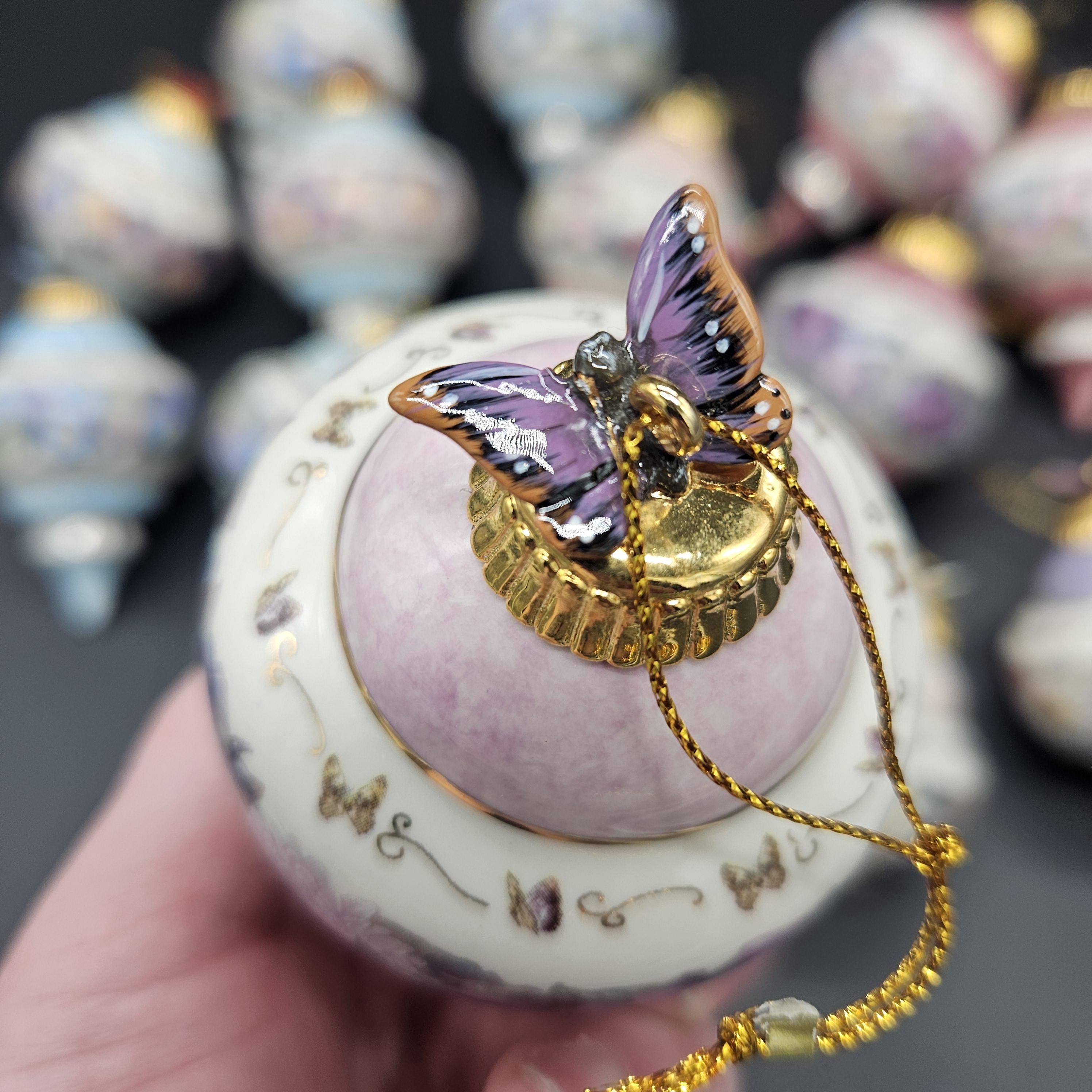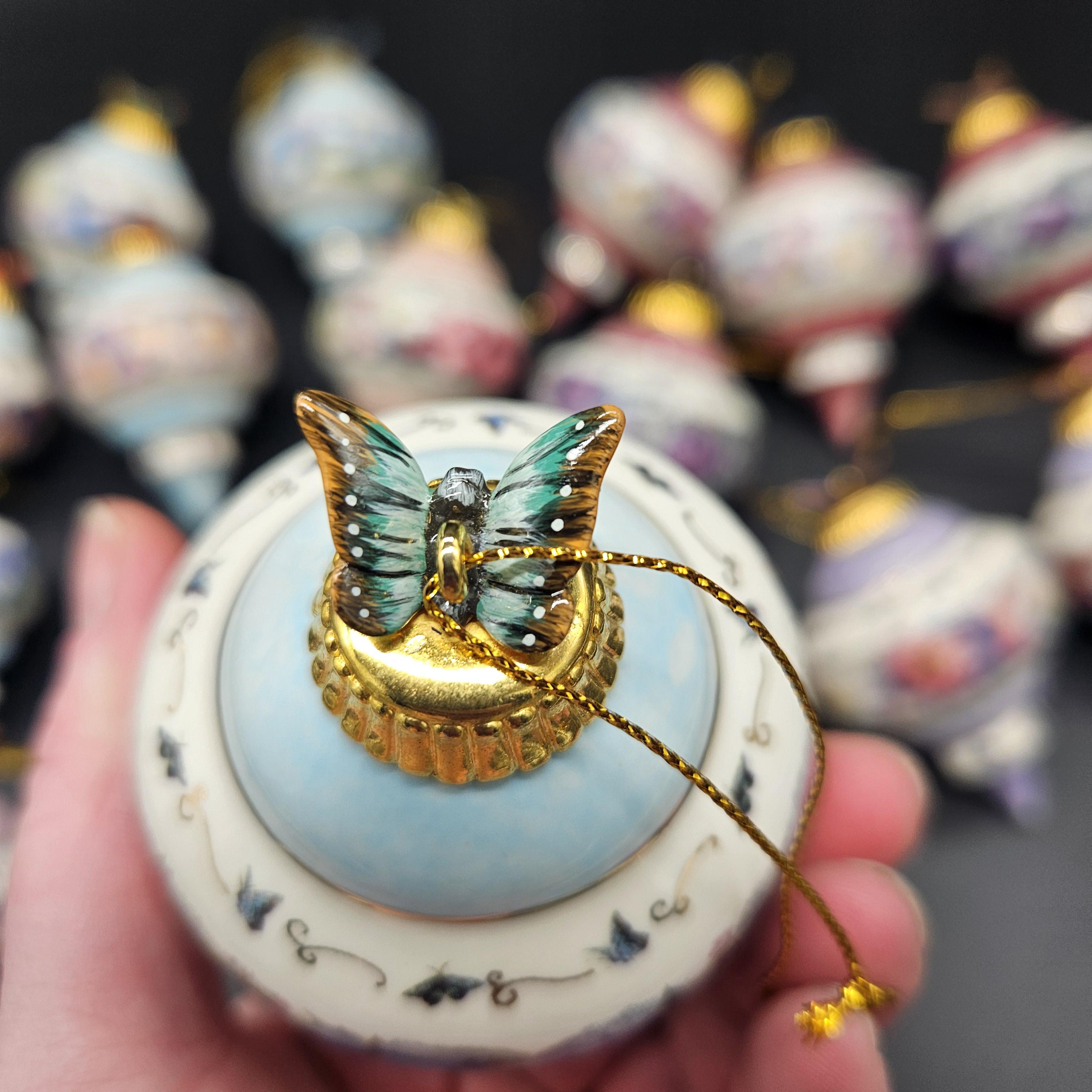 A full set of sixteen porcelain Christmas ornaments from the Lena Liu Floral Inspirations collection by Bradford Editions. These feature the classic spun-top silhouette with soft pastel color blocking and delicate floral artwork wrapping each piece.