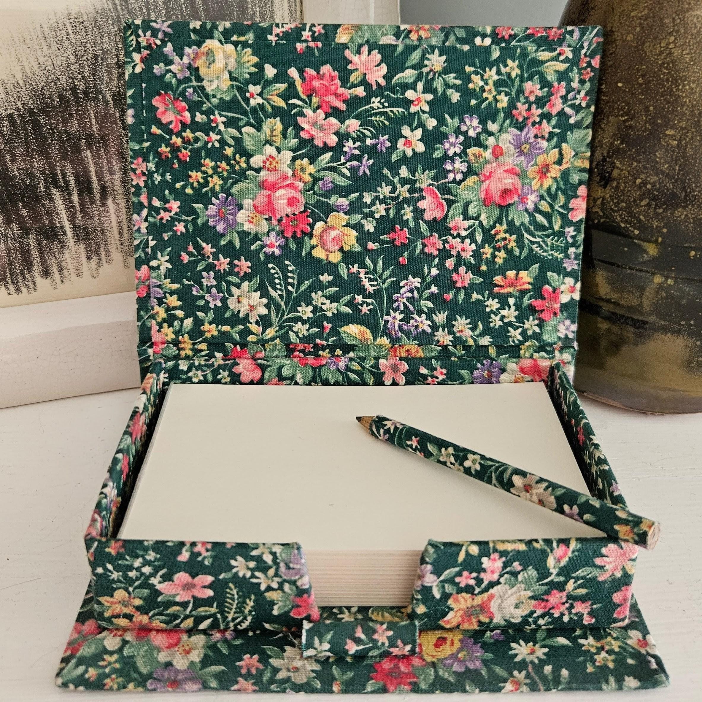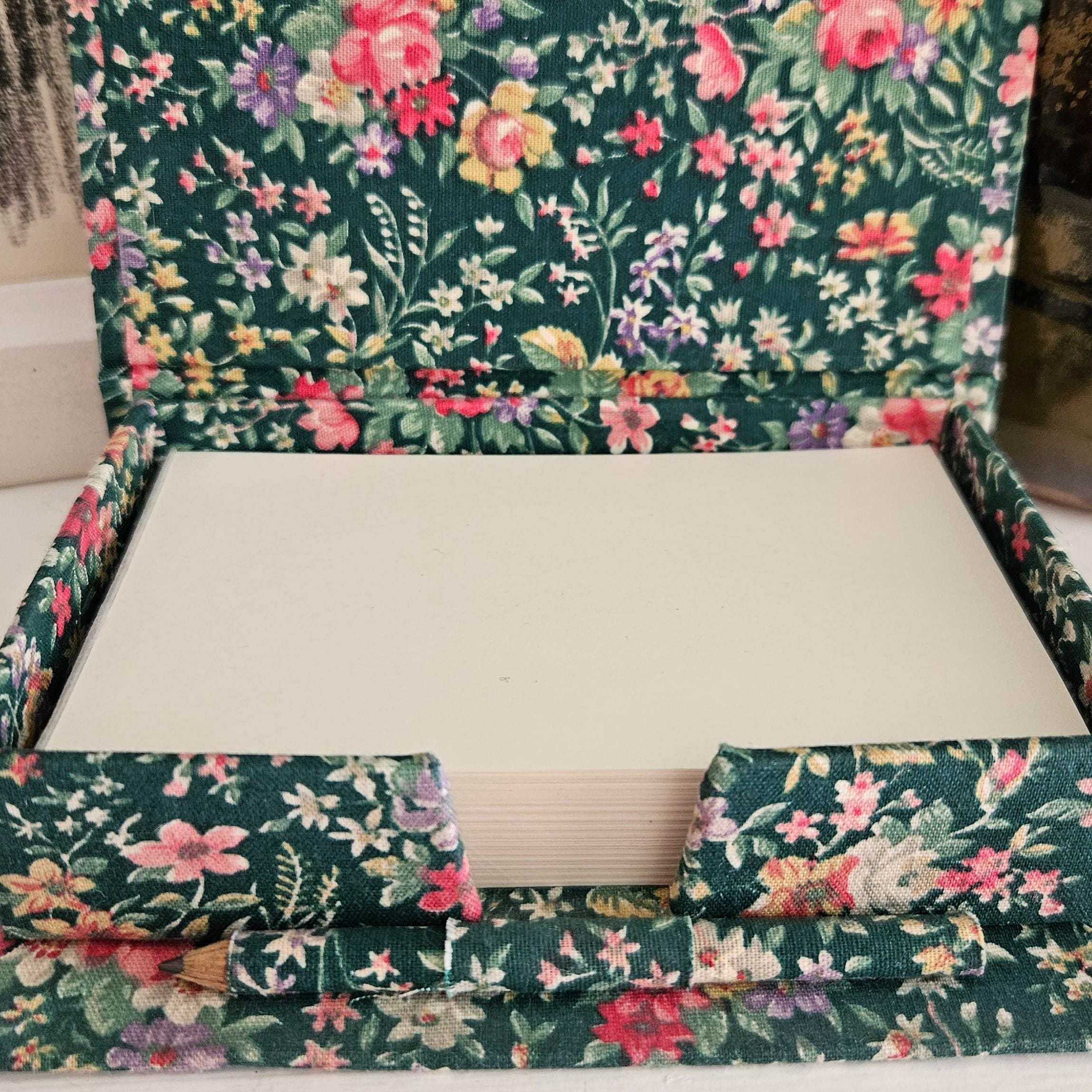 Very good vintage condition. Fabric is clean and vibrant. Pencil holder and pencil are intact. Paper stack inside with many blank pages. Please review photos for details.