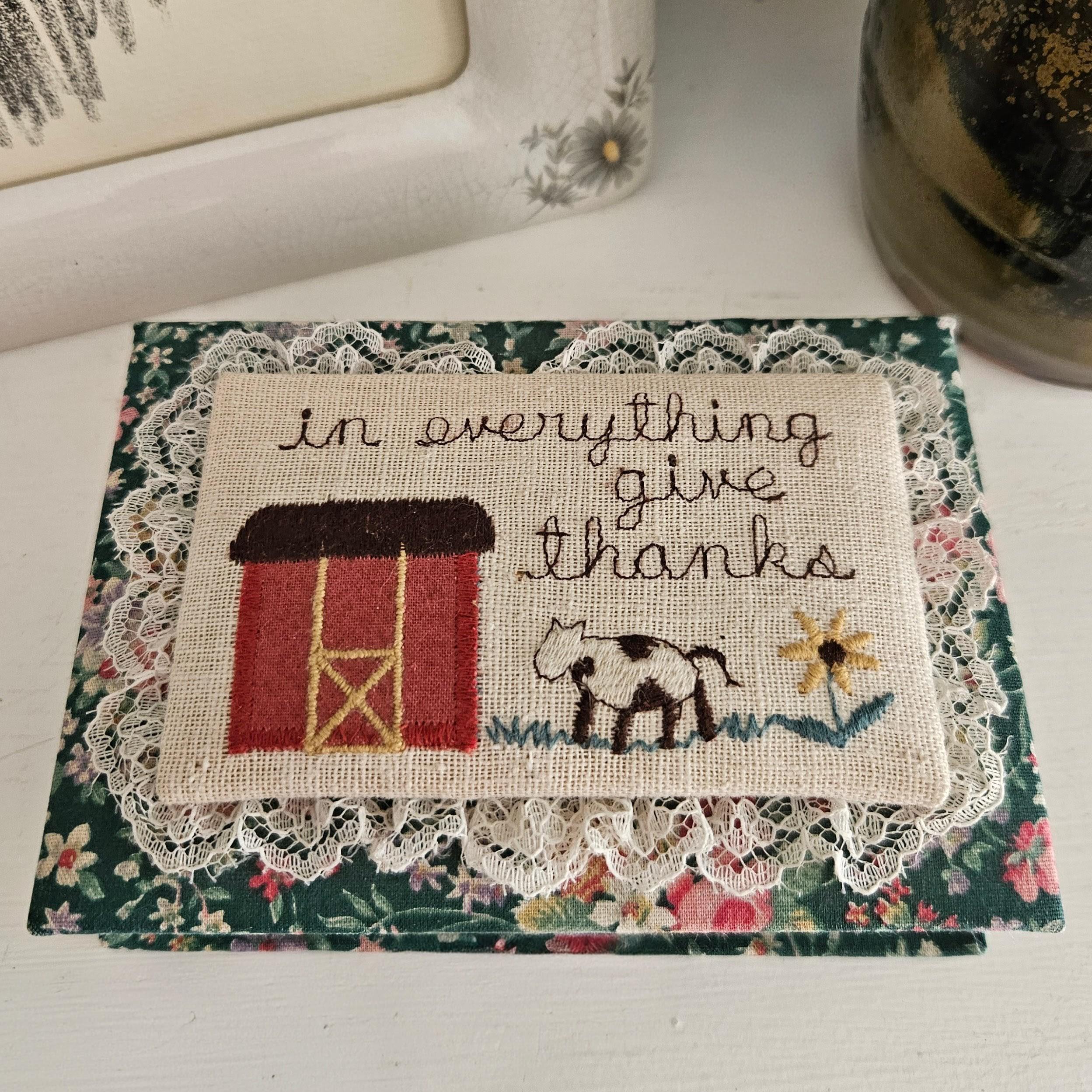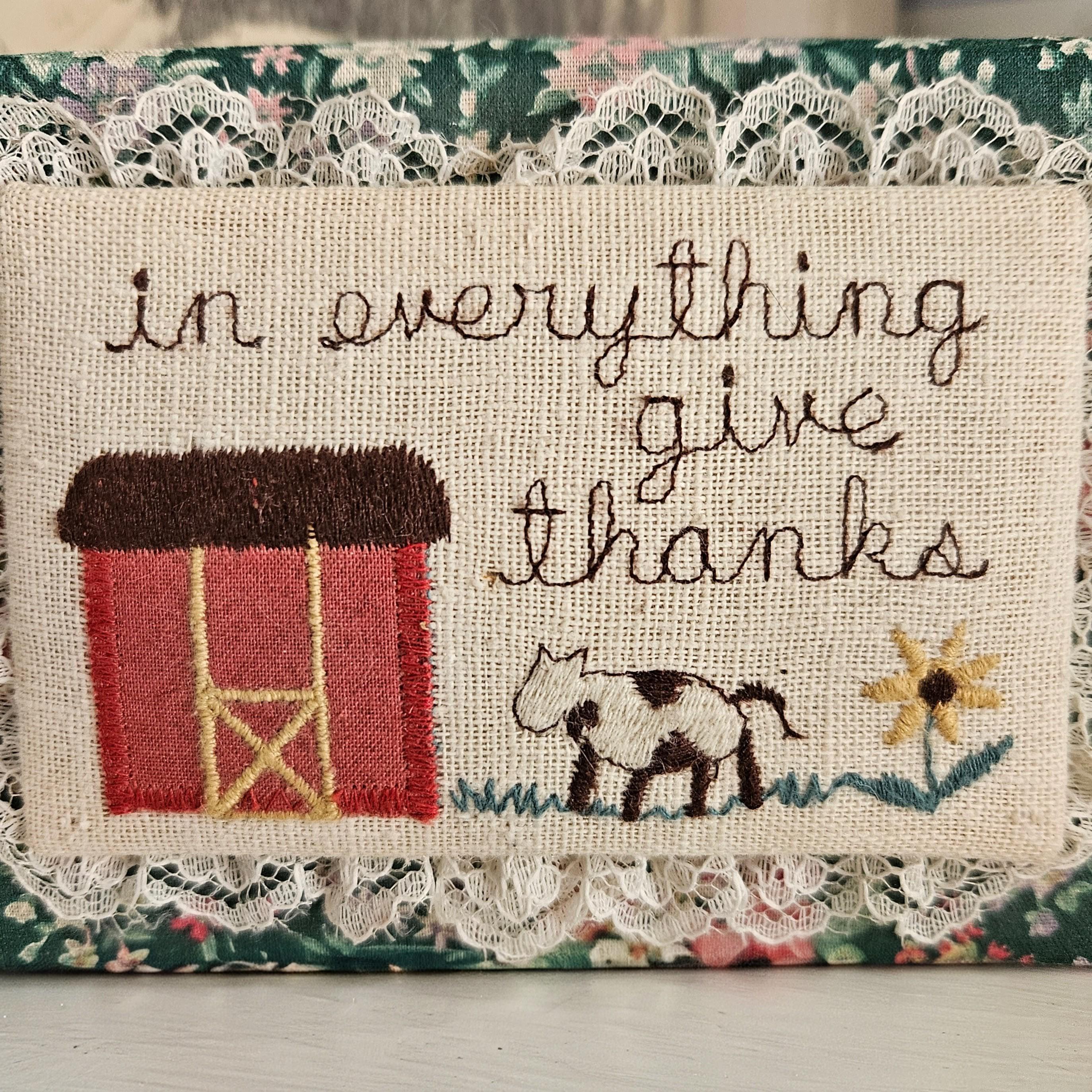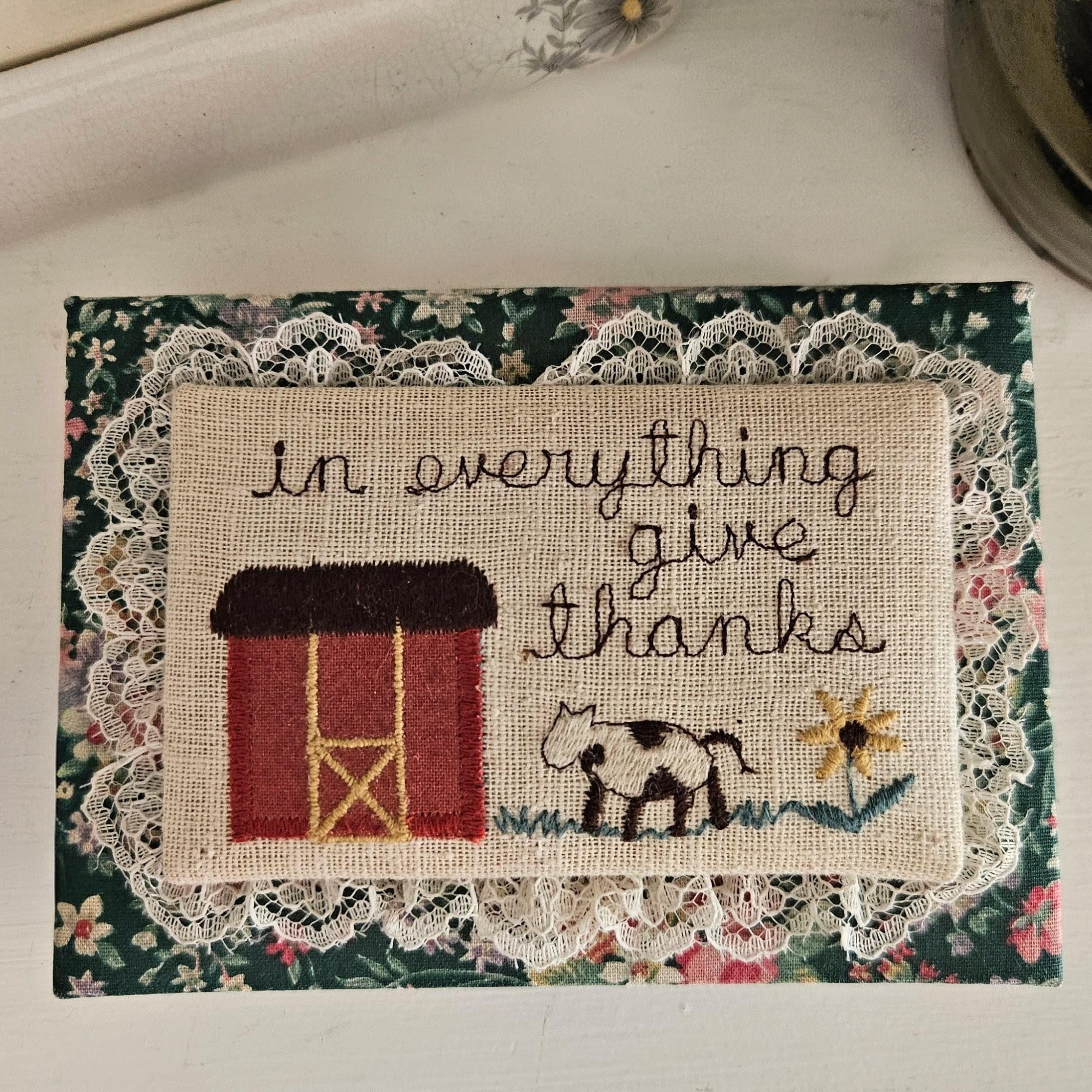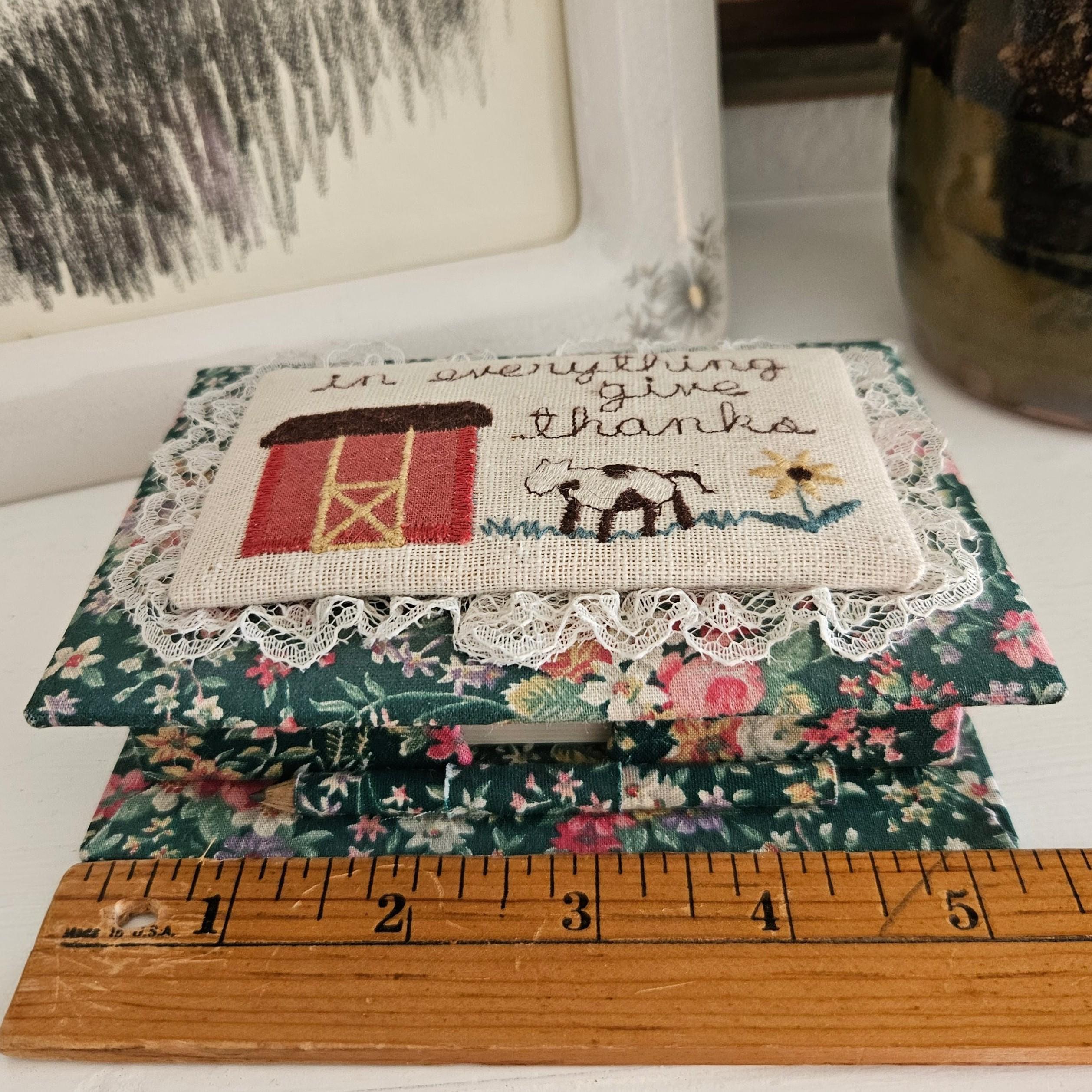 This vintage memo box is a sweet little desk or kitchen accessory from the country decor era. The lid features a handmade needlepoint panel that reads “In everything give thanks” with a barn, cow, and flower scene, framed with lace. The box is covered in a green floral fabric and opens to reveal a stack of blank memo paper inside. Across the front is a fabric cradle that holds the original matching fabric-covered pencil.