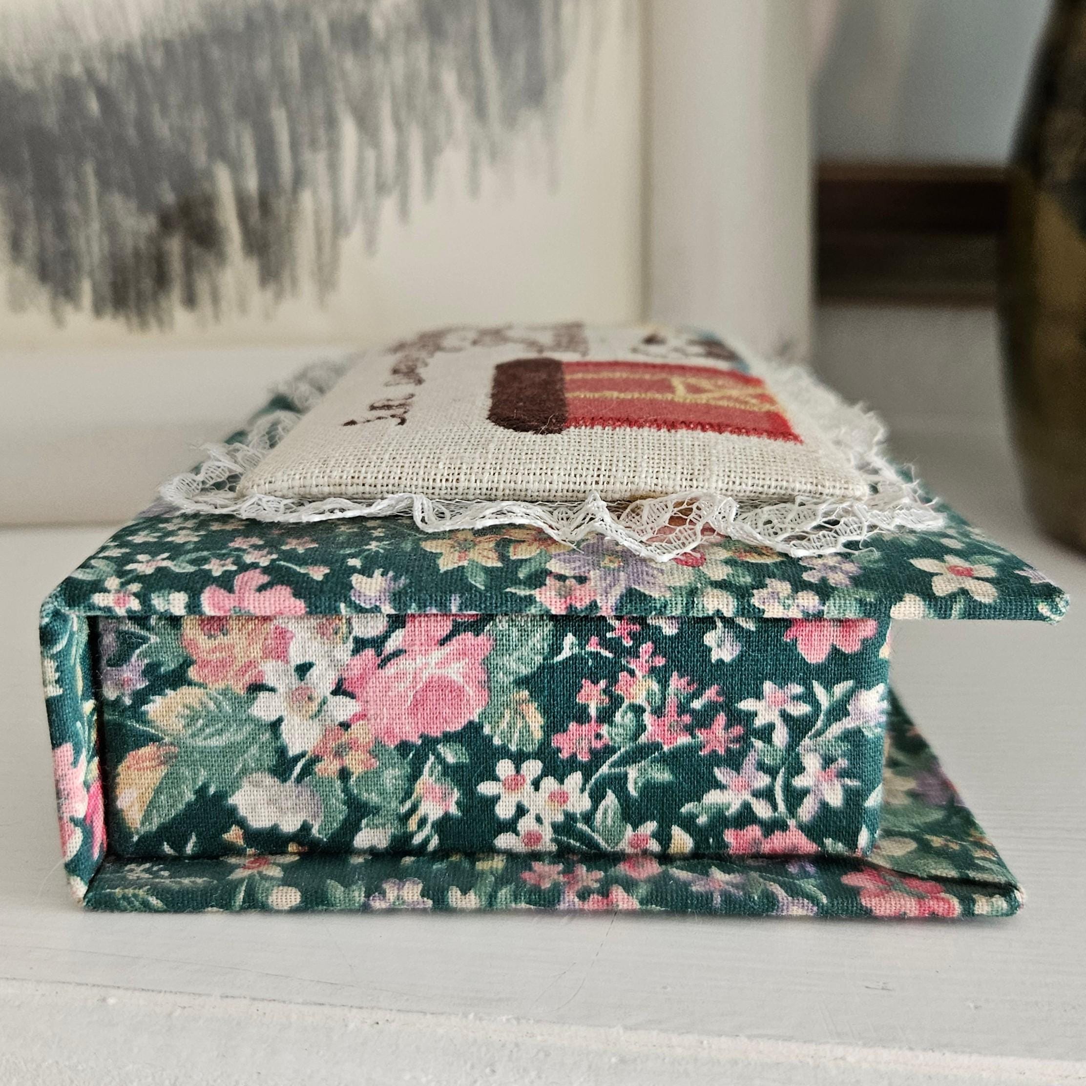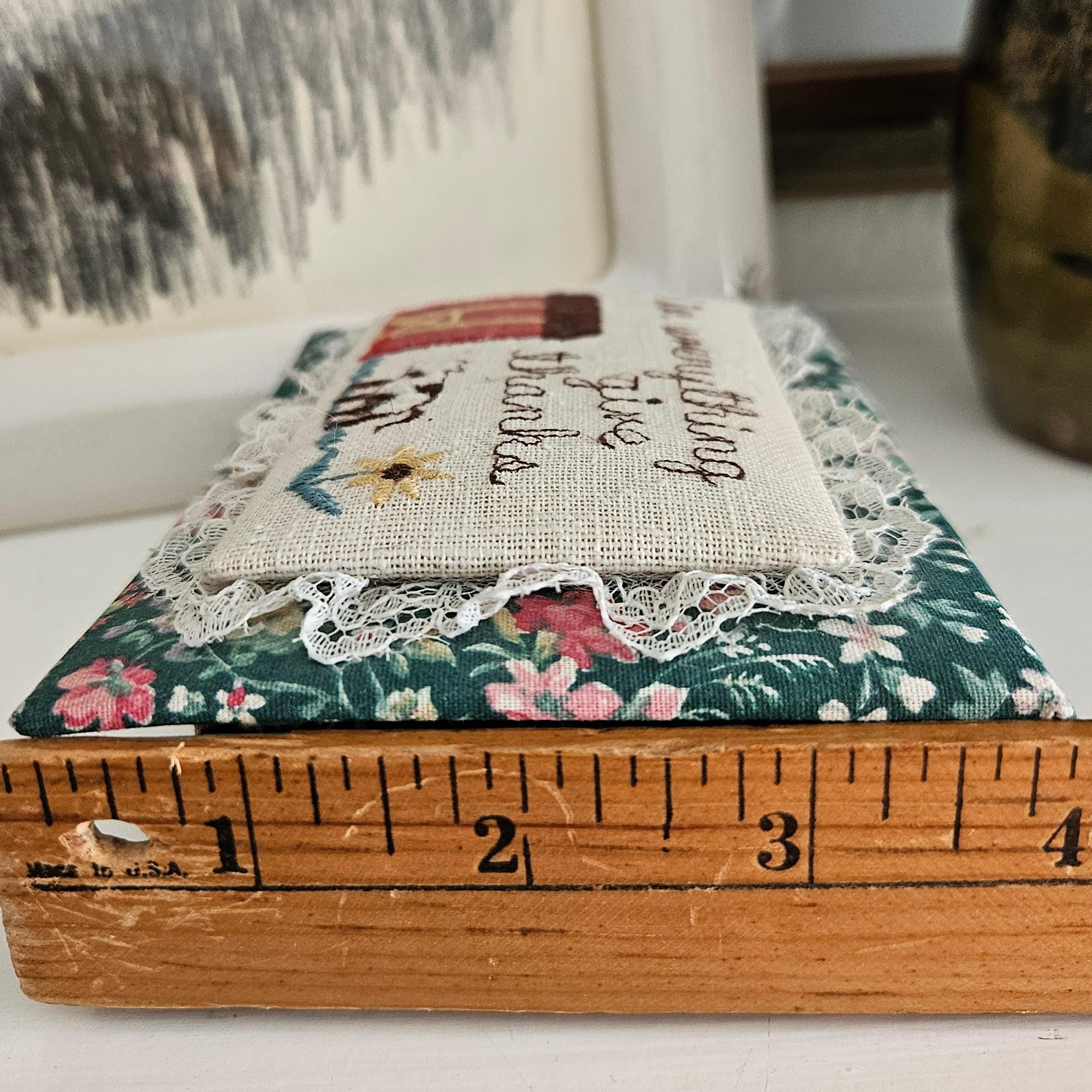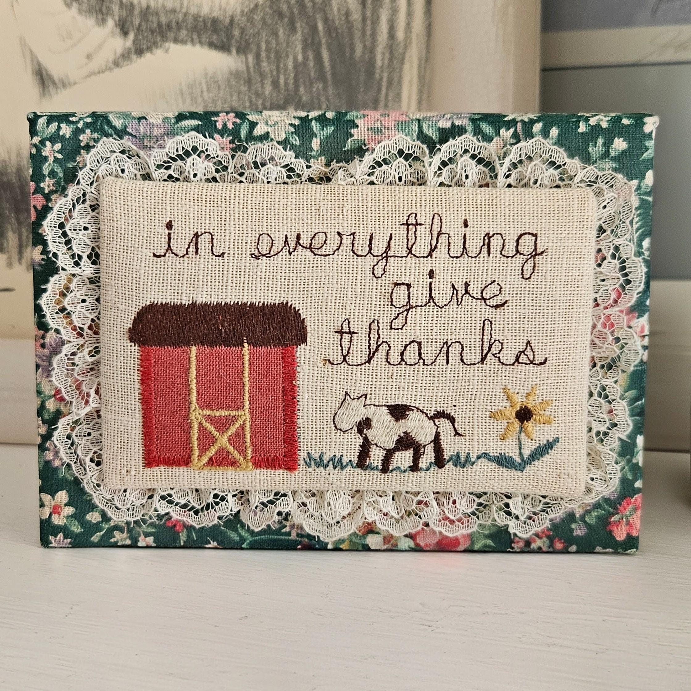 This vintage memo box is a sweet little desk or kitchen accessory from the country decor era. The lid features a handmade needlepoint panel that reads “In everything give thanks” with a barn, cow, and flower scene, framed with lace. The box is covered in a green floral fabric and opens to reveal a stack of blank memo paper inside. Across the front is a fabric cradle that holds the original matching fabric-covered pencil.