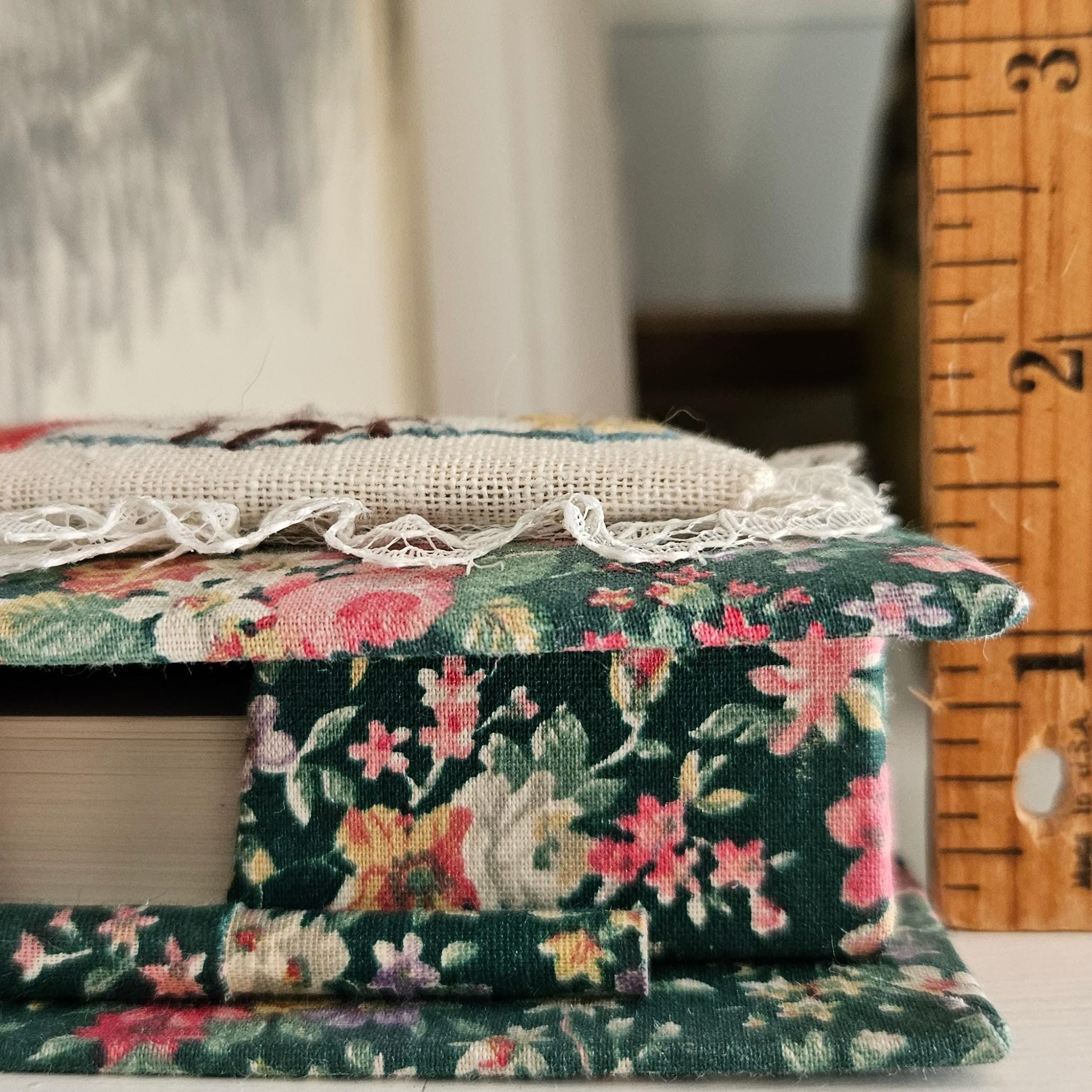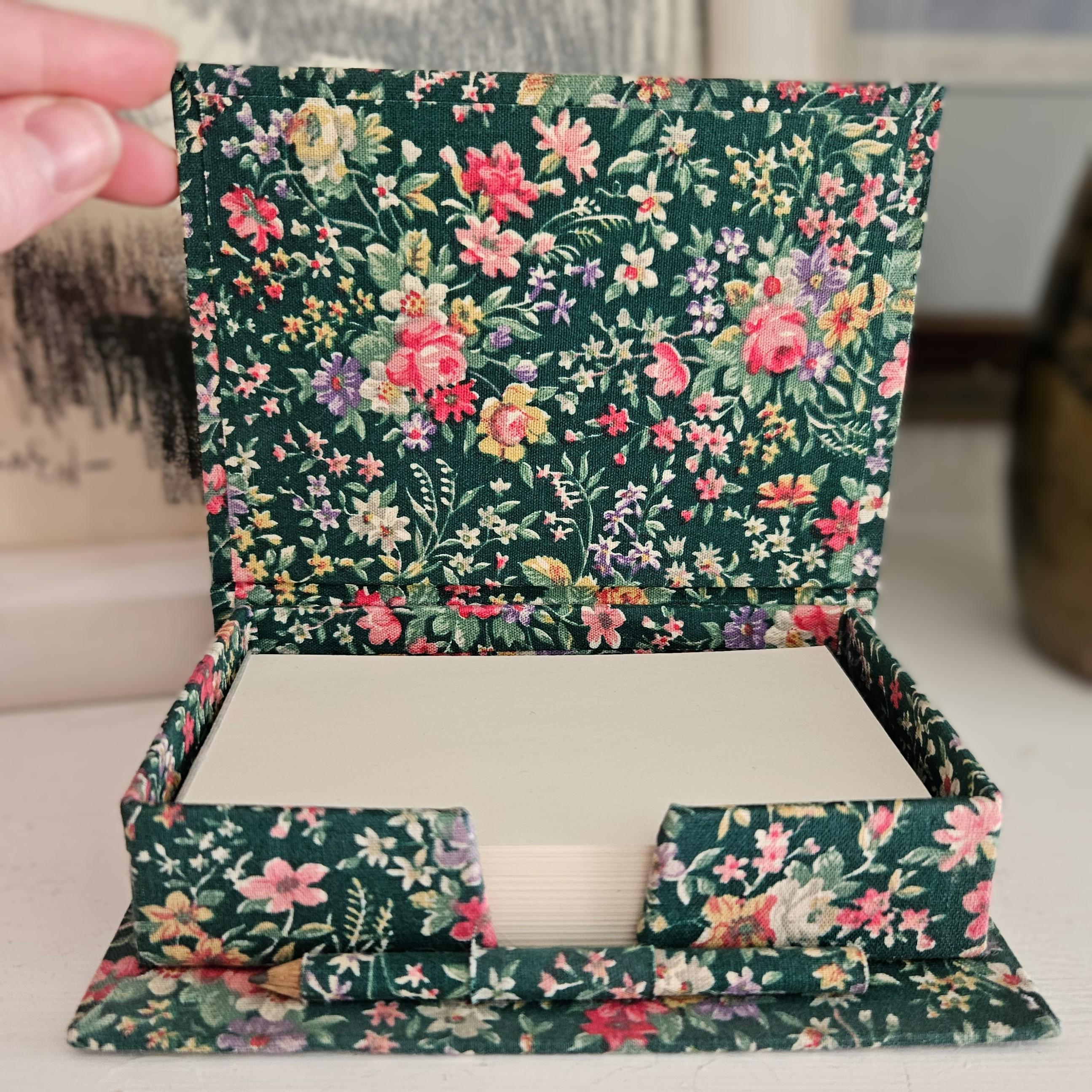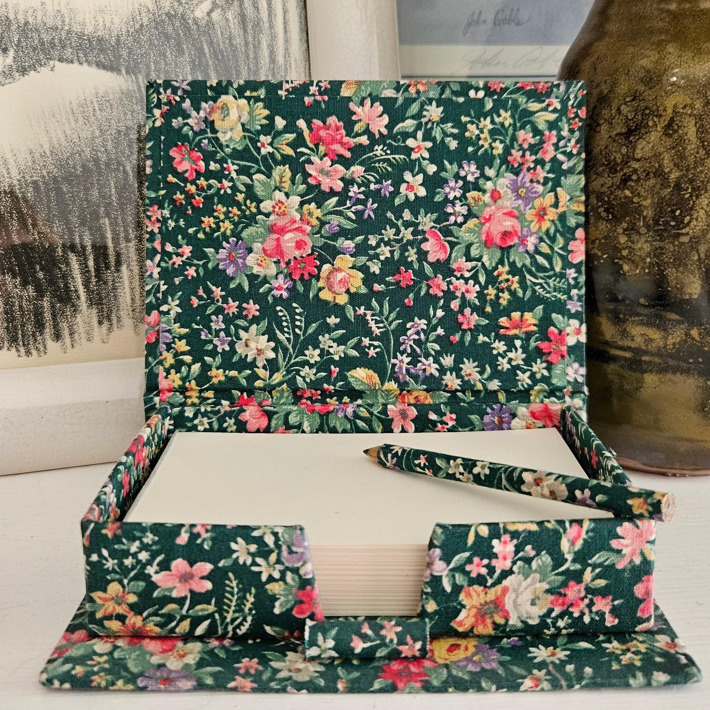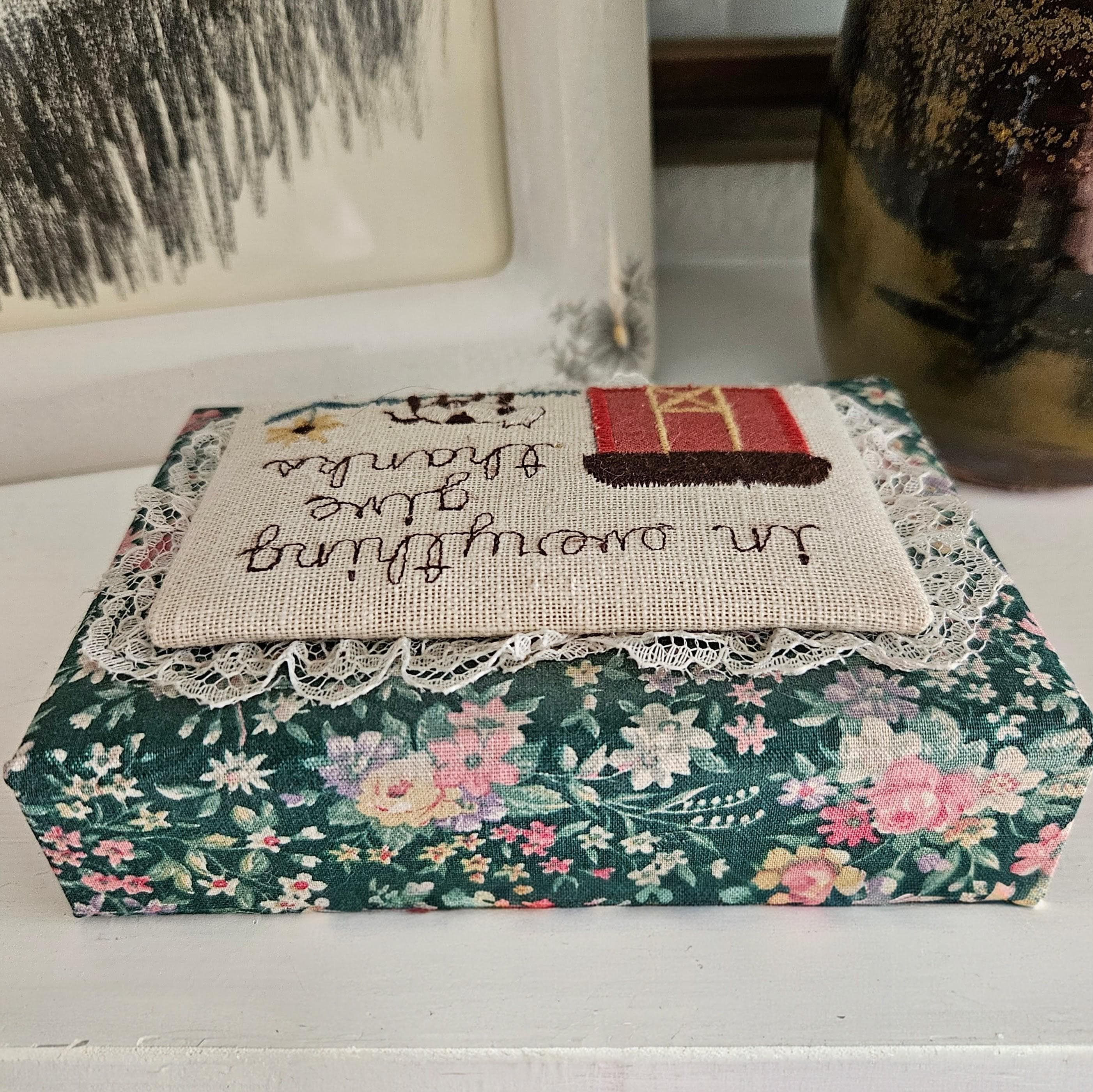 This vintage memo box is a sweet little desk or kitchen accessory from the country decor era. The lid features a handmade needlepoint panel that reads “In everything give thanks” with a barn, cow, and flower scene, framed with lace. The box is covered in a green floral fabric and opens to reveal a stack of blank memo paper inside. Across the front is a fabric cradle that holds the original matching fabric-covered pencil.