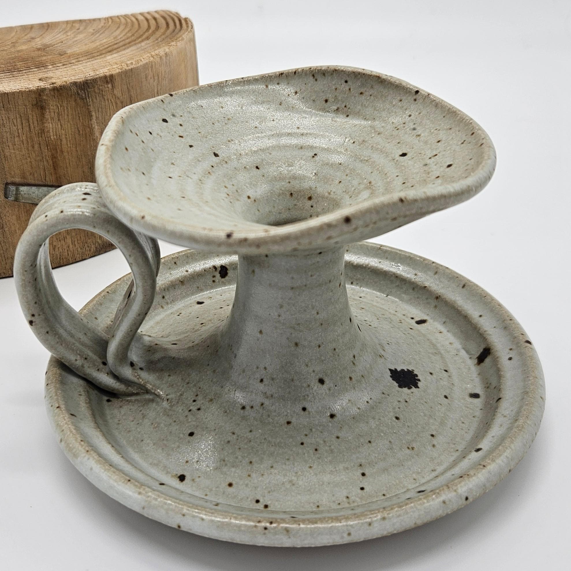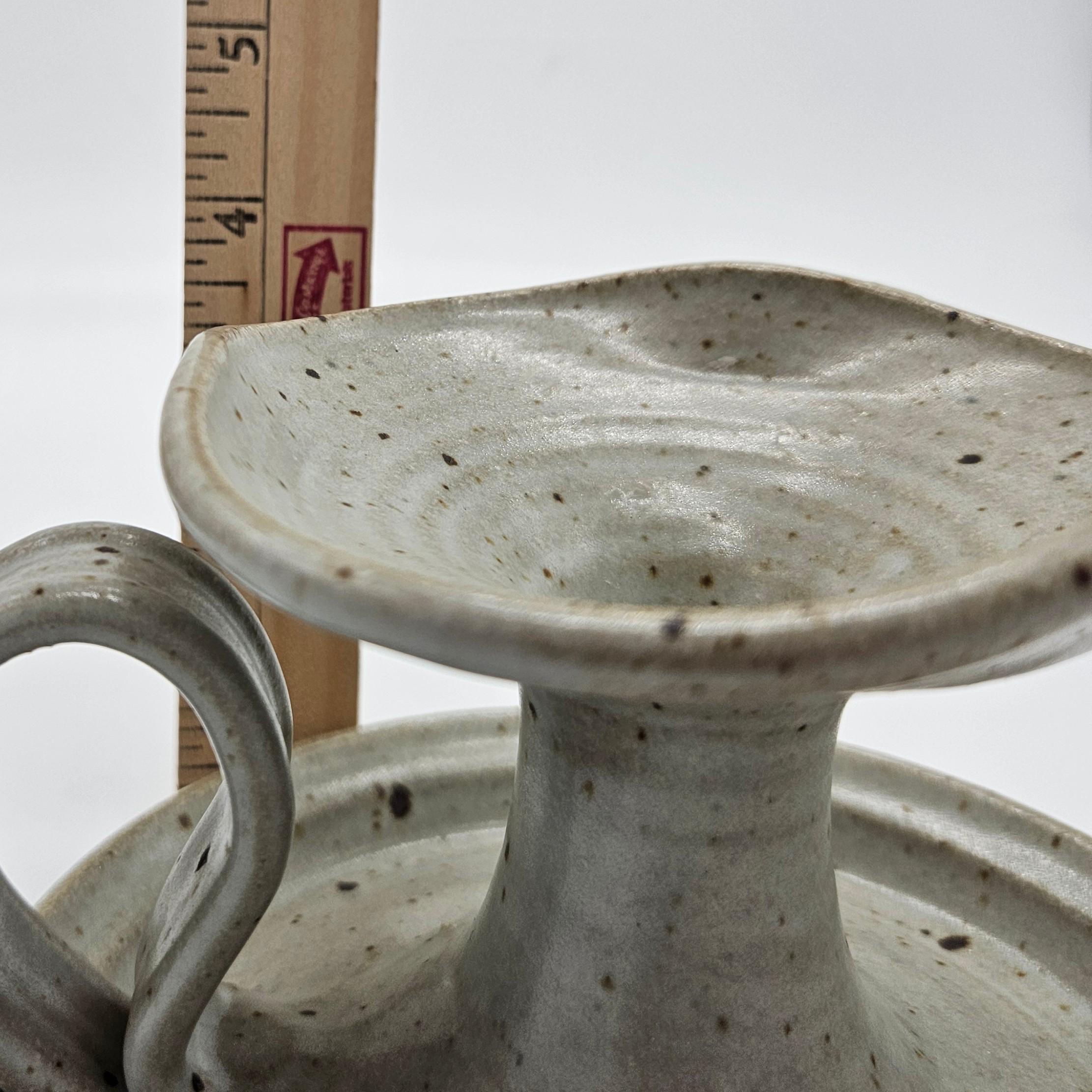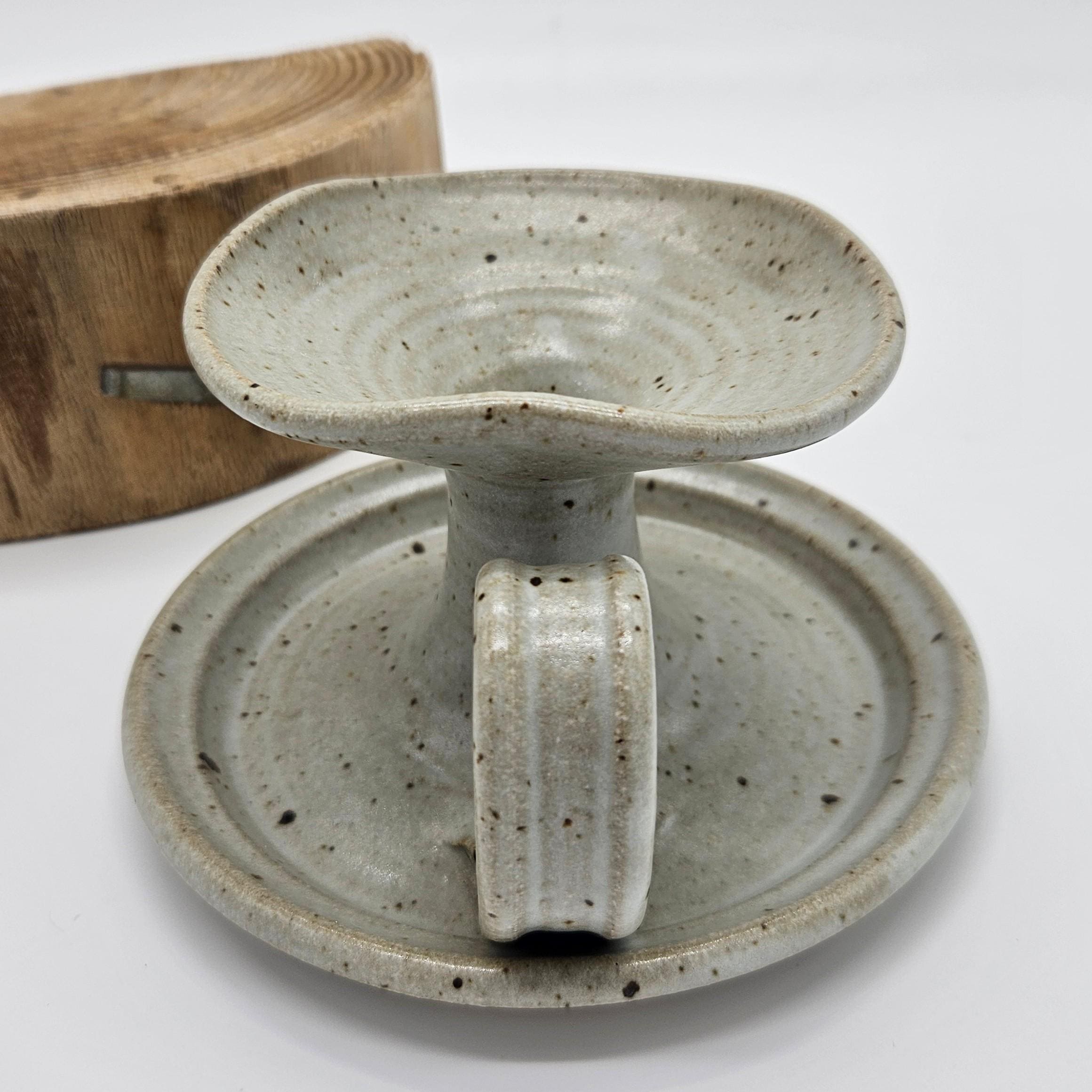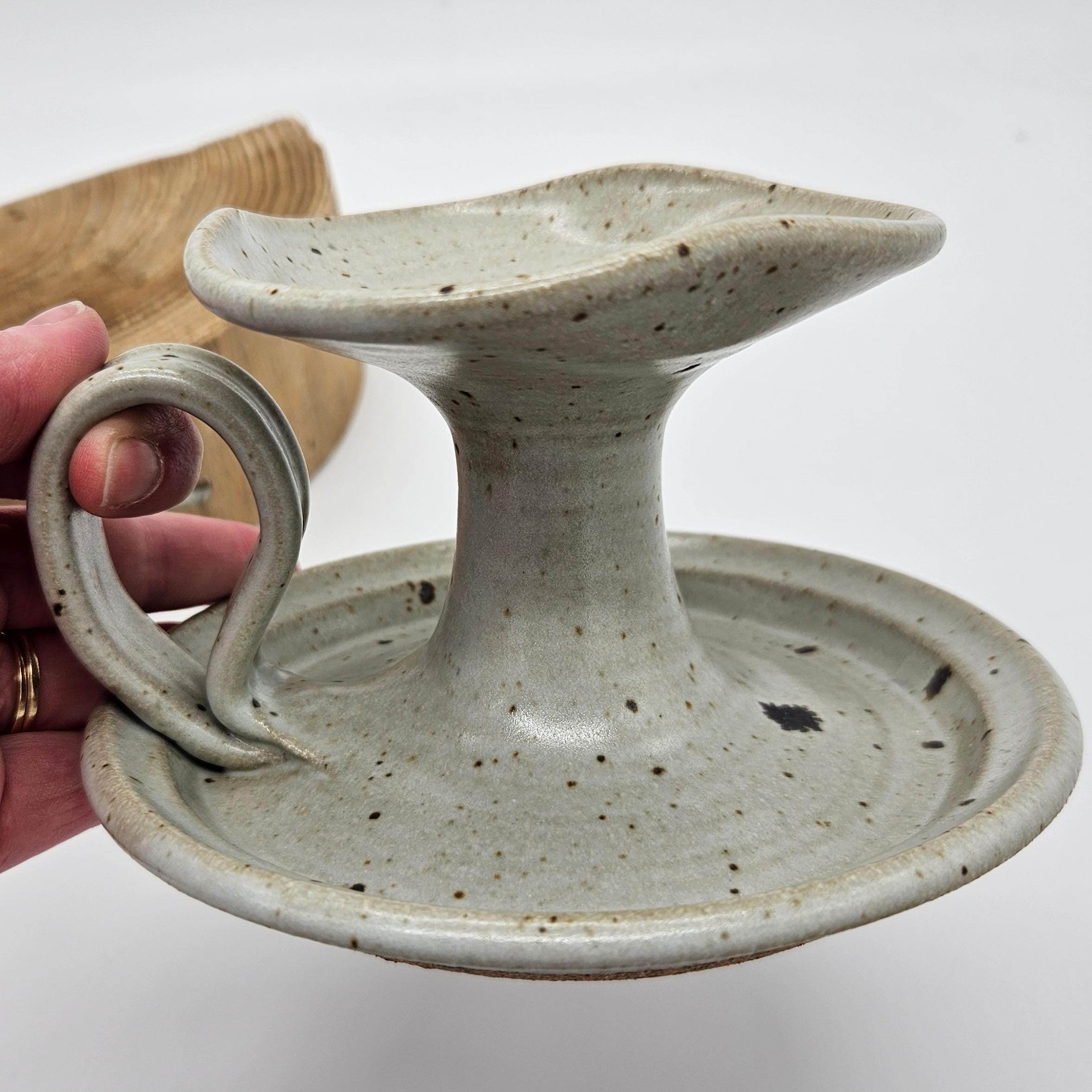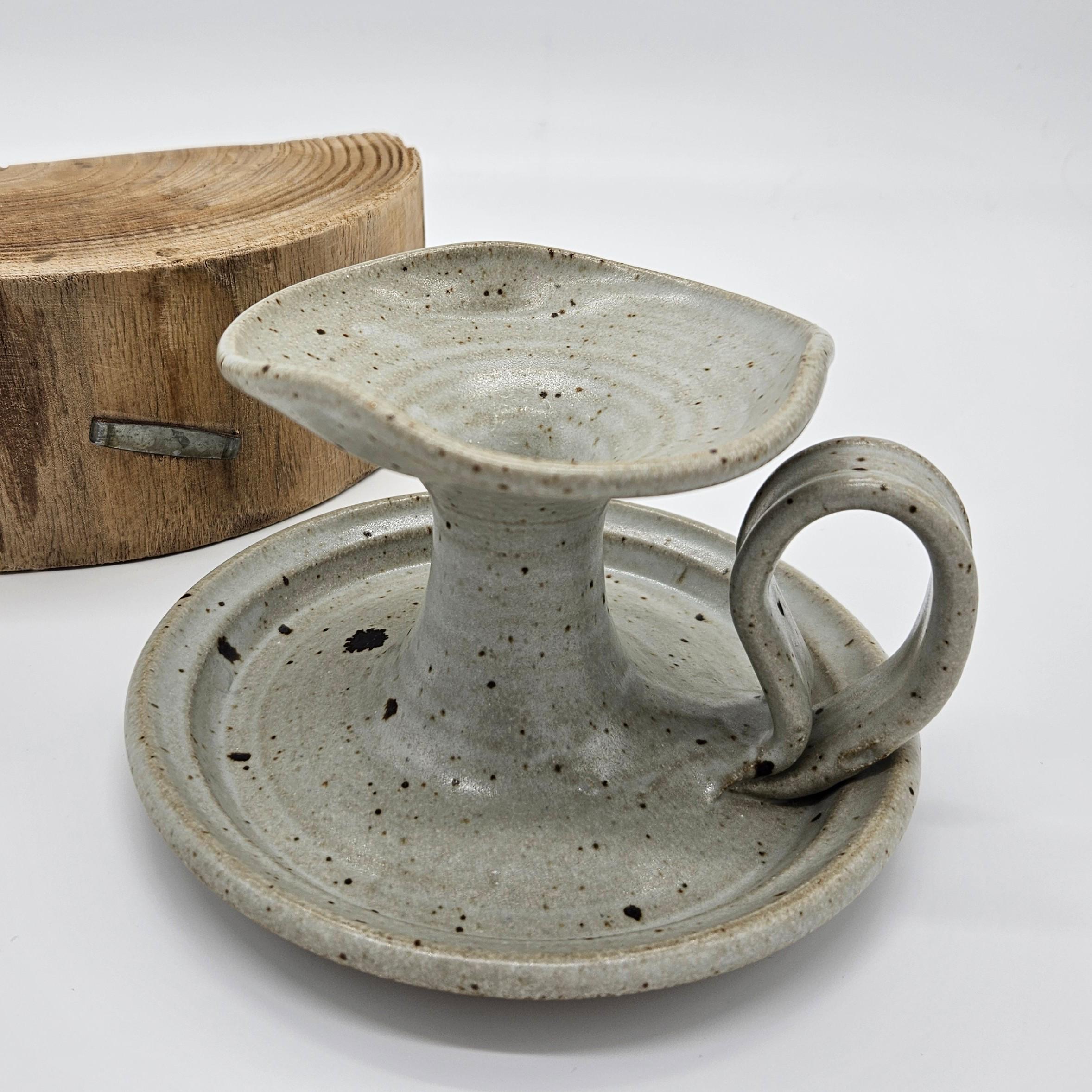 Handmade studio pottery chamberstick style candle holder with a beautiful speckled stoneware glaze and sculptural finger loop handle. This piece has an organic form with a wide drip tray and raised candle cup. The neutral glaze with dark speckles gives it a timeless, earthy look that fits perfectly with rustic, cottage, or wabi-sabi interiors. The loop handle makes it easy to carry from room to room, just like traditional chambersticks. Approx. 3.5 in tall, 6 in diameter.