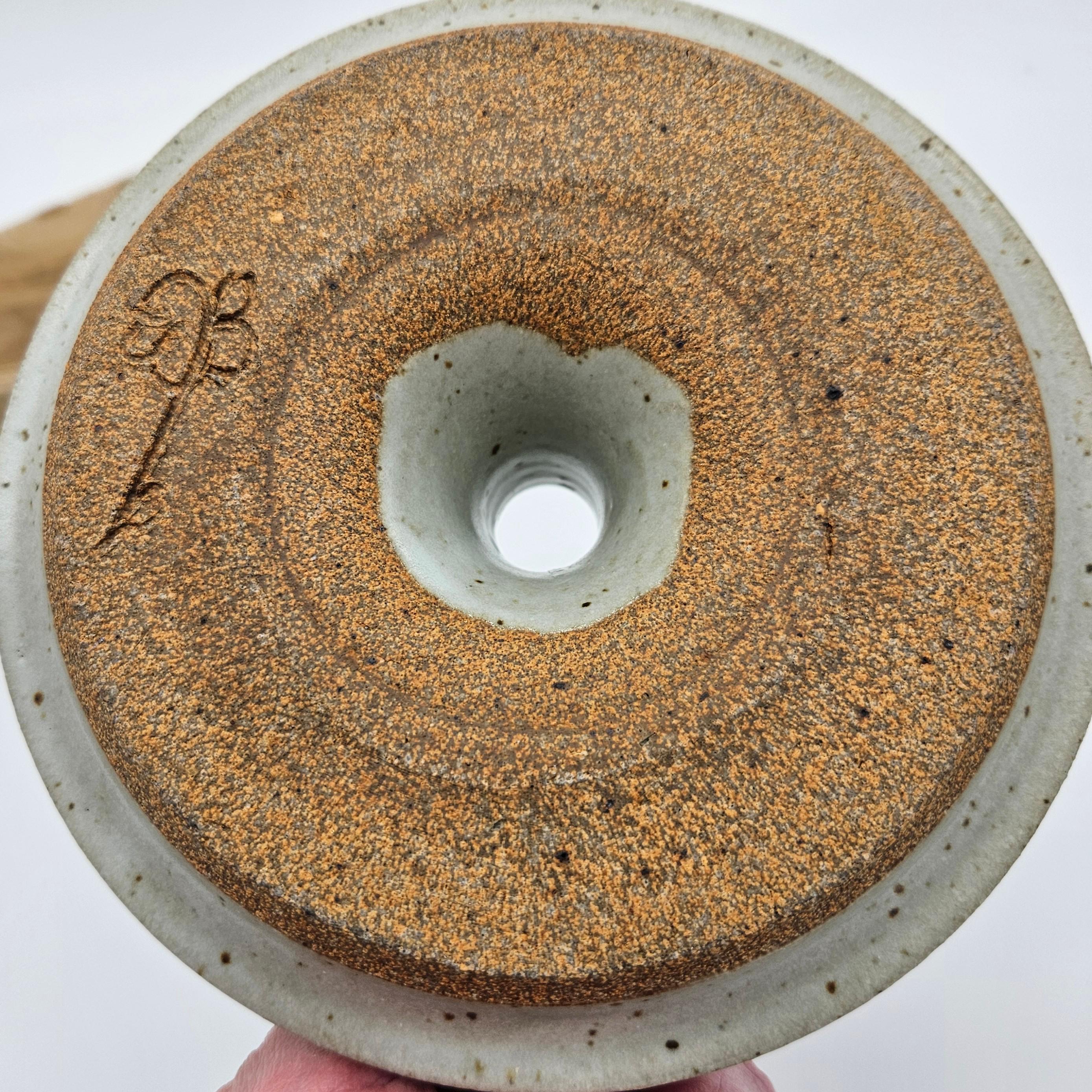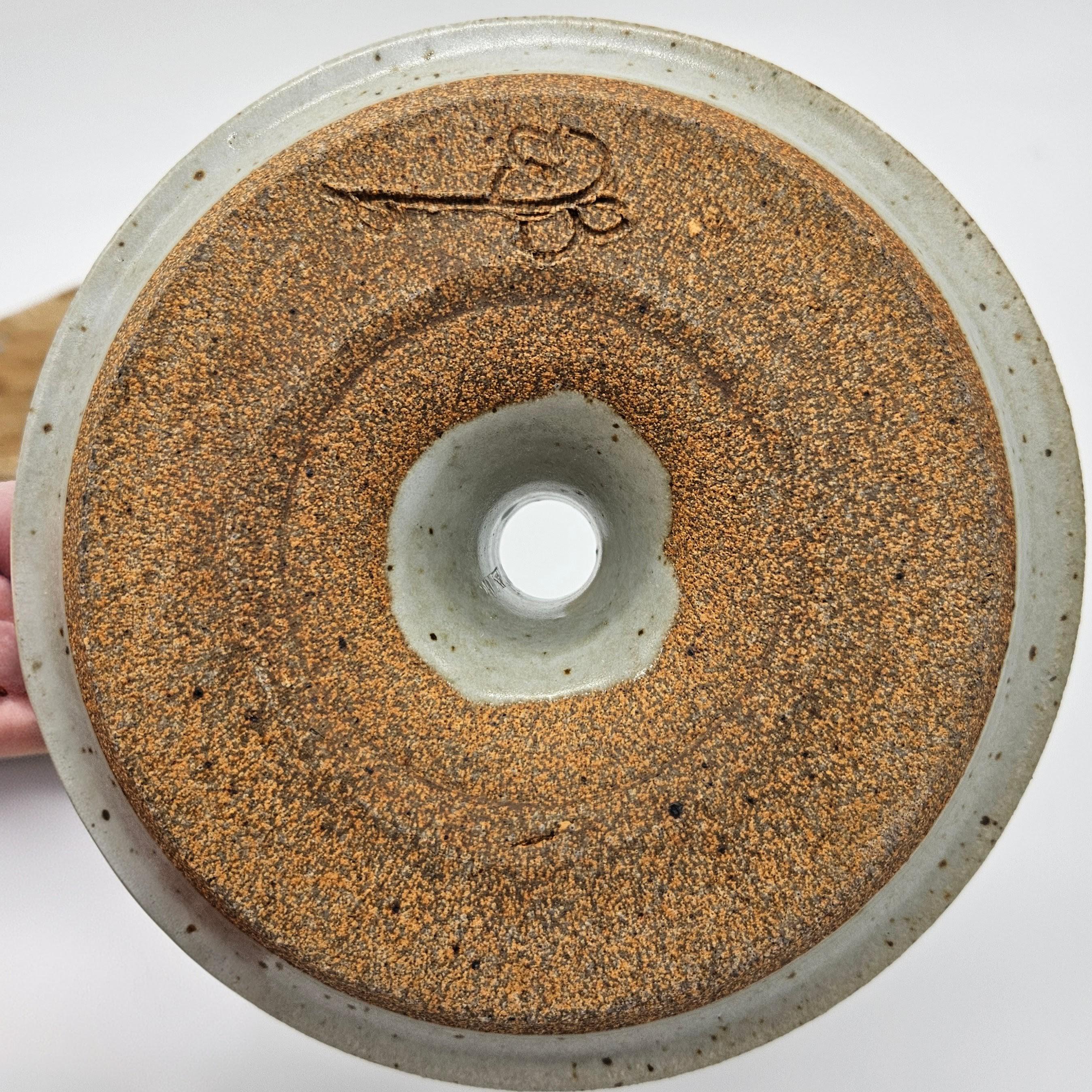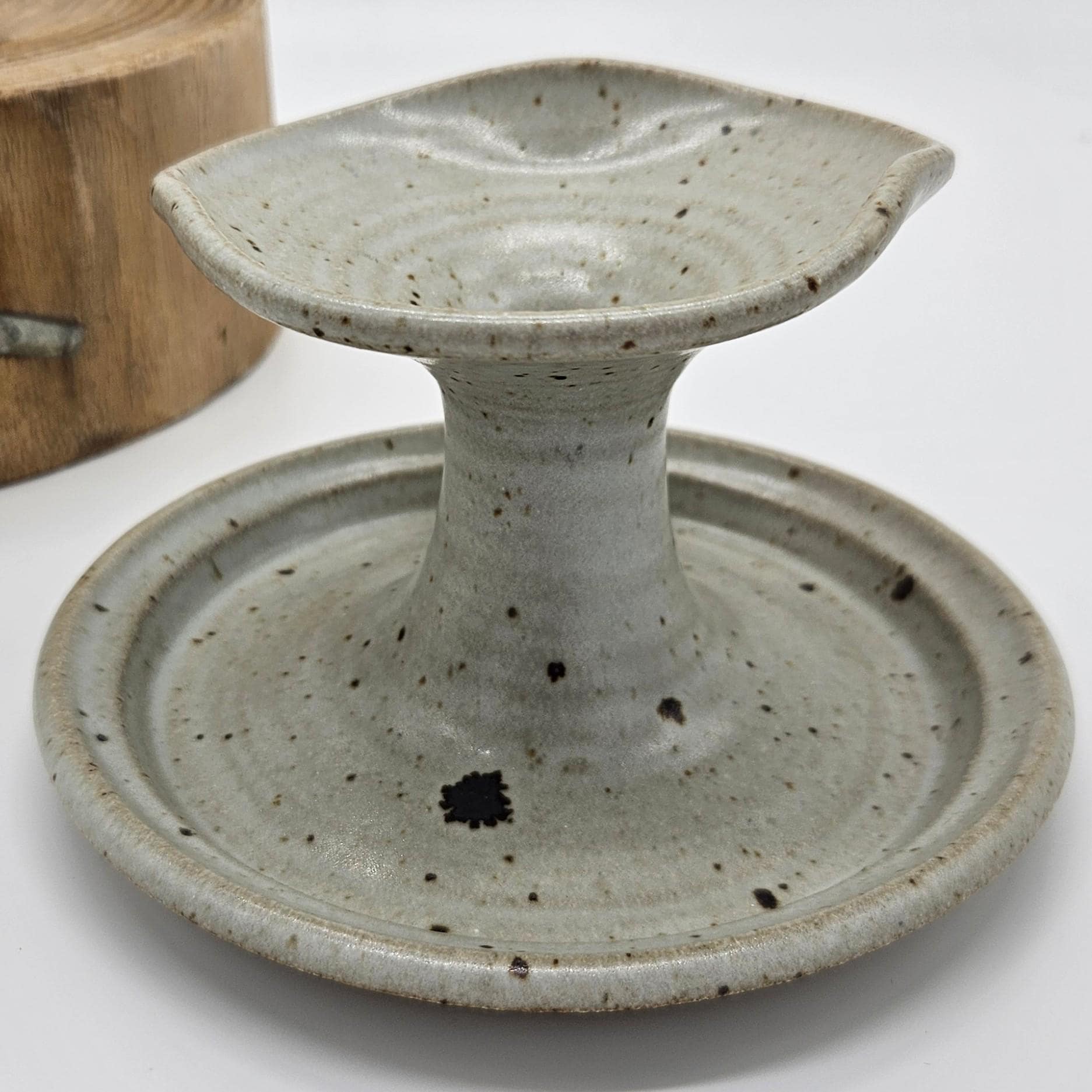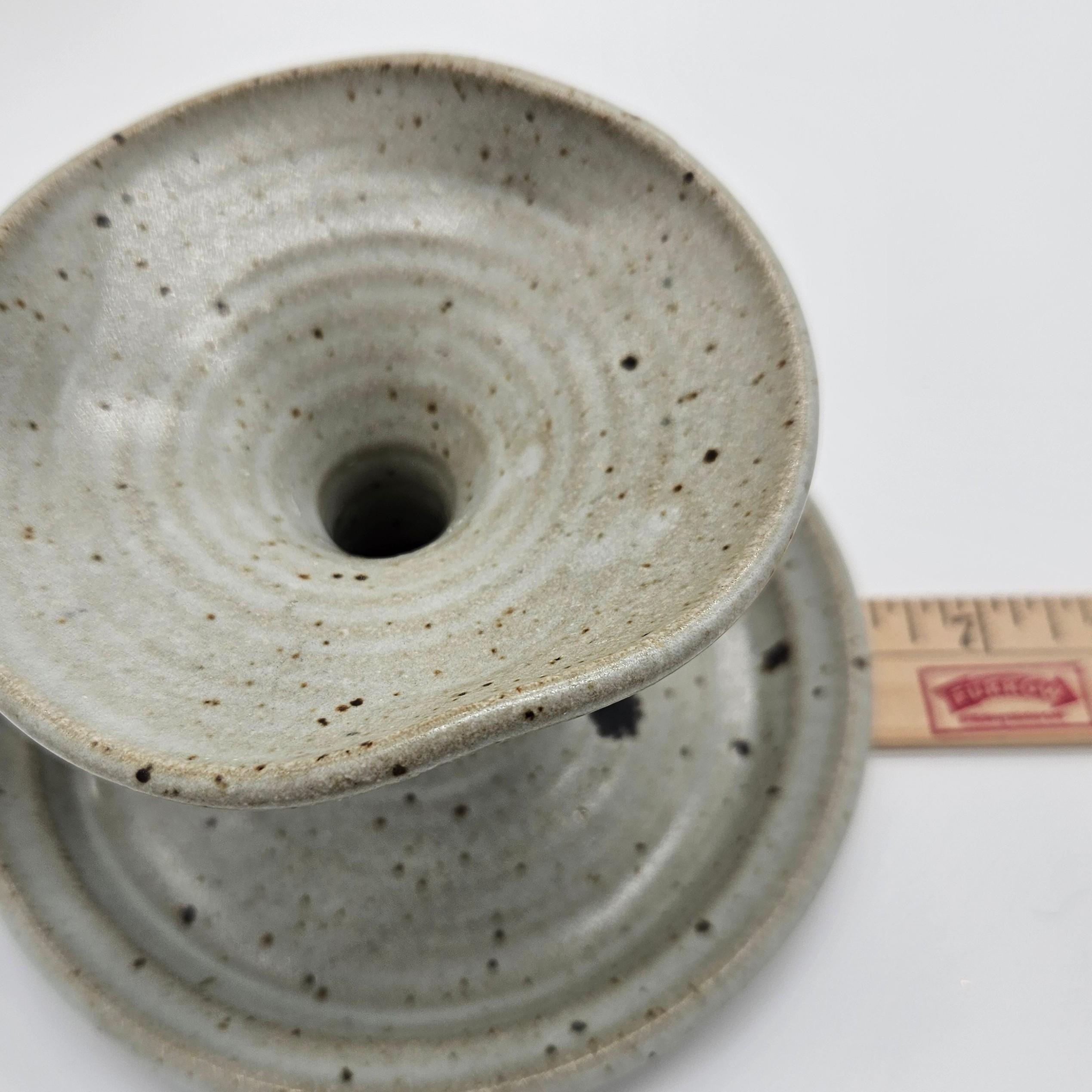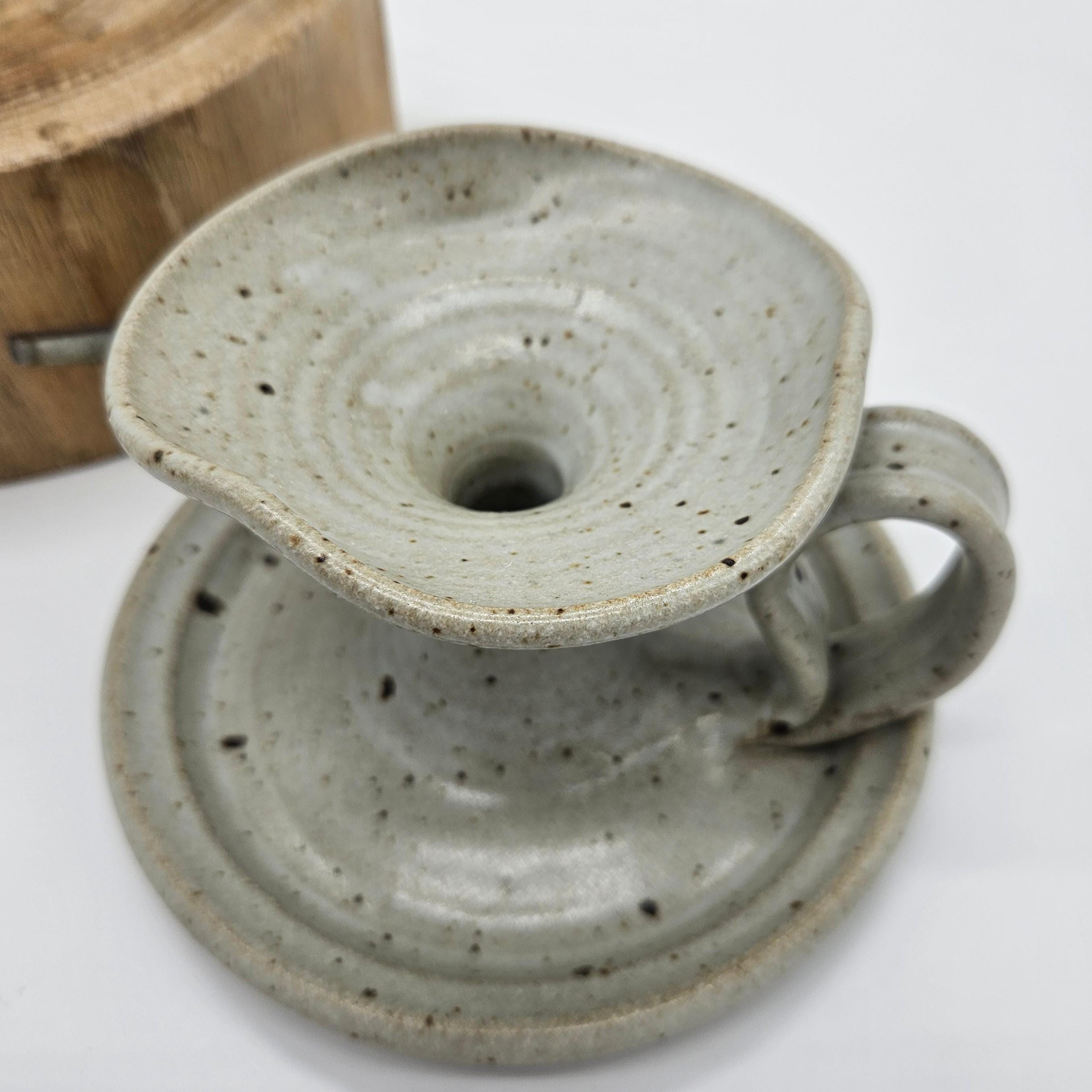 Handmade studio pottery chamberstick style candle holder with a beautiful speckled stoneware glaze and sculptural finger loop handle. This piece has an organic form with a wide drip tray and raised candle cup. The neutral glaze with dark speckles gives it a timeless, earthy look that fits perfectly with rustic, cottage, or wabi-sabi interiors. The loop handle makes it easy to carry from room to room, just like traditional chambersticks. Approx. 3.5 in tall, 6 in diameter.