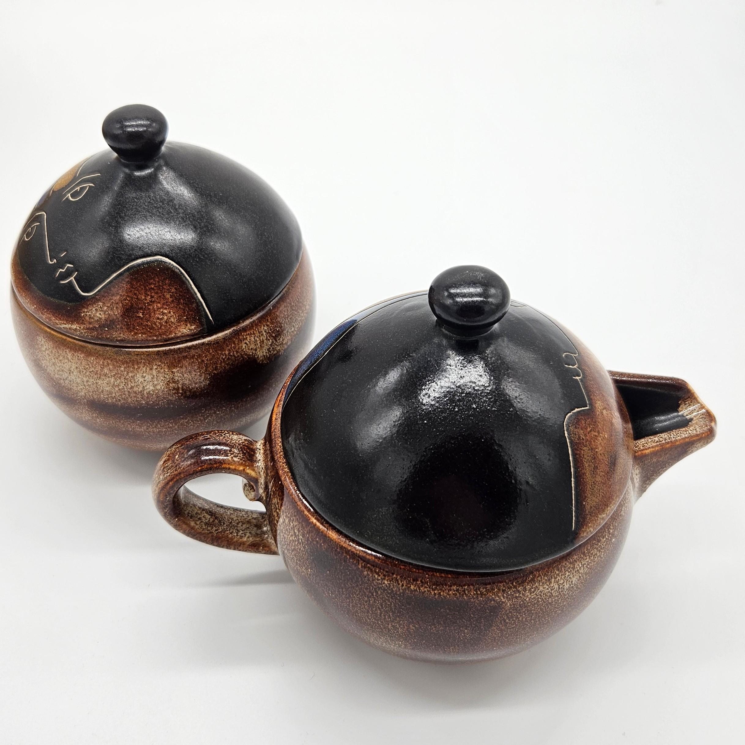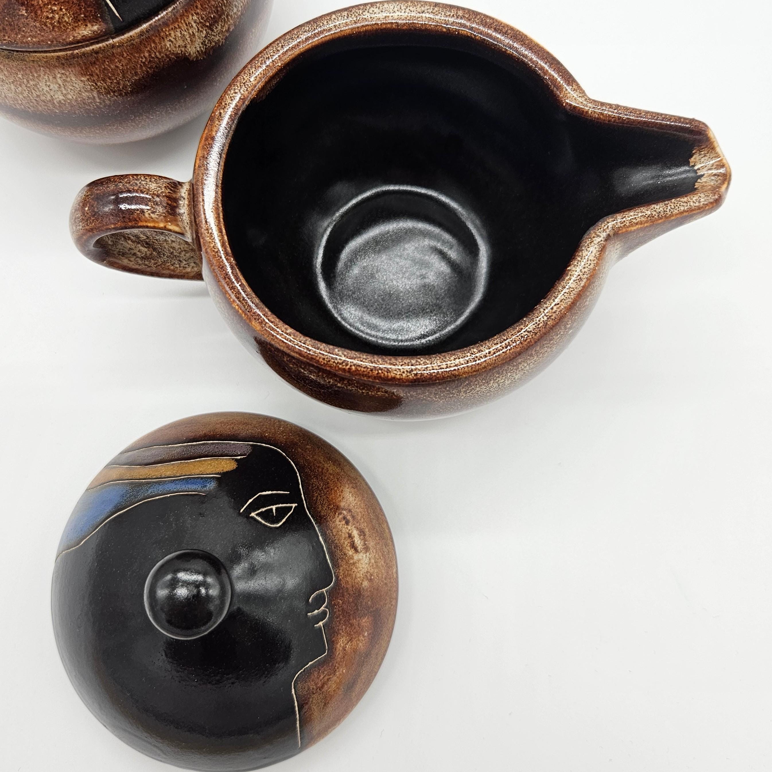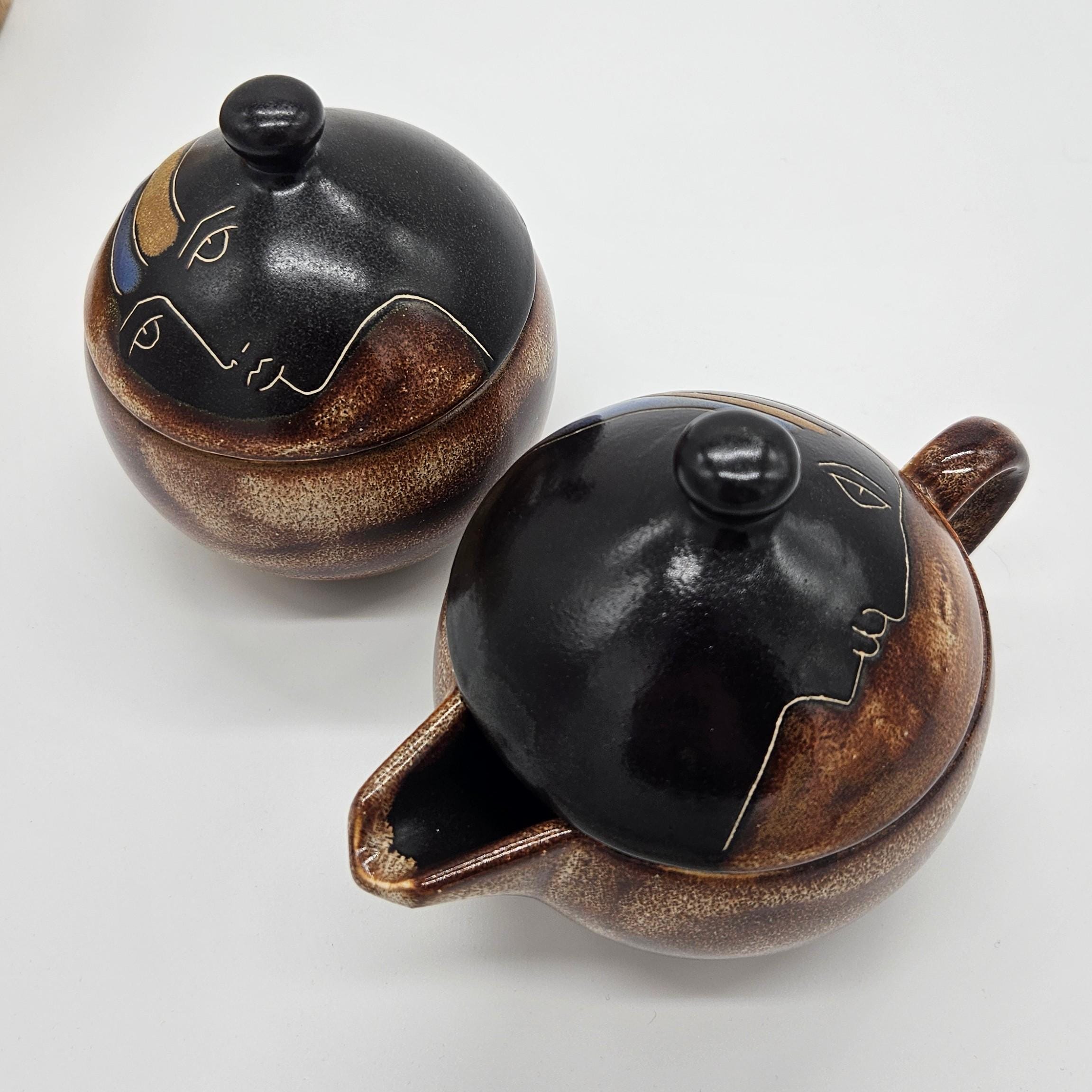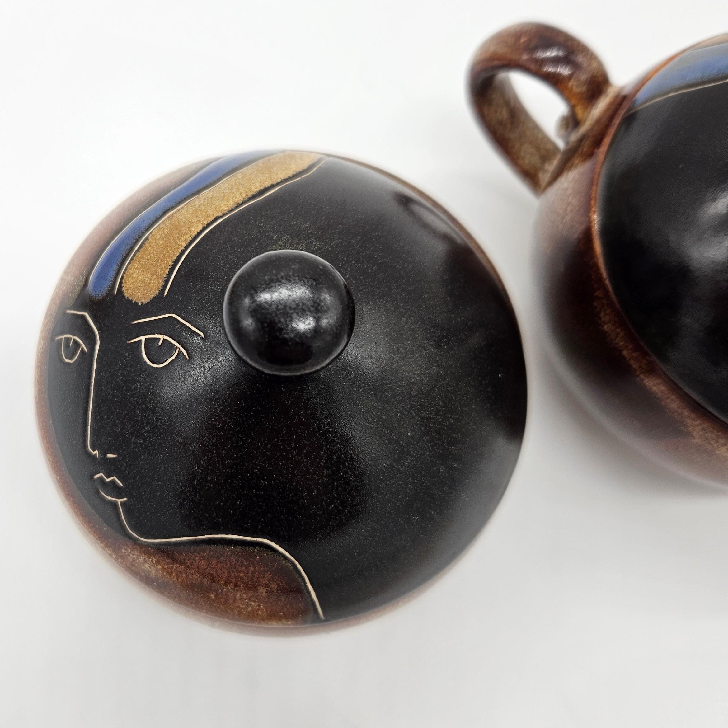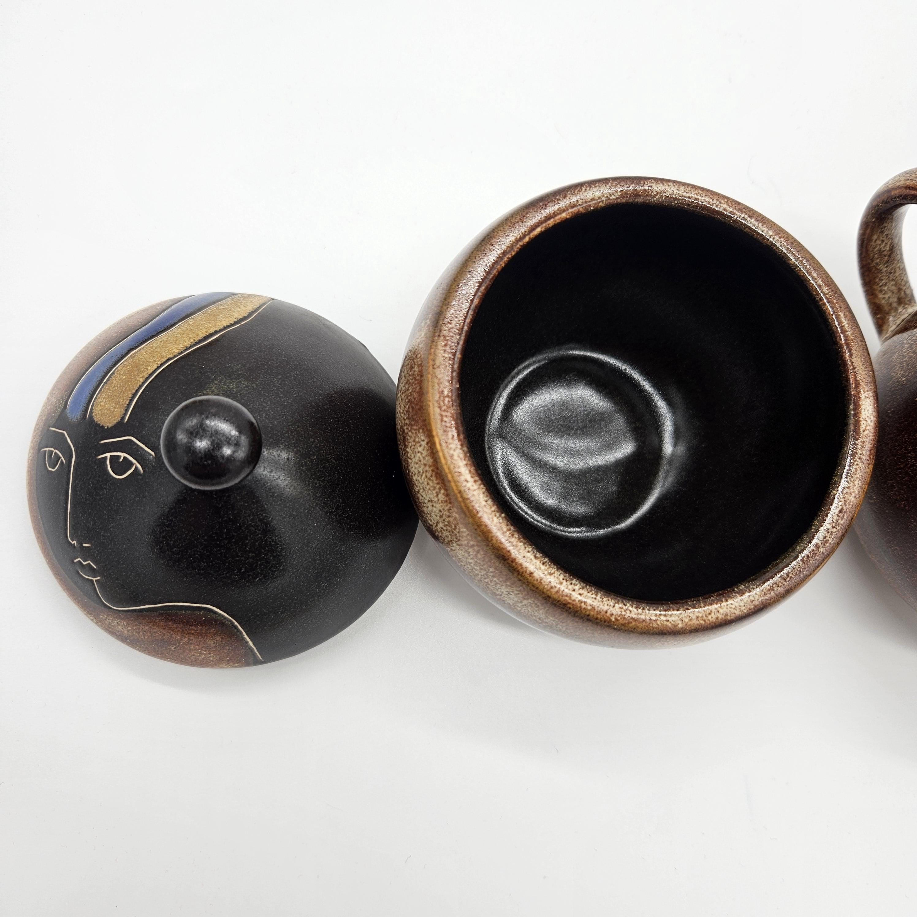 Vintage studio pottery sugar and creamer set by Mara, Mexico, featuring the iconic abstract face design. Both pieces have the rounded orb form that Mara is known for, with etched facial lines and small blue and yellow accent details on the lids. The dark matte lids contrast nicely with the warm brown stoneware glaze. These sculptural pieces work beautifully as functional serveware or as decorative pottery on a shelf, coffee bar, or kitchen display. “Design by Mara Mexico” impressed on base. Likely produced in the 1970s–1980s based on the “Design by Mara Mexico” maker’s mark.