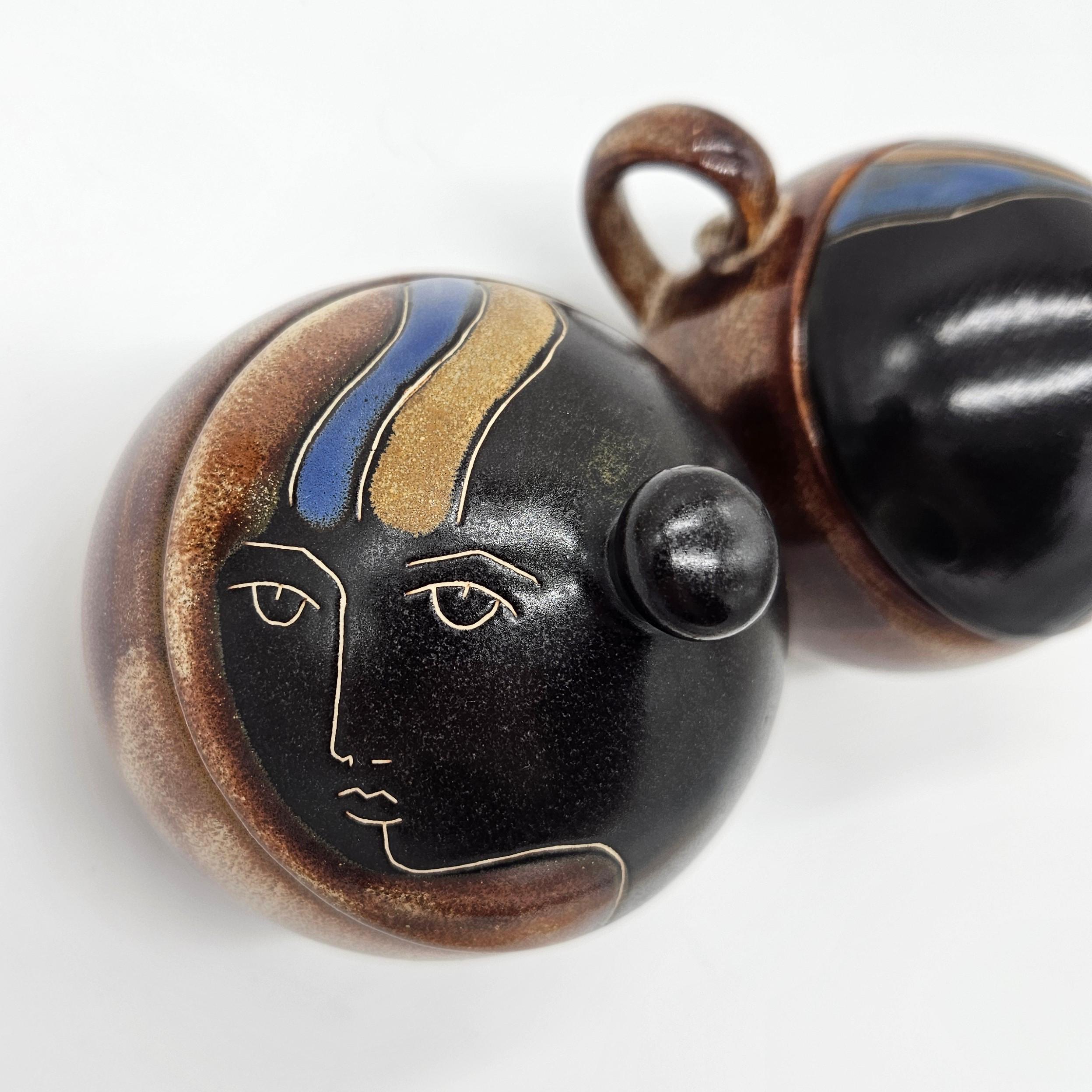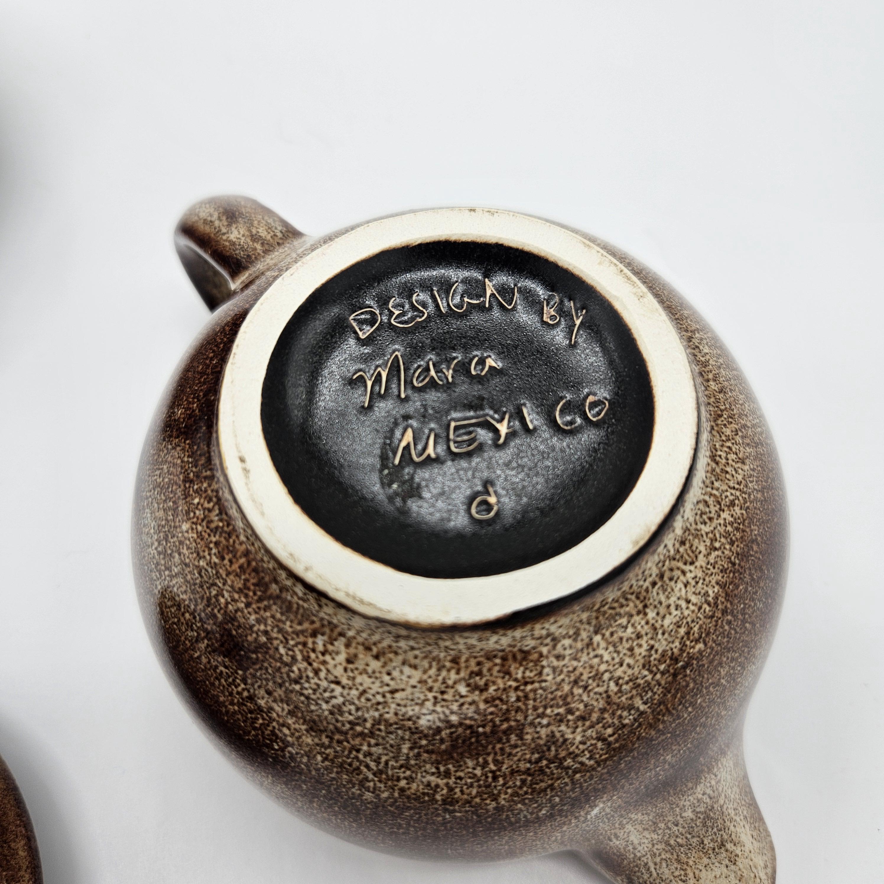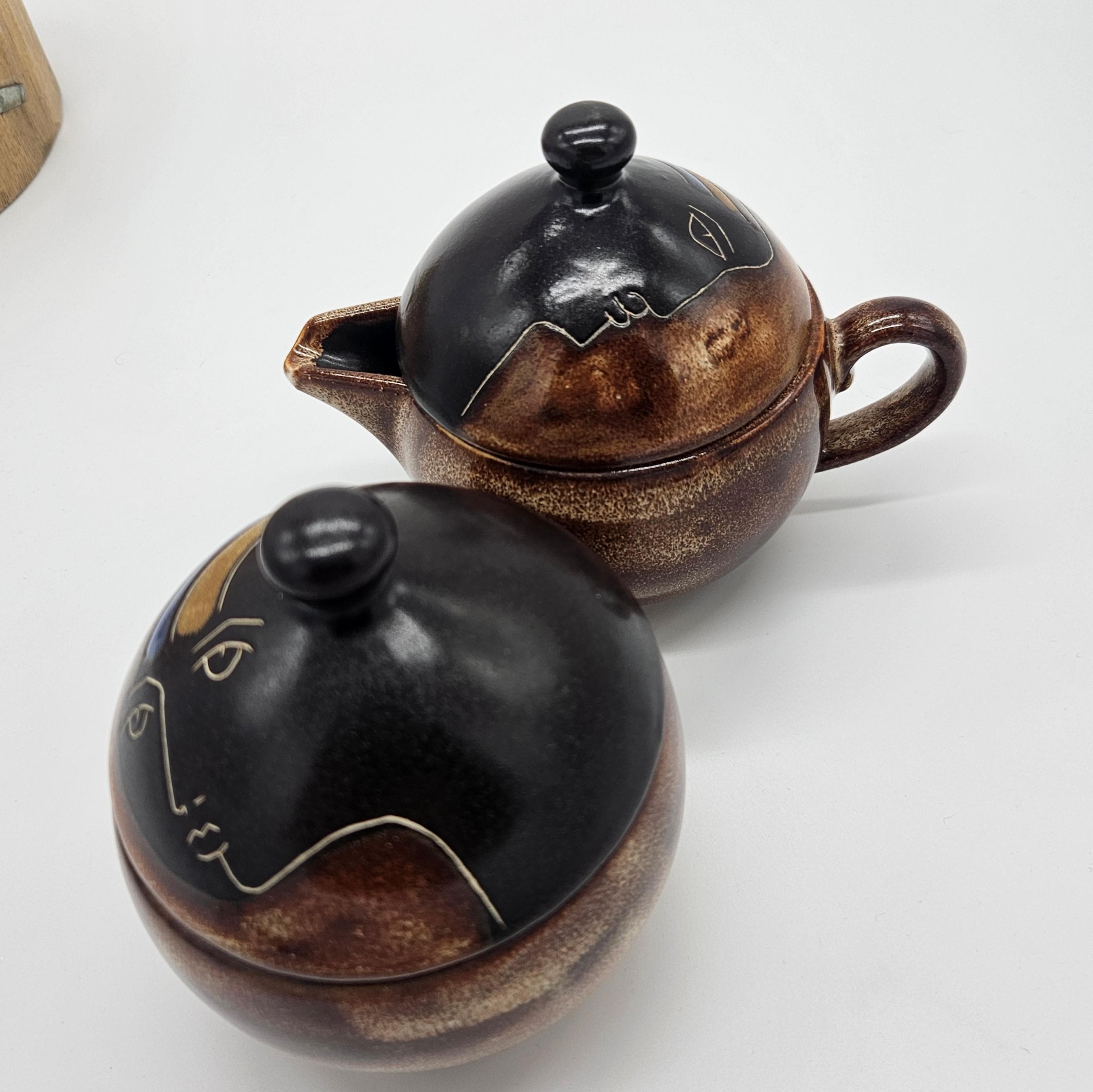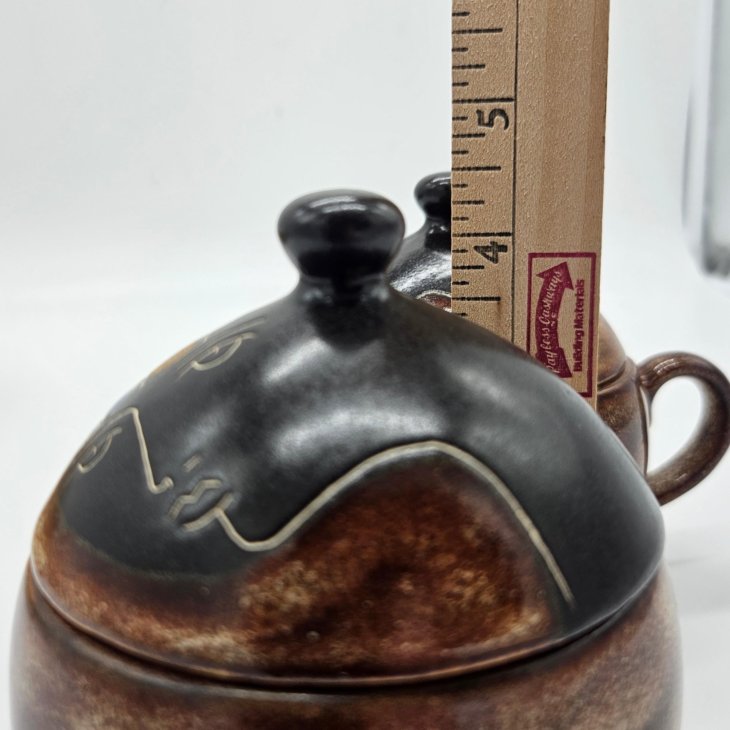 Vintage studio pottery sugar and creamer set by Mara, Mexico, featuring the iconic abstract face design. Both pieces have the rounded orb form that Mara is known for, with etched facial lines and small blue and yellow accent details on the lids. The dark matte lids contrast nicely with the warm brown stoneware glaze. These sculptural pieces work beautifully as functional serveware or as decorative pottery on a shelf, coffee bar, or kitchen display. “Design by Mara Mexico” impressed on base. Likely produced in the 1970s–1980s based on the “Design by Mara Mexico” maker’s mark.