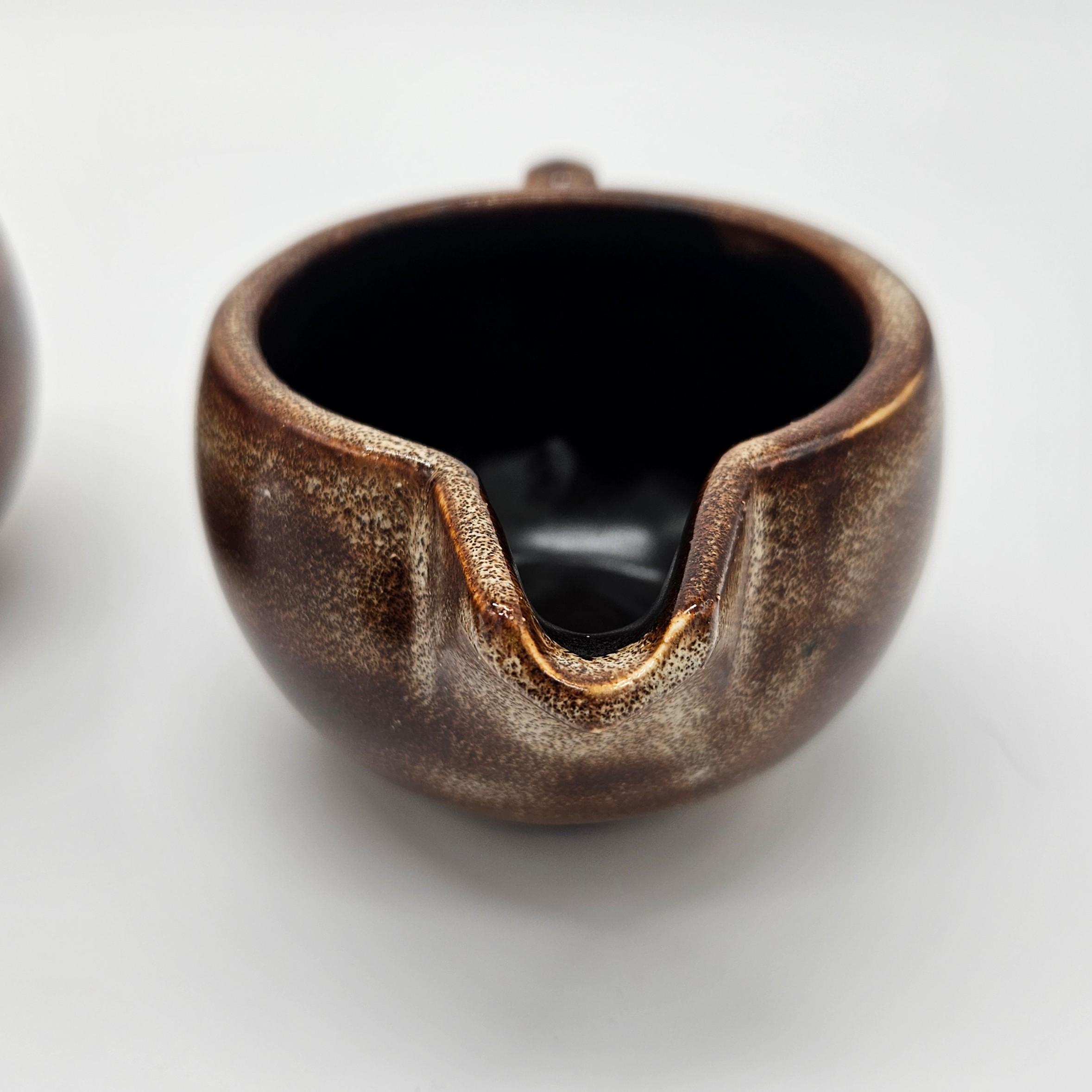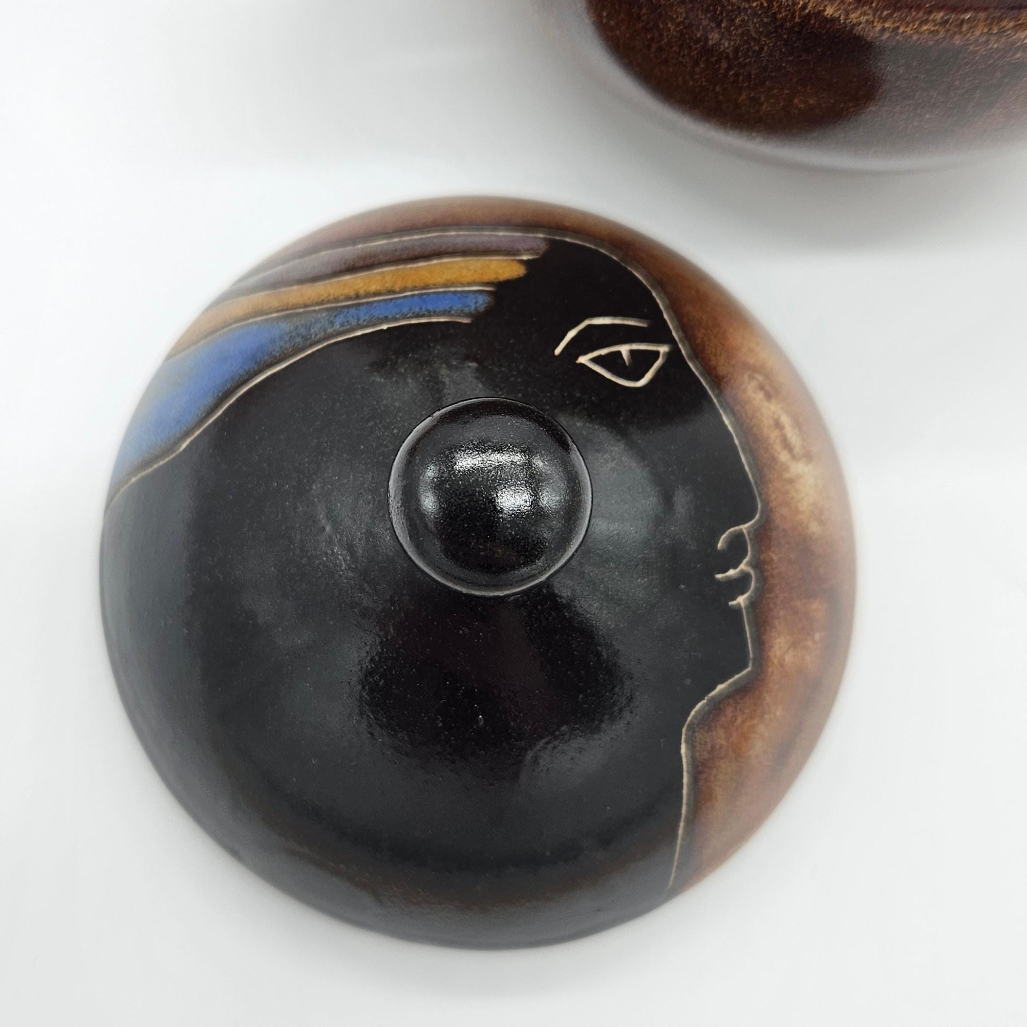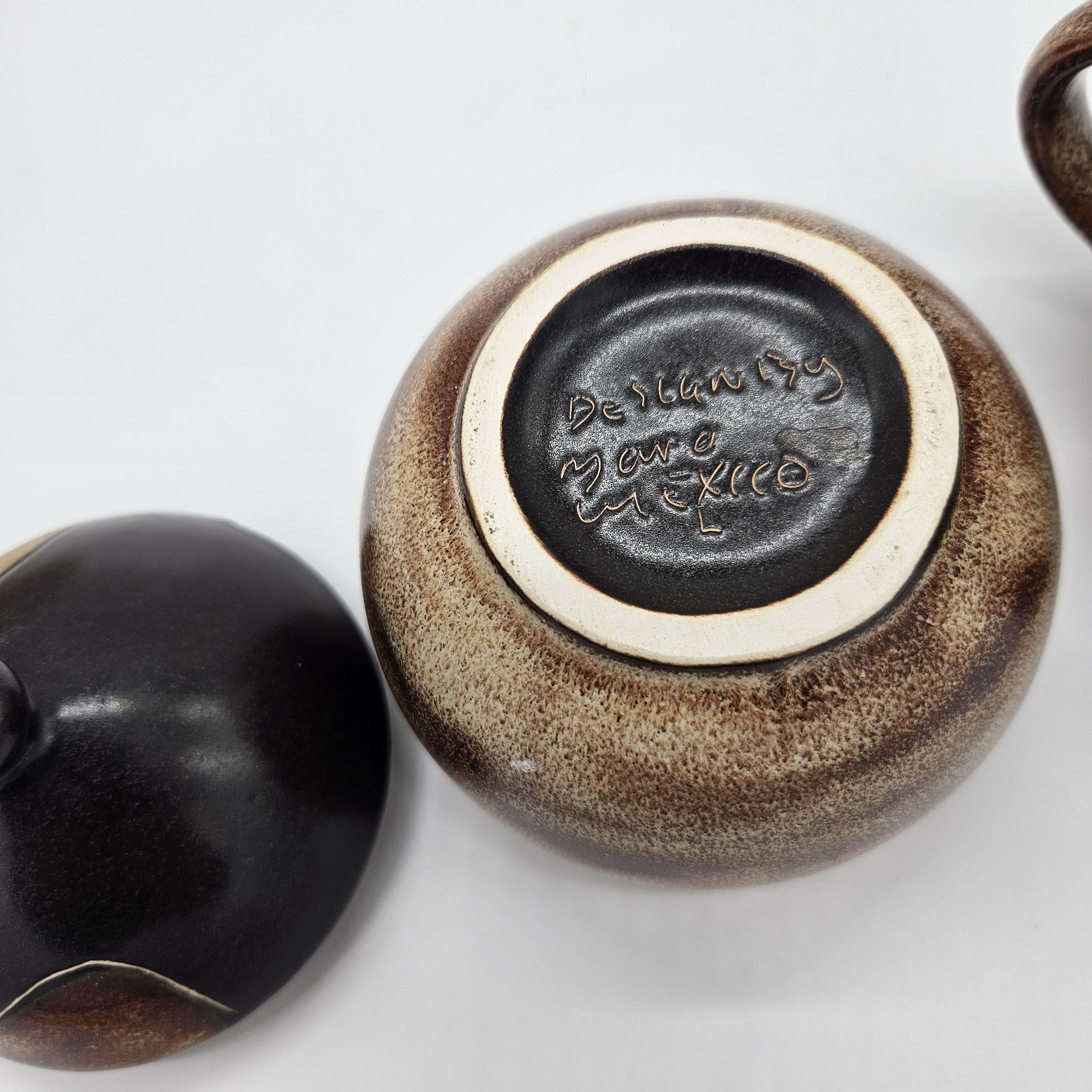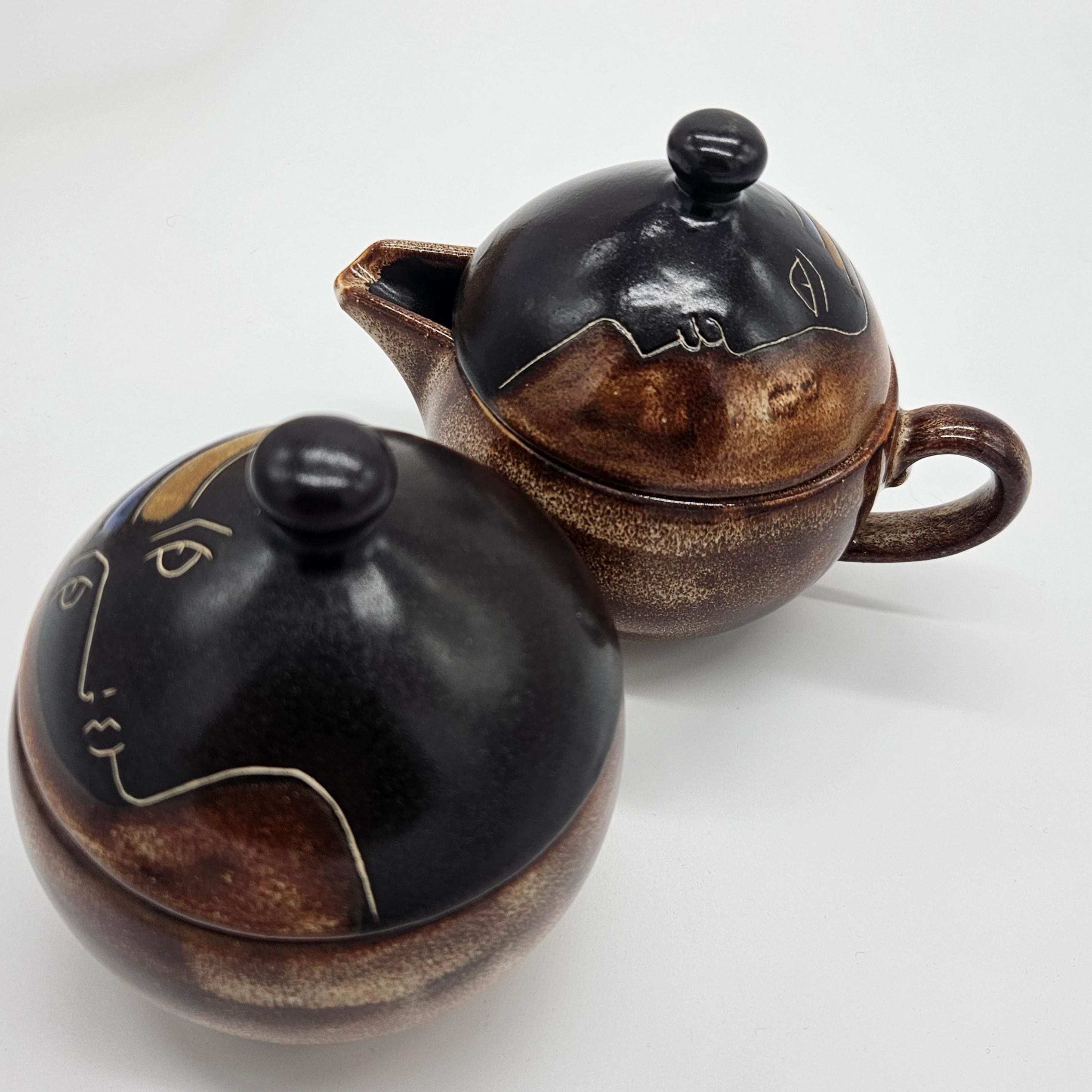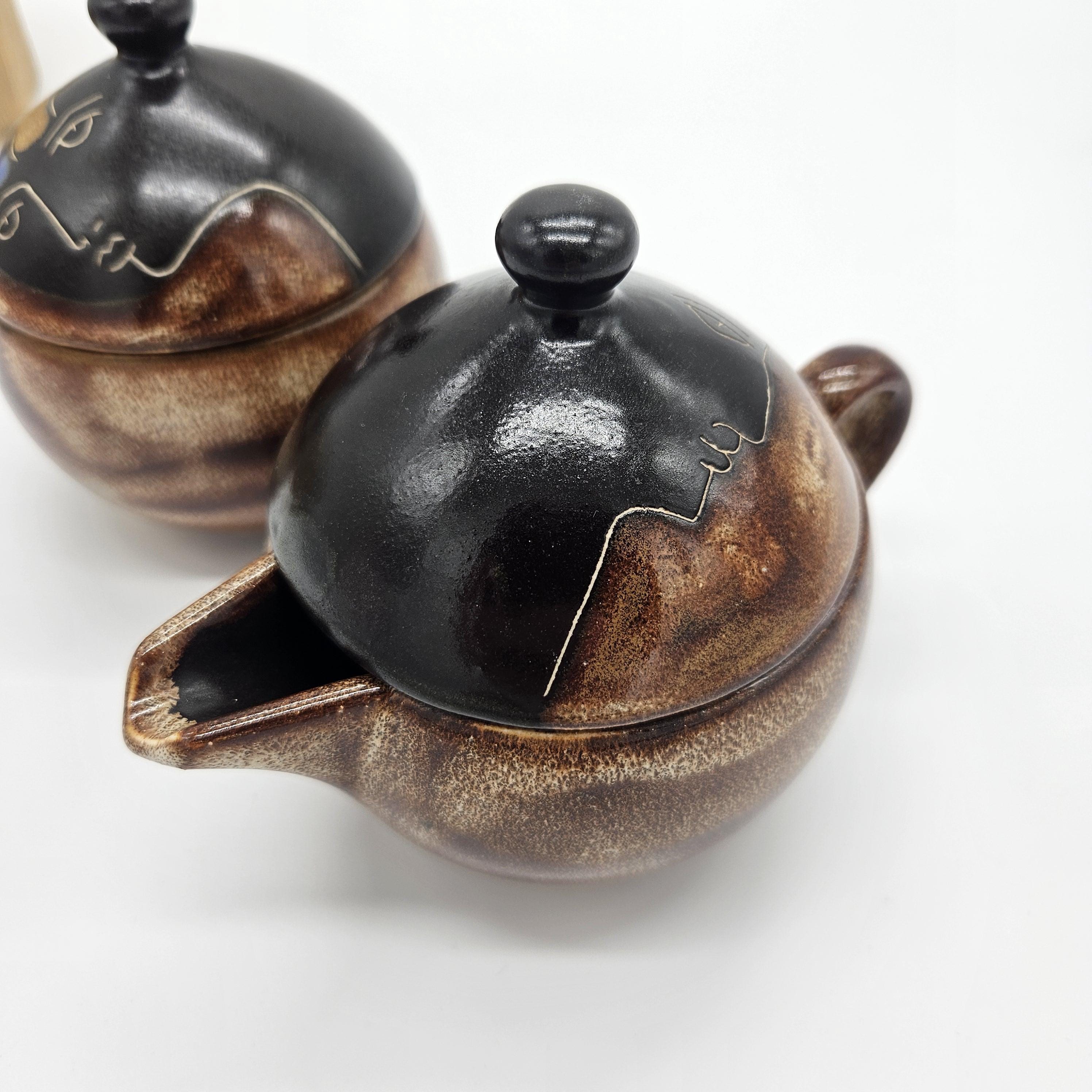 Vintage studio pottery sugar and creamer set by Mara, Mexico, featuring the iconic abstract face design. Both pieces have the rounded orb form that Mara is known for, with etched facial lines and small blue and yellow accent details on the lids. The dark matte lids contrast nicely with the warm brown stoneware glaze. These sculptural pieces work beautifully as functional serveware or as decorative pottery on a shelf, coffee bar, or kitchen display. “Design by Mara Mexico” impressed on base. Likely produced in the 1970s–1980s based on the “Design by Mara Mexico” maker’s mark.