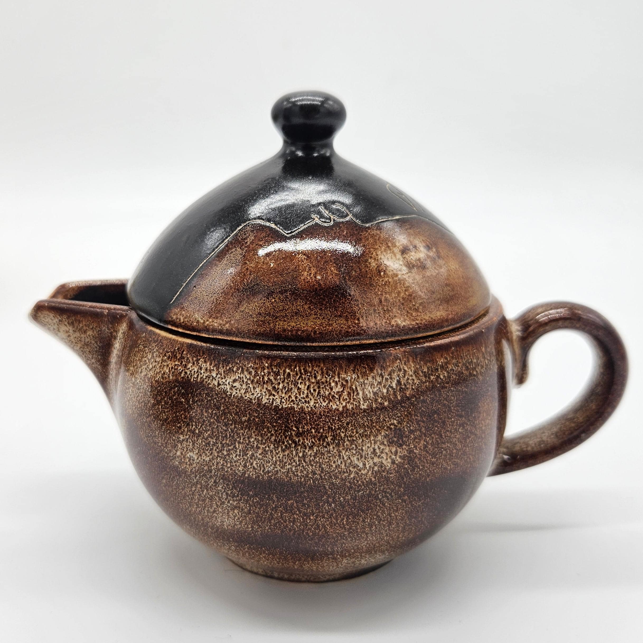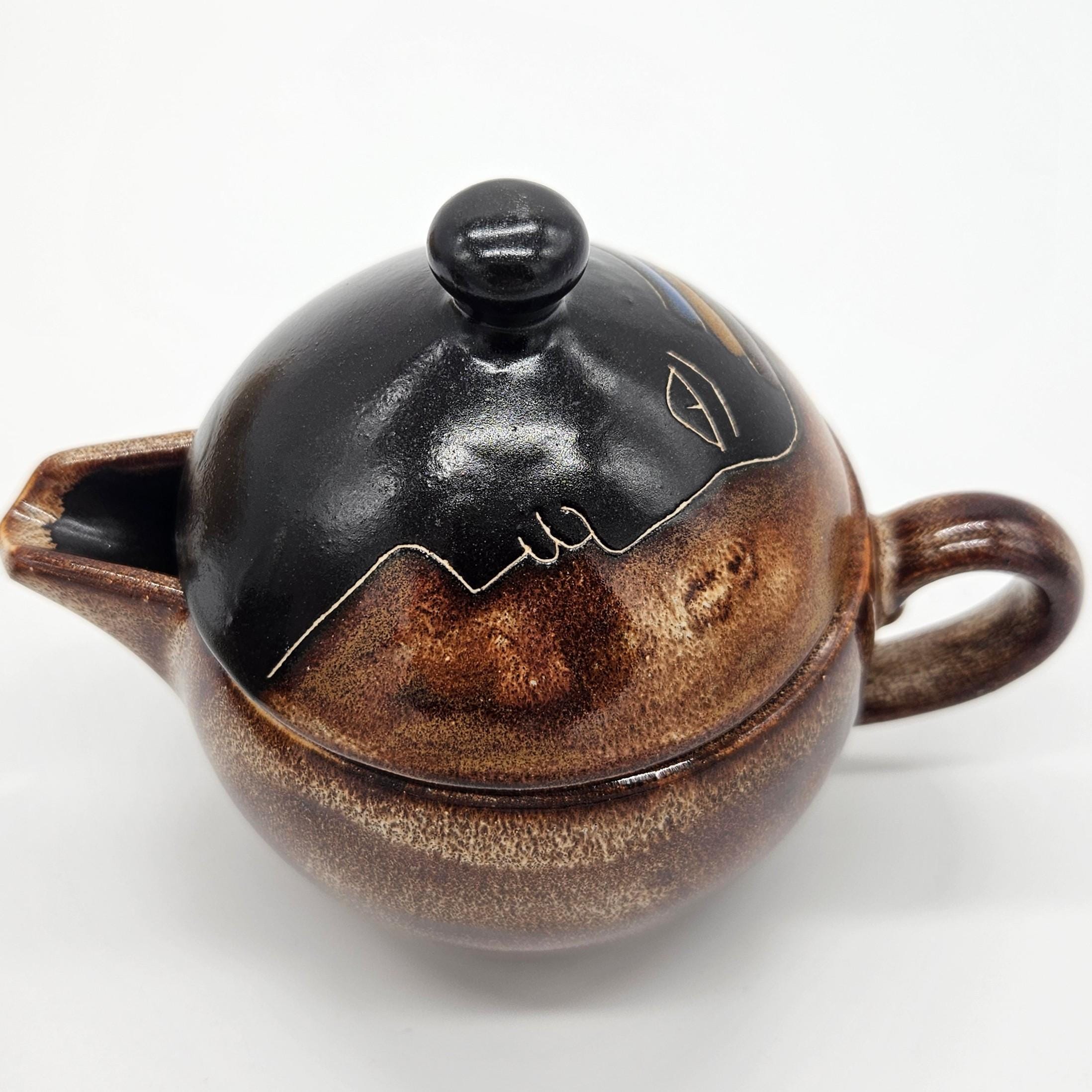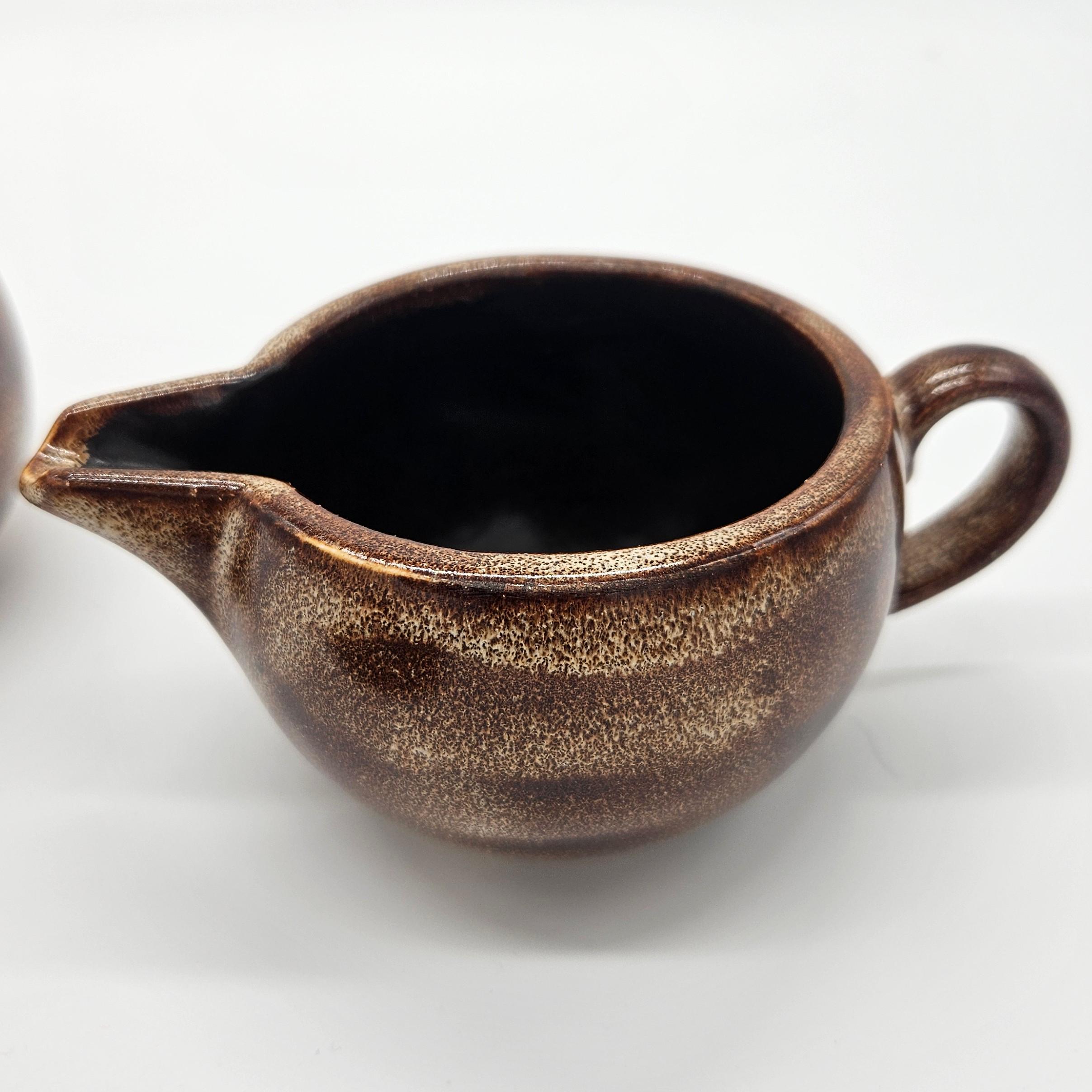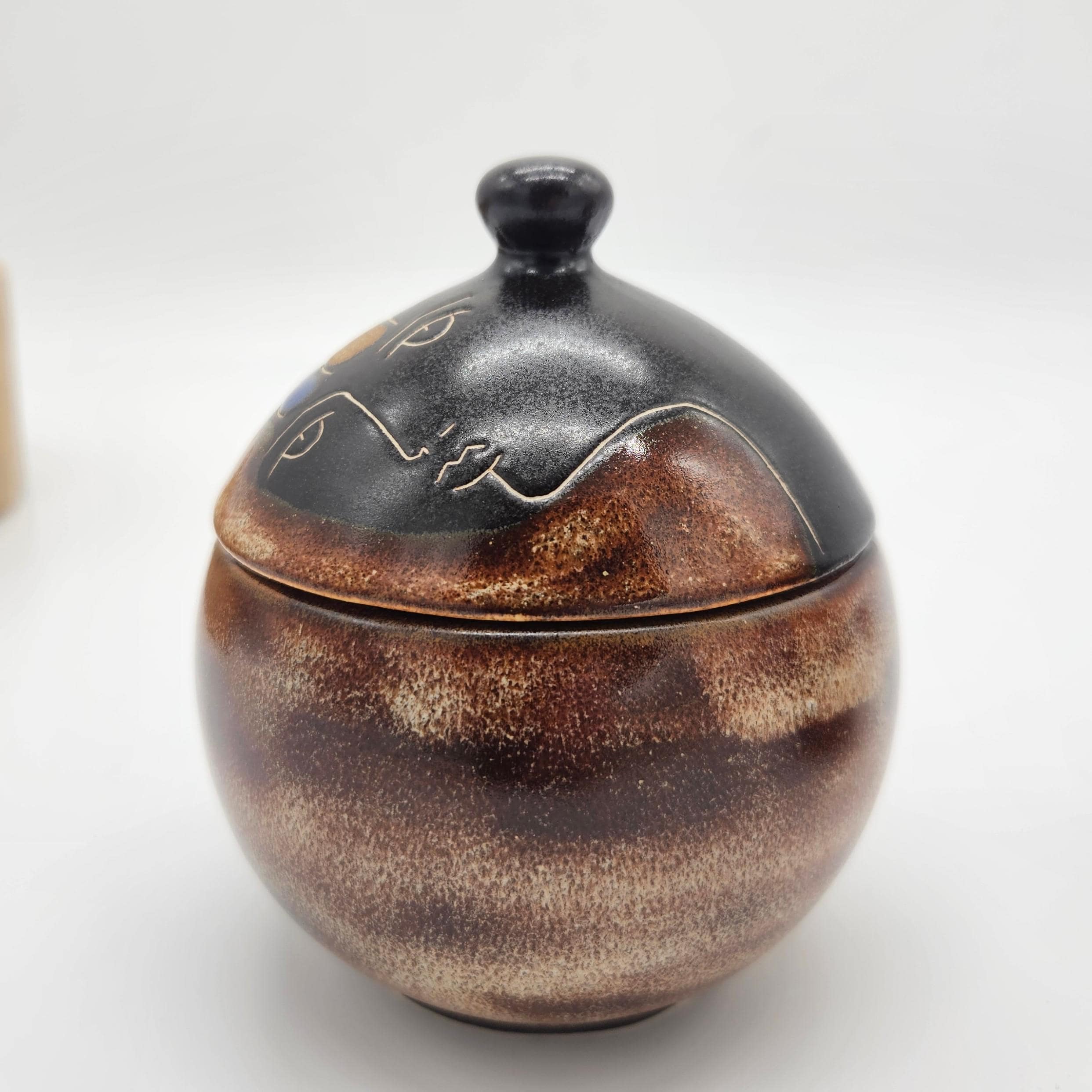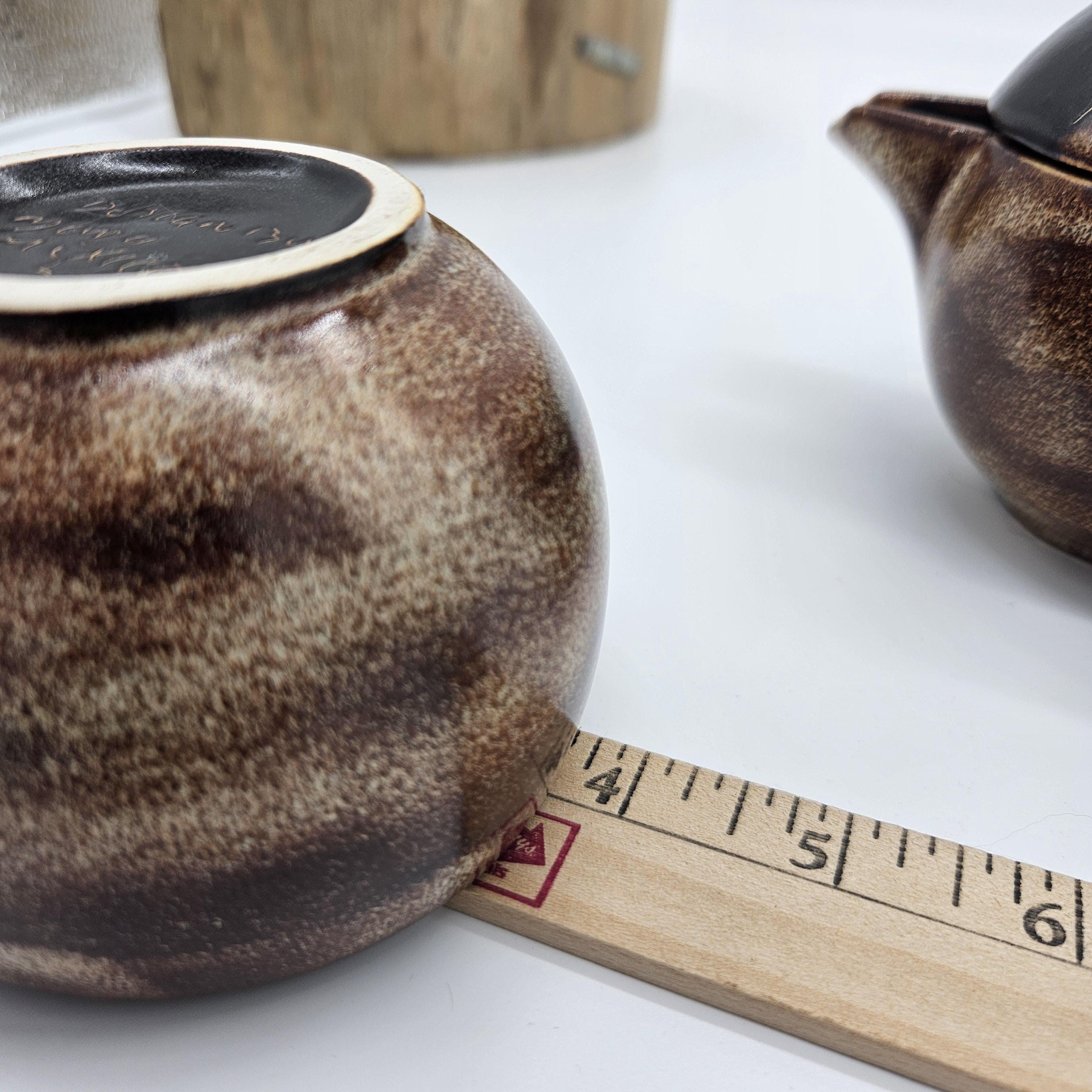 Vintage studio pottery sugar and creamer set by Mara, Mexico, featuring the iconic abstract face design. Both pieces have the rounded orb form that Mara is known for, with etched facial lines and small blue and yellow accent details on the lids. The dark matte lids contrast nicely with the warm brown stoneware glaze. These sculptural pieces work beautifully as functional serveware or as decorative pottery on a shelf, coffee bar, or kitchen display. “Design by Mara Mexico” impressed on base. Likely produced in the 1970s–1980s based on the “Design by Mara Mexico” maker’s mark.