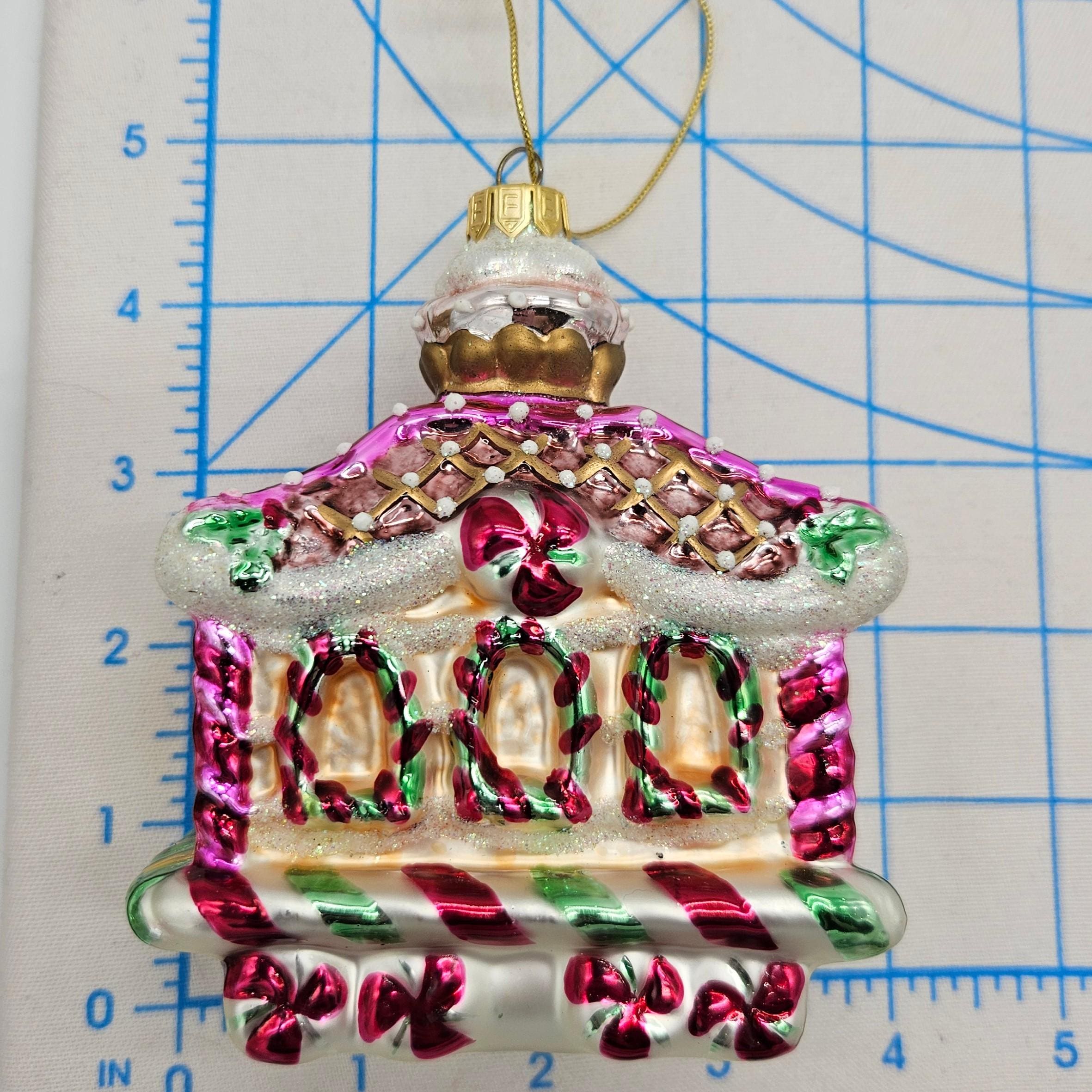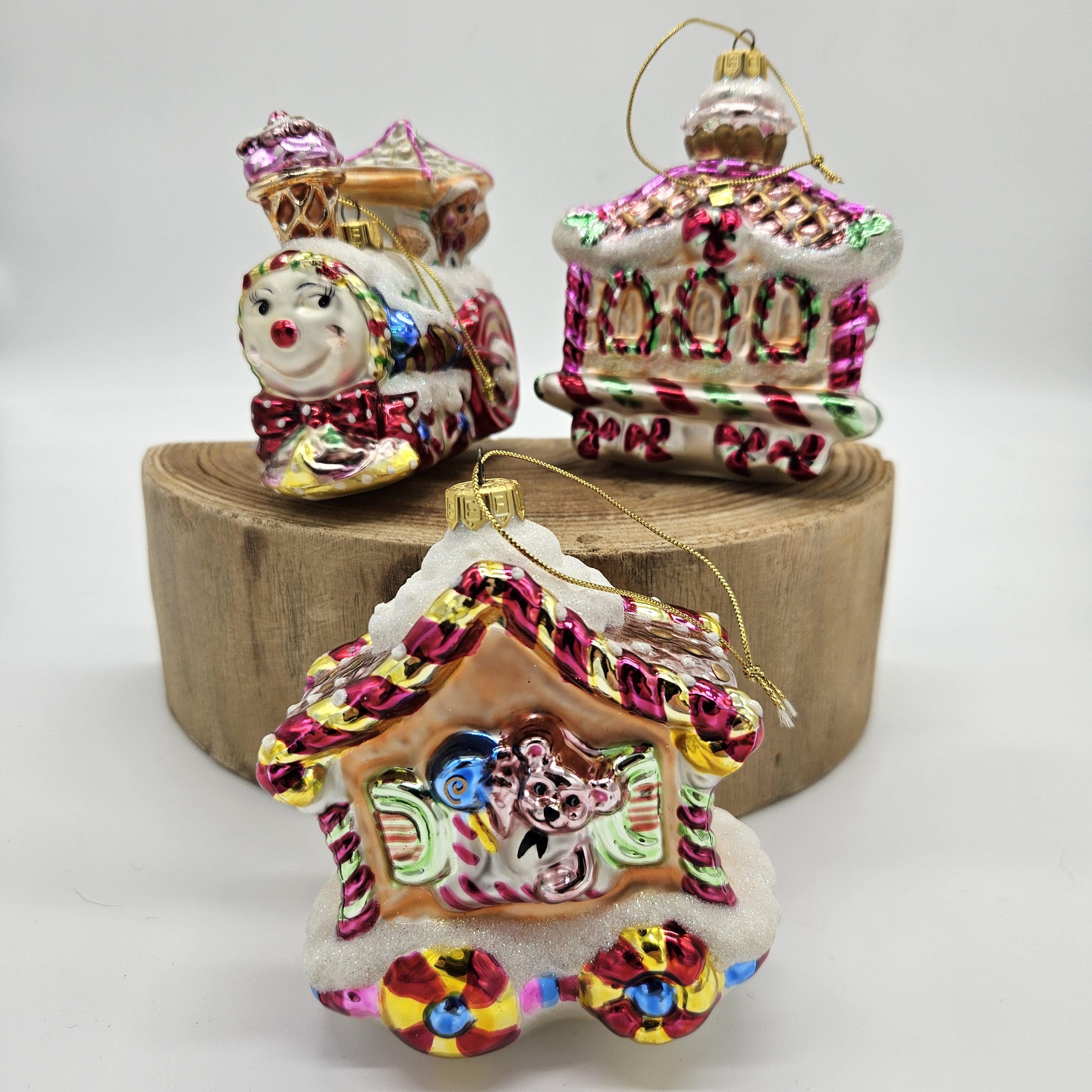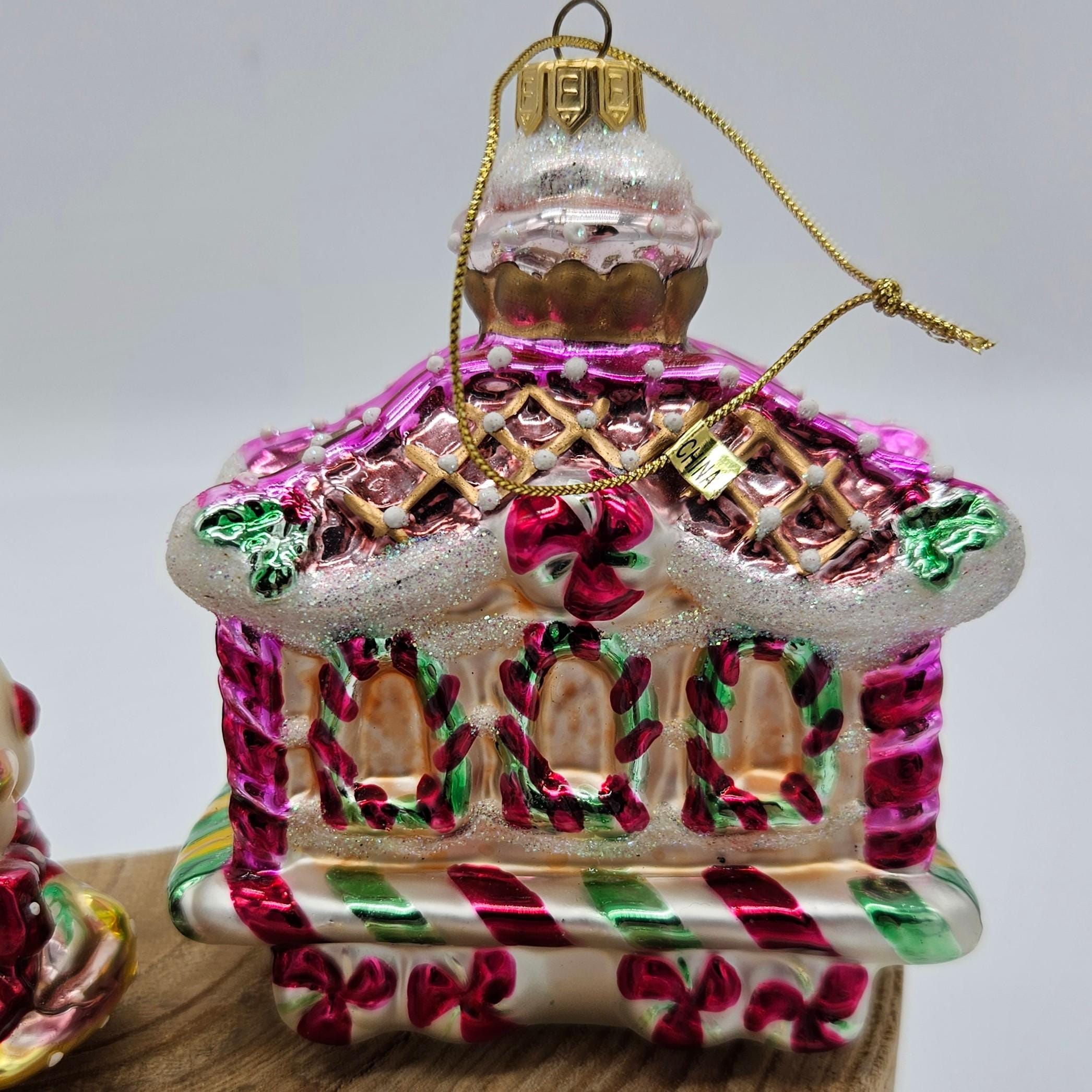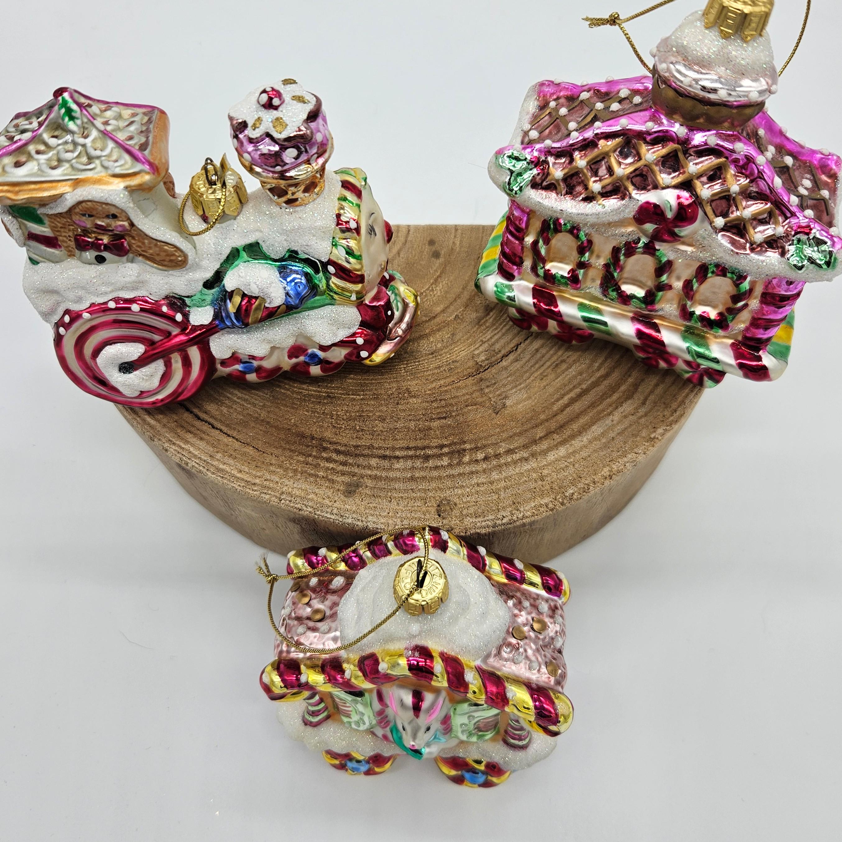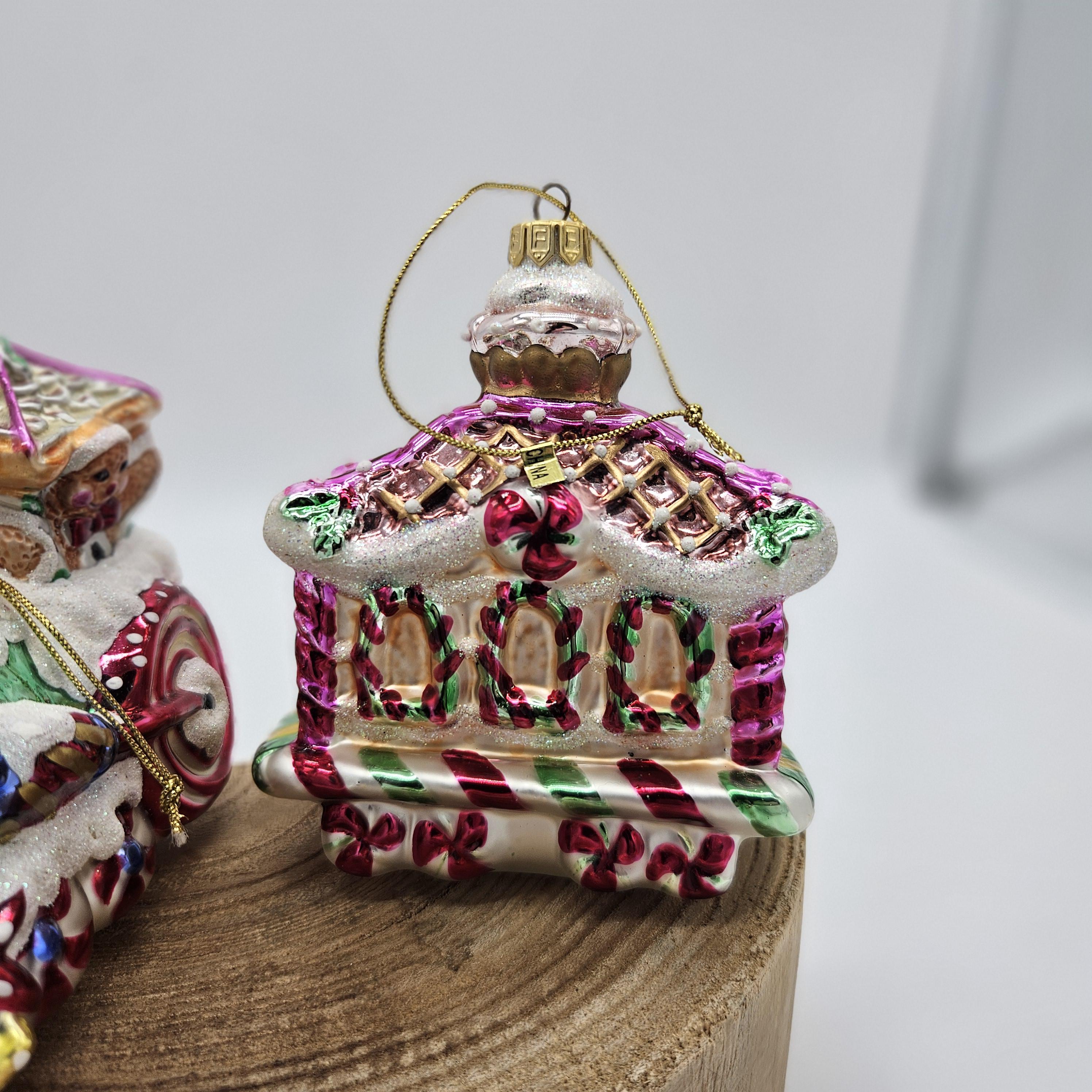 Set of three vintage Fitz & Floyd glass Christmas ornaments featuring a whimsical gingerbread and candy house theme.